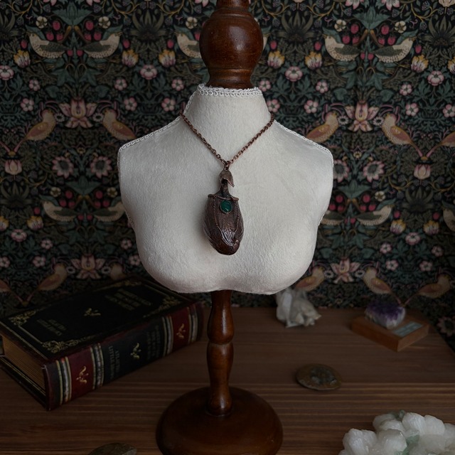 ⊹ ࣪˖ ┈┈ ˖ ࣪⊹ ┈┈⊹ ࣪˖ ┈┈˖ ࣪⊹ ここは、全ての生き物が銅になった世界 鬱蒼と茂る低地のジャングルの中で 標高3000mの高地の霧の中で 大小様々な 約170種ものウツボカズラの捕虫袋は 次々に銅に変わっていきました ウツボカズラの蓋や襟から 分泌される蜜は いつしか宝石に置き換わり 宝石を飲みに集まる銅の虫を 妖しく誘っています ⊹ ࣪˖ ┈┈ ˖ ࣪⊹ ┈┈⊹ ࣪˖ ┈┈˖ ࣪⊹ ウツボカズラ(ネペンテス)「ビカルカラタ」の捕虫袋(ピッチャー)を収穫し、洗浄後、エレクトロフォーミングという技法で銅めっきをほどこし、ネックレスを作製しました。 みなさまは食虫植物というとどんな種類を思い浮かべますか? 食虫植物=ウツボカズラ(ネペンテス)、というイメージをお持ちの方、とっても多いのではないでしょうか。 いかにもたくさん虫を食べていそうな特徴的なピッチャーを持つネペンテスは、ハエトリグサと一、二を争う、食虫植物界のレジェンドです。 ネペンテスの特徴はなんと言ってもそのピッチャーにあります。 種類によって異なる様々な形のピッチャーを持ち、中には牙(!)が生えていたり、洋式便座(!!)のような姿の種類だってあります。 …何を隠そう、本種「ビカルカラタ」こそがその「牙」が生えた種なのです! 一般的に牙系ネペンテスと言う場合、ハイランド種(高山性)の中で襟の周りをぐるっと囲むようにギザギザとした種類を指すことが多いのですが、本種ビカルカラタは一味違います。 牙の「ような」ではなく、本当に牙が生えているのです! いわゆる牙系ネペンテスとの違いは、その牙の位置にあります。 ビカルカラタは蓋の内側に吸血鬼のごとき2本の鋭い牙が内向きに生えており、なんでそうなった?と言わざるを得ません。しかも結構長い。 自然の造形、まさに神秘です。 蓋の内側に生えているため、デンジャラスな牙も意外と安全。 更にこの個体は蓋が内巻きになっているため、外から出すと牙が見えません。 持ち主だけにわかる(持ち主でさえも良く覗き込まないと分からない)秘密の牙です。 ネックレスとして着ける分には問題ないかと思いますが、ピッチャーの後ろに短い出っ張りがあるので、何かを引っ掛けたりされないようにご注意くださいね。 服の上からの着用がおすすめです。 ピッチャーの洗浄後、導電性塗料を内外に塗布し、一度うっすらとめっきをかけます。 薄く銅を纏わせた状態でめっき液から出し、洗浄後、めっきされていない箇所がないか、何度か引き上げて確認しながら、丸一日かけてエレクトロフォーミングを行いました。 今回は、めっき後にいぶし加工を行い、アンティーク感のある仕上がりを目指しました。 いぶしも不思議なもので、毎回同じ色合いにはなりません。 アンティークな銅によく映える、深い緑色のグリーンオニキスを合わせました。 個性的なビカルカラタとはっきりした色合いのグリーンオニキスで、モノトーンコーデに大人なアクセントを加えてください。 【サイズ】(金具込) サイズ、重さ:画像参照 チェーン長さ:約60cm(アジャスター5cm含む) ✴︎服の上からお楽しみいただける、ユニセックスなサイズ感となっています ✴︎黒いシャツを着たマネキンは9号サイズです アジャスター使用前後の画像があります ✴︎短めをご希望の場合は、オプションより選択をお願いします(備考欄への記載は対応不可) 【エレクトロフォーミングとは】 導電性塗料を塗った植物をめっき液に浸し、電気を流して銅めっきしています。 短くて6時間、植物によっては一日以上かけ、様子を見ながらゆっくりめっきをかけています。 Torigusaのこだわりは、全て本物の食虫植物を使用している点! 実は、エレクトロフォーミングは凹んだ部分にかかりづらく、複雑で袋形の形状が多い食虫植物はなかなかの曲者なのです。 日々試行錯誤しながら楽しくめっきしています。 【素材】 銅、真鍮、植物、天然石 【銅について】 銅は経年変化が楽しめる素材です 加工直後はピンクゴールドですが、徐々に深みを増していき、濃い色合いに変化していきます 植物を育てるように、日々の変化を愛でながら、皆さまの耳元や首元で育てるアクセサリーになれば幸いです 【いぶし加工と金具について】 ⚫︎真鍮製のチェーンにいぶし加工を施して制作しているため、ところどころ色の濃淡があります 味としてお楽しみいただけますと幸いです ⚫︎本体、チェーン共に仕上げに磨き上げてありますが、淡い色のお召し物に色が移る可能性があります 【お願い】 ⚫︎下記リンク「ご購入前にお読みください」をご一読ください https://torigusa.base.shop/items/94178886 【ネペンテス・ビカルカラタ】 学名:Nepenthes bicalcarata ウツボカズラは東南アジアを中心に、中国、ニューカレドニアなど熱帯中心に分布しており、170種以上が見つかっている。 食虫植物の代表的な種で、古くから人工交配が盛んで多数の交配種が作出されている。 葉先は袋状になっており、虫をおびき寄せ