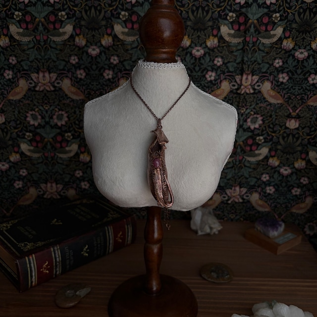 ⊹ ࣪˖ ┈┈ ˖ ࣪⊹ ┈┈⊹ ࣪˖ ┈┈˖ ࣪⊹ ここは、全ての生き物が銅になった世界 鬱蒼と茂る低地のジャングルの中で 標高3000mの高地の霧の中で 大小様々な 約170種ものウツボカズラの捕虫袋は 次々に銅に変わっていきました ウツボカズラの蓋や襟から 分泌される蜜は いつしか宝石に置き換わり 宝石を飲みに集まる銅の虫を 妖しく誘っています ⊹ ࣪˖ ┈┈ ˖ ࣪⊹ ┈┈⊹ ࣪˖ ┈┈˖ ࣪⊹ ウツボカズラ(ネペンテス)「ボングソ」の捕虫袋(ピッチャー)を収穫し、洗浄後、エレクトロフォーミングという技法で銅めっきをほどこし、ネックレスを作製しました。 みなさまは食虫植物というとどんな種類を思い浮かべますか? 食虫植物=ウツボカズラ(ネペンテス)、というイメージをお持ちの方、とっても多いのではないでしょうか。 いかにもたくさん虫を食べていそうな特徴的なピッチャーを持つネペンテスは、ハエトリグサと一、二を争う、食虫植物界のレジェンドです。 ネペンテスの特徴はなんと言ってもそのピッチャーにあります。 種類によって異なる様々な形のピッチャーを持ち、中には牙(!)が生えていたり、洋式便座(!!)のような姿の種類だってあります。 ボングソはハイランドネペンテス の一種で、調べてもあまり情報が出て来ず、特徴については今一つはっきりとしませんが、深い紫色の美しいピッチャーと肉厚な質感のウツボカズラで、これからの成長が楽しみな一株です。 どんな色に育っていくのでしょう。 ピッチャーの収穫・洗浄後は、導電性塗料を内外に塗布し、一度うっすらとめっきをかけます。 薄く銅を纏わせた状態でめっき液から出し、洗浄後、めっきされていない箇所がないか、何度か引き上げて確認しながら、丸一日かけてエレクトロフォーミングを行いました。 今回は、めっき後にいぶし加工を行い、アンティーク感のある仕上がりを目指しました。 いぶしも不思議なもので、毎回同じ色合いにはなりません。 ボングソは、銅にする前は落ち着いた紫色の美しいピッチャーで、ちょうどネックレスにしたくなる大きさに育っていました。 枯れた箇所がなく、収穫直後の張りのある段階で銅にすることが出来たので、まるでここから成長していくのではないかと思わせるような生き生きとした仕上がりです。 ボングソの胸元には非加熱のルビーカボションをあしらいました。 一般的に販売されている鮮やかなルビーは、熱処理により鮮やかな赤色に変化させていることが多いのですが、本作のルビーは加熱処理をされていないため、透き通らず、上品なピンク色です。 穏やかな美しさを持つルビーと、今回の販売会のハイランド種の中で一際大きな美しいボングソとの組み合わせをぜひあなたの胸元でご堪能ください。 【サイズ】(金具込) サイズ、重さ:画像参照 チェーン長さ:約60cm(アジャスター5cm含む) ✴︎服の上からお楽しみいただける、ユニセックスなサイズ感となっています ✴︎黒いシャツを着たマネキンは9号サイズです アジャスター使用前後の画像があります ✴︎チェーン短めをご希望の方は、オプションより選択してください(備考欄への記載は不可) 【エレクトロフォーミングとは】 導電性塗料を塗った植物をめっき液に浸し、電気を流して銅めっきしています。 短くて6時間、植物によっては一日以上かけ、様子を見ながらゆっくりめっきをかけています。 Torigusaのこだわりは、全て本物の食虫植物を使用している点! 実は、エレクトロフォーミングは凹んだ部分にかかりづらく、複雑で袋形の形状が多い食虫植物はなかなかの曲者なのです。 日々試行錯誤しながら楽しくめっきしています。 【素材】 銅、真鍮、植物、天然石 【銅について】 銅は経年変化が楽しめる素材です 加工直後はピンクゴールドですが、徐々に深みを増していき、濃い色合いに変化していきます 植物を育てるように、日々の変化を愛でながら、皆さまの耳元や首元で育てるアクセサリーになれば幸いです 【いぶし加工と金具について】 ⚫︎真鍮製のチェーンにいぶし加工を施して制作しているため、ところどころ色の濃淡があります 味としてお楽しみいただけますと幸いです ⚫︎本体、チェーン共に仕上げに磨き上げてありますが、淡い色のお召し物に色が移る可能性があります 【お願い】 ⚫︎下記リンク「ご購入前にお読みください」をご一読ください https://torigusa.base.shop/items/94178886 【ネペンテス・ボングソ】 学名:Nepenthes bongso ウツボカズラは東南アジアを中心に、中国、ニューカレドニアなど熱帯中心に分布しており、170種以上が見つかっている。 食虫植物の代表的な種で、古くから人工交配が盛んで多数の交配種が作出されている。 葉先は袋状になっており、虫をおびき寄せて消化、吸収し栄養を得ている。 これは本種の生息している場所が湿地や荒地、岩場などであり、充分な栄養を得られないため、足りない養分を虫を取ることで補っているためである。 本種の捕虫袋は、葉の中心の