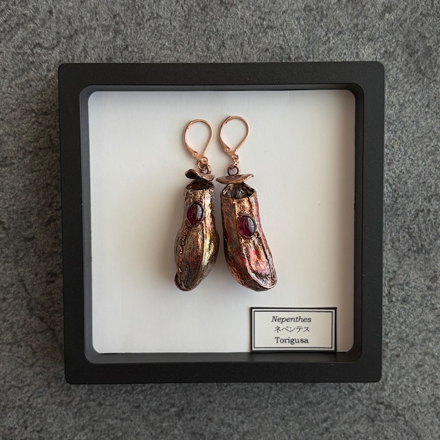 ⊹ ࣪˖ ┈┈ ˖ ࣪⊹ ┈┈⊹ ࣪˖ ┈┈˖ ࣪⊹ ここは、全ての生き物が銅になった世界 鬱蒼と茂る低地のジャングルの中で 標高3000mの高地の霧の中で 大小様々な 約170種ものウツボカズラの捕虫袋は 次々に銅に変わっていきました ウツボカズラの蓋や襟から 分泌される蜜は いつしか宝石に置き換わり 宝石を飲みに集まる銅の虫を 妖しく誘っています ⊹ ࣪˖ ┈┈ ˖ ࣪⊹ ┈┈⊹ ࣪˖ ┈┈˖ ࣪⊹ ウツボカズラ「N. gracilis」の捕虫袋(ピッチャー)を収穫し、洗浄後、エレクトロフォーミングという技法で銅めっきをほどこし、ピアス(イヤリング)を作製しました。 みなさまは食虫植物というとどんな種類を思い浮かべますか? 食虫植物=ウツボカズラ、というイメージをお持ちの方、とっても多いのではないでしょうか。 いかにもたくさん虫を食べていそうな特徴的な捕虫袋(ピッチャーといいます)を持つウツボカズラは、ハエトリグサと一、二を争う、食虫植物界のレジェンドです。 ネペンテスの特徴はなんと言ってもそのピッチャーにあります。 種類によって異なる様々な形のピッチャーを持ち、中には牙(!)が生えていたり、洋式便座(!!)のような姿の種類だってあります。 本作に使用したウツボカズラは、学名をN.gracilis(ネペンテス・グラシリス)といい、gracilisが「ほっそりした」という意味を持つのだそう。 その名の通り、グラシリスは他のウツボカズラたちと比べ、細身で小柄な捕虫袋を持つのが特徴です。 …が!実は我が家で育てているグラシリスは同じグラシリスの中でもN.gracilis Sportといい、ずんぐりした捕虫袋を付ける変種なのです!(細いのか太いのかどっち?) ややこしくなりましたが、小さめでコロンと丸い可愛い系のウツボカズラ、と覚えてくださいますと幸いです。 そんなグラシリス・スポートをお迎えし、少しだけ捕虫袋を収穫させてもらいました。 ウツボカズラたちは捕虫袋の中に落ちた虫を消化し、栄養を得ているため、全て取ってしまうと株の成長に影響が出ることが予想されるため、株の負担にならぬよう細心の注意を払いながら少しだけ収穫させてもらっています。 ウツボカズラの加工は、ピッチャーの洗浄後、電導性塗料を内外に塗布し、一度うっすらとめっきをかけます。 薄く銅を纏わせた状態でめっき液から出し、洗浄後、上手く銅が乗らない部分に再塗装するなどの修正をして、再び様子を見ながらめっきすること約10時間。 ピカピカのピンクゴールドのグラシリスがそこにいました…! 今回は完成後にいぶし加工をおこなうことで、陰影が生まれ、アンティーク感のある仕上がりとなりました。 いぶしも不思議なもので、毎回同じ色合いにはならないのですが、今回はところどころ虹色に輝く仕上がりとなりました。 ウツボカズラのパーツは重たくなりがちですが、本作は小ぶりのピッチャーを使用したため、金具を入れても片耳5g程度とウツボカズラなのに軽めです。 普段使いにもぜひ取り入れていただければと思います。 耳元で踊る、コロコロと丸いおもちゃみたいなウツボカズラ。 これが本物だなんて、わくわくしますよね! ぜひご家族やお友達との会話の中で「これ、本物の食虫植物で…」ってお話して、びっくりさせちゃってください! グラシリスの胸元には透明感のあるルビーのオーバルカボションをあしらいました。 一見落ち着いた深い紅色ですが、太陽の光にかざすと鮮やかな紅色に透き通ります。 ルビーは四大宝石の一つで、ダイヤモンドなどと並び非常に人気の高い宝石です。 当店でも人気の高いグラシリスのピアス(イヤリング)の最強のコンビとなっています。 グラシリスの中でも小ぶりなピッチャーだけに許された特別な耳飾りをぜひあなたの耳元に採集してください。 【エレクトロフォーミングとは】 電導性の塗料を塗った植物をめっき液に浸し、電気を流して銅めっきしています。 短くて6時間、植物によっては一日以上かけ、様子を見ながらゆっくりめっきをかけています。 Torigusaのこだわりは、全て本物の食虫植物を使用している点! 実は、エレクトロフォーミングは凹んだ部分にかかりづらく、複雑で袋形の形状が多い食虫植物はなかなかの曲者なのです。 日々試行錯誤しながら楽しくめっきしています。 【サイズ】(金具込) 画像参照 【素材】 銅、植物、サージカルステンレス316(ピアス、マルカン)、天然石 【銅について】 銅は経年変化が楽しめる素材です 加工直後はピンクゴールドですが、徐々に深みを増していき、濃い色合いに変化していきます 植物を育てるように、日々の変化を愛でながら、皆さまの耳元や首元で育てるアクセサリーになれば幸いです 【いぶし加工について】 ⚫︎完成後、いぶし加工を施すことでアンティークな色合いに仕上げています ⚫︎仕上げに磨き上げてありますが、淡い色のお召し物に色が移る可能性があります 【お願い】 ⚫︎下記リンク「ご購入前にお読みください」をご一読ください https://torigusa.base.shop/items/941788