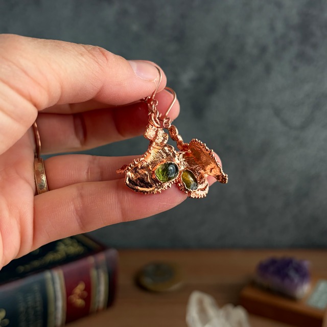 ⊹ ࣪˖ ┈┈ ˖ ࣪⊹ ┈┈⊹ ࣪˖ ┈┈˖ ࣪⊹ ここは、全ての生き物が銅になった世界 植物の葉は銅に 花の蜜は宝石に変わりました 銅になったハエトリグサが食べるのは 銅になった昆虫です 銅に変わった外骨格は消化できても 体内で蜜に変わった宝石は消化できなかったので 捕虫葉には宝石だけが残りました ⊹ ࣪˖ ┈┈ ˖ ࣪⊹ ┈┈⊹ ࣪˖ ┈┈˖ ࣪⊹ 作者が世界で一番大好きな食虫植物・ハエトリグサの捕虫葉で制作したピアス(イヤリング)です。 収穫した捕虫葉をエレクトロフォーミングという技法で銅めっきし、アクセサリーに仕立てているため、銅の中には本物のハエトリグサが入っています。 大好きなハエトリグサをいつも身近に感じたい。 そんな想いが高じて食虫植物アクセサリーを作り始めました。 ハエトリグサは、Torigusaの名前の由来ともなった、思い入れのある食虫植物です。 みなさんは、食虫植物というと、自らパクッと動いて獲物を捕食するイメージがありませんか? 実は、肉眼でハッキリと捕食シーンが確認出来るのは、何を隠そう本種ハエトリグサだけなのです! 他の食虫植物は、ウツボカズラのような「落とし穴式」を採用していたり、ムシトリスミレのようなネバネバの粘液で虫を捕らえる「粘着式」であったり…。 まるで生き物のように、捕まえているシーンを肉眼で観察出来るハエトリグサは、いわば食虫植物界の優等生なのです! 本作は「もしもハエトリグサが虫ではなく宝石を食べたら」というテーマで制作しました。 全ての生き物が銅に変わった世界で、永遠の命を生きるハエトリグサです。 作品には「Bristle tooth」という種類のハエトリグサを使用しました。 普及種と比べ棘が短く、普及種と比較して歯の部分が短い本種は、同じく棘の短いシャークティースと共にTorigusaの主力選手となっています。 意外と知られていませんが、実は、ハエトリグサは冬季に休眠をするため、今年の収穫シーズンは終了し、屋外で栽培しているシャークティースとブリストルトゥースは既に収穫が終わっている捕虫葉が無くなり次第、今期は終了となります。 作品の仕上げとしていぶし加工を行うこともありますが、今回はあえて何もしていません。 出来立てはピンクゴールドですが、銅は酸化しやすい金属のため次第に深みのある褐色に変化していきます。 いぶし加工がエイジングを早め最初からアンティークな雰囲気なのに対し、本作は「自分でアンティークに育てる」アクセサリーとなっています。 ゆっくり変化する色合いを身に付けながらお楽しみください。 補虫葉には、透明感のある宝石質のペリドットのカボションを使用しました。 さざれを使用したカジュアルな作品とは一線を画し、高級感が漂います。 鮮やかな黄緑色のうるっとしたカボションが、光を捕まえてキラキラと輝き、とても綺麗です。 エメラルドともまた違う、可愛らしく美しいペリドットを食べたハエトリグサと一緒に楽しい冬をお迎えください。 【金具について】 ⚫︎イヤリングへの変更が可能です ご注文時、オプションから金具の選択をお願いします ※備考欄ではなく、オプションからの選択をお願いいたします ⚫︎イヤリングへの変更をご希望の場合、丸カン(パーツ同士をつなぐ金具)の個数が変わることがございます 【エレクトロフォーミングとは】 導電性塗料を塗った植物をめっき液に浸し、電気を流して銅めっきしています。 短くて6時間、植物によっては一日以上かけ、様子を見ながらゆっくりめっきをかけています。 Torigusaのこだわりは、全て本物の食虫植物を使用している点! 実は、エレクトロフォーミングは凹んだ部分にかかりづらく、複雑で袋形の形状が多い食虫植物はなかなかの曲者なのです。 日々試行錯誤しながら楽しくめっきしています。 【銅について】 ⚫︎銅は経年変化が楽しめる素材です 加工直後はピンクゴールドですが、徐々に深みを増していき、濃い色合いに変化していきます ⚫︎植物を育てるように、日々の変化を愛でながら、皆さまの耳元や首元で育てるアクセサリーになれば幸いです 【サイズ】(フレンチフックピアスの場合) 画像参照 【素材】 銅、サージカルステンレス316(ピアス、丸カン)、植物、天然石 【お願い】 ⚫︎下記リンク「ご購入前にお読みください」をご一読ください https://torigusa.base.shop/items/94178886 【ハエトリグサとは】 和名:ハエトリグサ(ハエトリソウ) 英名:Venus Flytrap 学名:Dionaea muscipula 北アメリカ原産の食虫植物。 二枚貝のような捕虫葉が特徴的な種。 食虫植物というと、自ら動いて虫を捕獲するイメージが強いが、実際はウツボカズラやモウセンゴケなど、落とし穴式や粘着式で捕えるものがほとんどであり、肉眼ではっきりと捕食を確認できるのは本種のみである。 葉の内側に6〜8本の感覚毛を持ち、ここに刺激が2度加わると葉が閉じる仕組みとなっている。 これは雨粒などによる誤作動を防止するためと考えられており、刺激は同じ感覚