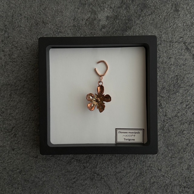 ⊹ ࣪˖ ┈┈ ˖ ࣪⊹ ┈┈⊹ ࣪˖ ┈┈˖ ࣪⊹ ここは、全ての生き物が銅になった世界 ハエトリグサの白い花は 光り輝く銅に変わりました 短命だった白い花は 永い永い命を手に入れ 仲間と共に 何度も巡る春を数えています ⊹ ࣪˖ ┈┈ ˖ ࣪⊹ ┈┈⊹ ࣪˖ ┈┈˖ ࣪⊹ ※こちらは片耳のみの販売です 作者が世界で一番大好きな食虫植物・ハエトリグサの花で制作したイヤーカフです。 収穫した花をエレクトロフォーミングという技法で銅めっきし、アクセサリーに仕立てているため、銅の中には本物のハエトリグサの花が入っています。 みなさまはハエトリグサの花を見たことがおありでしょうか…? 実はハエトリグサはそのイメージとは裏腹に、白くて非常に愛らしい花を咲かせます。 しかし、花を咲かせることはハエトリグサにとって非常にエネルギーが要るため、食虫植物栽培のセオリーとしては、種を採取する場合を除き、まだつぼみの状態で茎ごと切除してしまうというのが基本なのです! これは株の寿命を伸ばす上で必要なことなのですが、作者の家では実生(種を蒔いて育てること)にもチャレンジしているため、アクセサリー用&種の採取を兼ねて、たくさん株分けしたうえでお花を収穫させてもらっています。 緑色の親から生まれた芽が赤色をしていたりと、全く違う見た目の子が生えるのもとても面白いです。 ハエトリグサの花弁はドライフラワーにすると色が透けてしまい、シルバーがかった色味に変化します。 これはこれで美しいのですが、何か他に花の魅力を伝えられる方法があれば…とずっと考えていました。 1年の内で1ヶ月ほどしか咲かない、貴重な花。 この大切な花の形を、変色を気にせず作品にすることができるエレクトロフォーミングは、まさに作者が求めていた技法でした。 銅にするうえで必要なのが、本来電気を通さない植物に電導性の塗料を塗る工程です。 ハエトリグサの花は咲き始めはおしべが上を向いており、次第に花弁に張り付くようにフラットになっていきます。 この繊細で複雑なおしべとめしべに塗料を塗る作業が一番苦労した点です。 その後には薄い花弁が塗料の重さで波打たないように慎重に塗る作業も待っていて、それを一日で萎んでしまう花のタイミングと合わせなければならないため、開花期は気の休まるところがありません。 本来は春に開花するハエトリグサですが、作者宅では初めて12月に開花をしました。 なかなかタイミングが合わず今回銅にできたのは2輪のみで、こちらBは開きかけのお花となっています。 着用するとうつむき加減で何とも奥ゆかしい…! こちらの作品は、最後にいぶし加工を行ったことで、アンティークな見た目に仕上がっております。 可愛らしい印象の花ですが、いぶしにより落ち着いた雰囲気となり、甘さが苦手な女性や男性にもおすすめの作品となりました。 Aと合わせてアシンメトリーな両耳用にしてもよし、片耳だけで楽しんでもよし、な特別なイヤーカフです。 こんなに可愛いのに、え?食虫植物…!? SSS(ステルス・食虫・植物)として、街に繰り出しちゃってください! 【金具について】 ⚫︎イヤリングやピアスへの変更は承っておりません ⚫︎片耳用のみの販売です ⚫︎左右どちら側にもご着用いただけますが、作者のおすすめは着画のように金具の付いている位置(丸カンの部分)を後ろに回しての着用です 耳の形状やお好みによりお好きなようにご着用いただければと思います 【エレクトロフォーミングとは】 電導性の塗料を塗った植物をめっき液に浸し、電気を流して銅めっきしています。 短くて6時間、植物によっては一日以上かけ、様子を見ながらゆっくりめっきをかけています。 Torigusaのこだわりは、全て本物の食虫植物を使用している点! 実は、エレクトロフォーミングは凹んだ部分にかかりづらく、複雑で袋形の形状が多い食虫植物はなかなかの曲者なのです。 日々試行錯誤しながら楽しくめっきしています。 【サイズ】 画像参照 【素材】 銅、サージカルステンレス316、植物 【銅について】 銅は経年変化が楽しめる素材です 加工直後はピンクゴールドですが、徐々に深みを増していき、濃い色合いに変化していきます 植物を育てるように、日々の変化を愛でながら、皆さまの耳元や首元で育てるアクセサリーになれば幸いです 【いぶし加工について】 ⚫︎銅めっき後、いぶし加工を施し、アンティークな風合いに仕上げております ⚫︎仕上げに充分に磨き上げておりますが、淡い色のお召し物に色が移る可能性があります 【お願い】 ⚫︎下記リンク「ご購入前にお読みください」をご一読ください https://torigusa.base.shop/items/94178886 【ハエトリグサとは】 和名:ハエトリグサ(ハエトリソウ) 英名:Venus Flytrap 学名:Dionaea muscipula 北アメリカ原産の食虫植物。 二枚貝のような捕虫葉が特徴的な種。 食虫植物というと、自ら動いて虫を捕獲するイメージが強いが、実際はウツボカズラやモウセンゴケなど、落とし穴