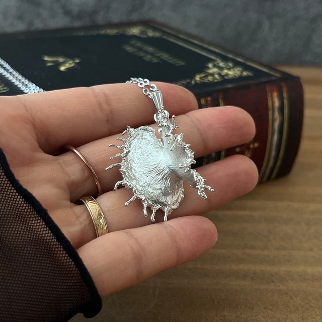 ⊹ ࣪˖ ┈┈ ˖ ࣪⊹ ┈┈⊹ ࣪˖ ┈┈˖ ࣪⊹ ここは、全ての生き物が銅になった世界 銅になった植物たちの中から 体を錫(すず)に置き換える者が 現れ始めました まだ銅だった幼い頃から おしゃべりだったハエトリグサたちは 錫になった今 恋愛話に花を咲かせているようです この湿原の半分が 銀色に輝くまでは あと一万年 ⊹ ࣪˖ ┈┈ ˖ ࣪⊹ ┈┈⊹ ࣪˖ ┈┈˖ ࣪⊹ 【Dミックスさんとのコラボで誕生しました】 作者が世界で一番大好きな食虫植物・ハエトリグサの捕虫葉で制作したネックレスです。 収穫した捕虫葉をエレクトロフォーミングという技法で銅めっきし、アクセサリーに仕立てているため、銅の中には本物のハエトリグサが入っています。 本作は、その銅の上から錫(すず)めっきをかけており、シルバーカラーの見た目となっております。 大好きなハエトリグサをいつも身近に感じたい。 そんな想いが高じて食虫植物アクセサリーを作り始めました。 ハエトリグサは、Torigusaの名前の由来ともなった、思い入れのある食虫植物です。 みなさんは、食虫植物というと、自らパクッと動いて獲物を捕食するイメージがありませんか? 実は、肉眼でハッキリと捕食シーンが確認出来るのは、何を隠そう本種ハエトリグサだけなのです! 他の食虫植物は、ウツボカズラのような「落とし穴式」を採用していたり、ムシトリスミレのようなネバネバの粘液で虫を捕らえる「粘着式」であったり…。 まるで生き物のように、捕まえているシーンを肉眼で観察出来るハエトリグサは、いわば食虫植物界の優等生なのですね。 作品には、「Zipp」という種類のハエトリグサを使用しています。 これらの品種は、よく見るハエトリグサと比べ葉の縁にある棘が牙のように波打っており、蓋が肉厚で、アクセサリーにした際に非常に華やかな印象的を受ける種類です。 一際大きく、華やかなハエトリグサの作品となりました。 本作はweb上で食虫植物店を経営されているDミックスさんとのコラボ作となり、Dミックスさんの店舗でも本作のきょうだいが販売されています。 なお、エレクトロフォーミングは先端に銅が集まる性質があるため、長時間じっくり電気を流すことで棘の部分が自然に丸まり、触った時にチクチクしづらくすることに成功しました。 エレクトロフォーミングを取り入れて、これまで陽の目を見なかった植物たちがたくさん作品に生まれ変わり、日々感動しています。 画像の白いマネキンは本物の人より小さいため、大きさは黒い服を着たワイヤーのマネキンの方を参考になさってください。 後者は9号サイズで、アジャスターを使用したものとしていないものと2つの画像があります。 【エレクトロフォーミングとは】 電導性の塗料を塗った植物をめっき液に浸し、電気を流して銅めっきしています。 短くて6時間、植物によっては一日以上かけ、様子を見ながらゆっくりめっきをかけています。 Torigusaのこだわりは、全て本物の食虫植物を使用している点! 実は、エレクトロフォーミングは凹んだ部分にかかりづらく、複雑で袋形の形状が多い食虫植物はなかなかの曲者なのです。 日々試行錯誤しながら楽しくめっきしています。 【錫(すず)について】 一度銅めっきをかけた後、上から錫めっきを施し銀色に仕立てています。 錫は銅と異なり、変色に強い性質のため長期に渡り同じ色合いがお楽しみいただけます。 ただし、銅めっき時に銅が乗りにくかった場所は錫も乗りにくいため、色合いが一部異なる箇所が出る場合があります。 【サイズ】(金具込み) 重さ、サイズ:画像参照 チェーン長さ:60cm(アジャスター5cm含む) 【素材】 銅、錫、植物、サージカルステンレス316(チェーン、マルカン、バチカン) 【お願い】 ⚫︎下記リンク「ご購入前にお読みください」をご一読ください https://torigusa.base.shop/items/94178886 【ハエトリグサとは】 和名:ハエトリグサ(ハエトリソウ) 英名:Venus Flytrap 学名:Dionaea muscipula 北アメリカ原産の食虫植物。 二枚貝のような捕虫葉が特徴的な種。 食虫植物というと、自ら動いて虫を捕獲するイメージが強いが、実際はウツボカズラやモウセンゴケなど、落とし穴式や粘着式で捕えるものがほとんどであり、肉眼ではっきりと捕食を確認できるのは本種のみである。 葉の内側に6〜8本の感覚毛を持ち、ここに刺激が2度加わると葉が閉じる仕組みとなっている。 これは雨粒などによる誤作動を防止するためと考えられており、刺激は同じ感覚毛に2度でも、別の箇所に2度でも反応する。 尚、1度目の刺激から30秒程度経過すると葉が閉じない、または半分程度しか閉まらなくなるのだが、近年、これにはジャスモン酸グルコシドやカルシウムイオンが関与していることが明らかとなり、閾値に達すると反応が起こると解明されたが、両者の関係など詳細は研究中のようである。 葉の開閉には多くのエネルギーを使うため、数回繰り返すとその葉は枯れてしまう。 原種はDionaea muscipula一種のみである