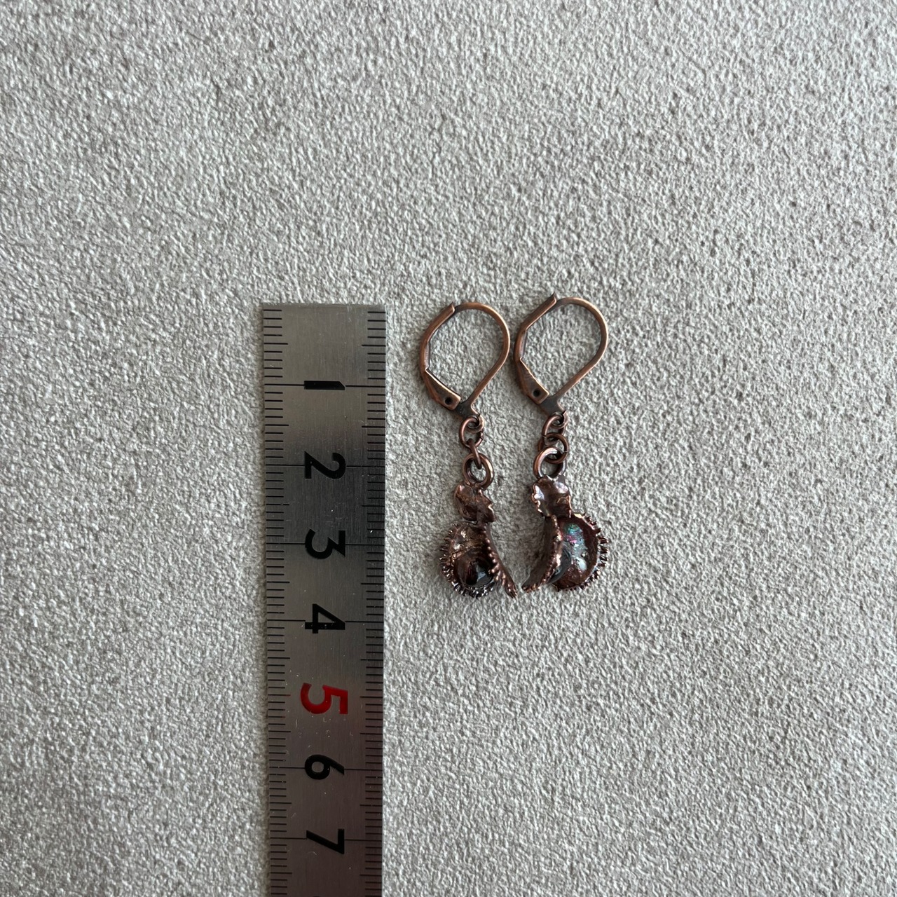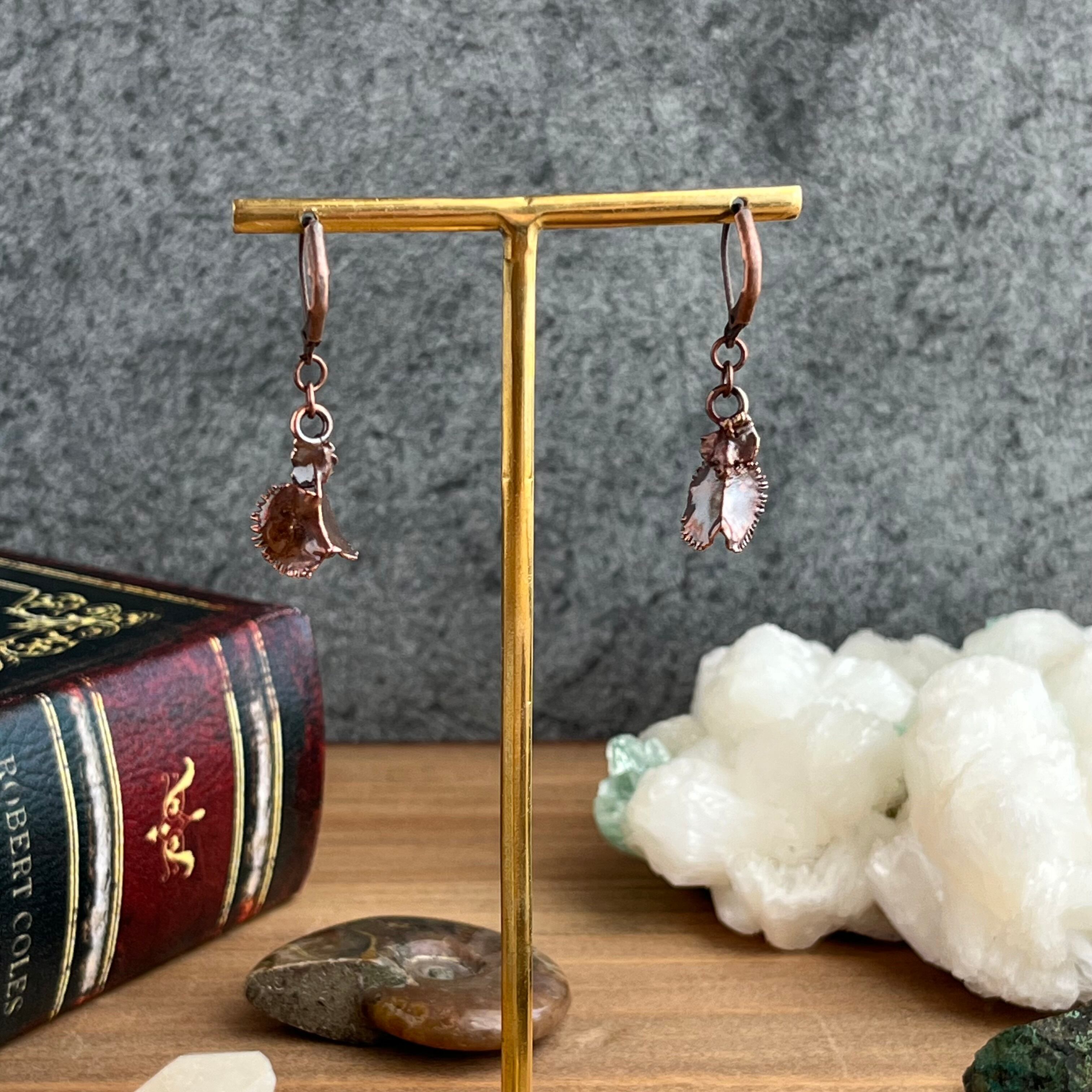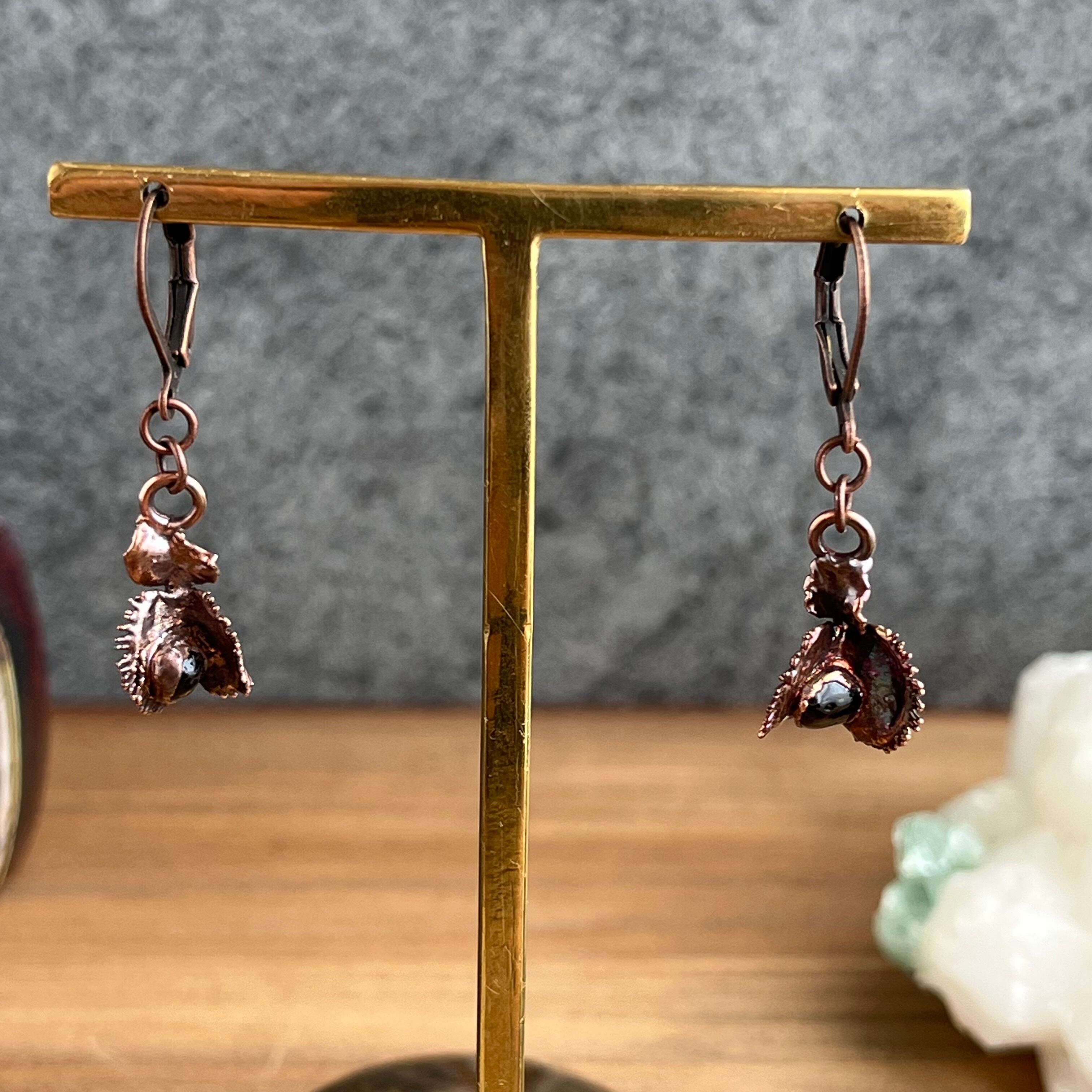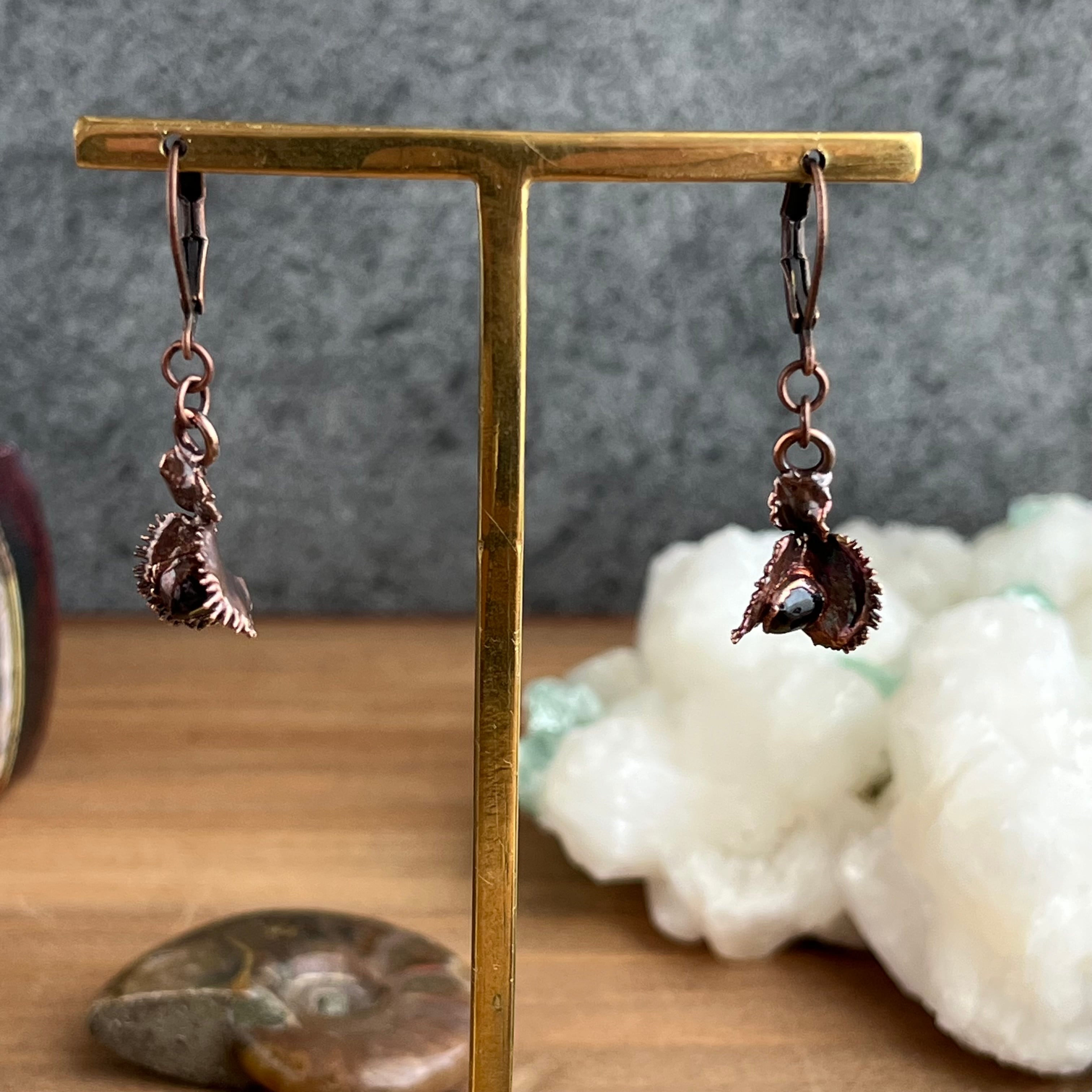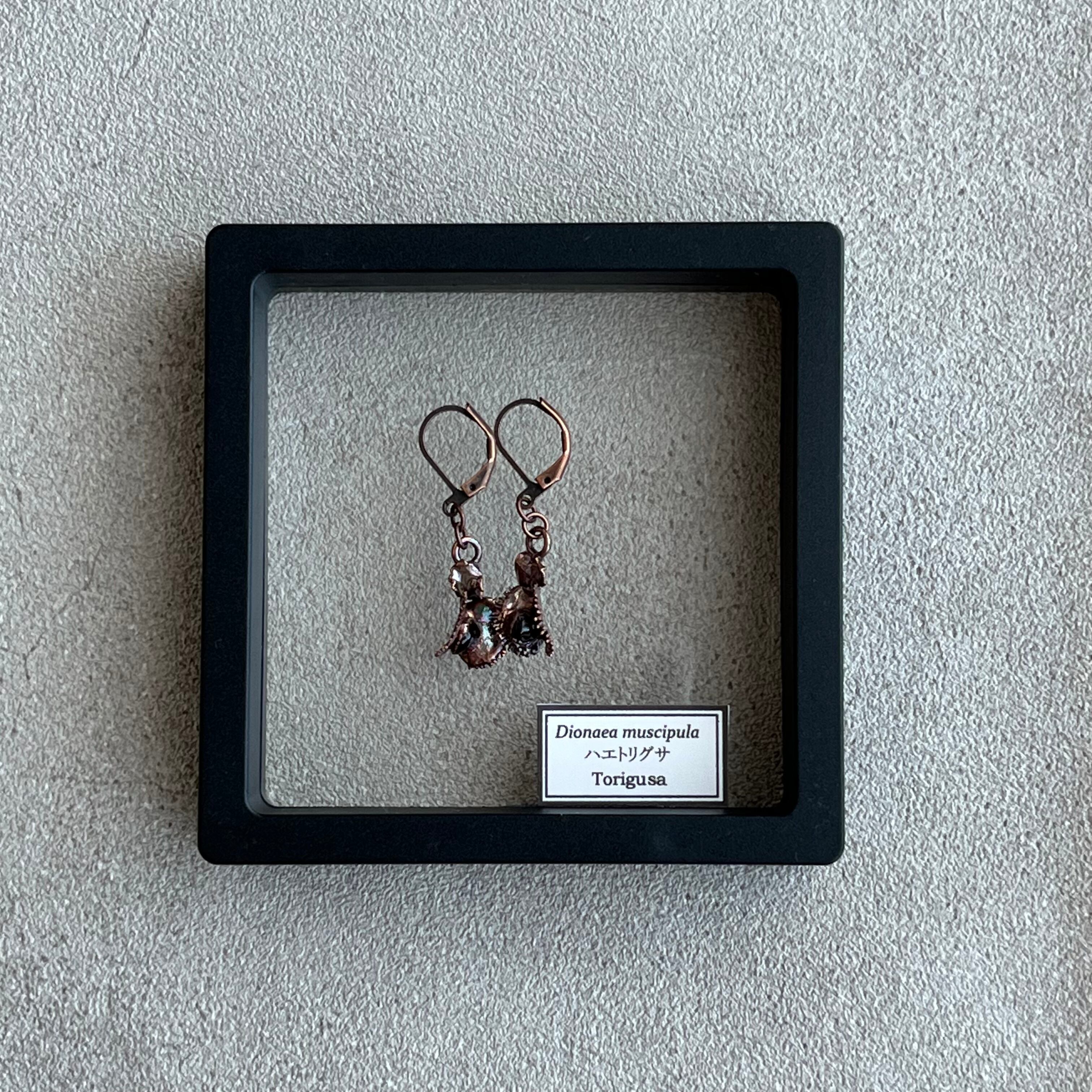 収穫した捕虫葉をエレクトロフォーミングという技法で銅めっきし、アクセサリーに仕立てているため、銅の中には本物のハエトリグサが入っています。