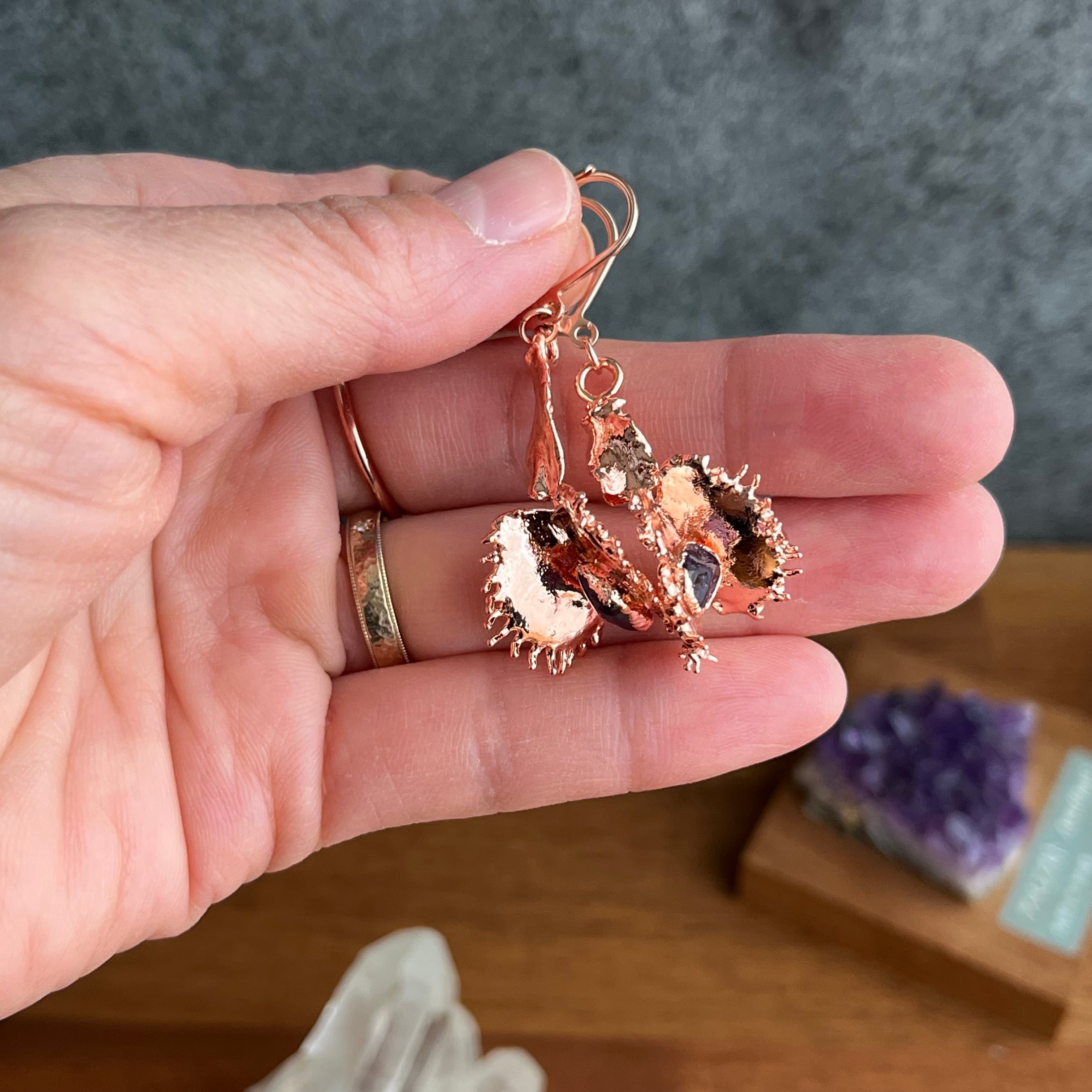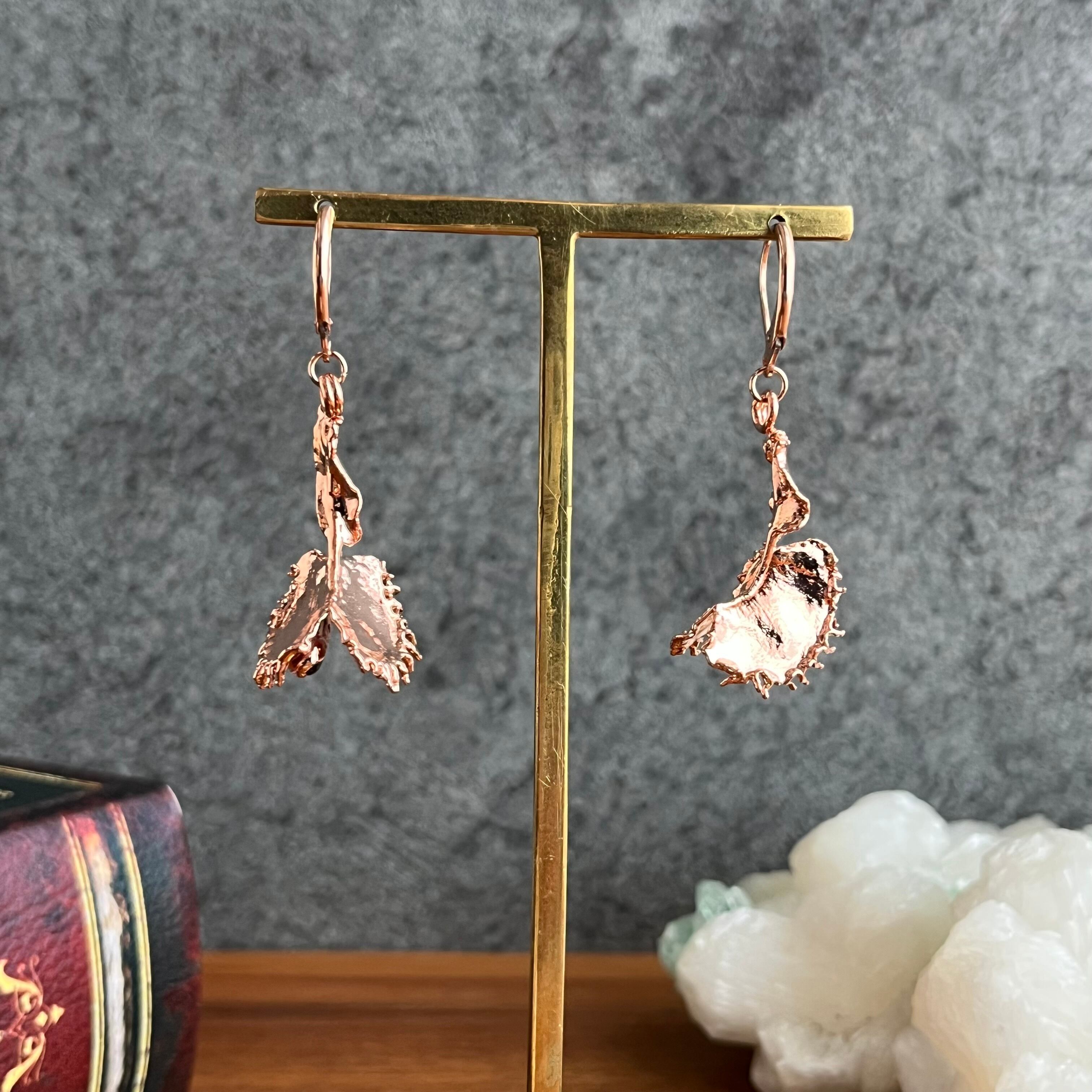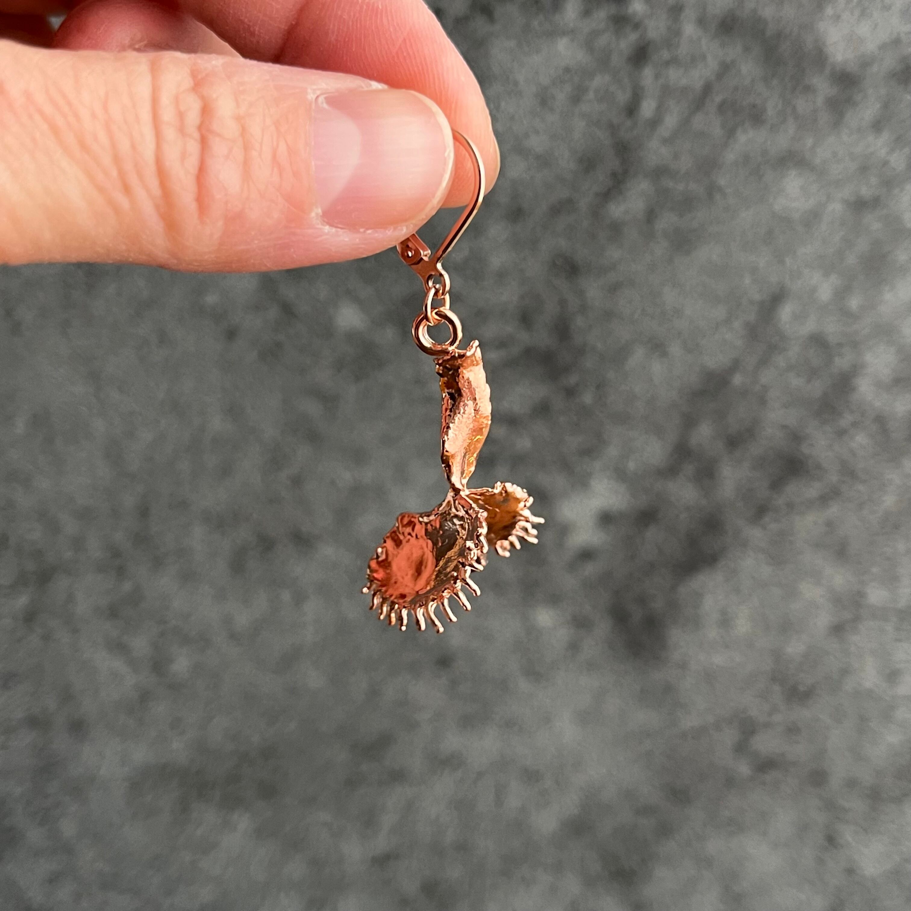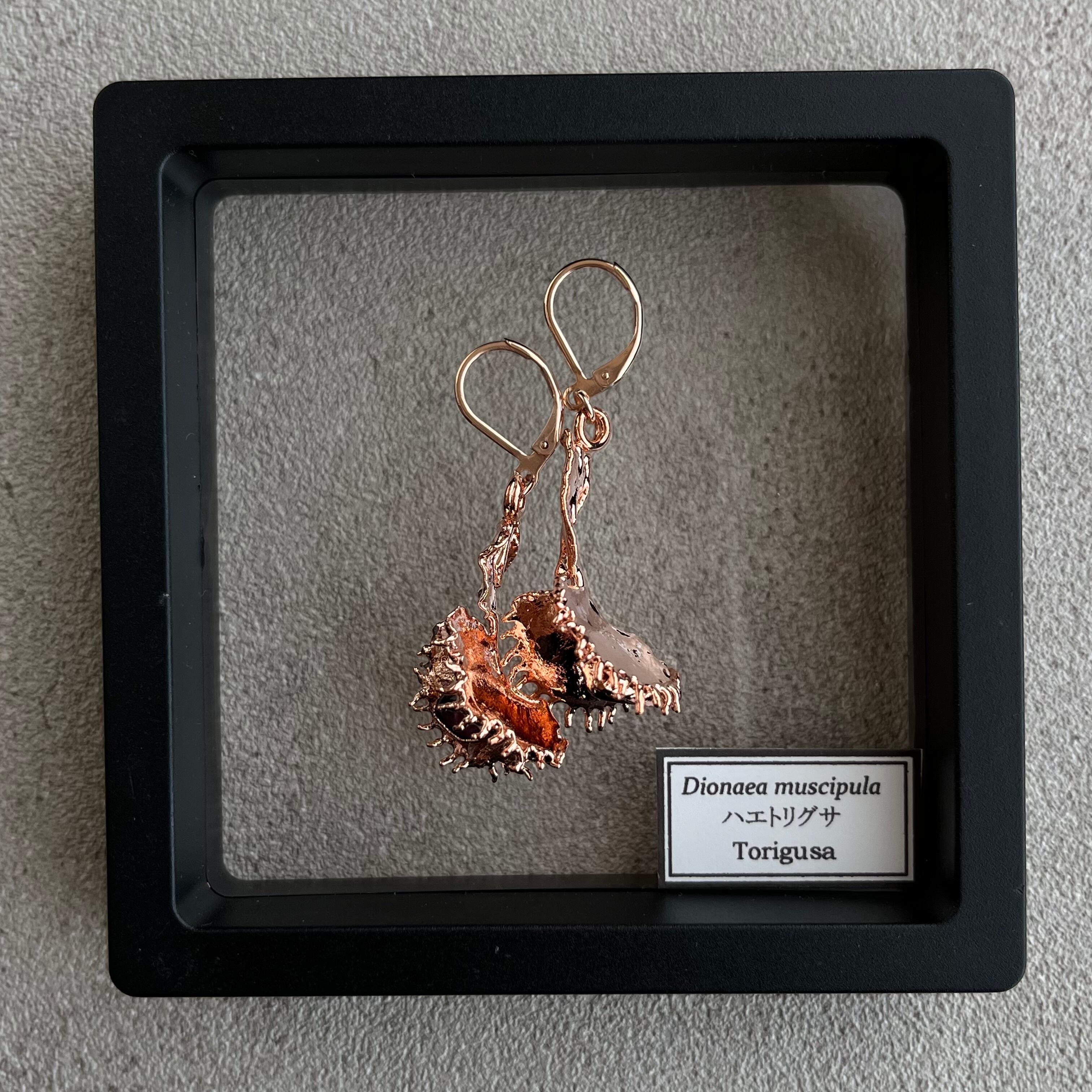 収穫した捕虫葉をエレクトロフォーミングという技法で銅めっきし、アクセサリーに仕立てているため、銅の中には本物のハエトリグサが入っています。