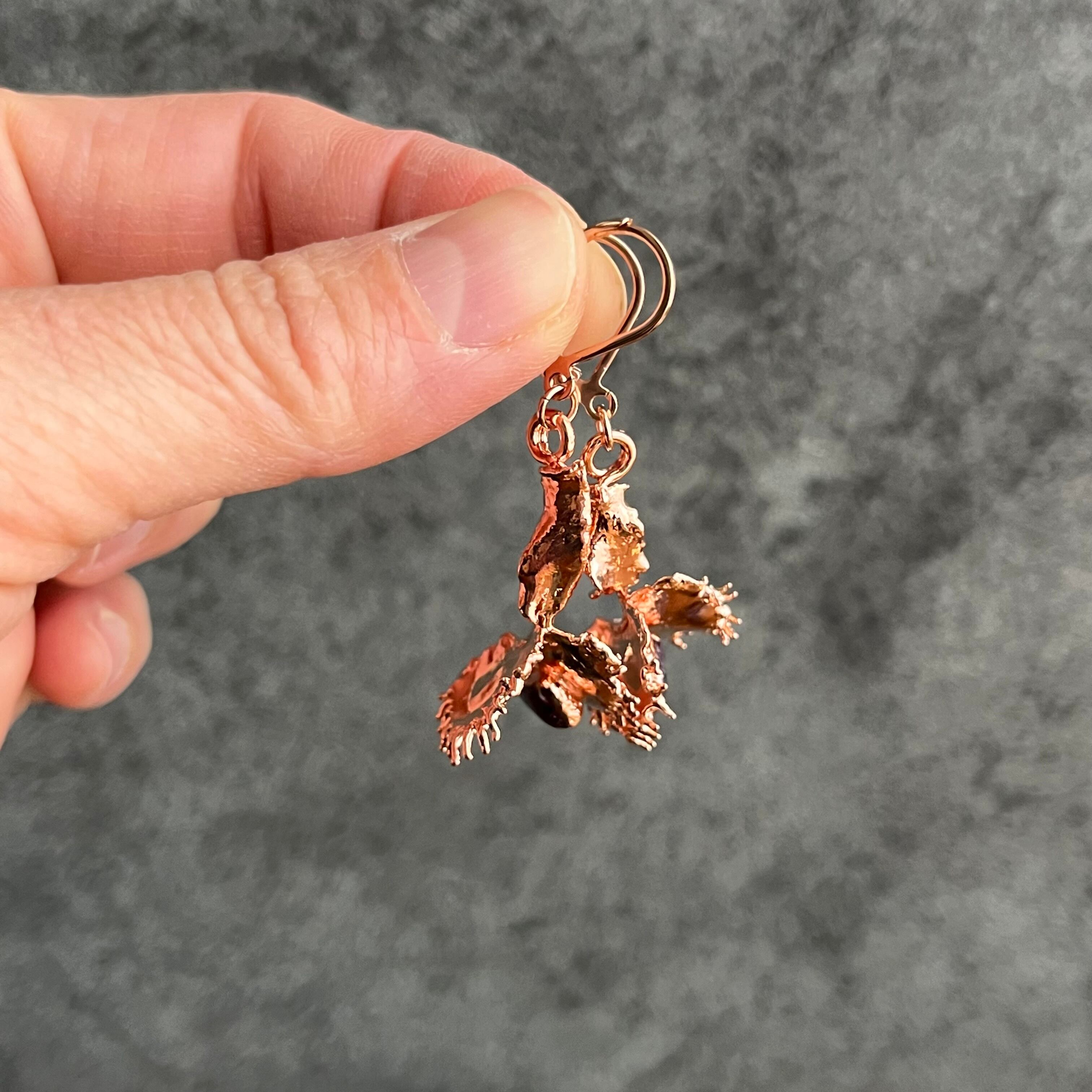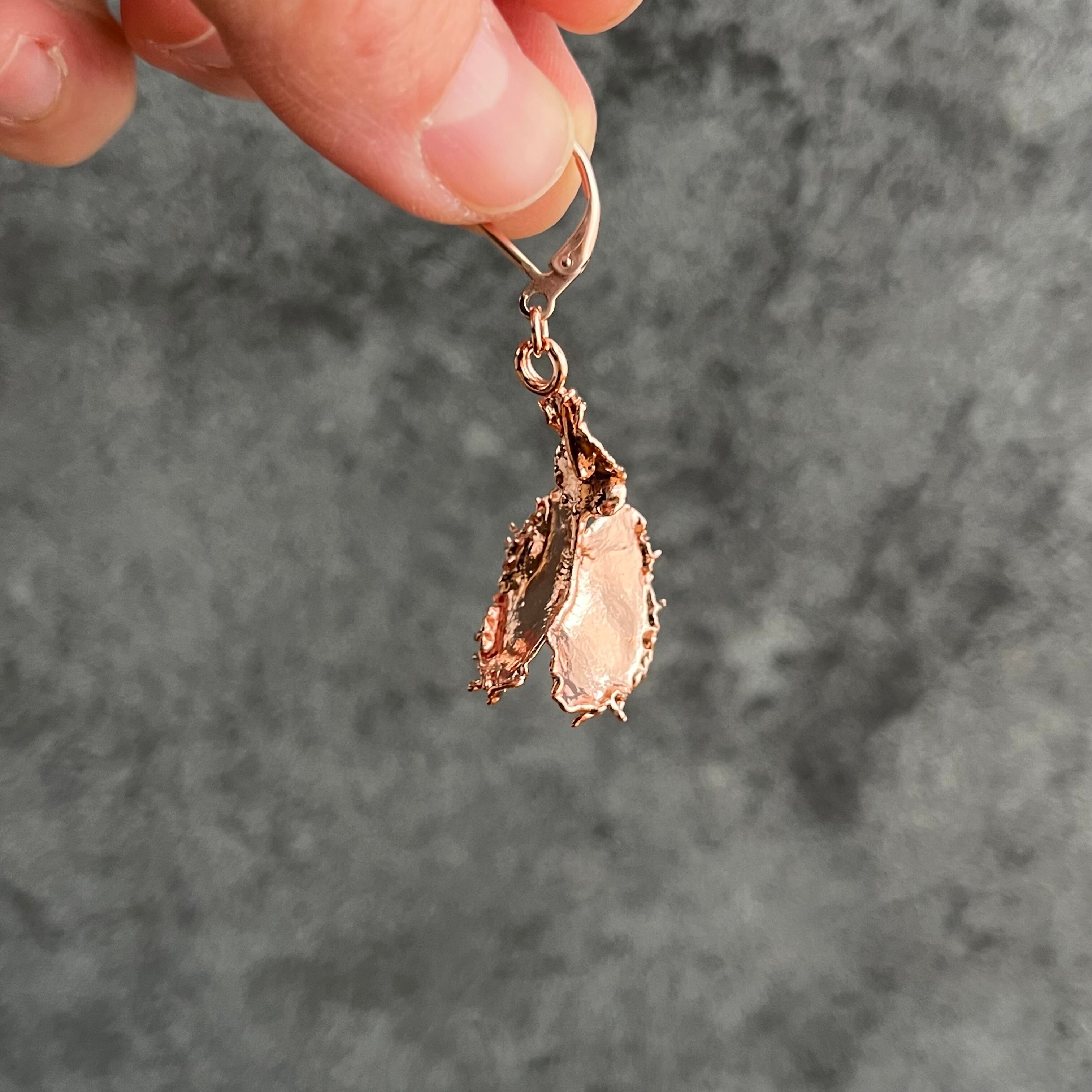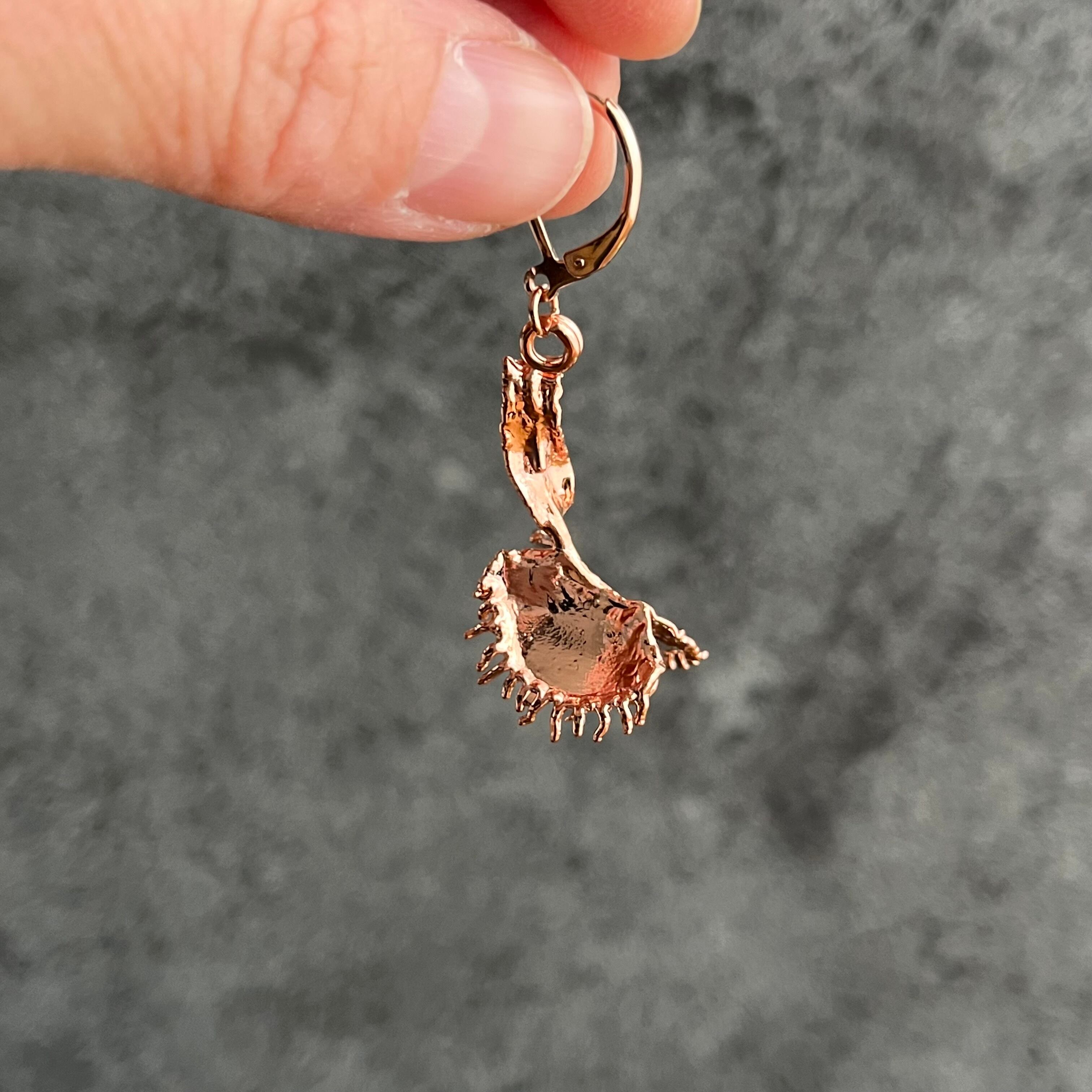 これまで、レジンの作品では棘が残ってしまいアクセサリーに仕立てることができませんでしたが、エレクトロフォーミングを取り入れたことで作者お気に入りのdumplingを耳飾りにすることができました。