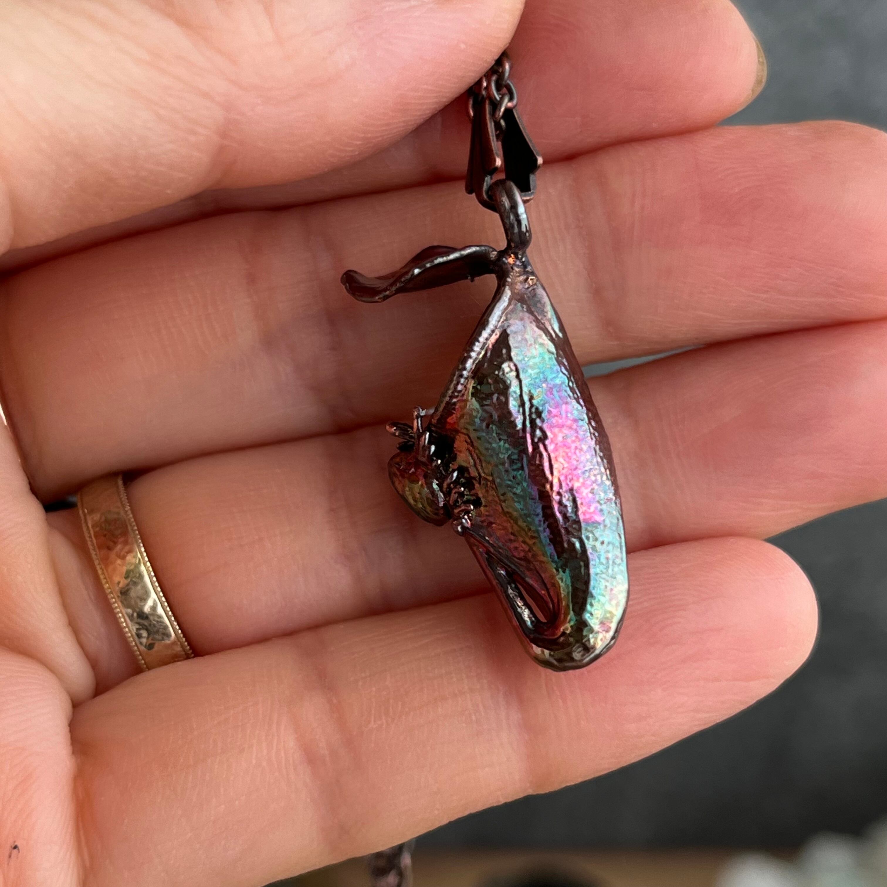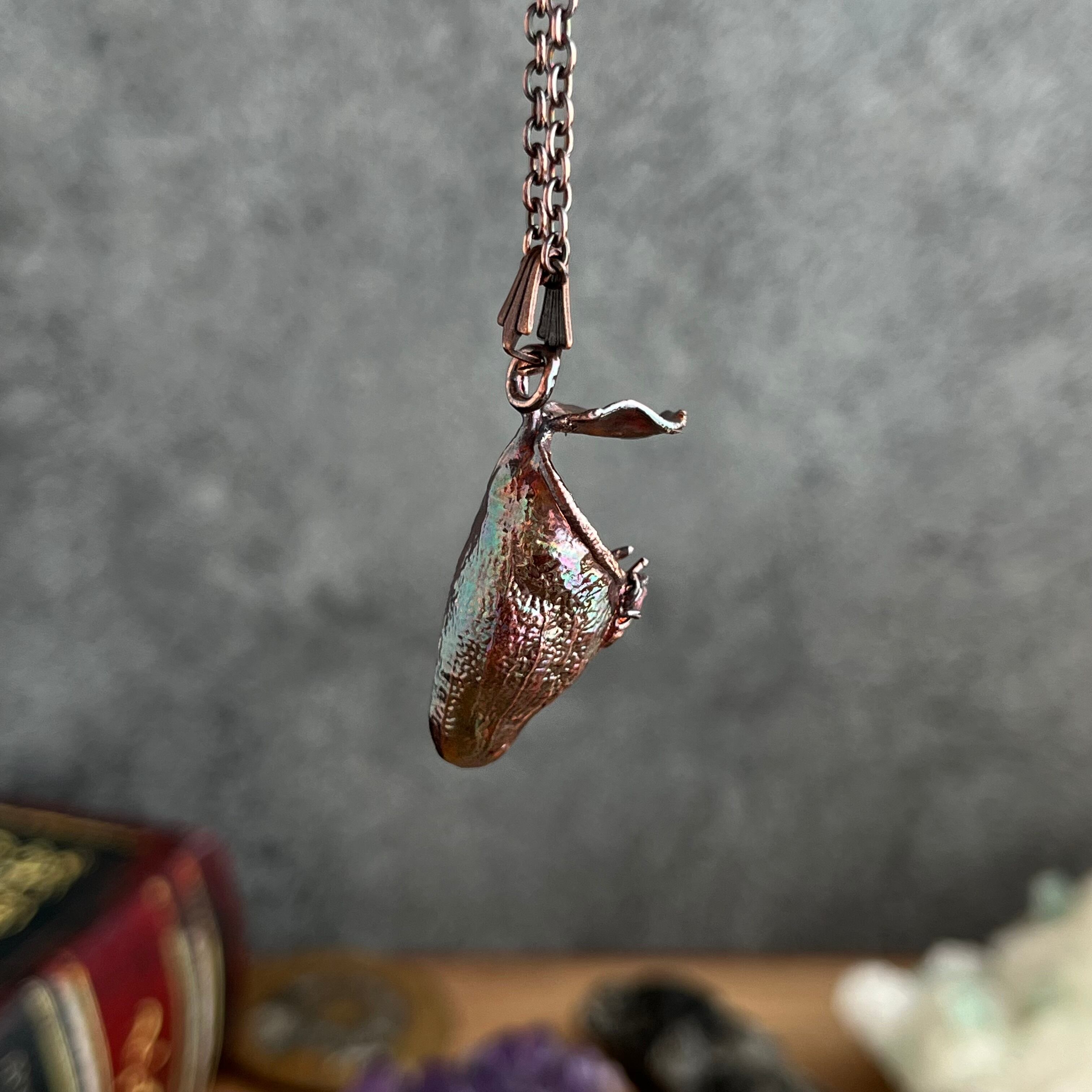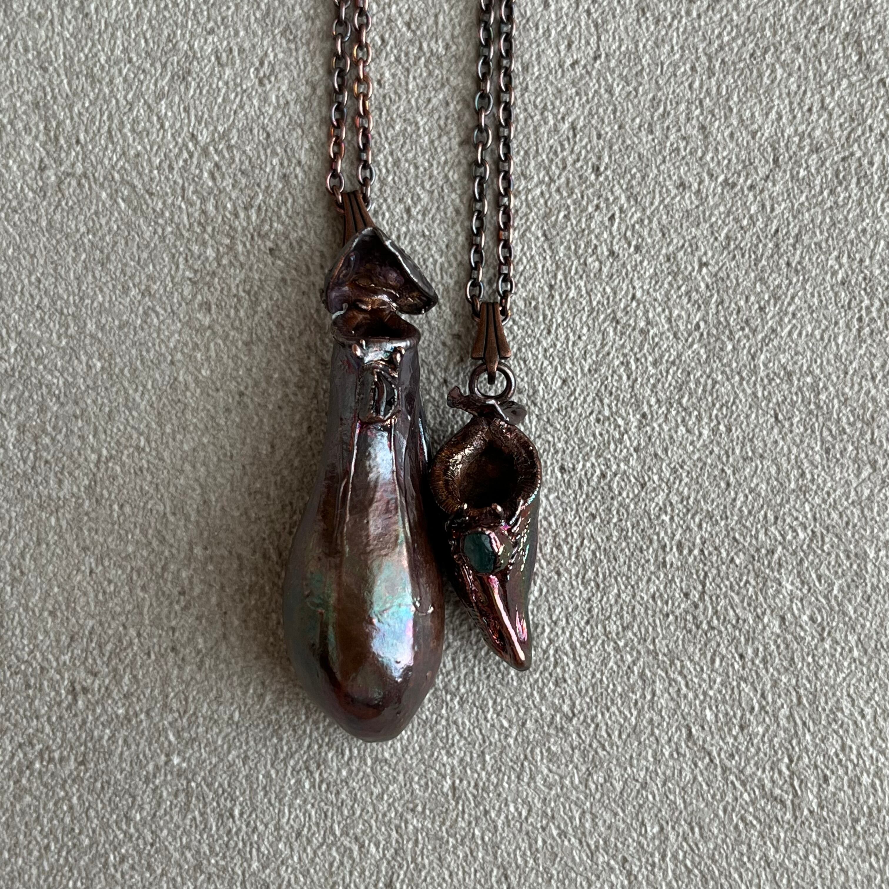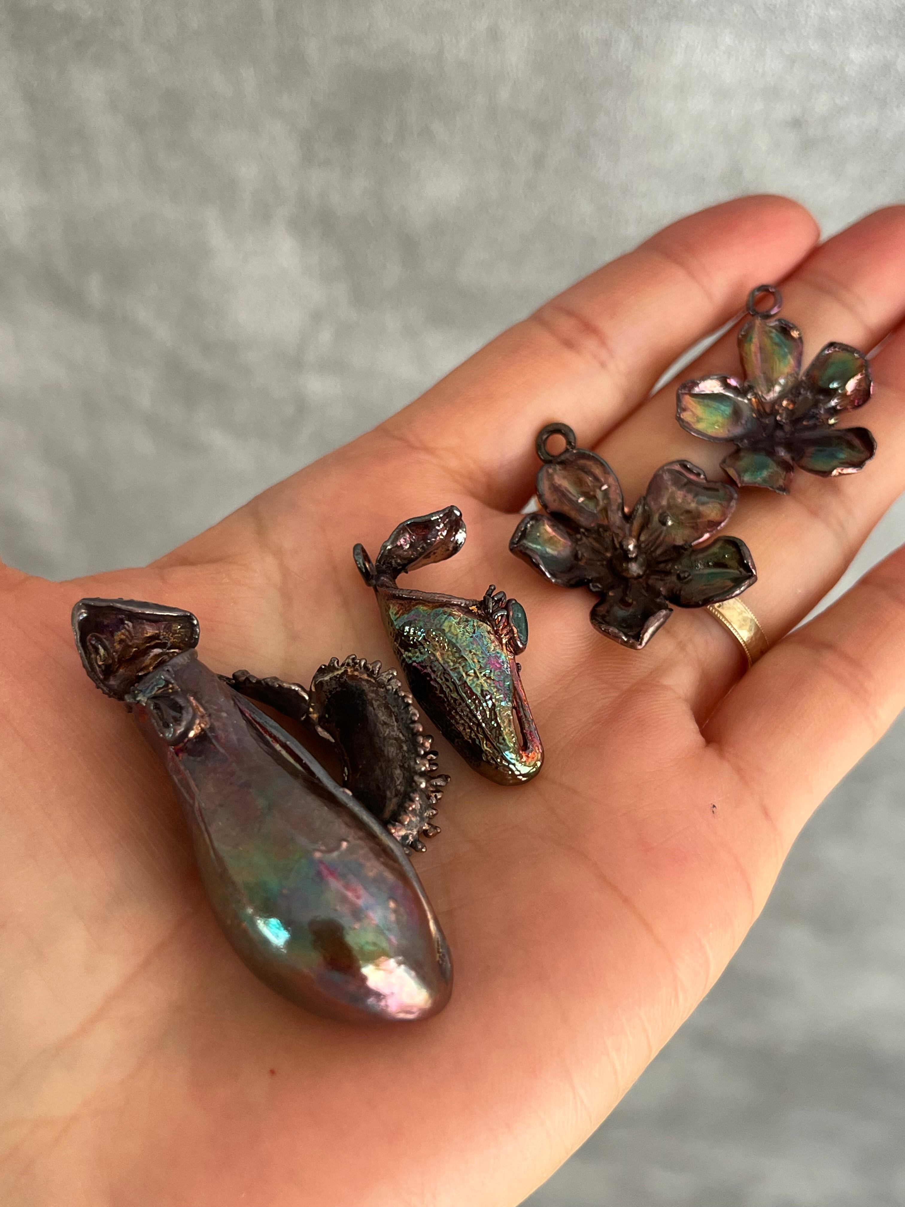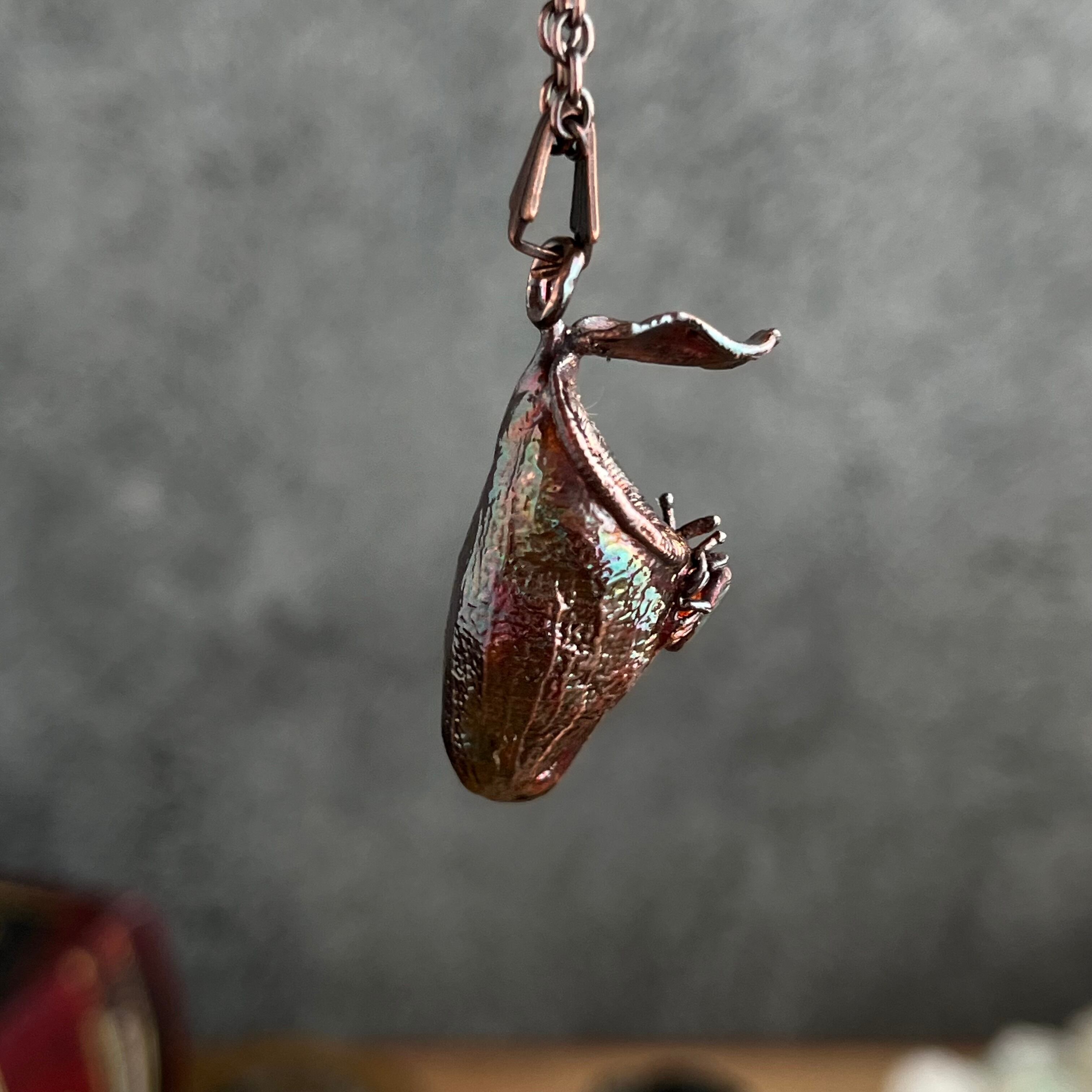 ウツボカズラ「Nepenthes jamban(ジャンバン)」の捕虫袋を収穫し洗浄後、エレクトロフォーミングという技法で銅めっきをほどこし、ネックレスを作製しました。