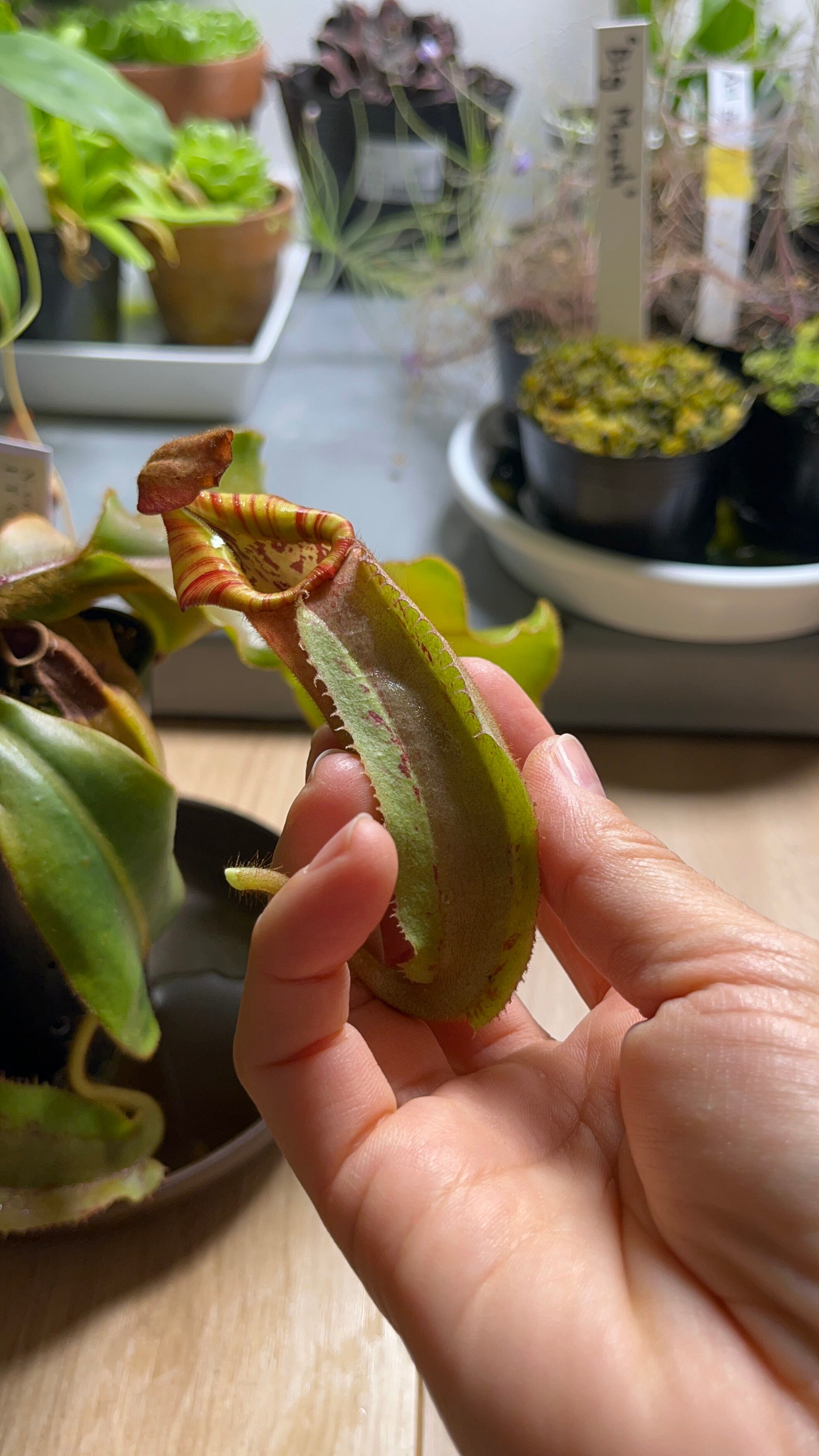 ビーチーは和名をキエリウツボ(黄襟ウツボ)といい、その名の通りウツボカズラの中でもひときわ大きな襟を持つ種類です。