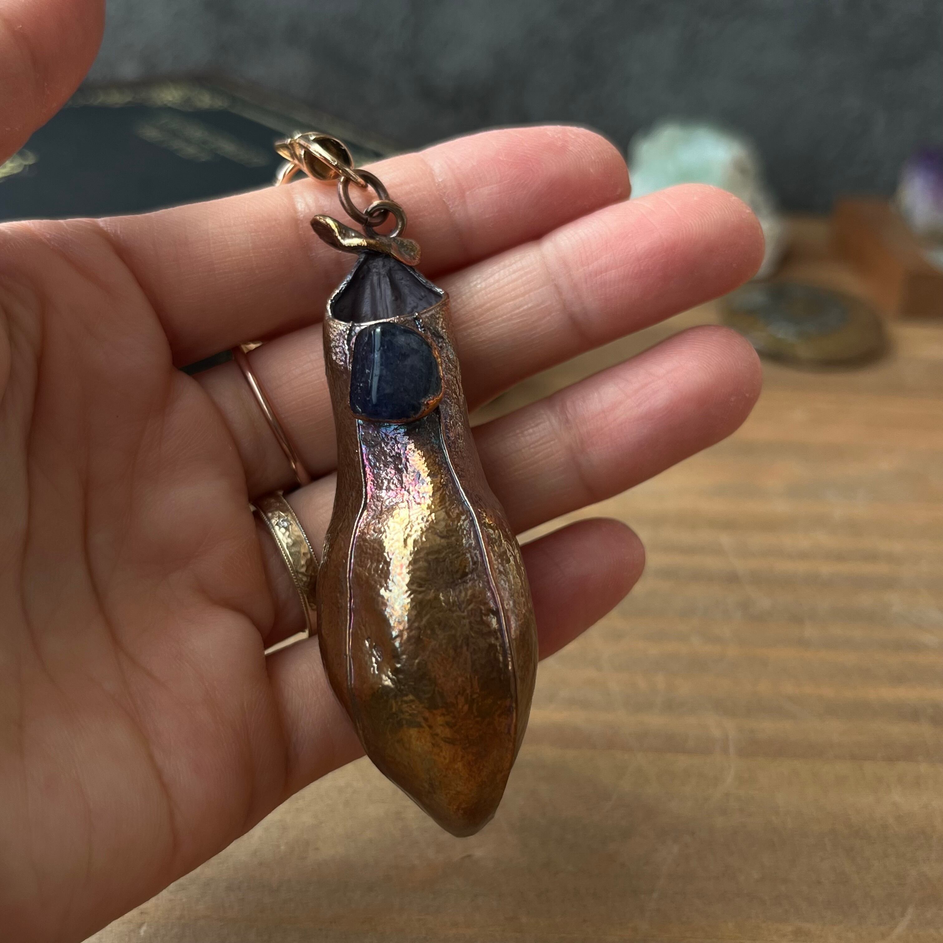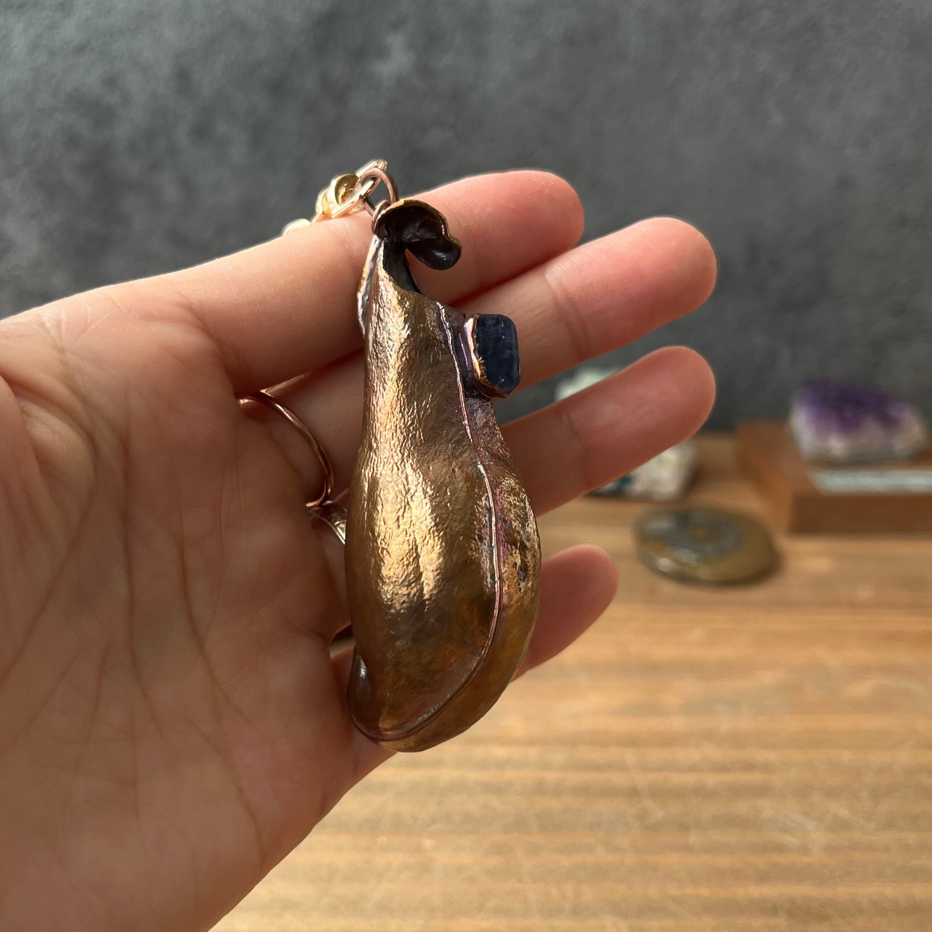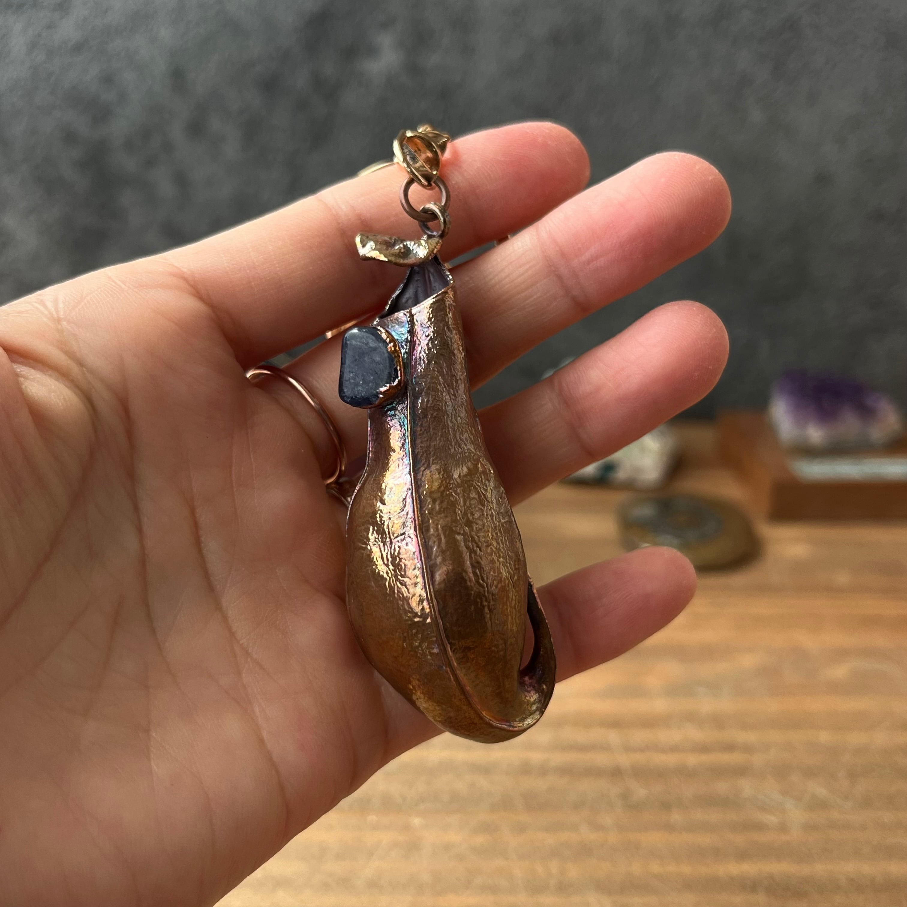 ウツボカズラ「N. gracilis」の捕虫袋(ピッチャー)を収穫し、洗浄後、エレクトロフォーミングという技法で銅めっきをほどこし、ネックレスを作製しました。