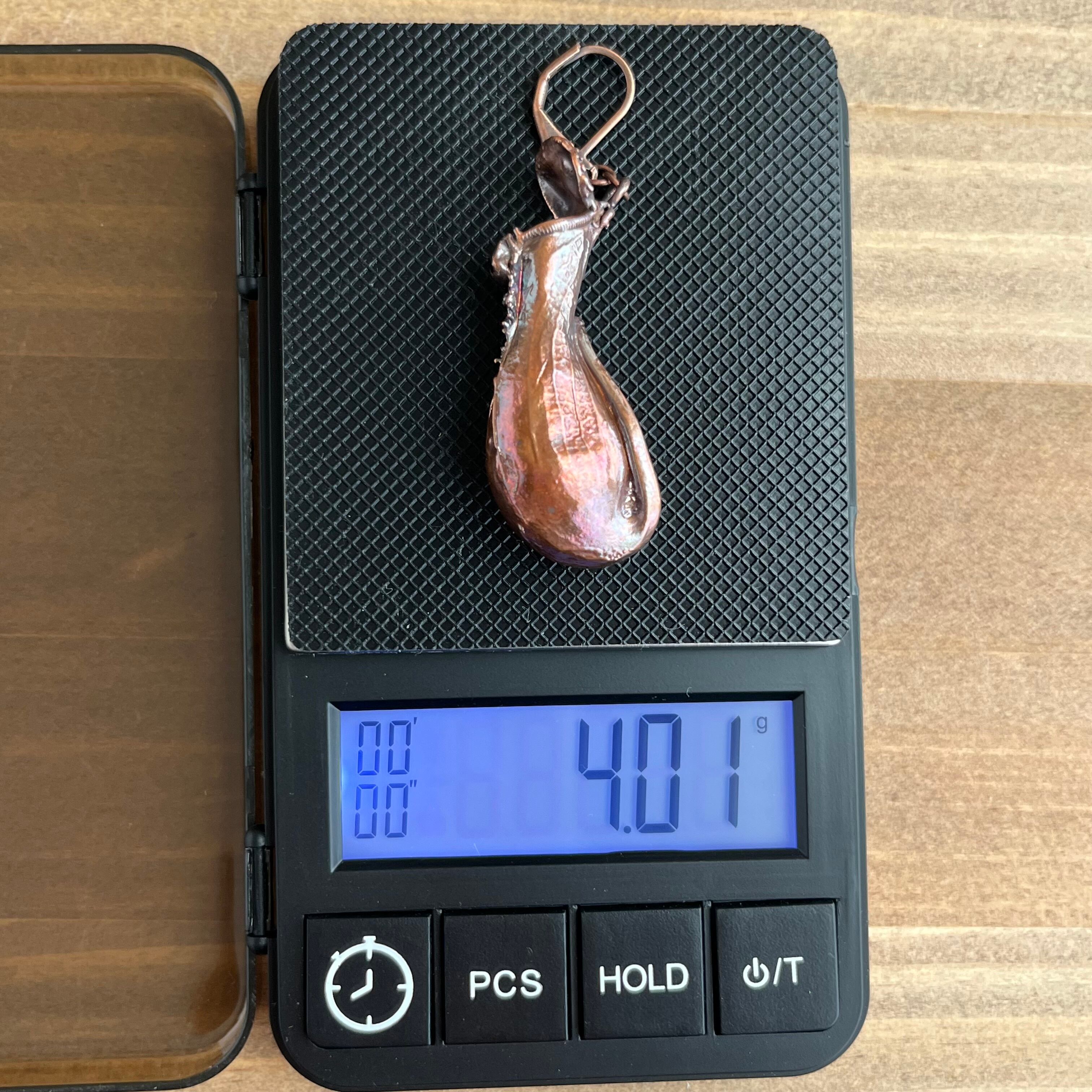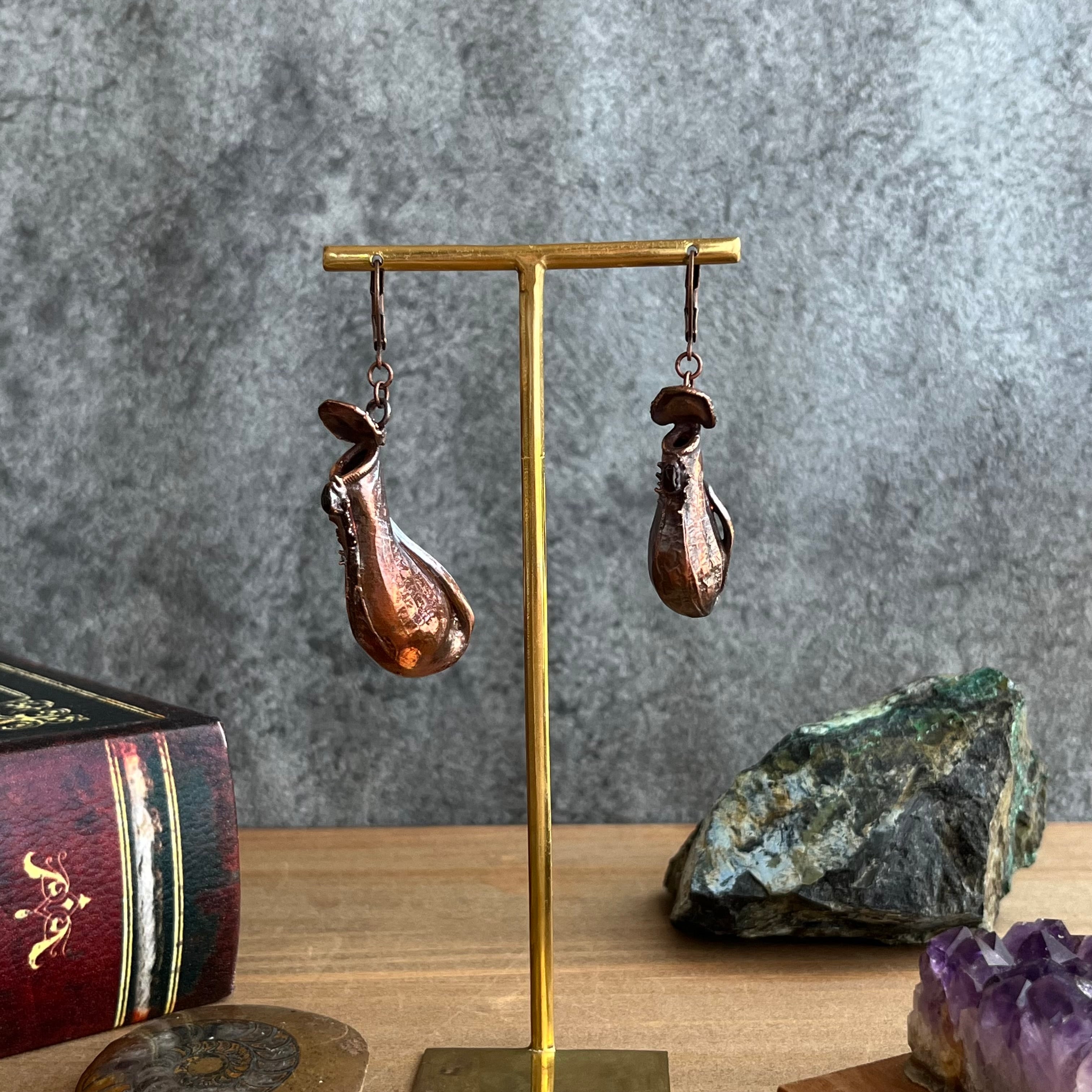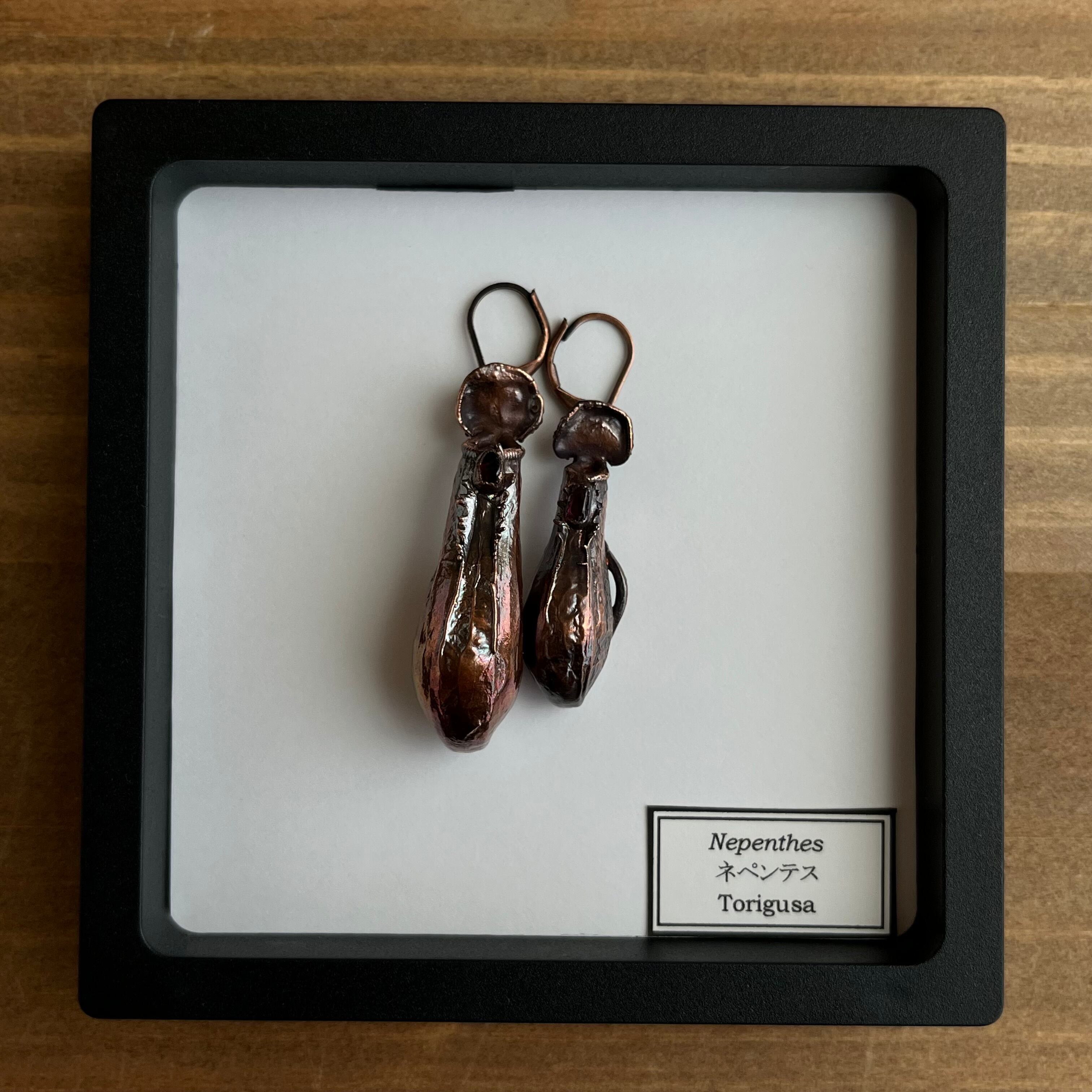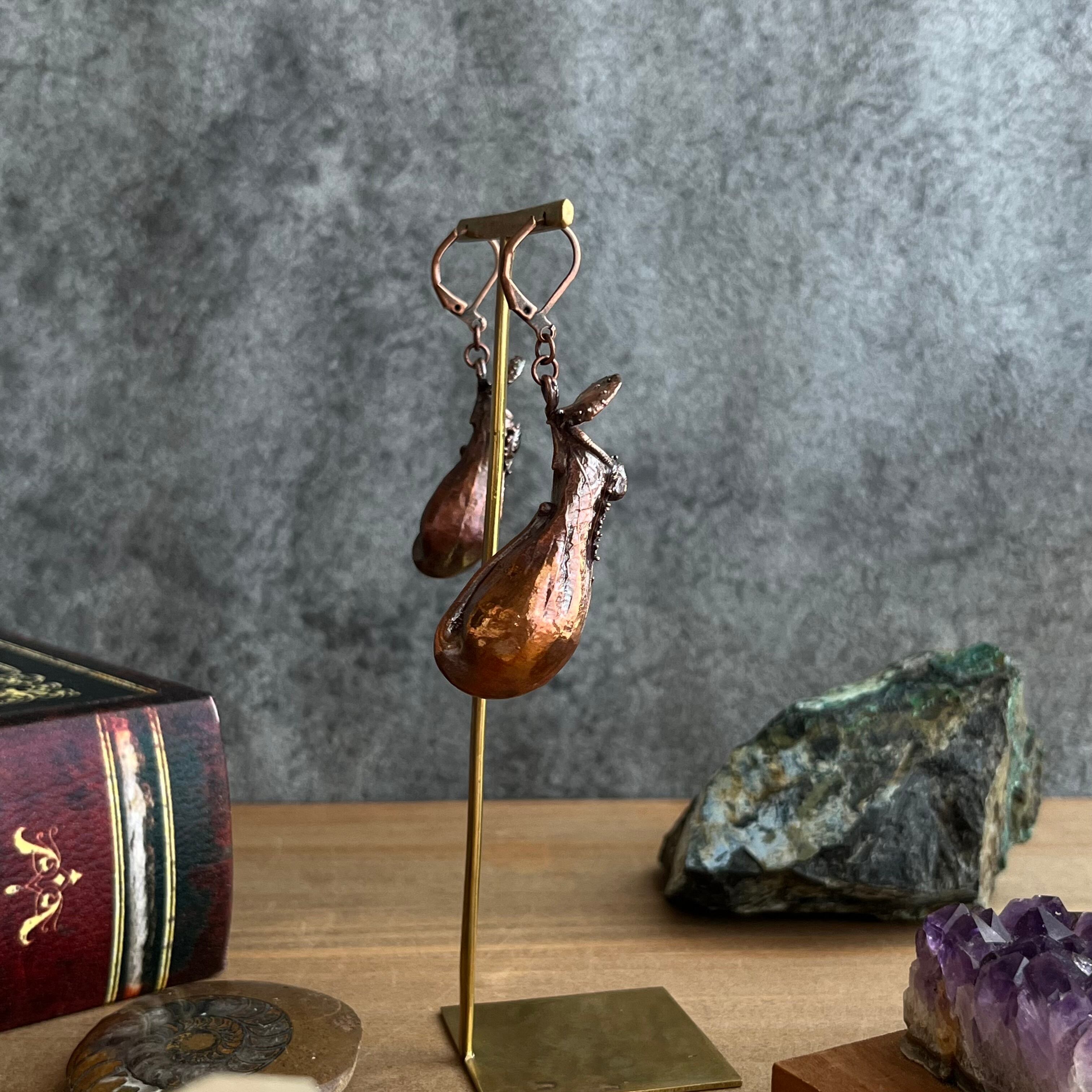 ウツボカズラ(ネペンテス)「アラタ」の捕虫袋(ピッチャー)を収穫し、洗浄後、エレクトロフォーミングという技法で銅めっきをほどこし、ピアスを作製しました。