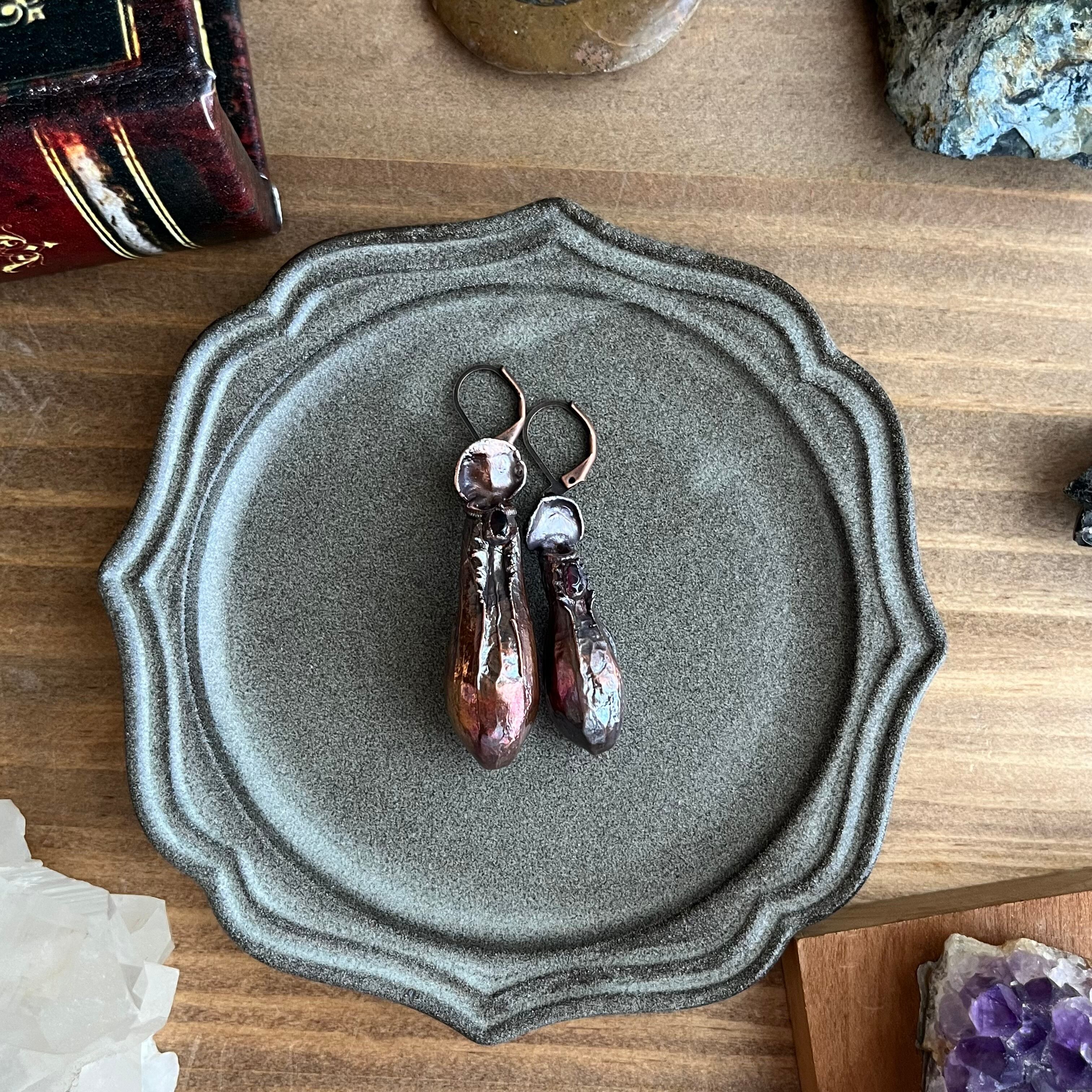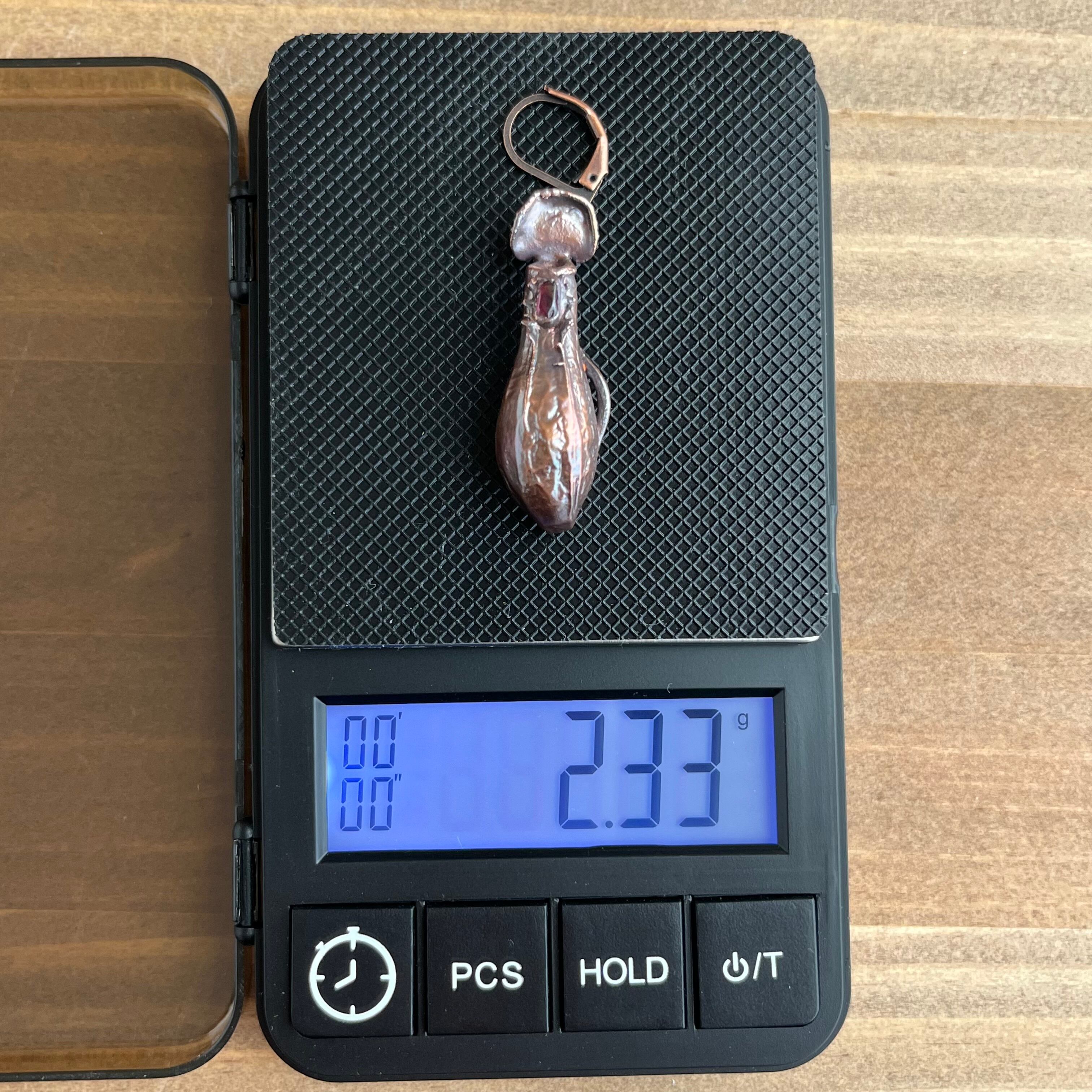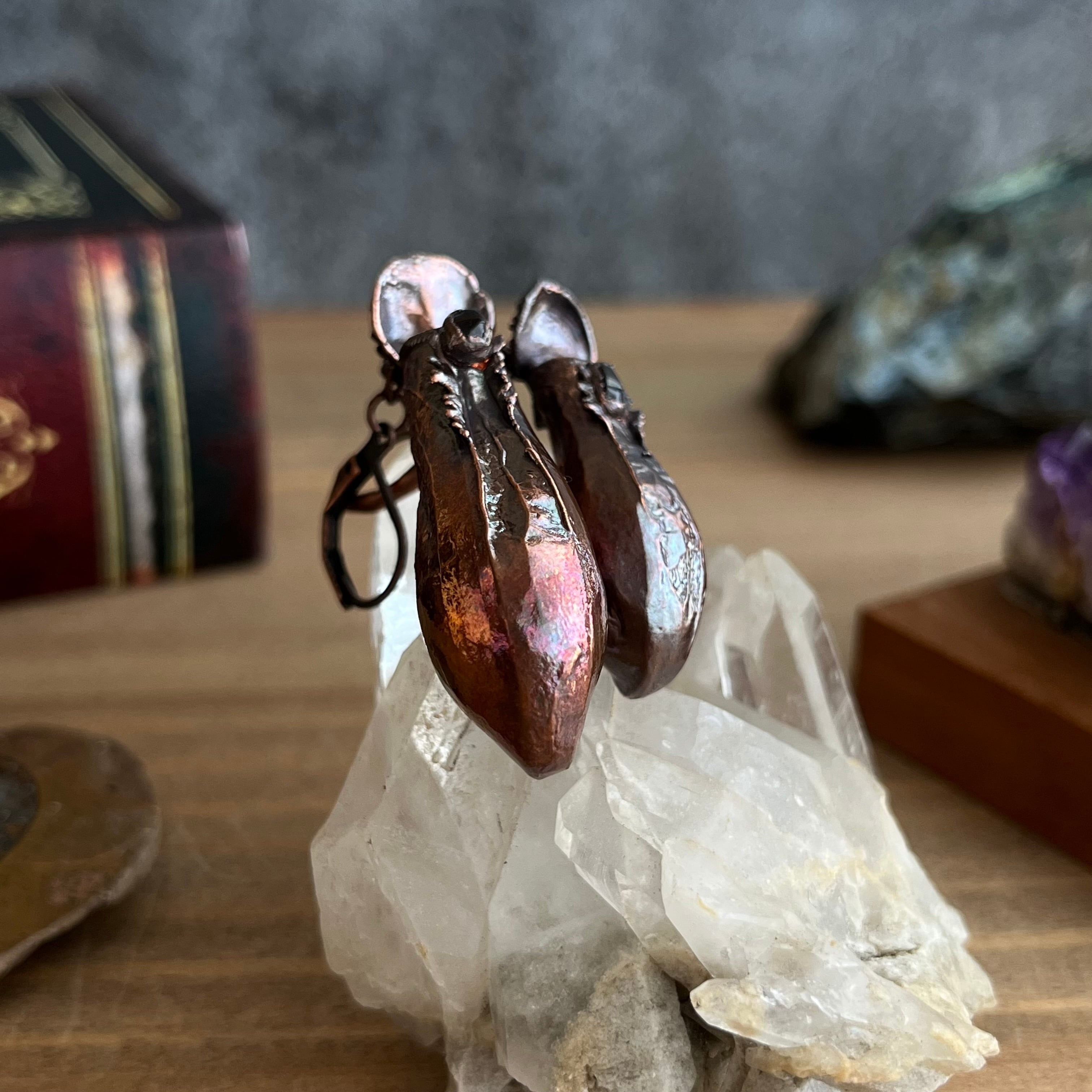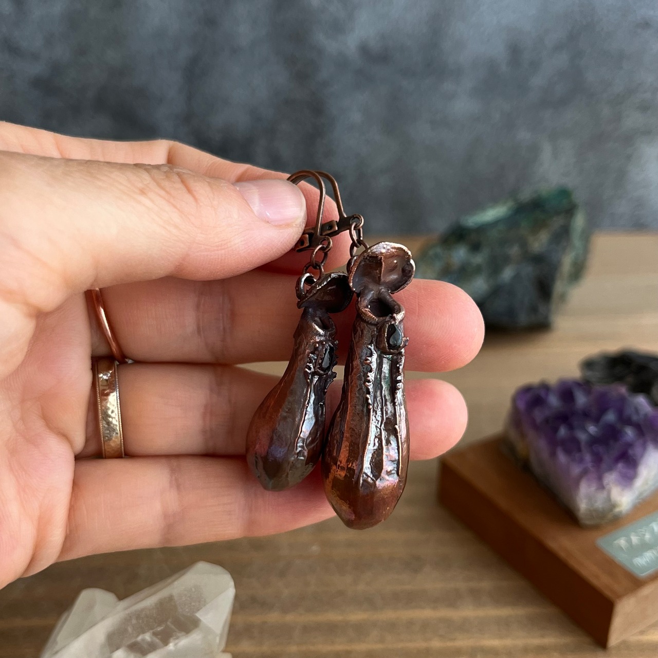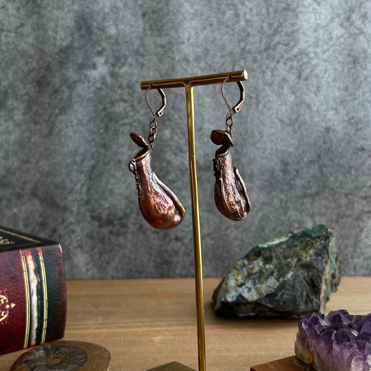 ウツボカズラ(ネペンテス)「アラタ」の捕虫袋(ピッチャー)を収穫し、洗浄後、エレクトロフォーミングという技法で銅めっきをほどこし、ピアスを作製しました。