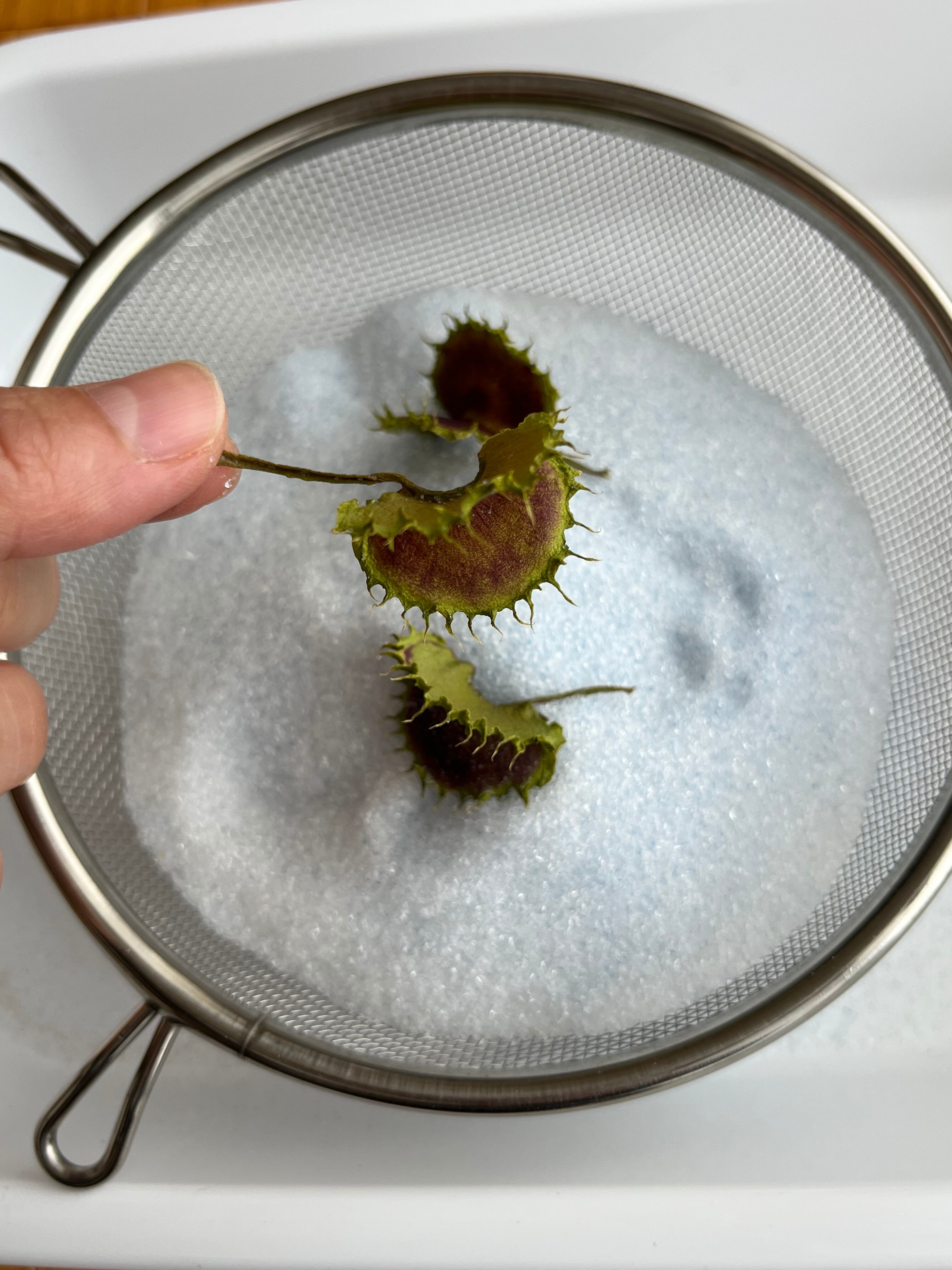 これらの品種は、よく見るハエトリグサと比べ葉の縁にある棘が牙のように波打っており、蓋が肉厚で、アクセサリーにした際に非常に華やかな印象的を受ける種類です。