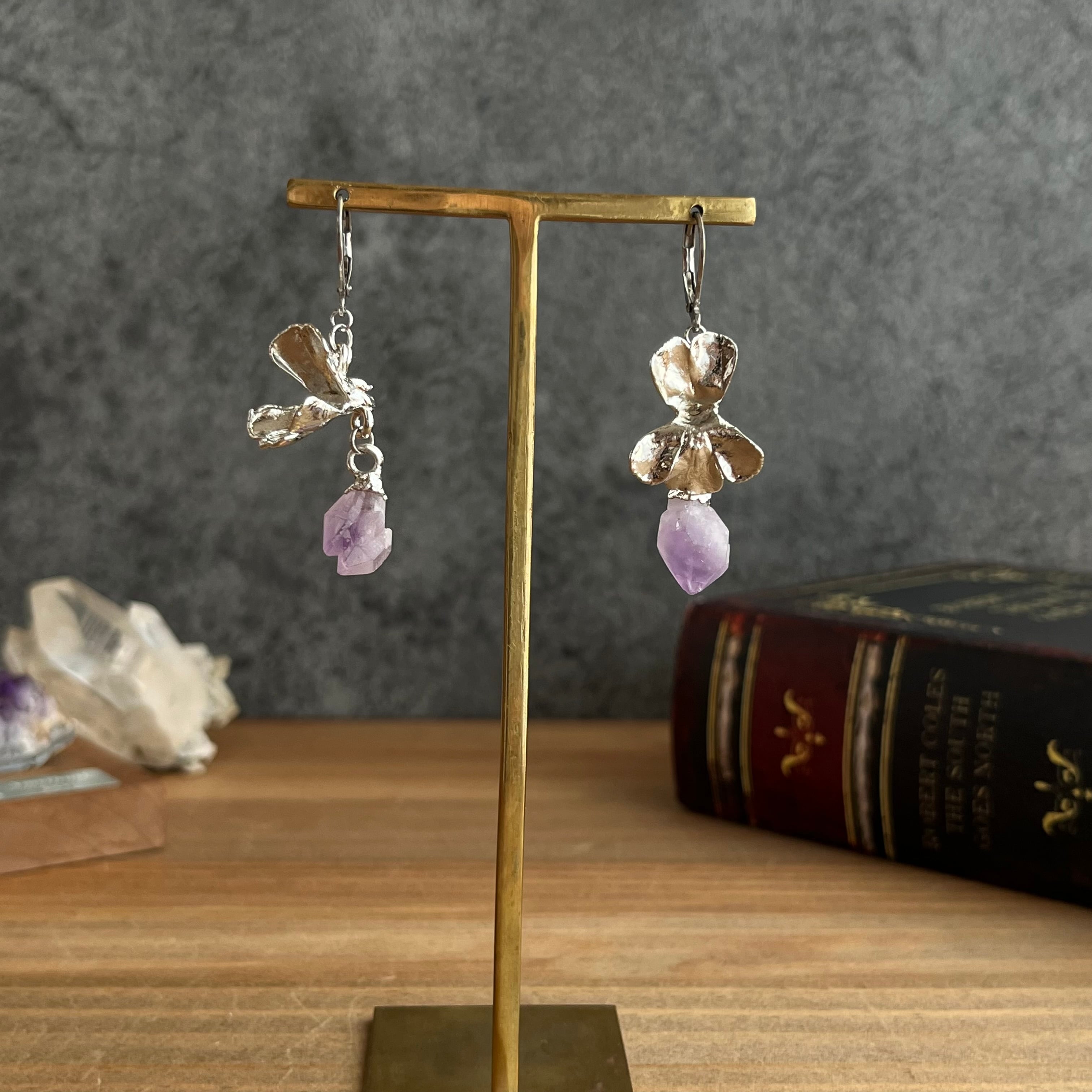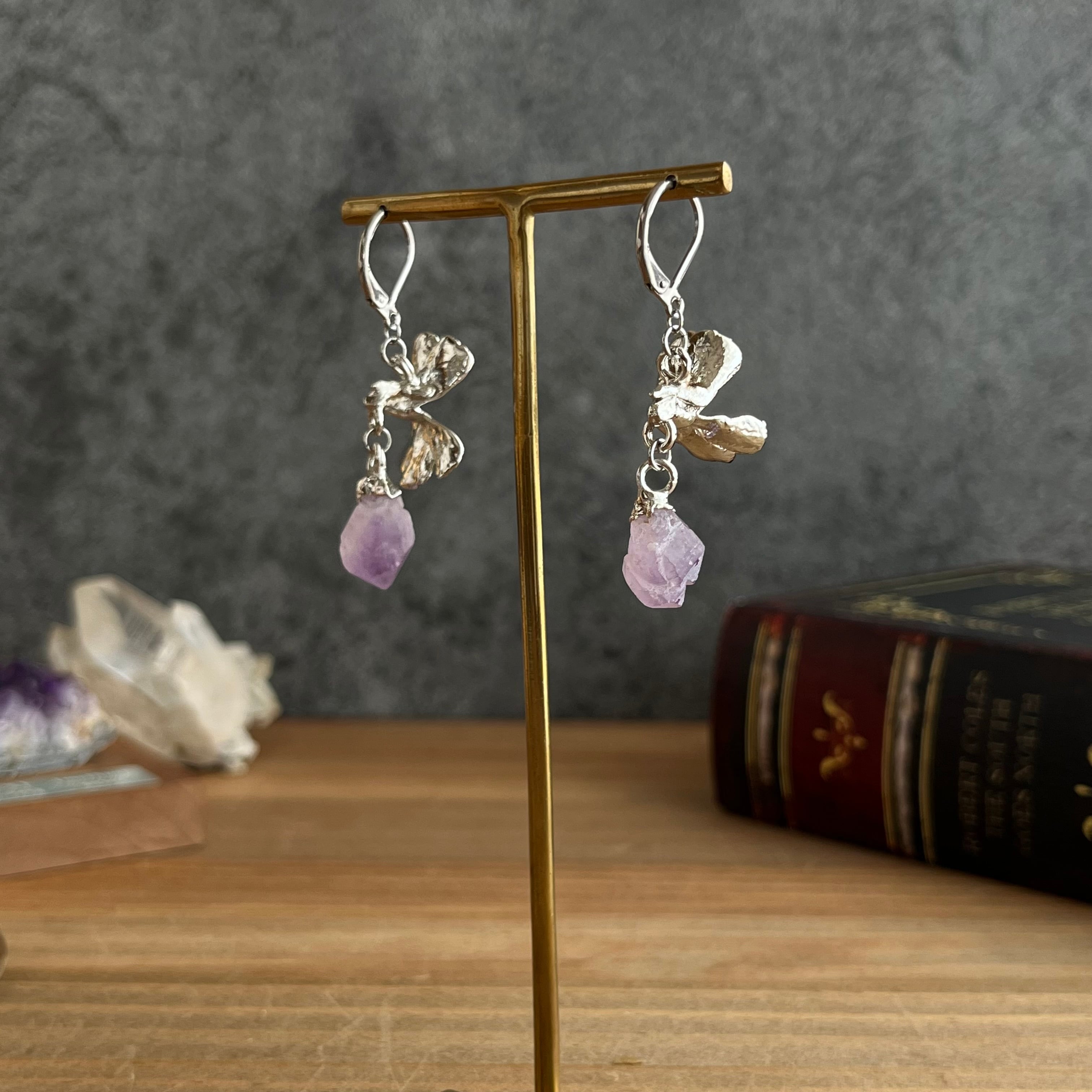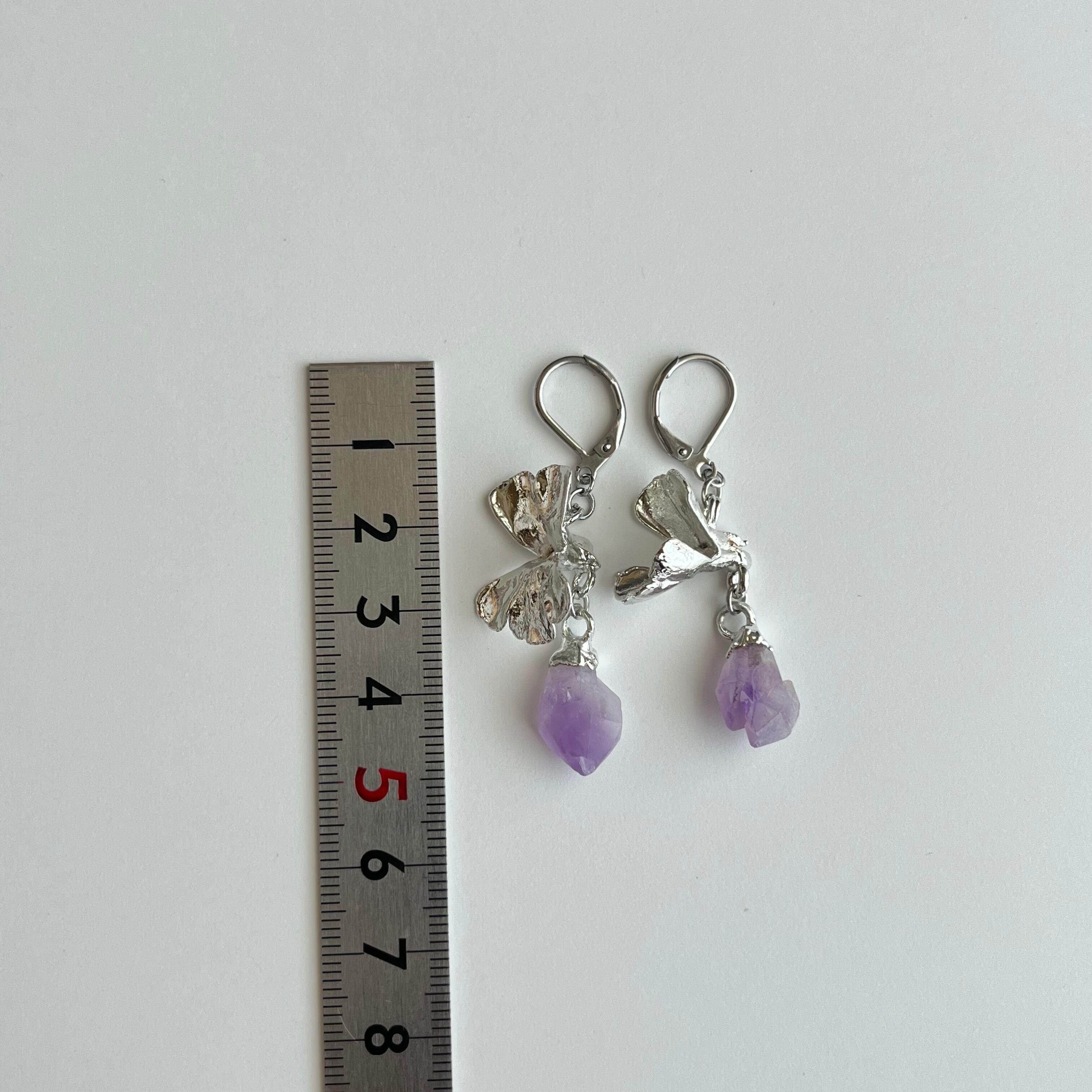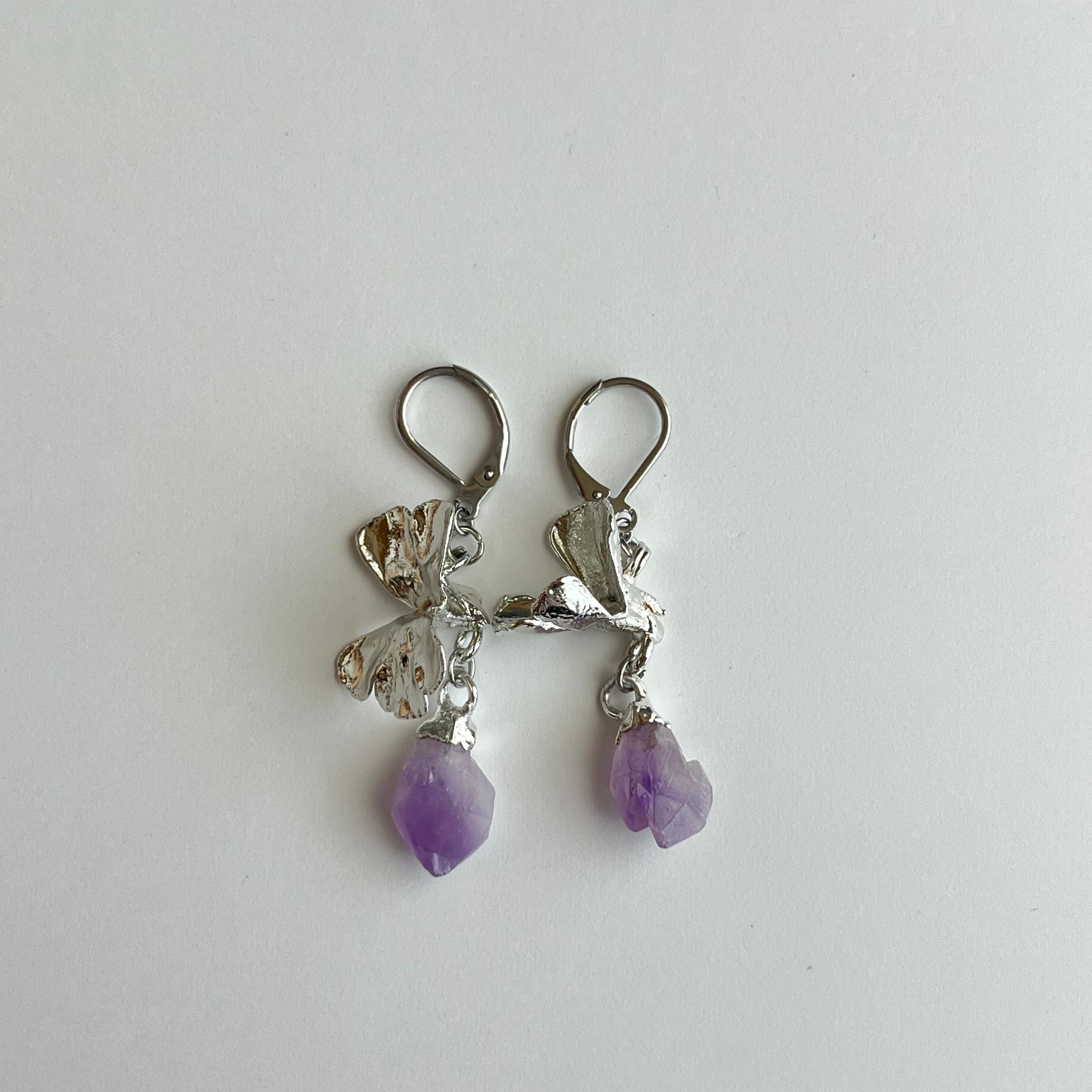 すずになった蜜を宝石に変えたムシトリスミレのピアス56(esseriana ×アメジスト)