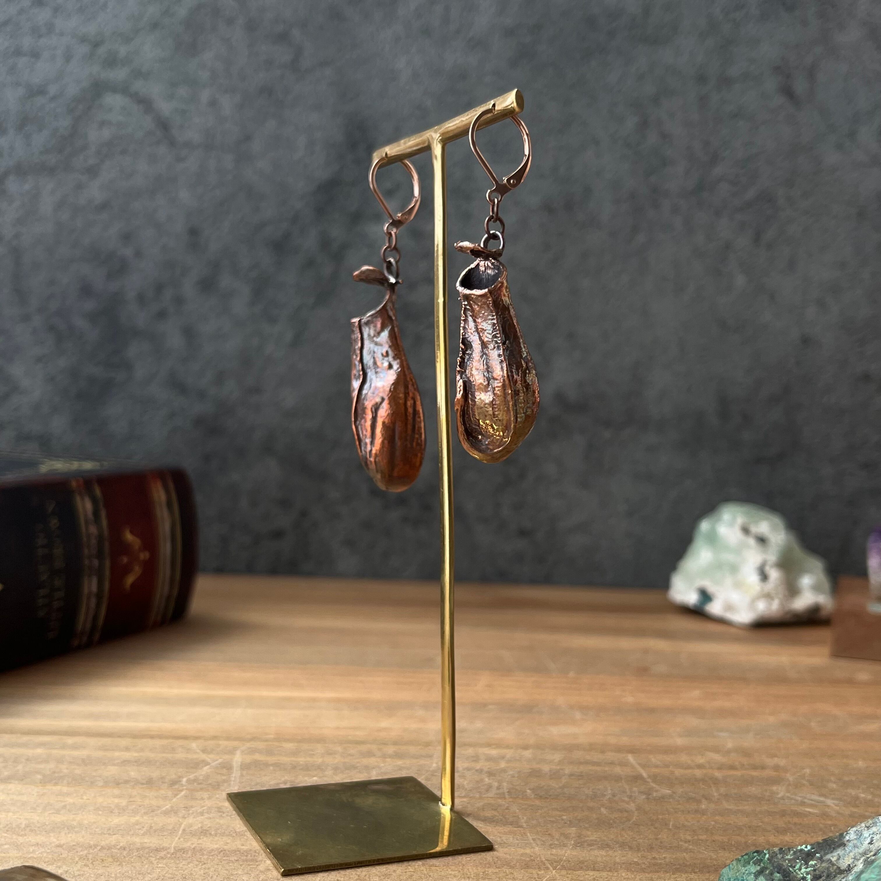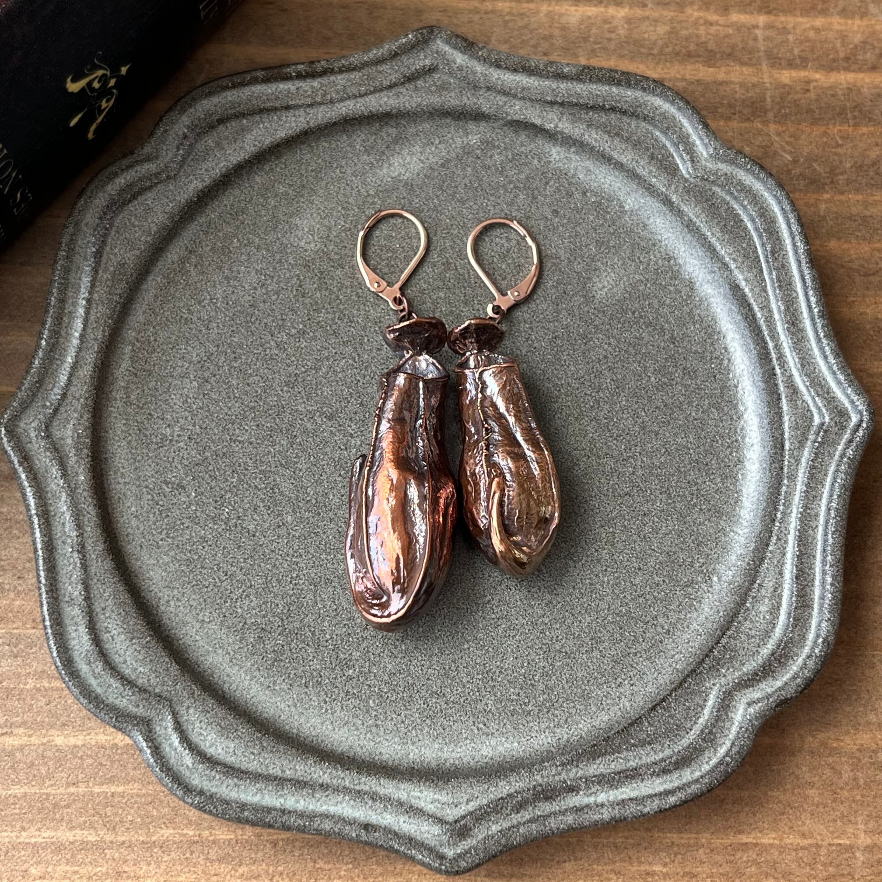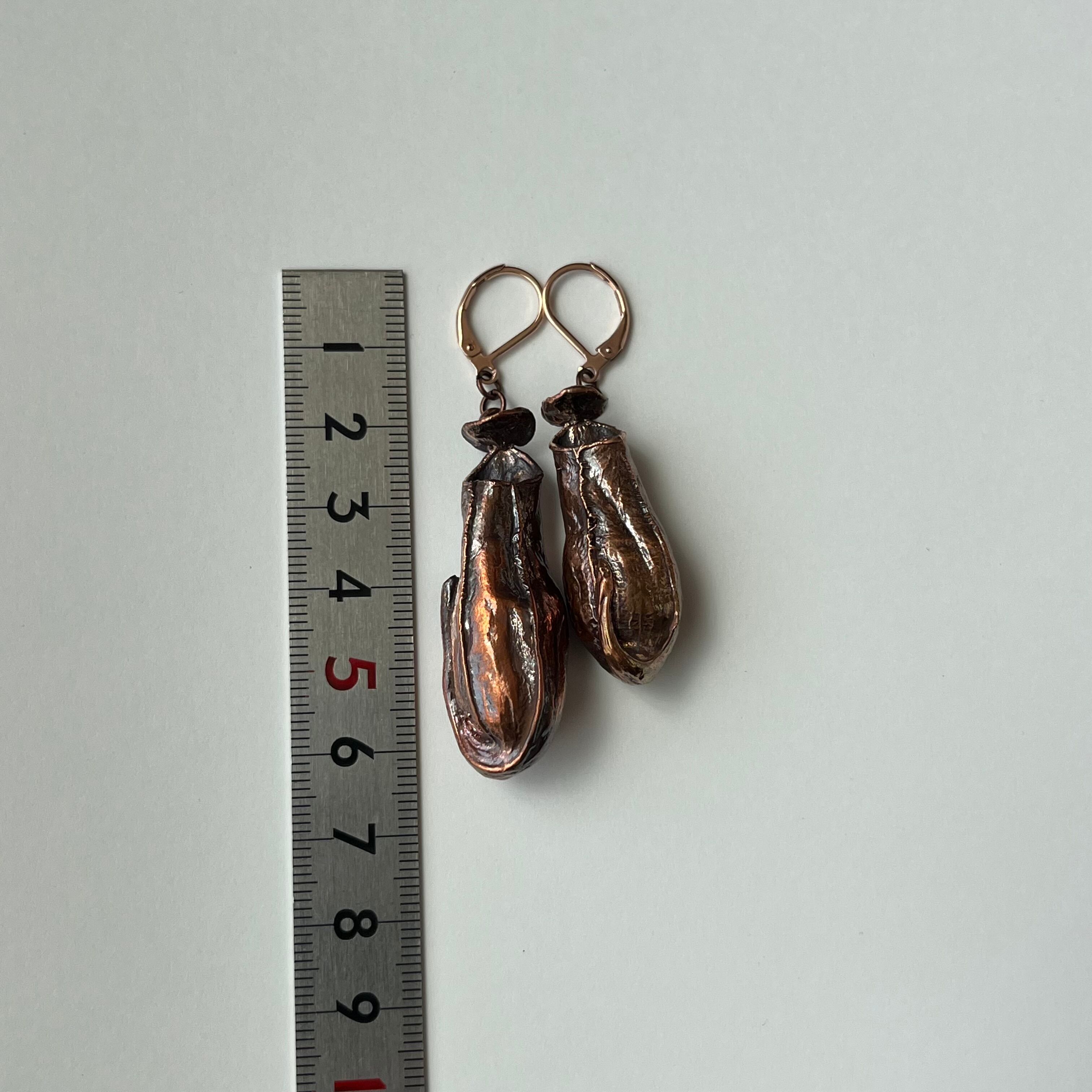 ウツボカズラ「N. gracilis」の捕虫袋(ピッチャー)を収穫し、洗浄後、エレクトロフォーミングという技法で銅めっきをほどこし、ピアス(イヤリング)を作製しました。