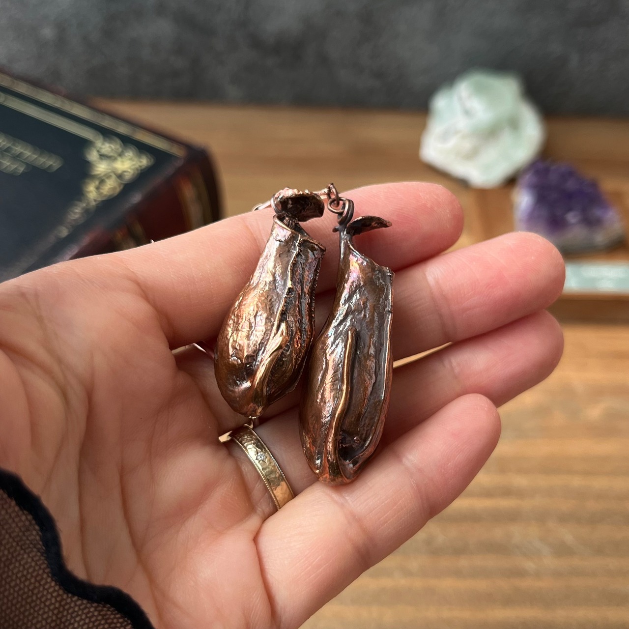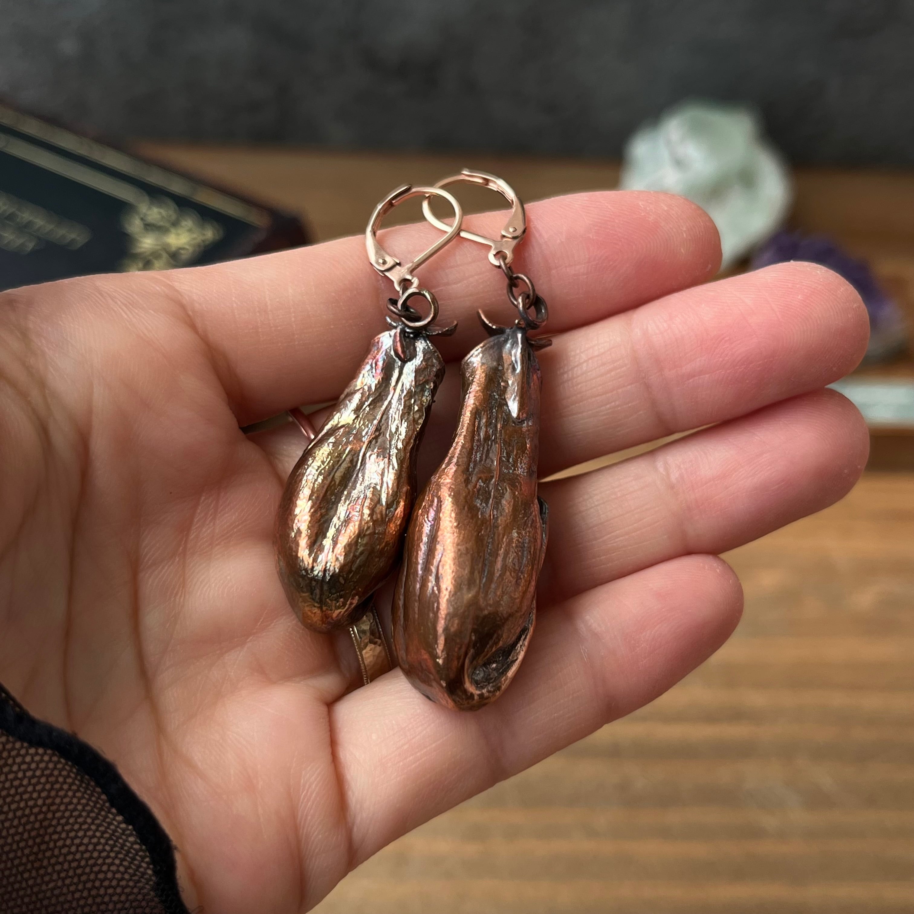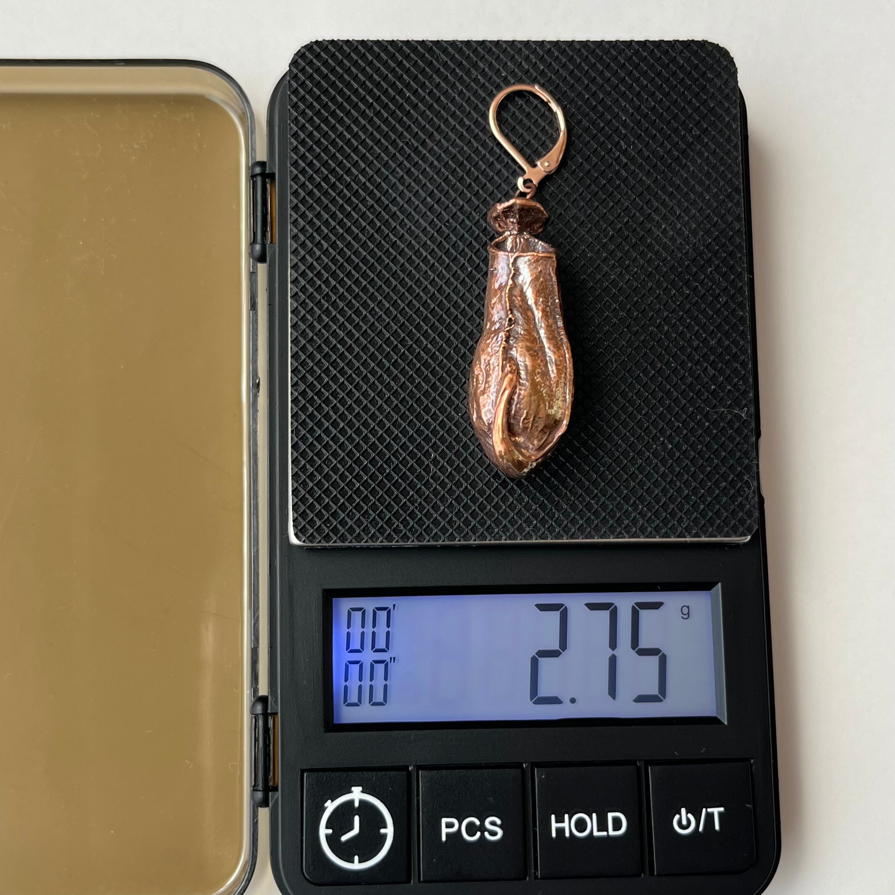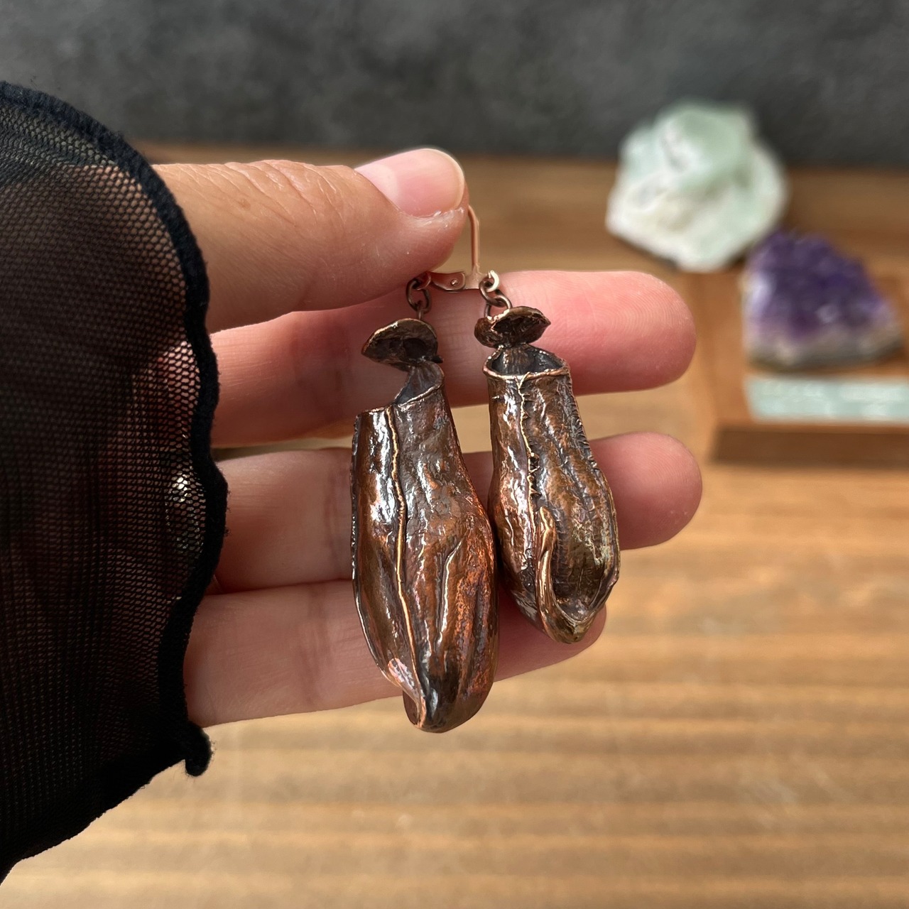 ウツボカズラ「N. gracilis」の捕虫袋(ピッチャー)を収穫し、洗浄後、エレクトロフォーミングという技法で銅めっきをほどこし、ピアス(イヤリング)を作製しました。