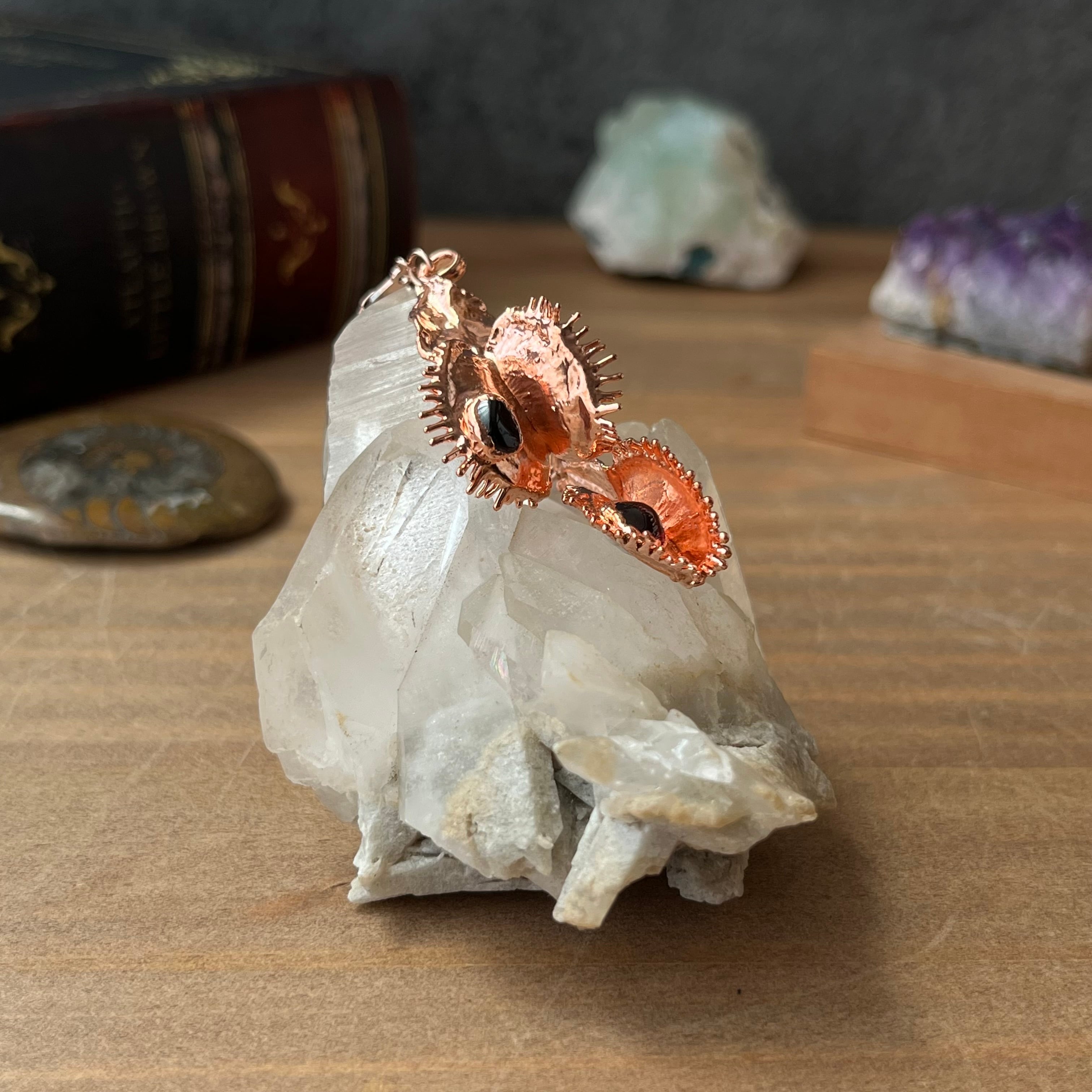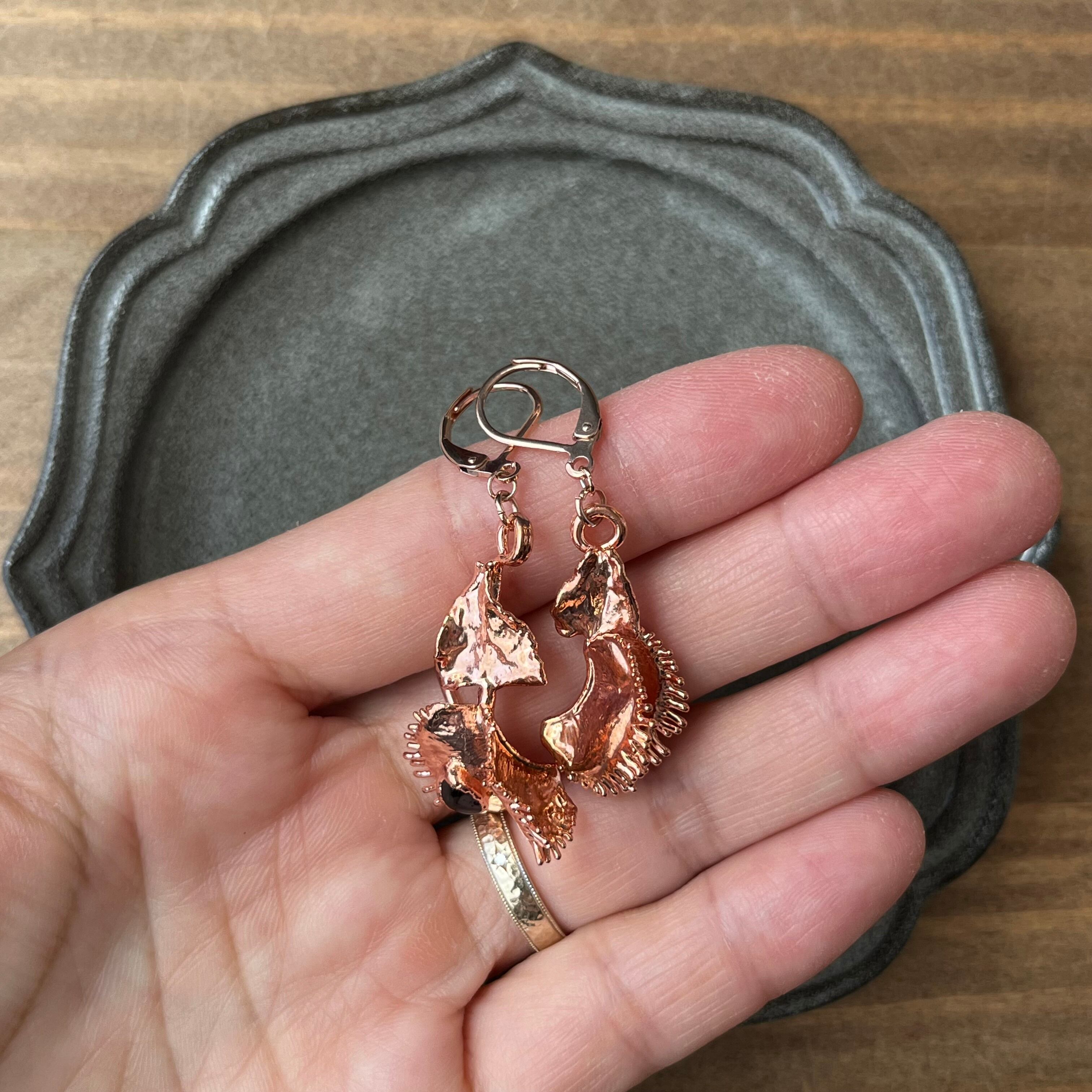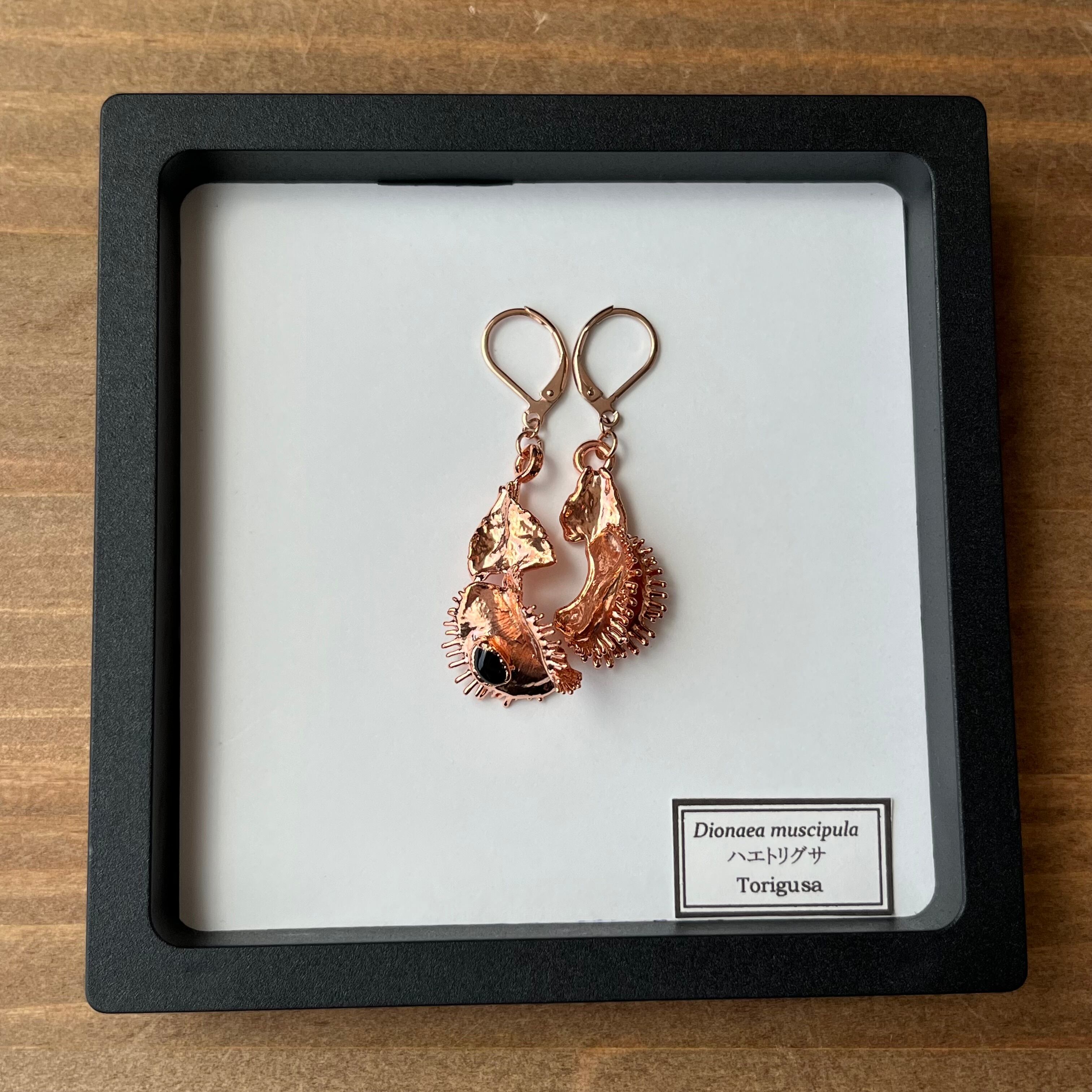 収穫した捕虫葉をエレクトロフォーミングという技法で銅めっきし、アクセサリーに仕立てているため、銅の中には本物のハエトリグサが入っています。