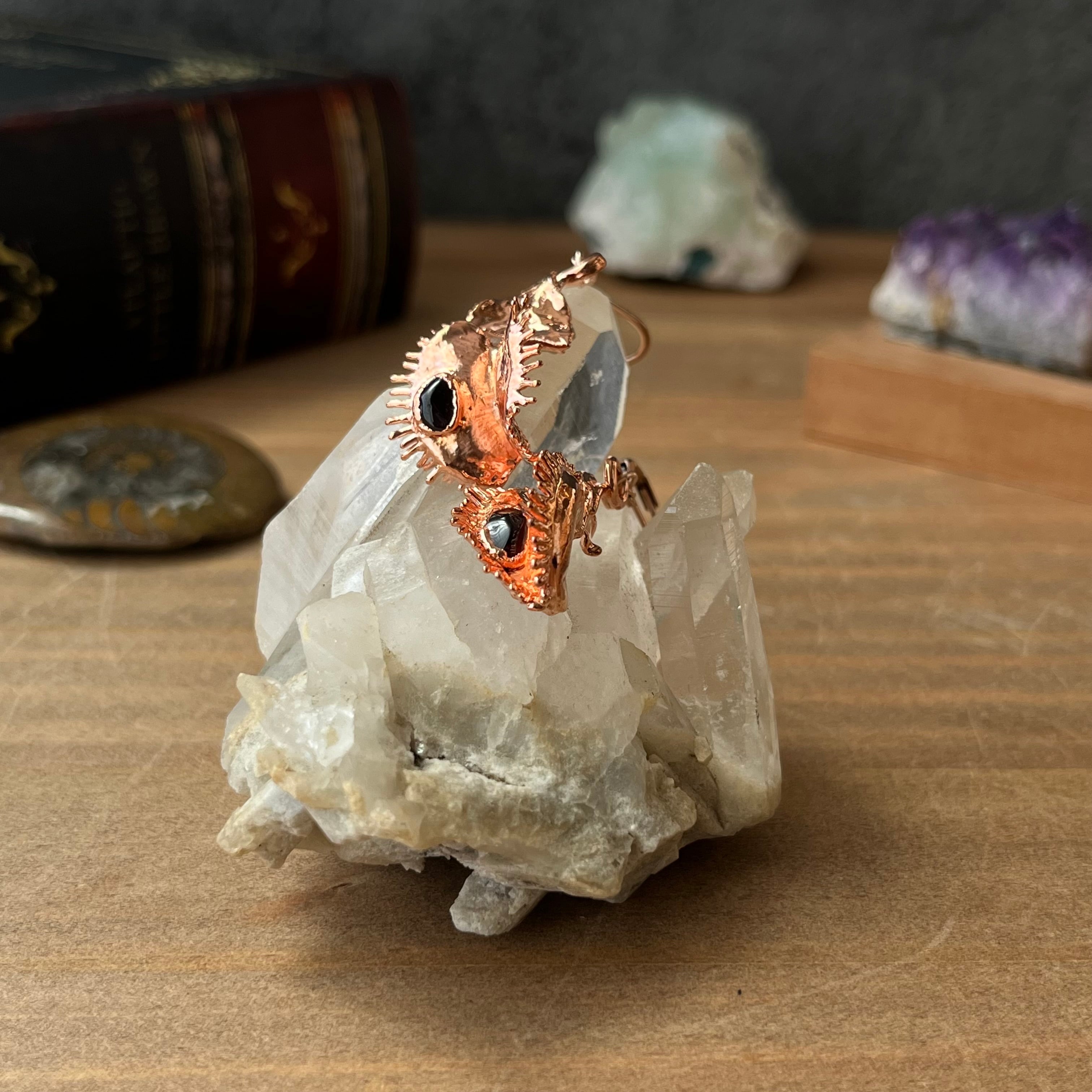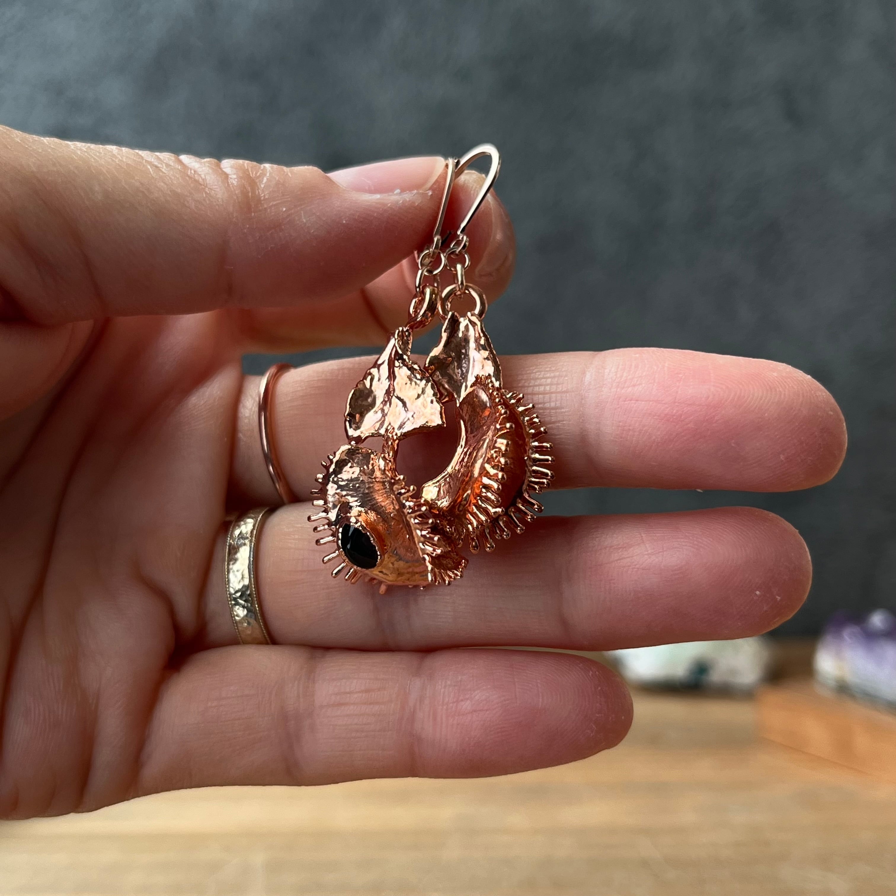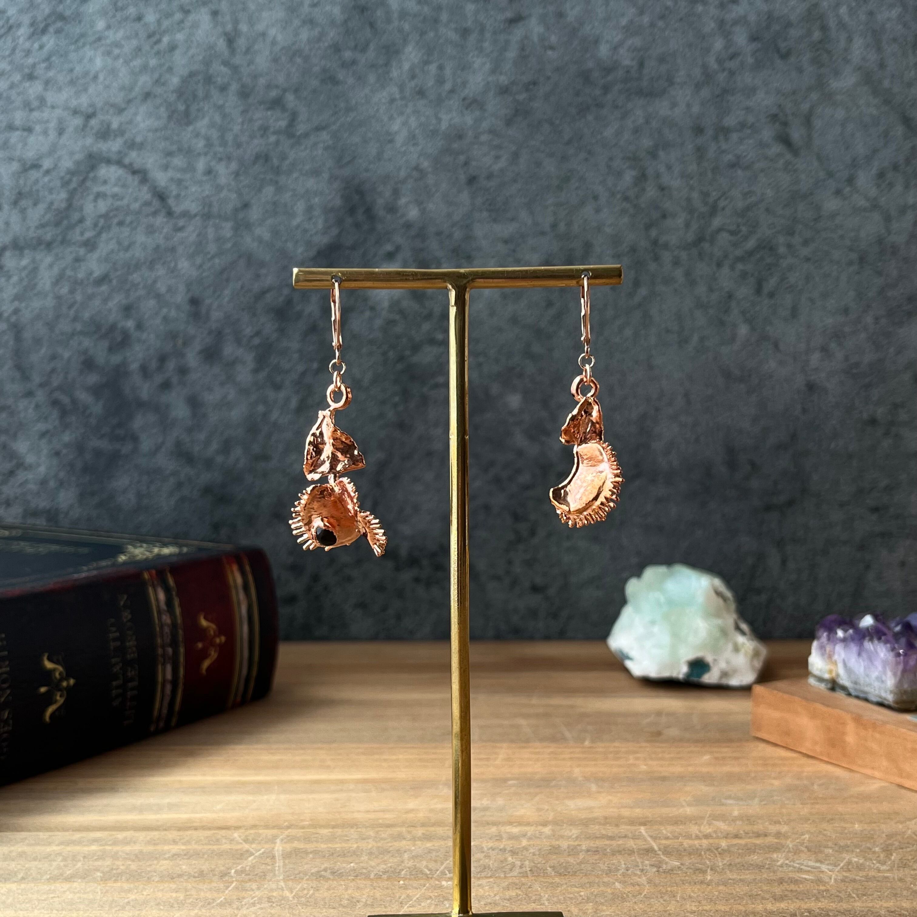 収穫した捕虫葉をエレクトロフォーミングという技法で銅めっきし、アクセサリーに仕立てているため、銅の中には本物のハエトリグサが入っています。