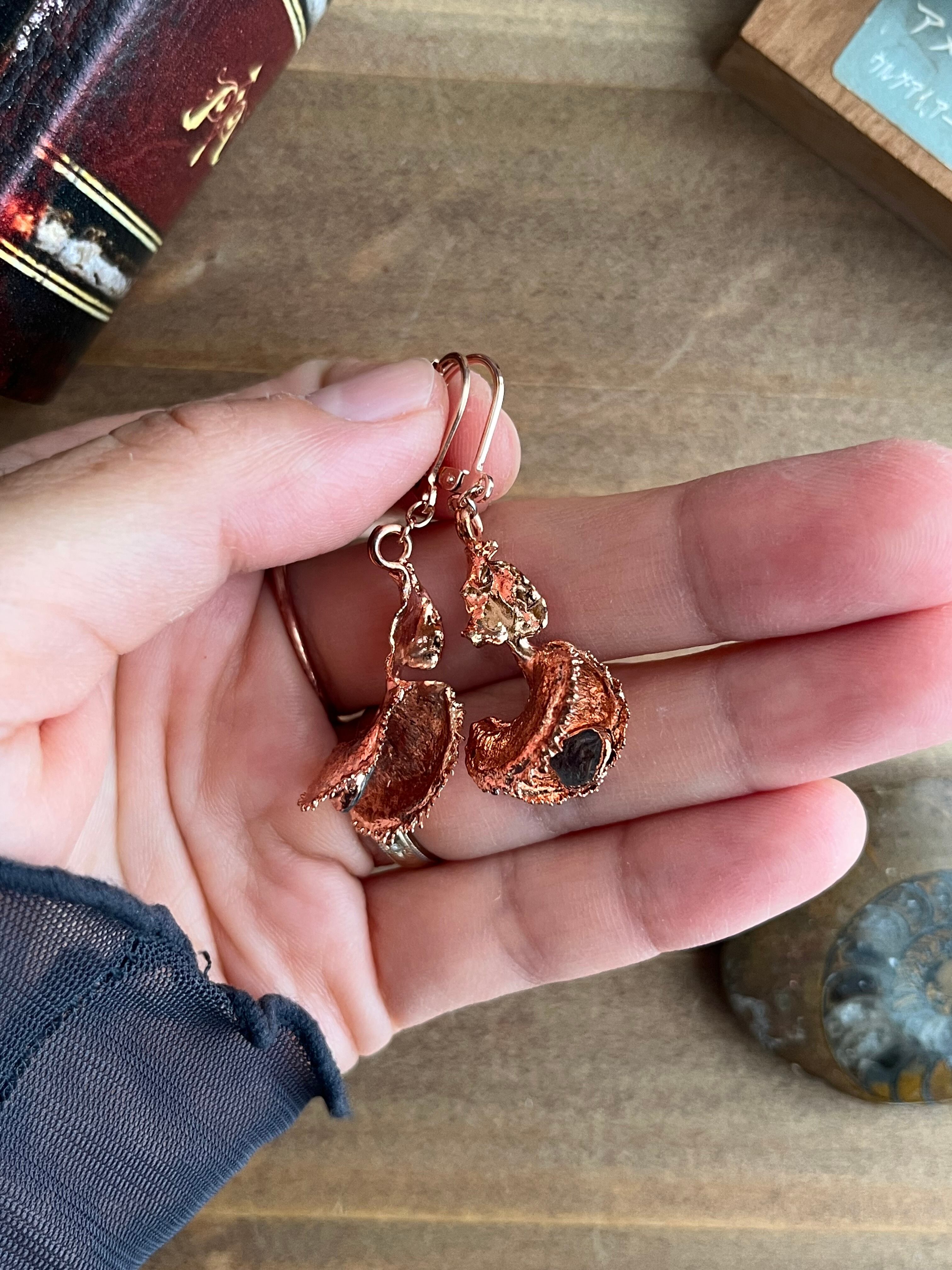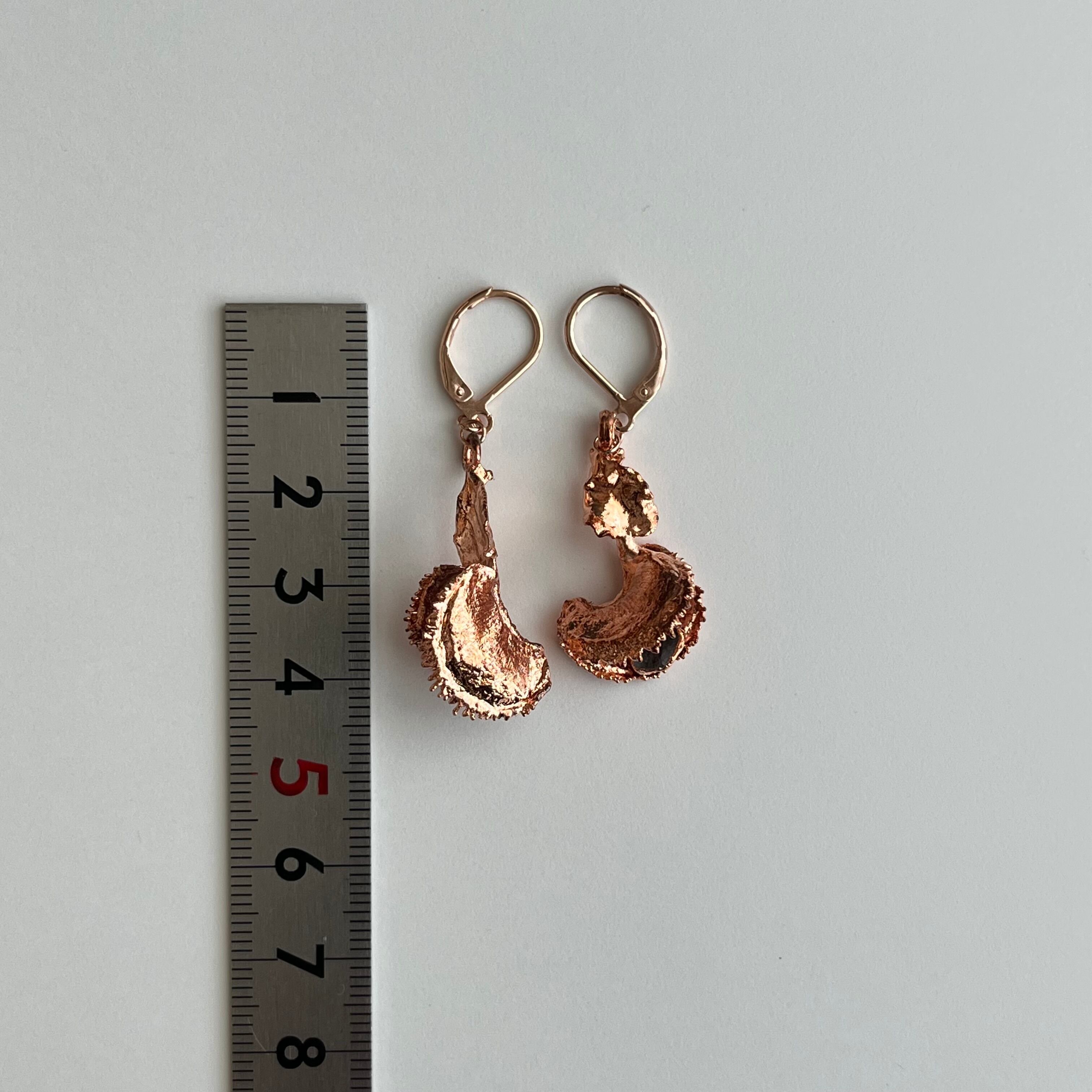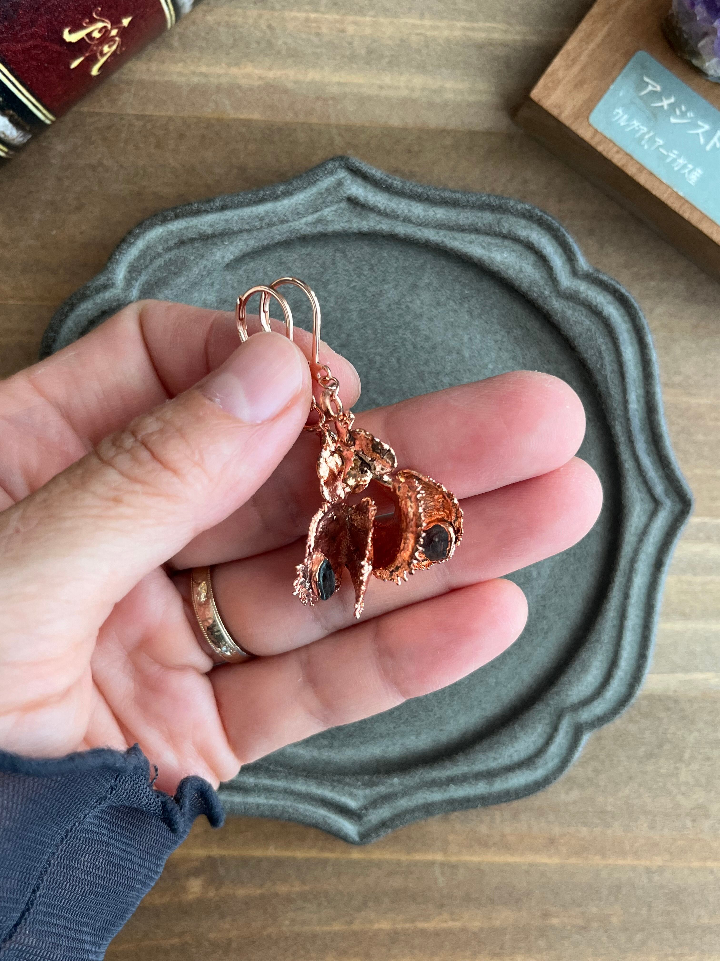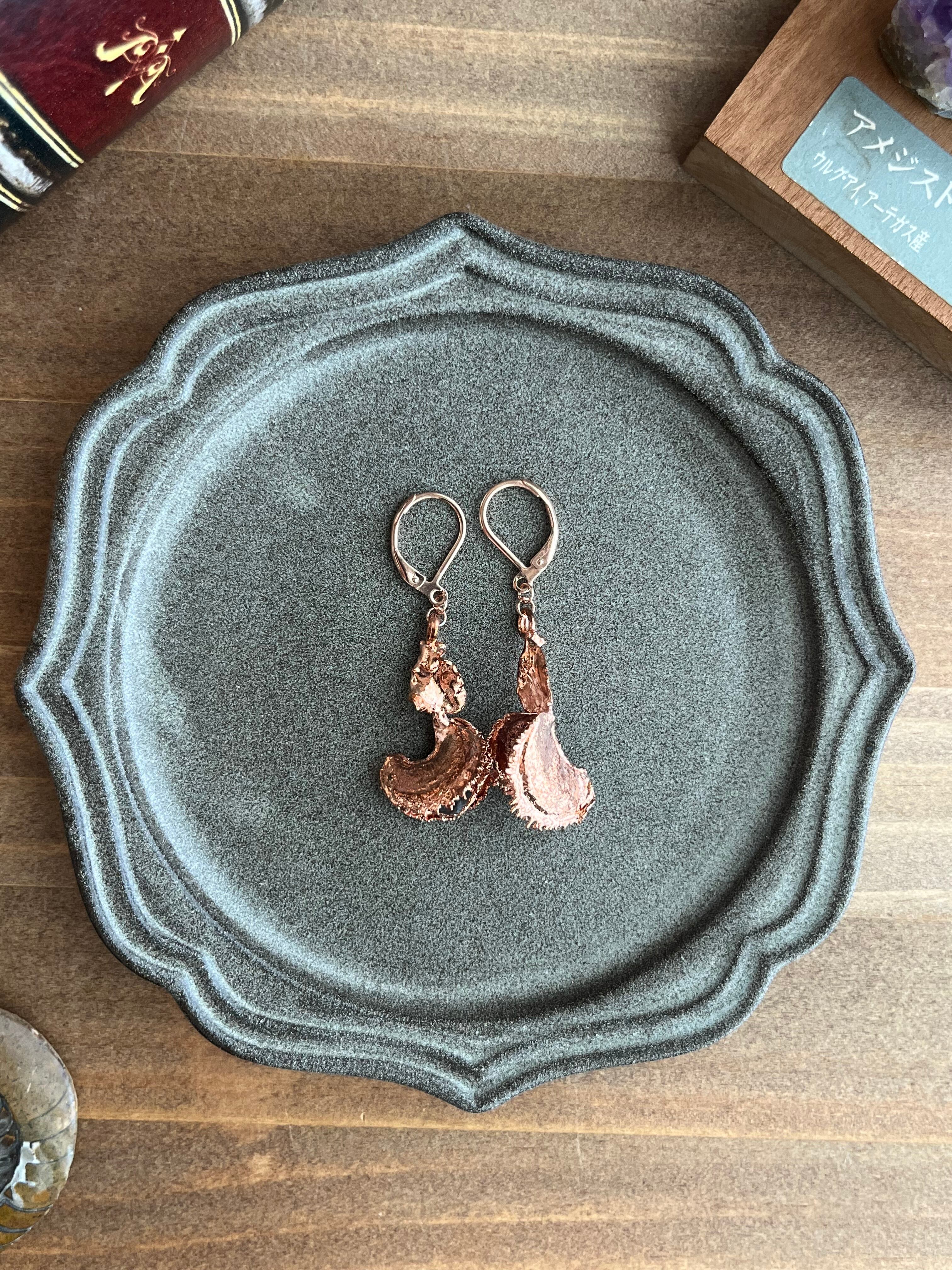 収穫した捕虫葉をエレクトロフォーミングという技法で銅めっきし、アクセサリーに仕立てているため、銅の中には本物のハエトリグサが入っています。