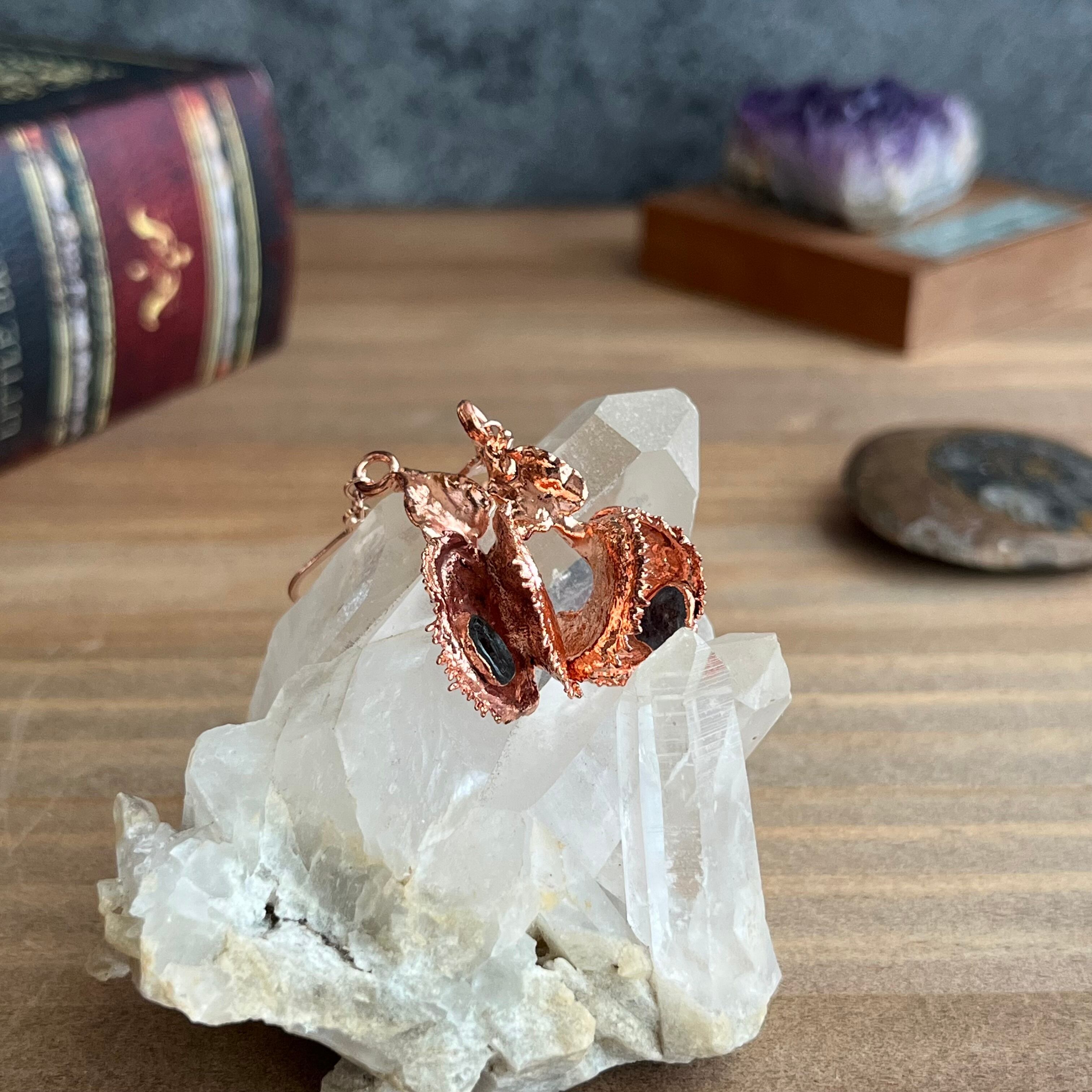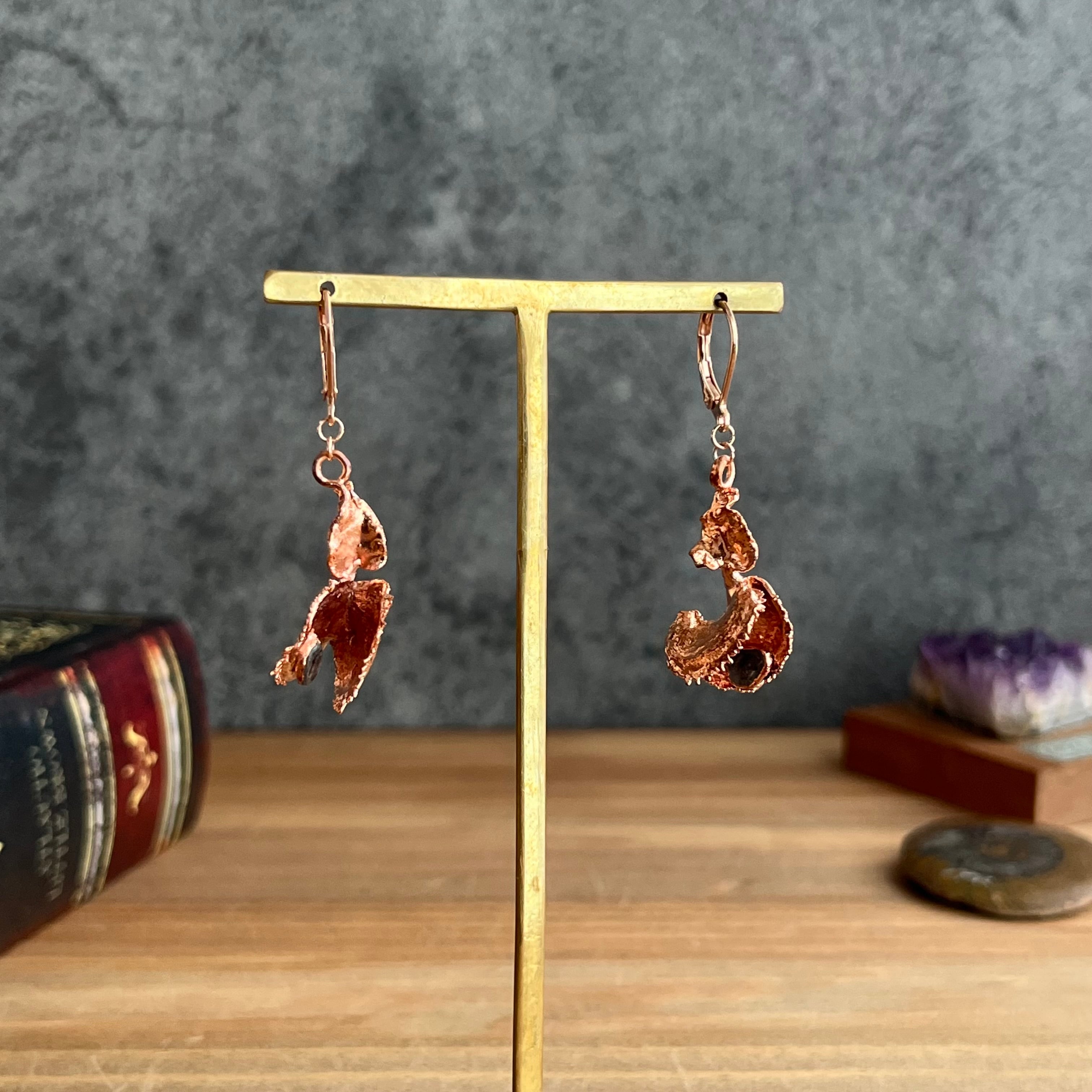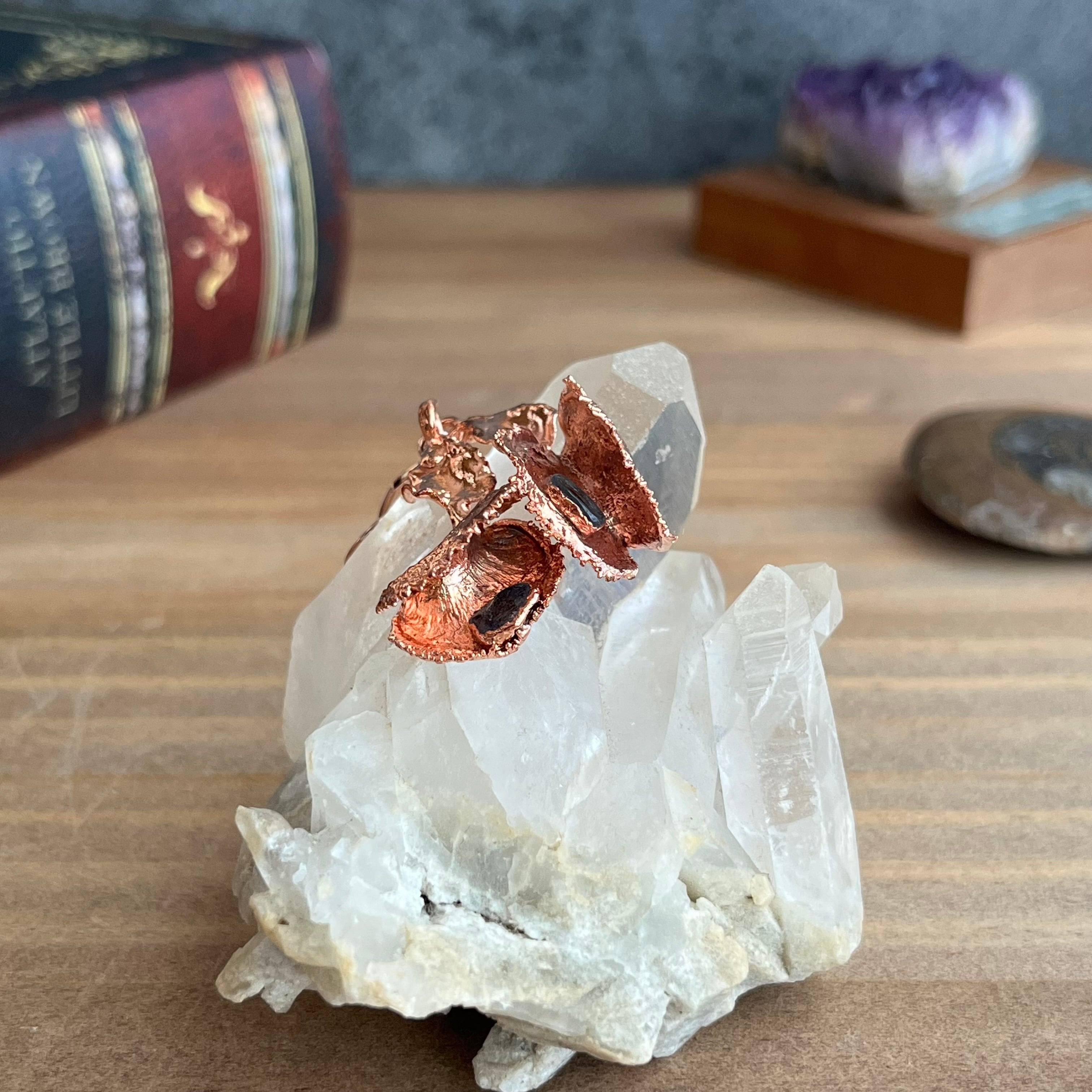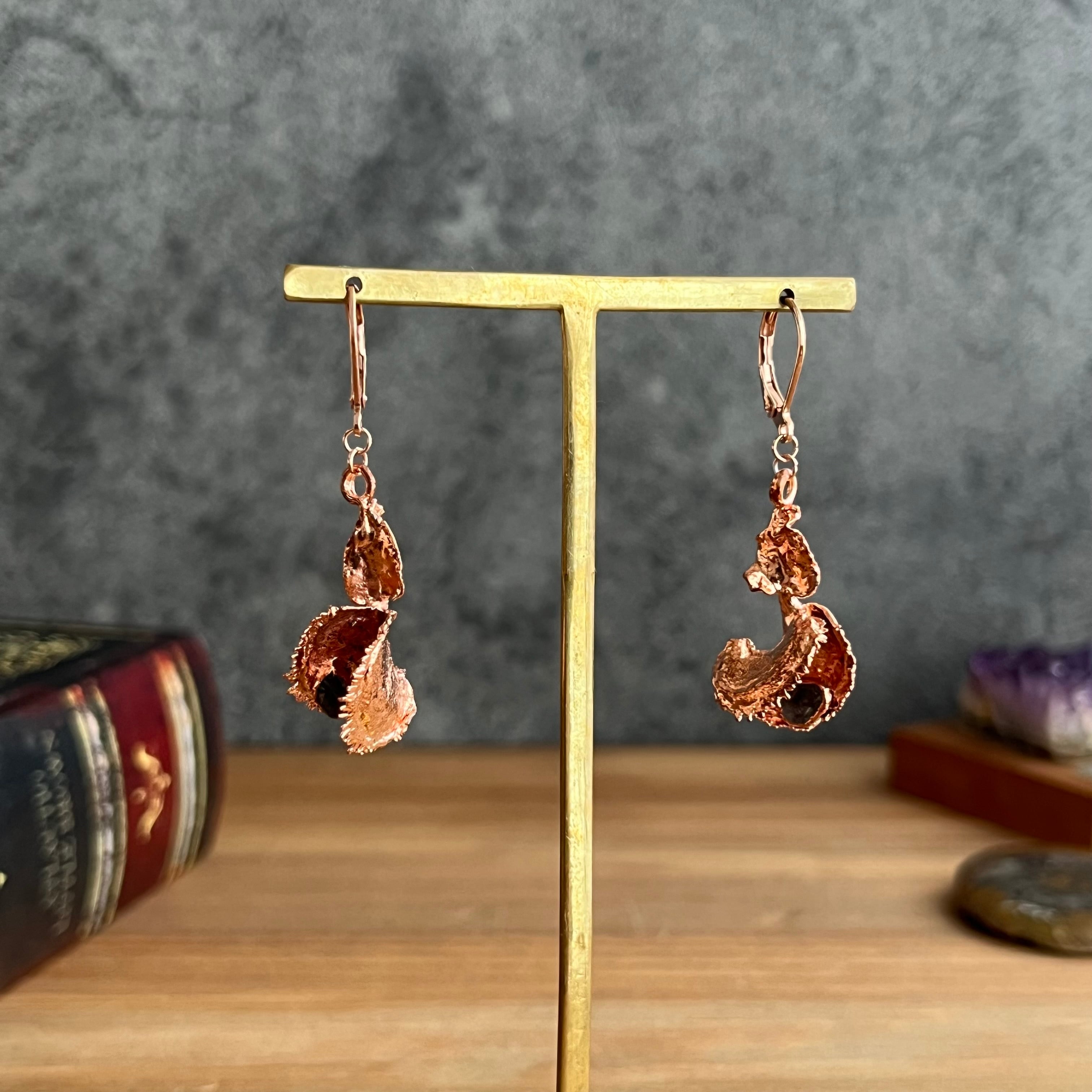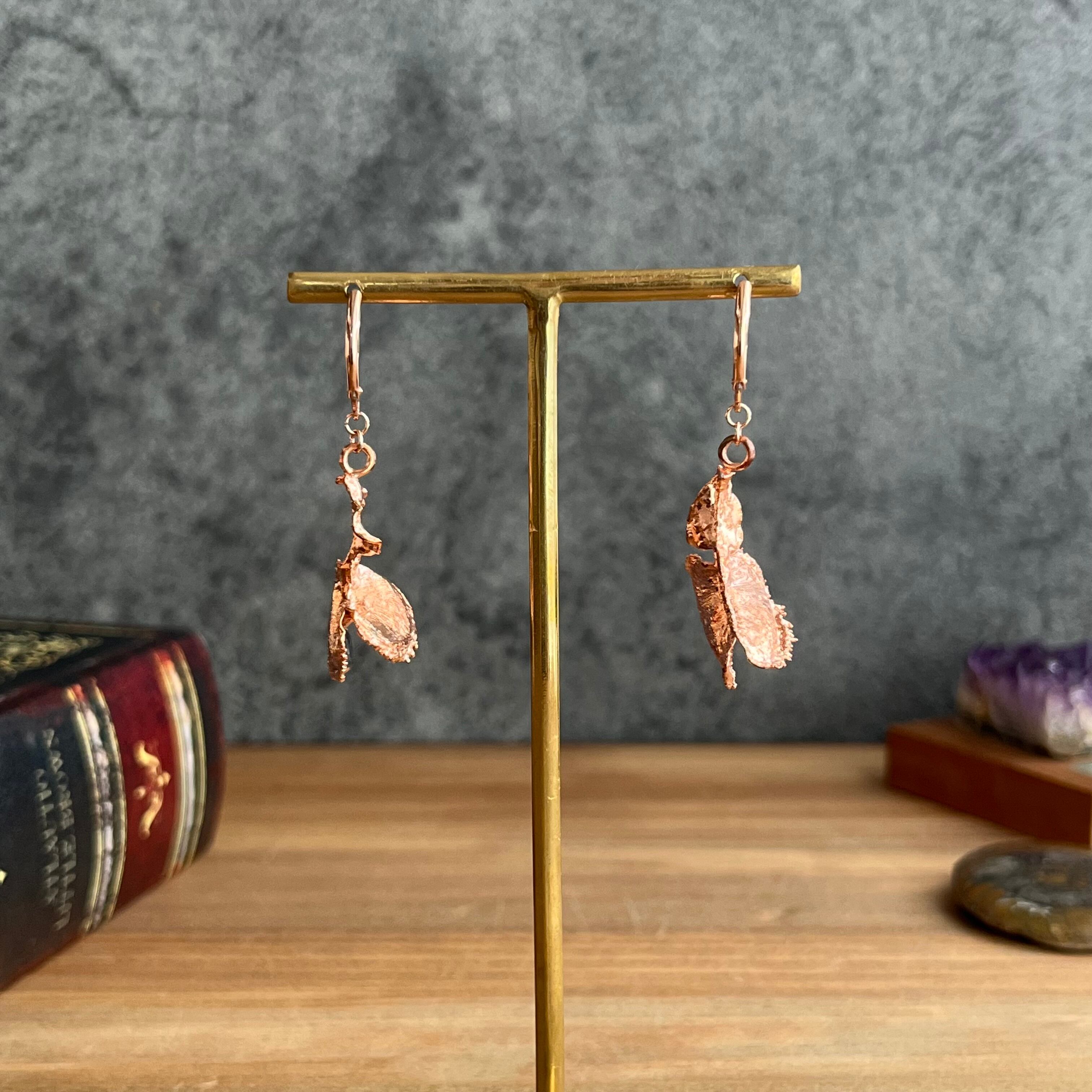 収穫した捕虫葉をエレクトロフォーミングという技法で銅めっきし、アクセサリーに仕立てているため、銅の中には本物のハエトリグサが入っています。