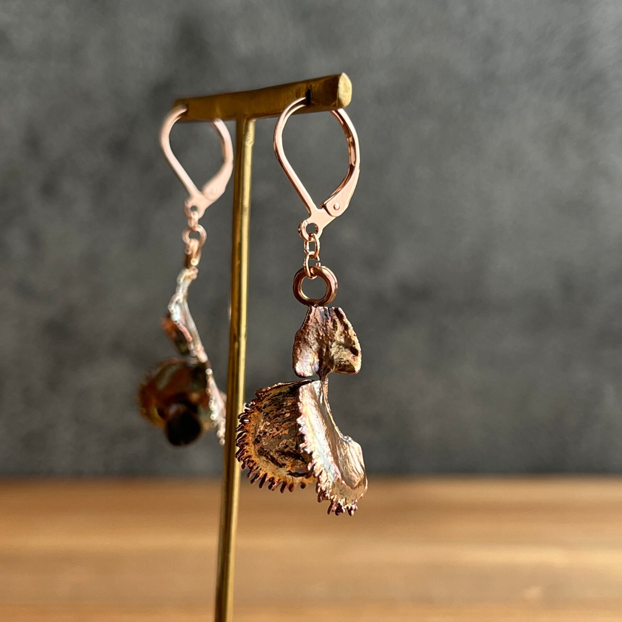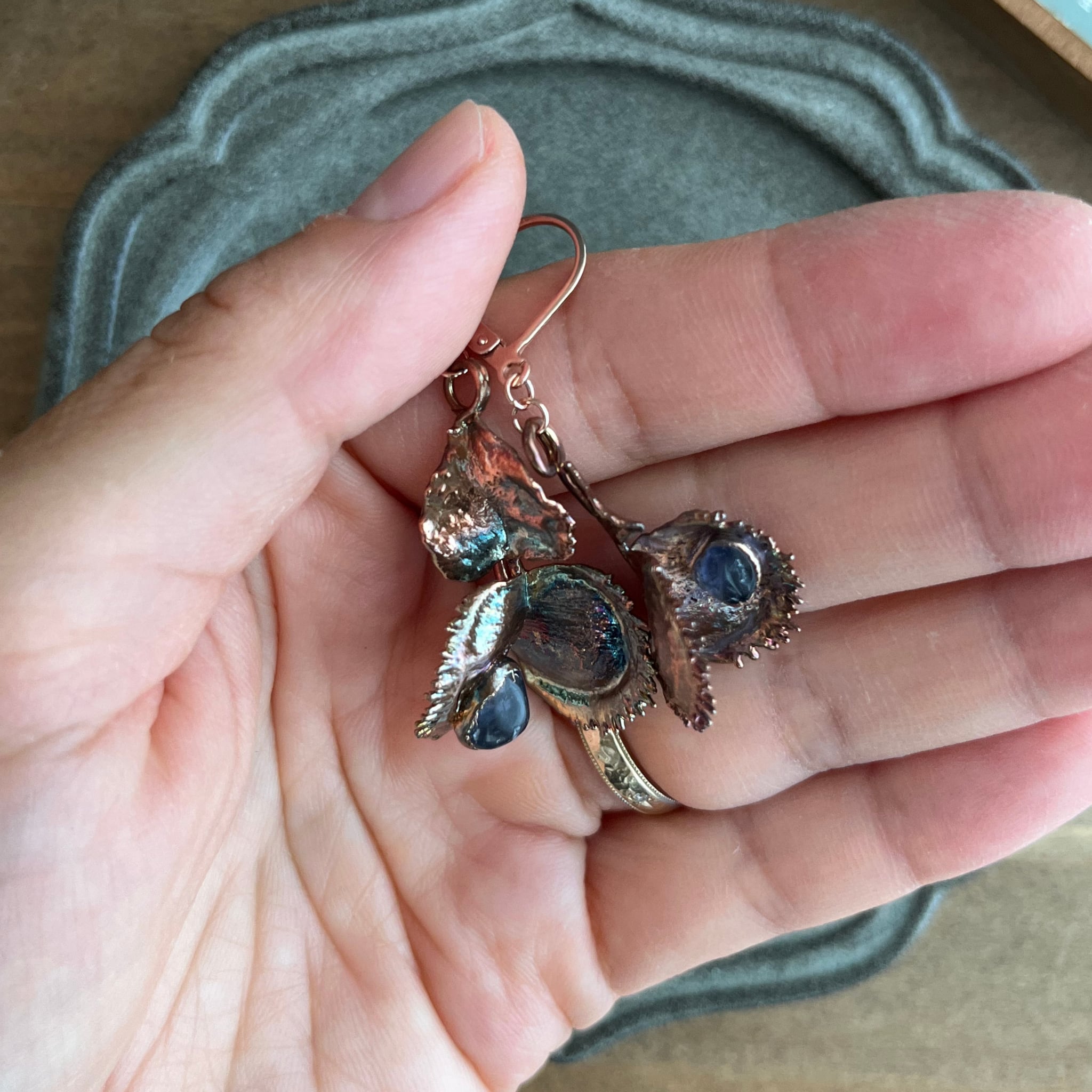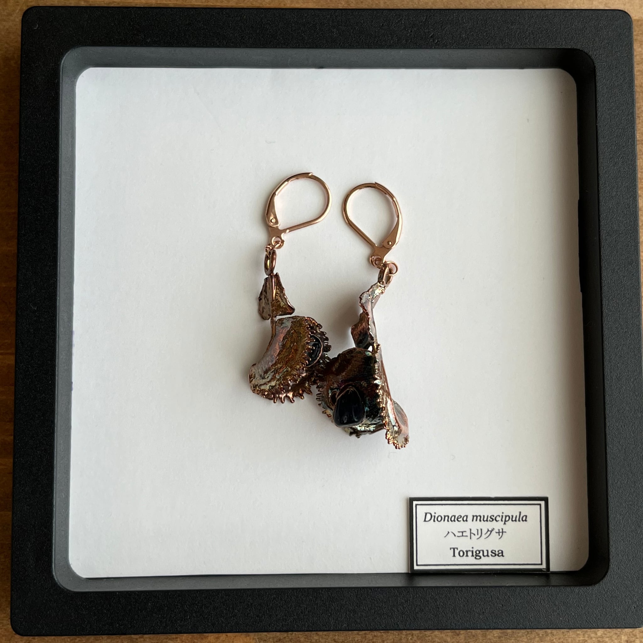 収穫した捕虫葉をエレクトロフォーミングという技法で銅めっきし、アクセサリーに仕立てているため、銅の中には本物のハエトリグサが入っています。