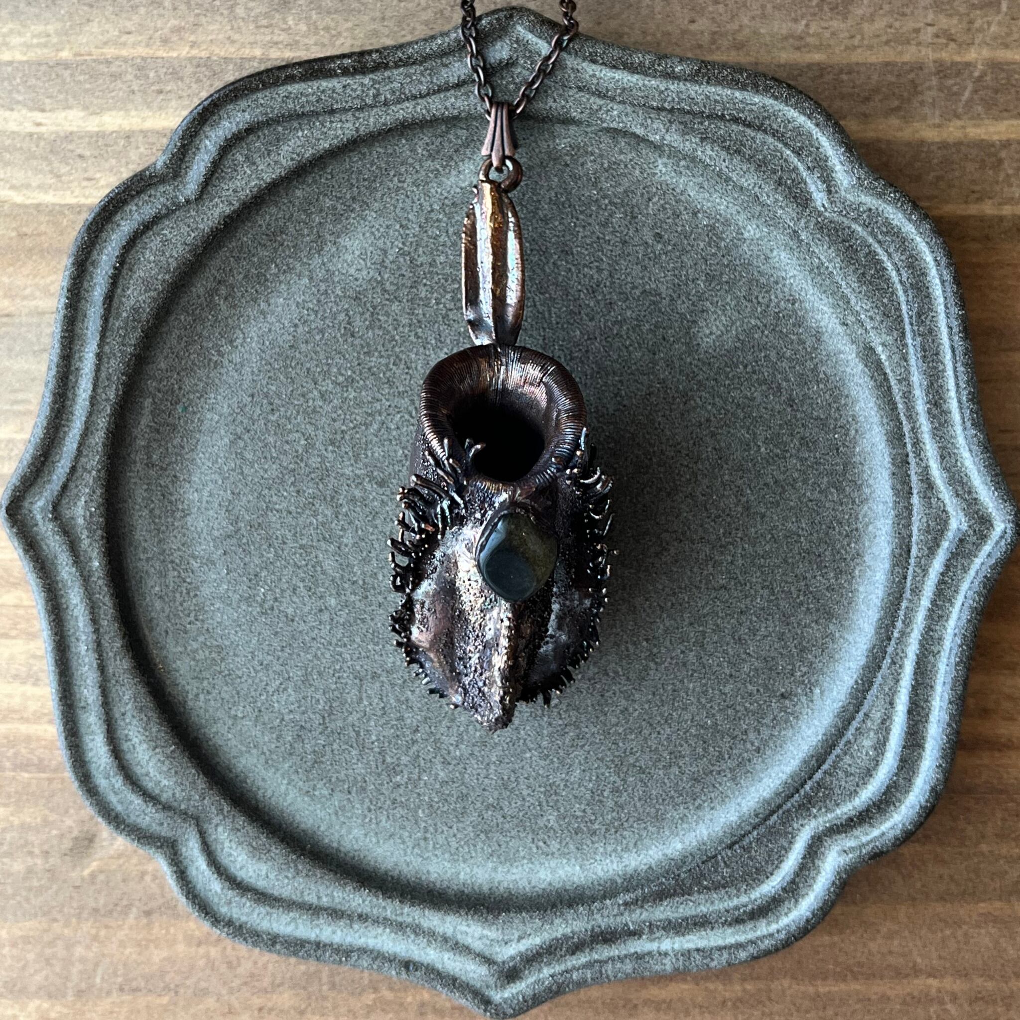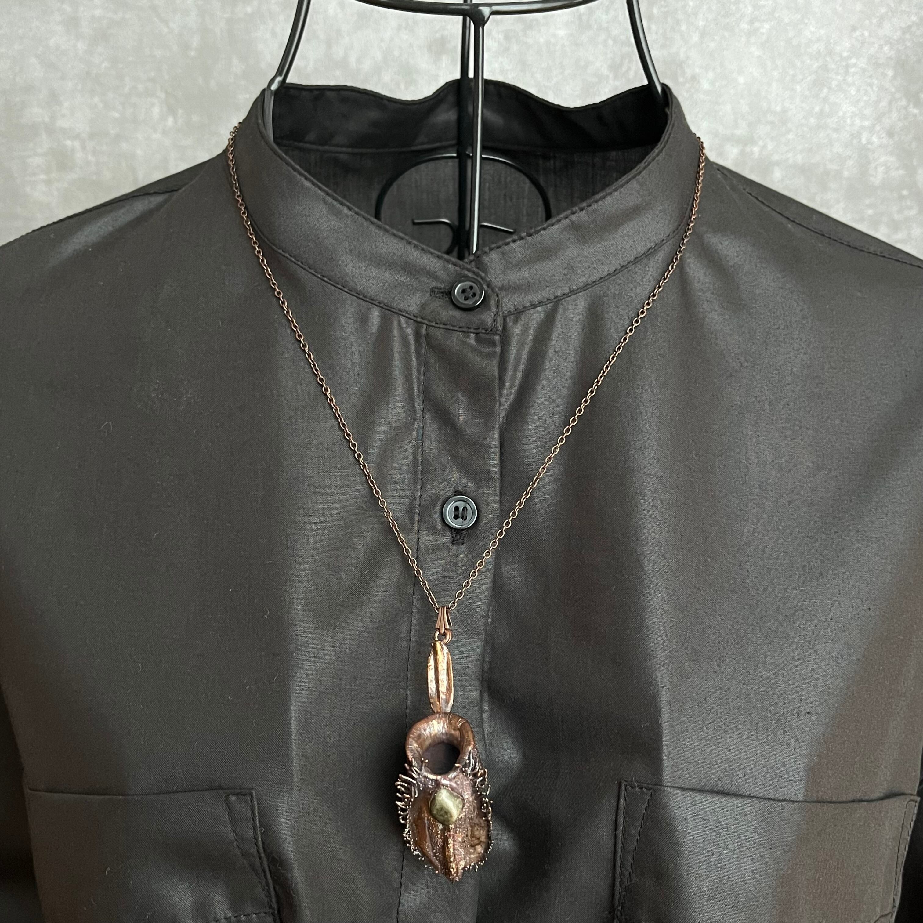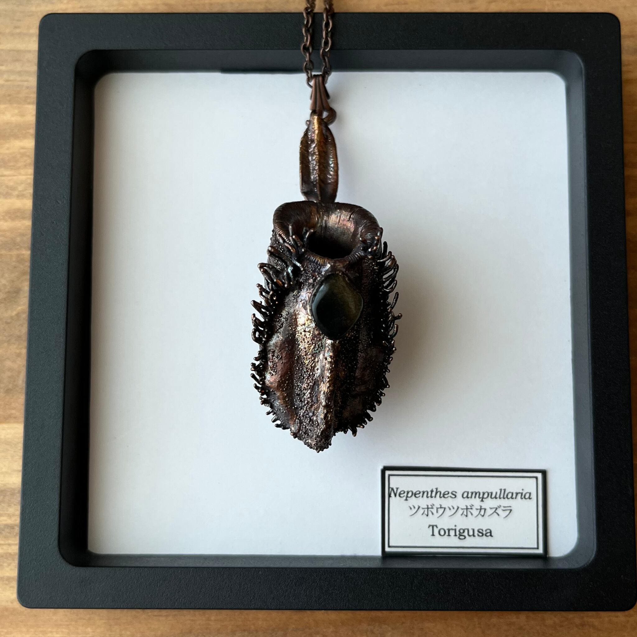 ウツボカズラ「N.ampullaria」の捕虫袋(ピッチャー)を収穫し、洗浄後、エレクトロフォーミングという技法で銅めっきをほどこし、ネックレスを作製しました。