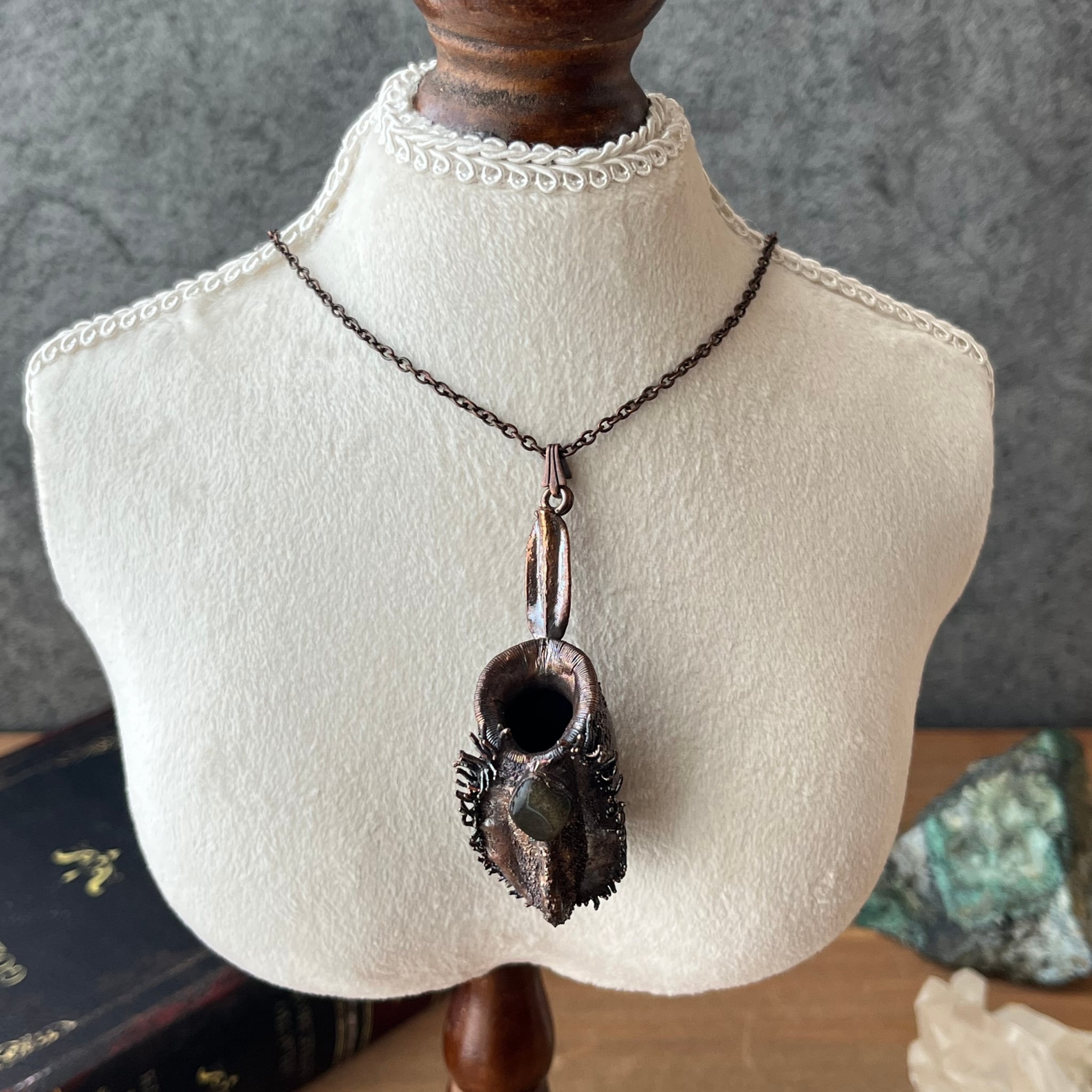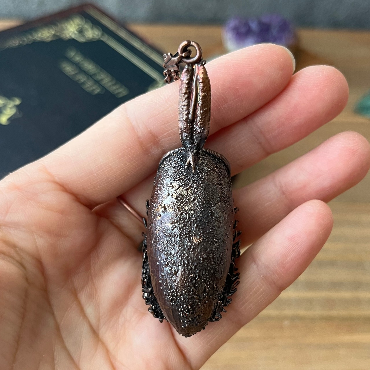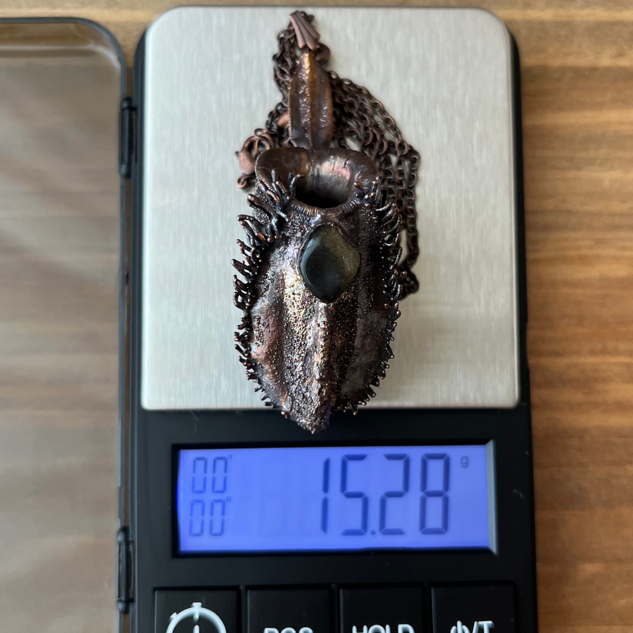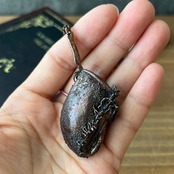 ウツボカズラ「N.ampullaria」の捕虫袋(ピッチャー)を収穫し、洗浄後、エレクトロフォーミングという技法で銅めっきをほどこし、ネックレスを作製しました。