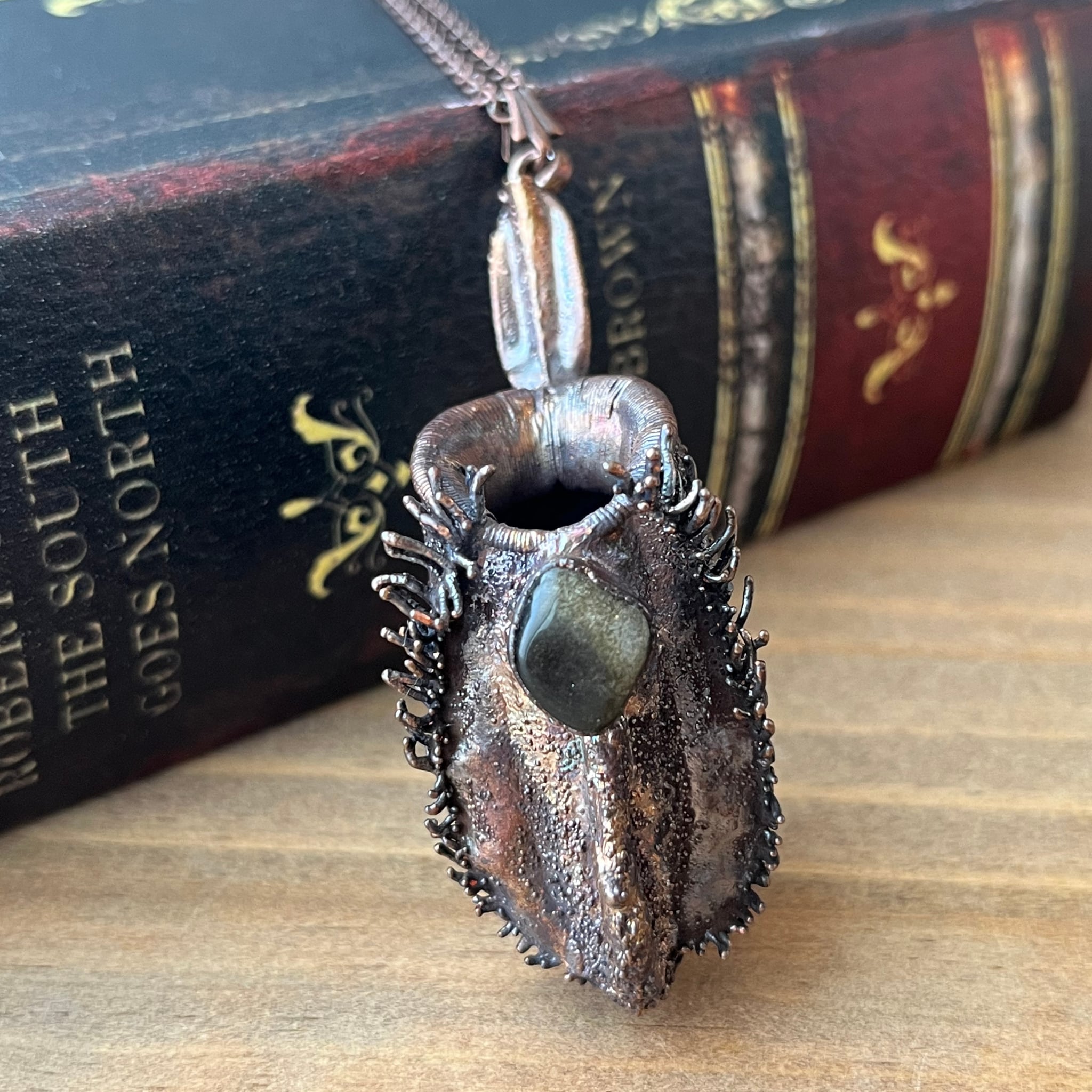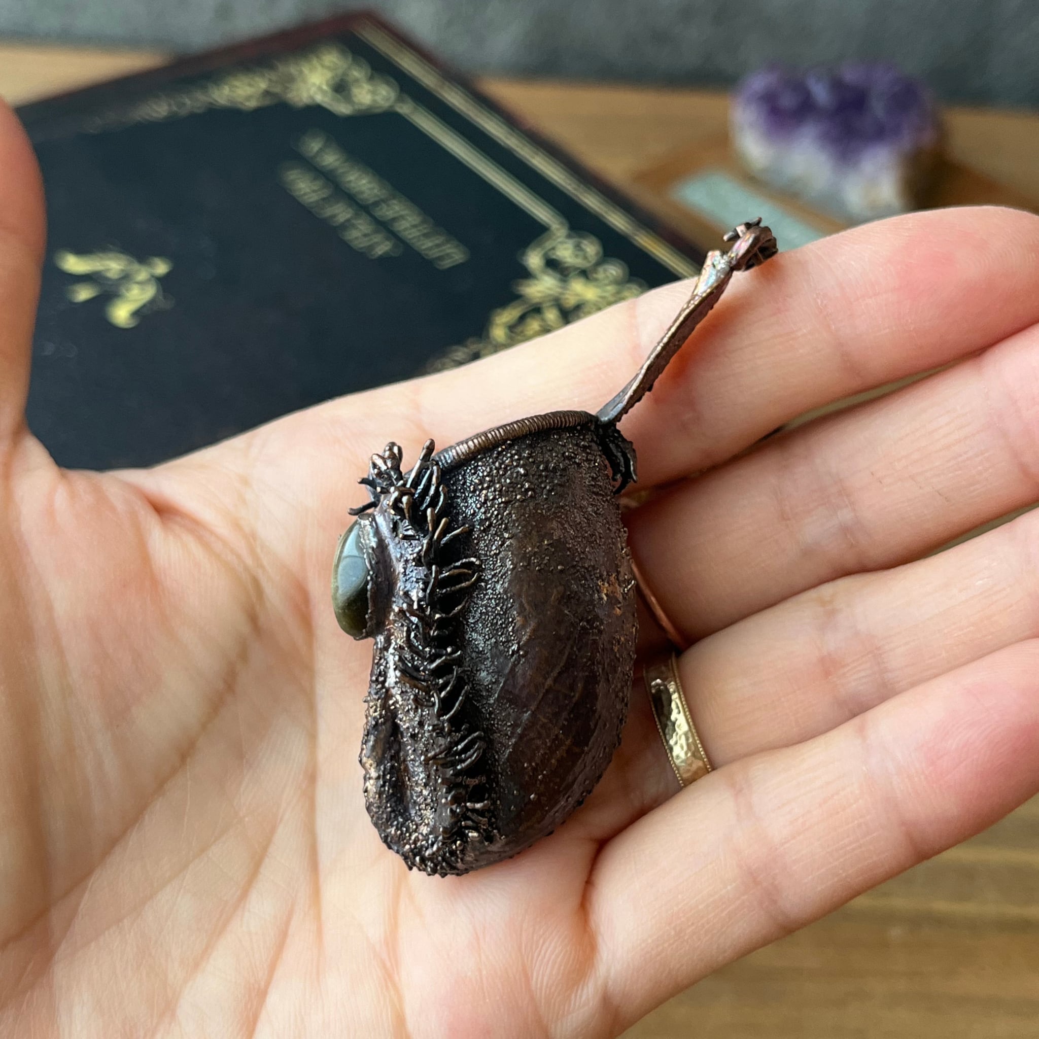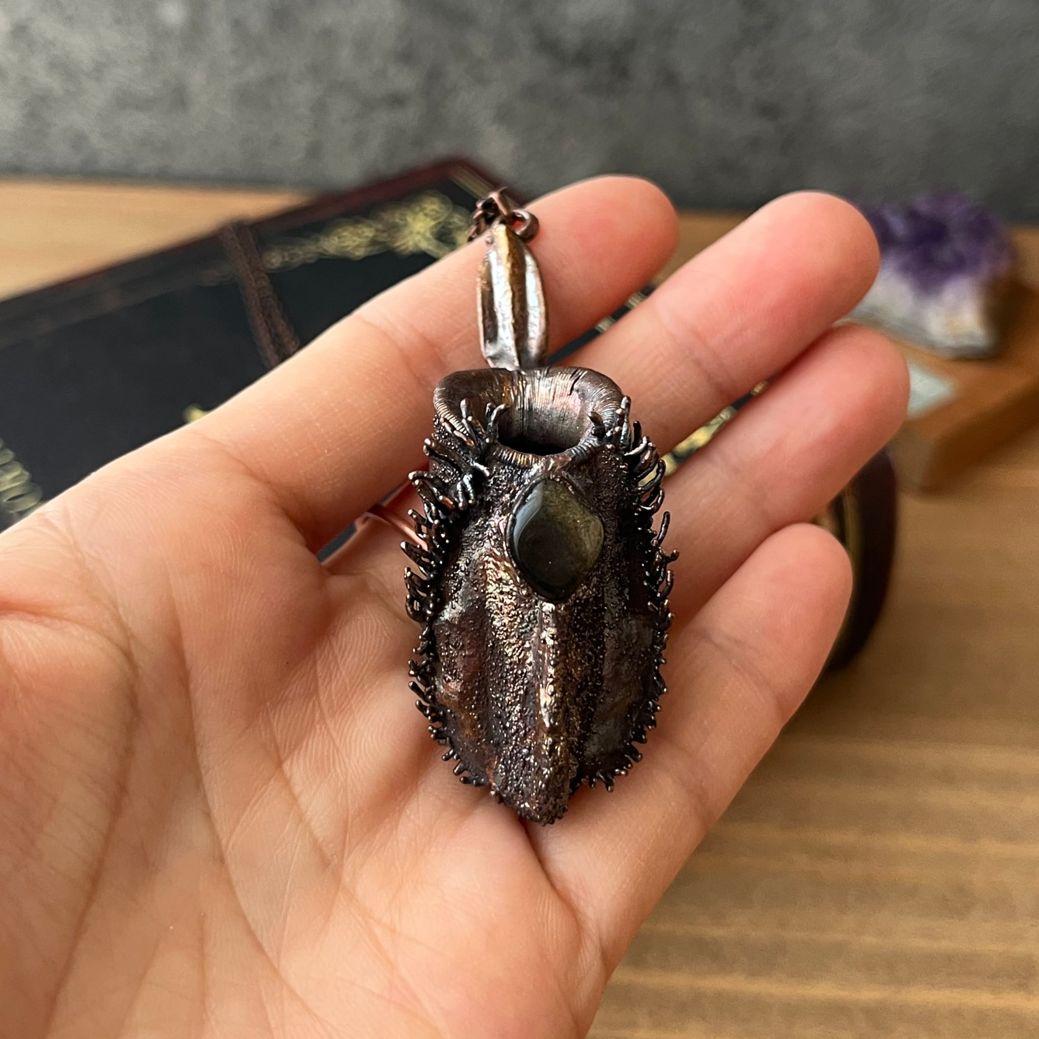 いぶし加工により銅の温かみを残しつつ大人な印象のアンプラリアと、シックな印象の黒曜石との組み合わせは、可愛いよりもかっこいいを求めるあなたにぜひ採集いただきたい一品です。