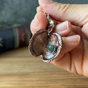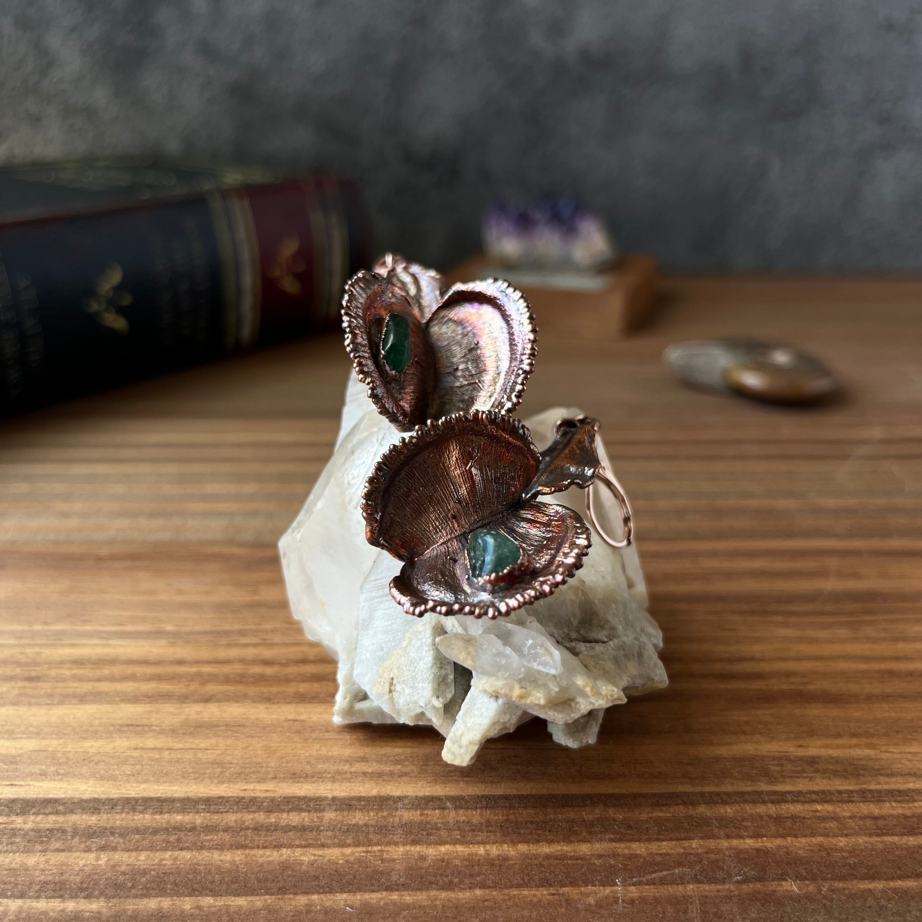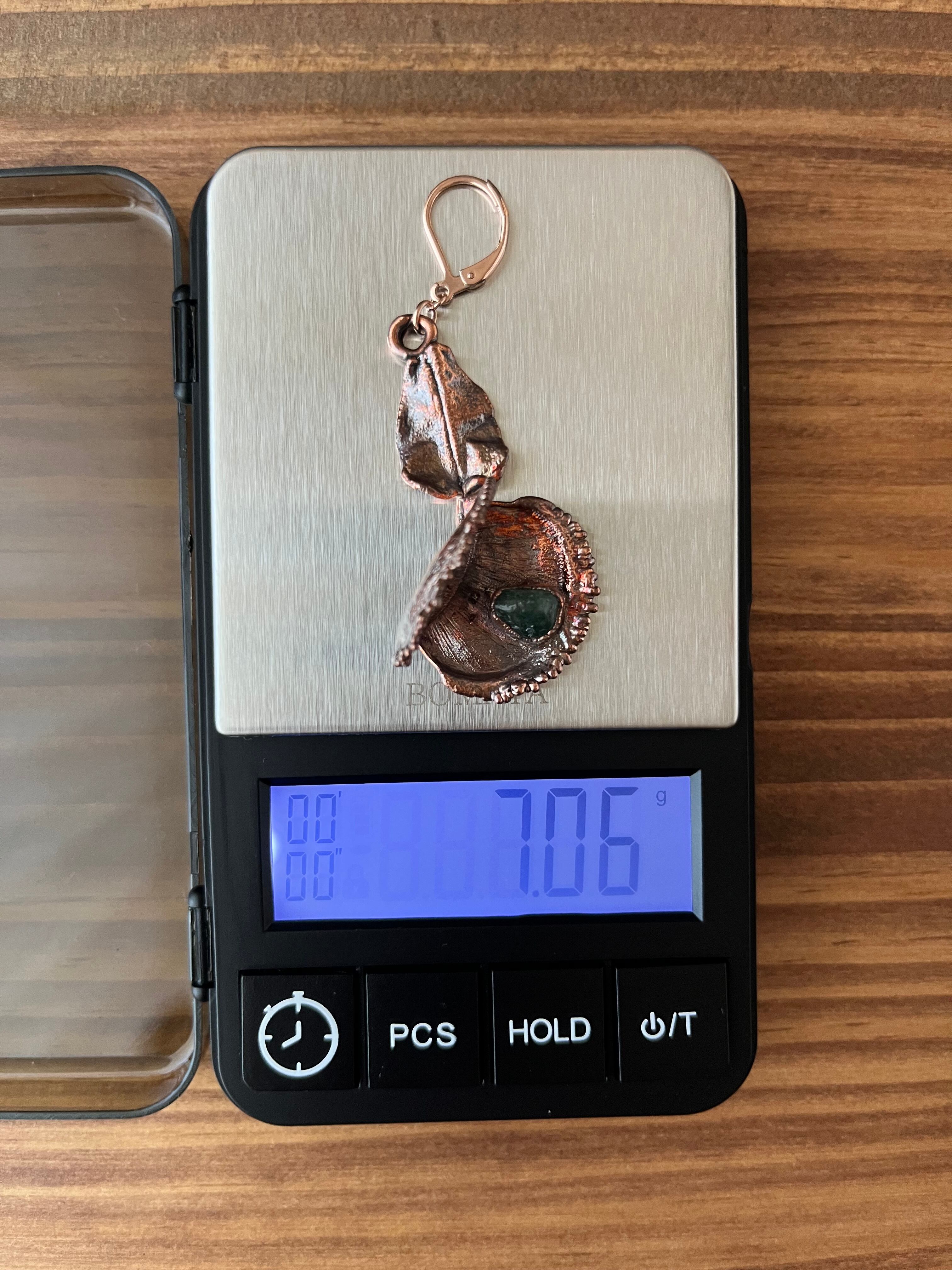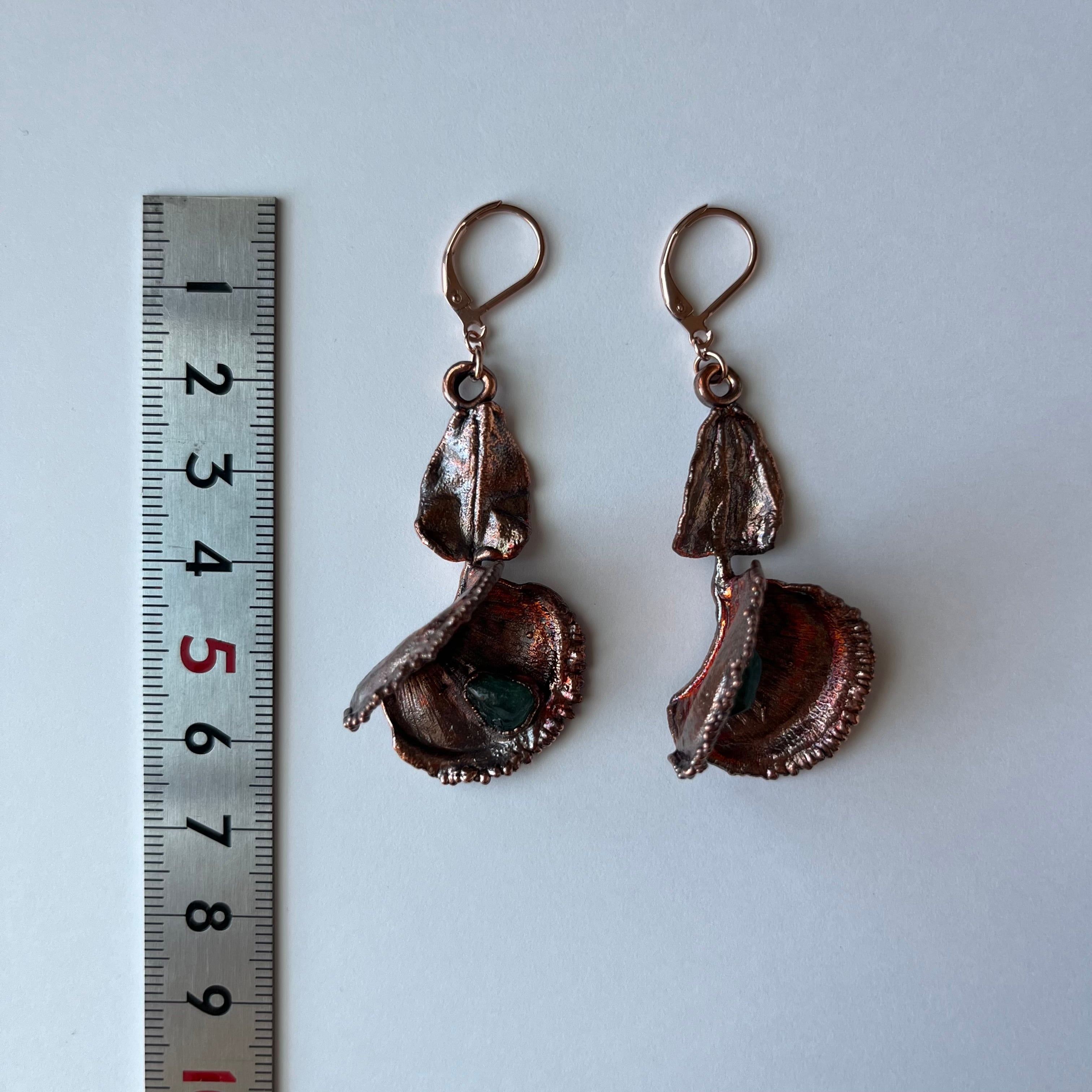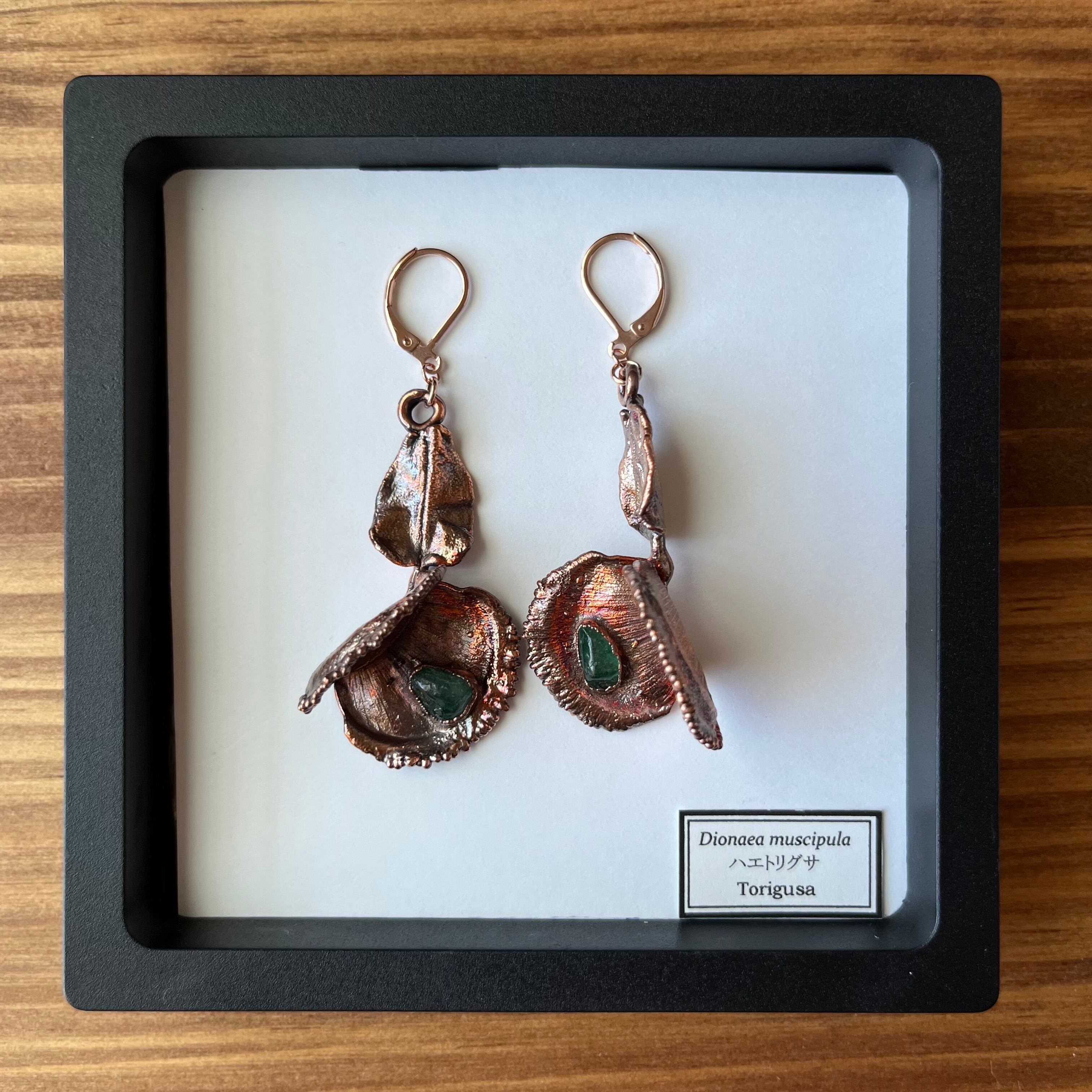 収穫した捕虫葉をエレクトロフォーミングという技法で銅めっきし、アクセサリーに仕立てているため、銅の中には本物のハエトリグサが入っています。