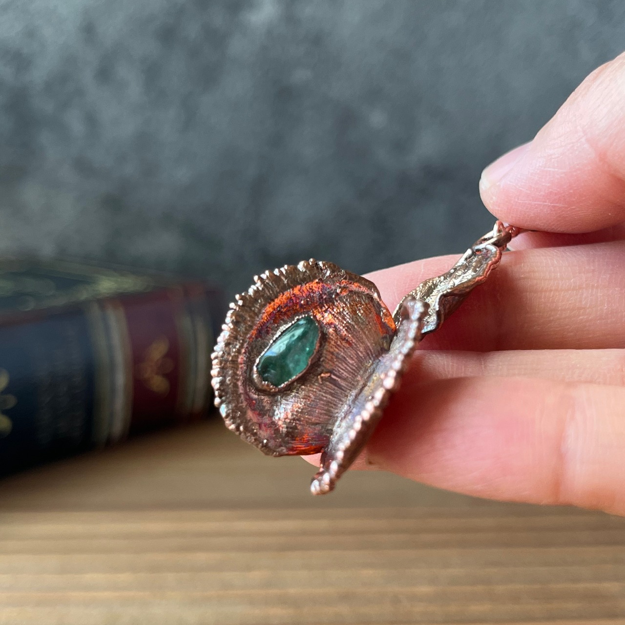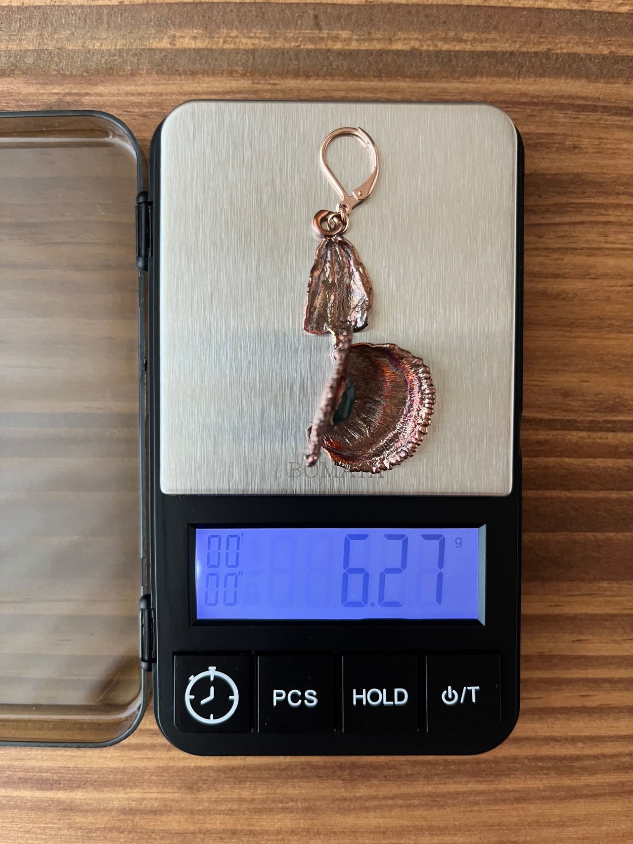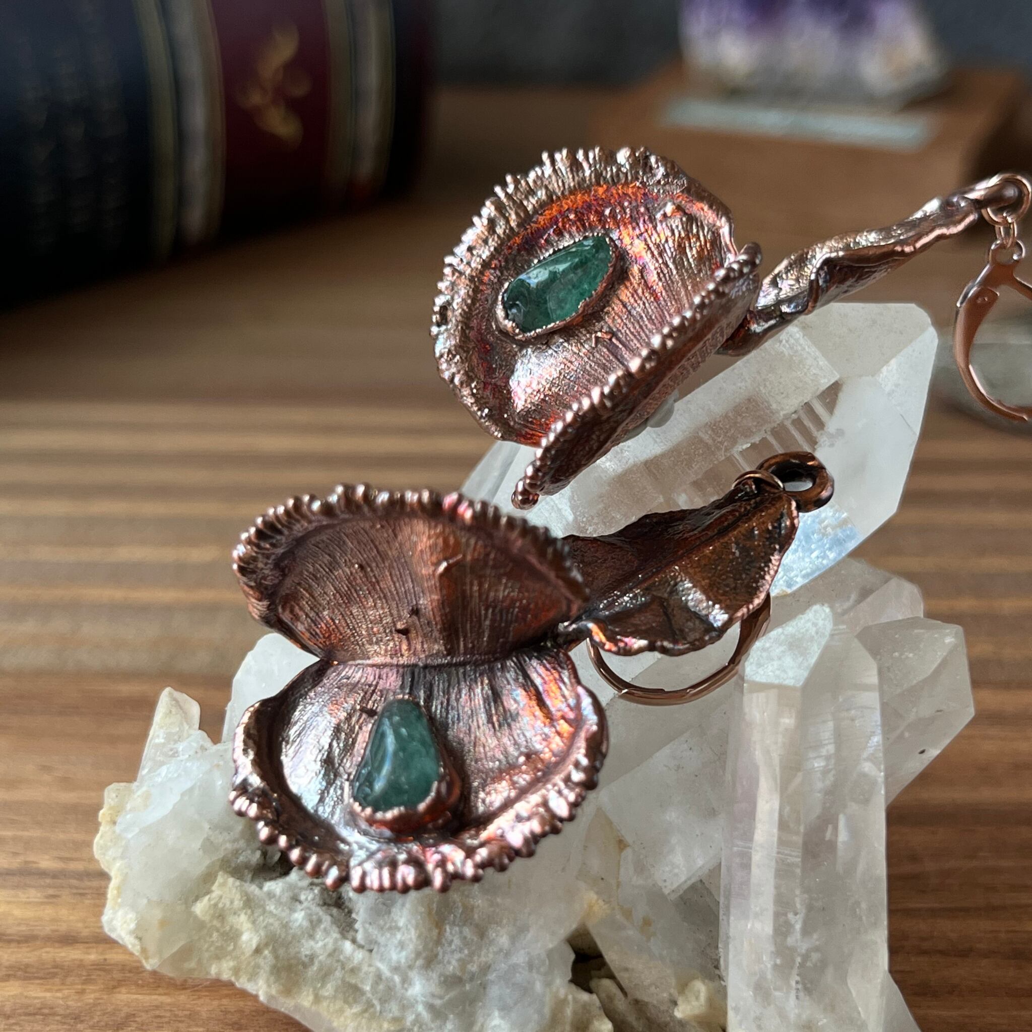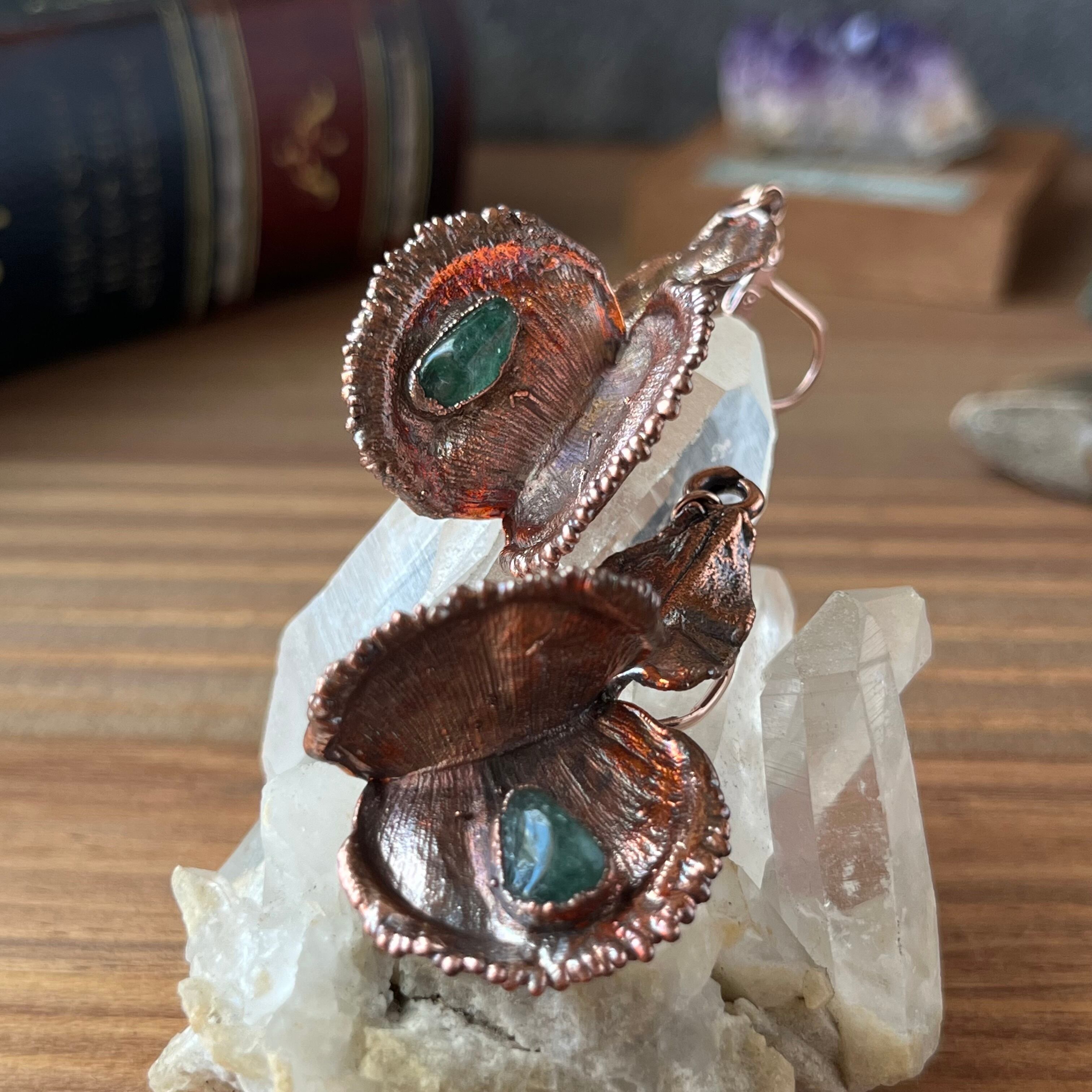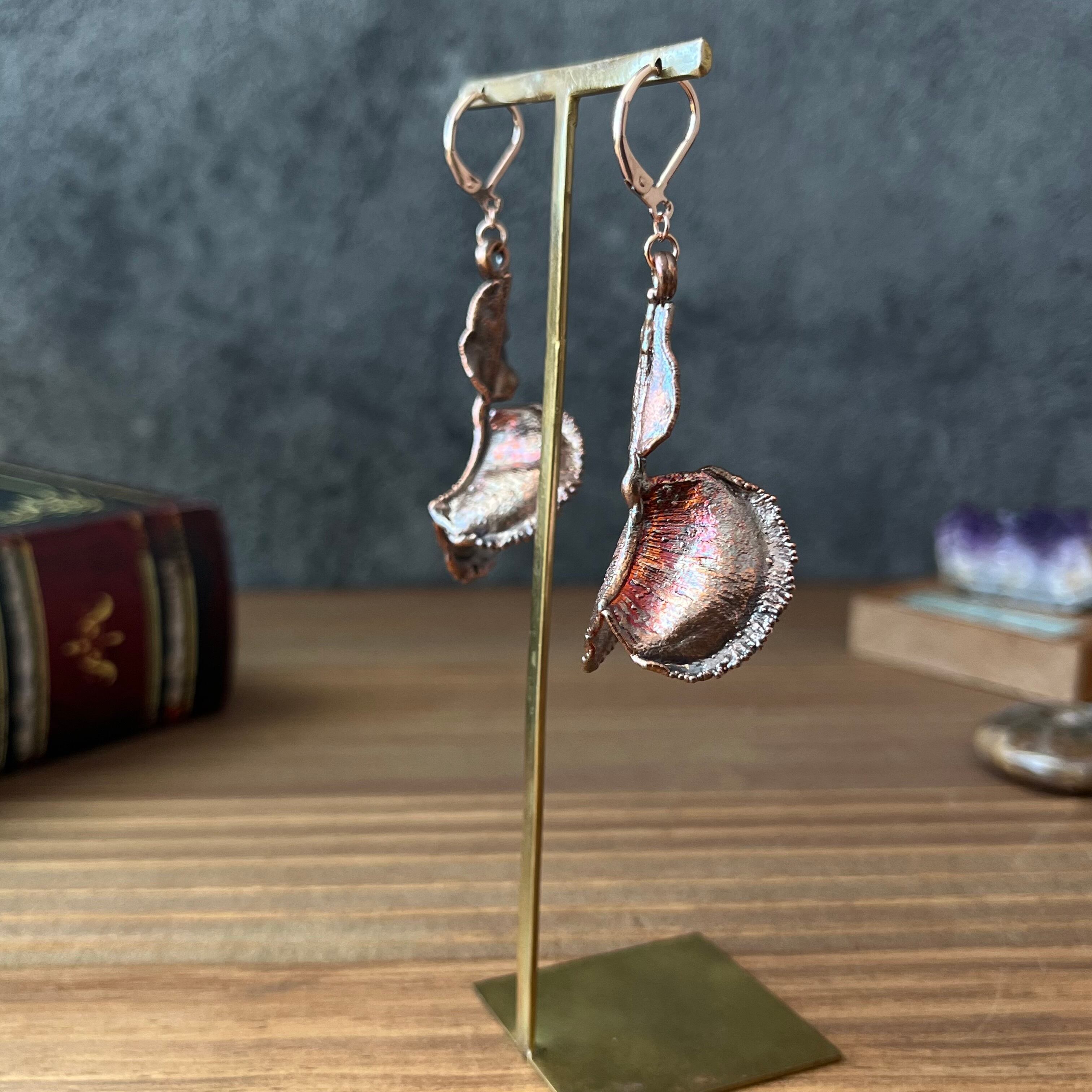 収穫した捕虫葉をエレクトロフォーミングという技法で銅めっきし、アクセサリーに仕立てているため、銅の中には本物のハエトリグサが入っています。