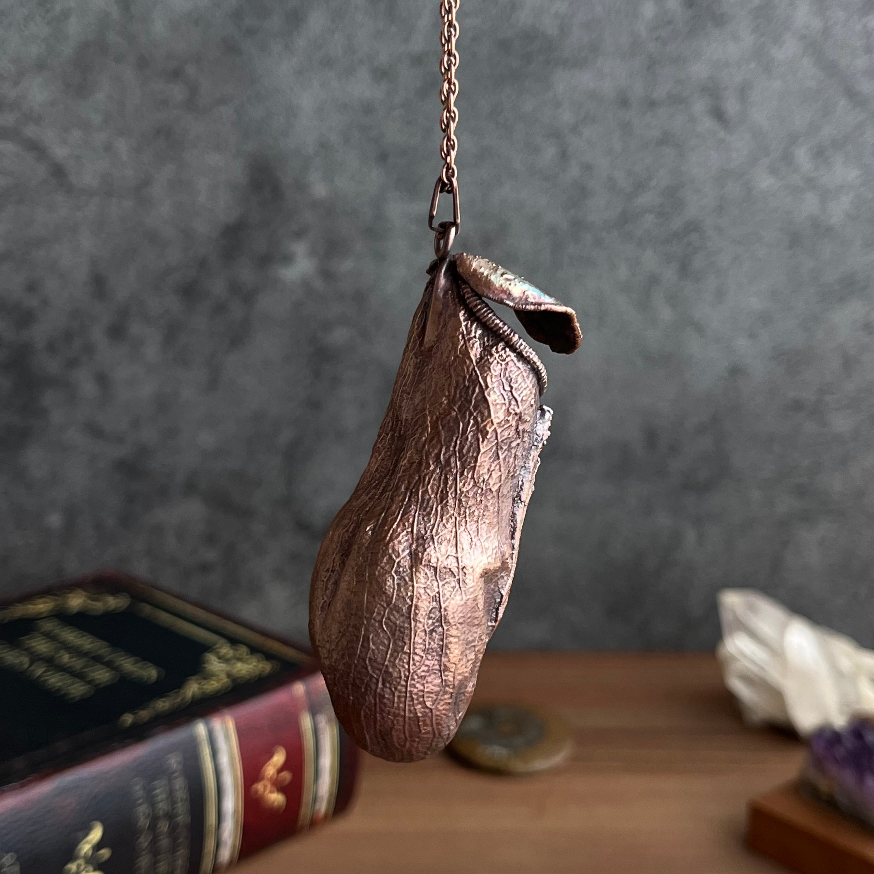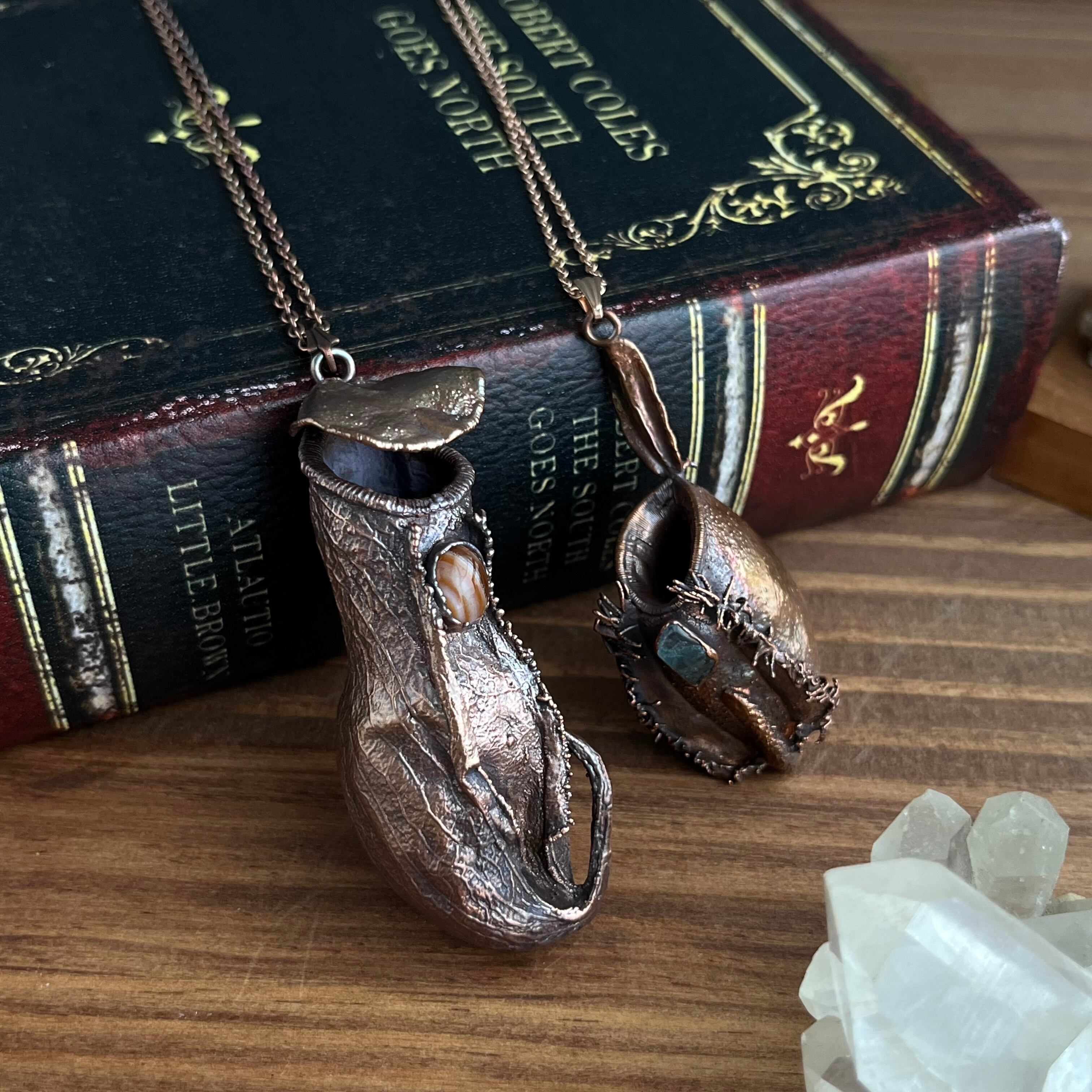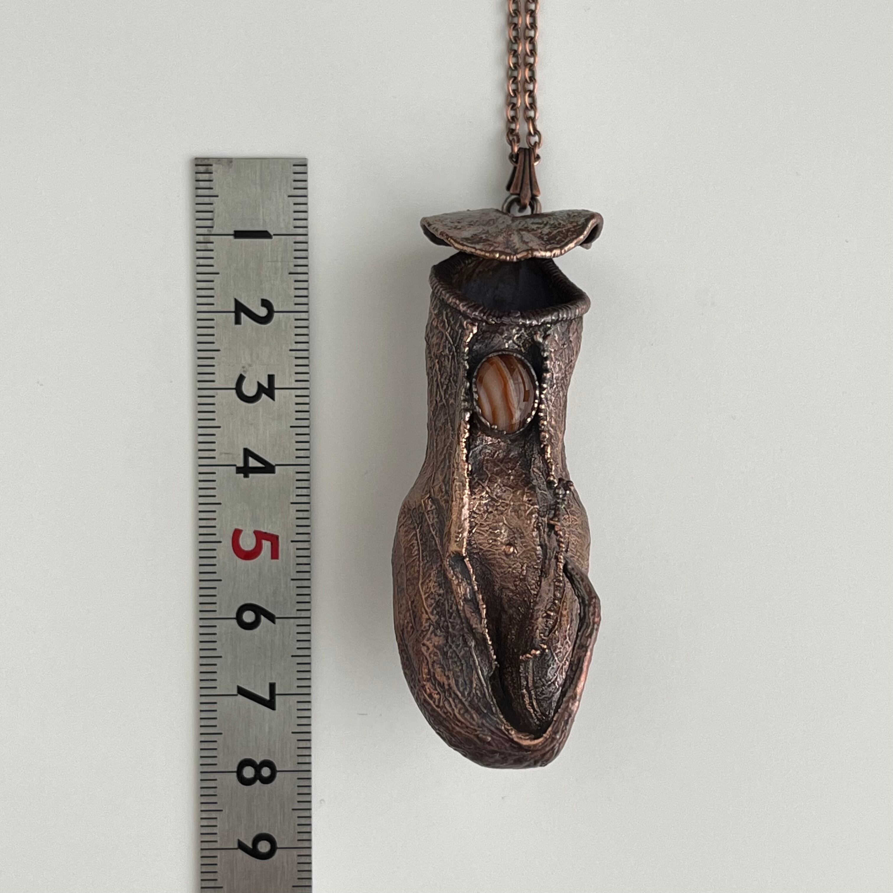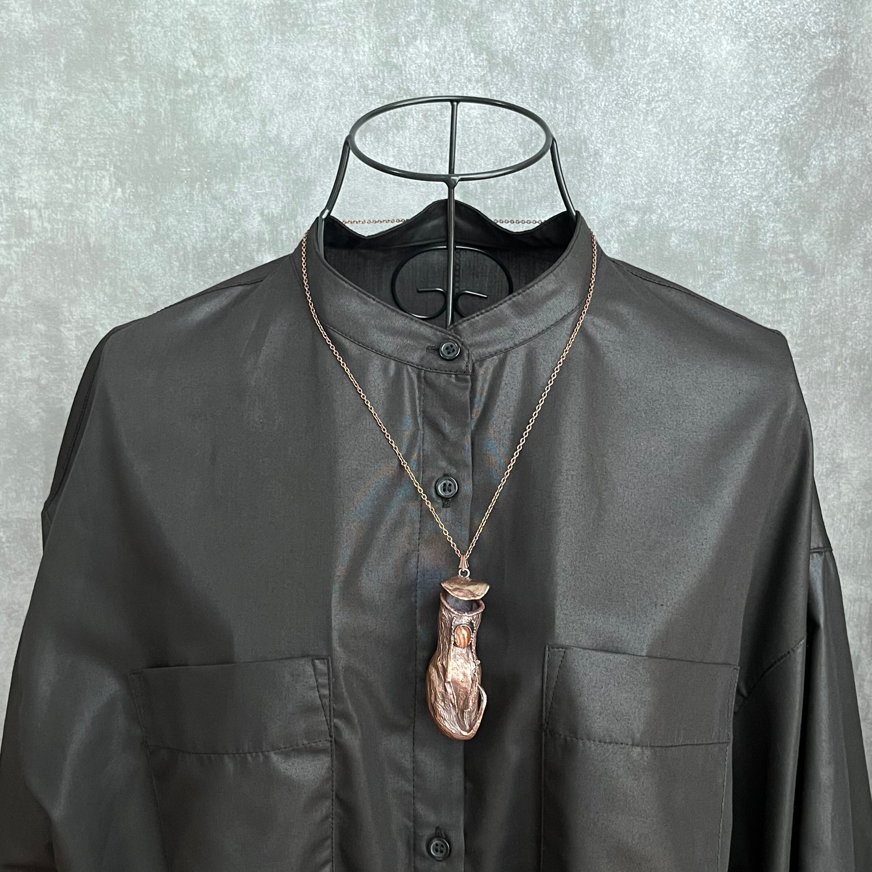 ウツボカズラ(ネペンテス)の捕虫袋(ピッチャー)を収穫し、洗浄後、エレクトロフォーミングという技法で銅めっきをほどこし、ネックレスを作製しました。