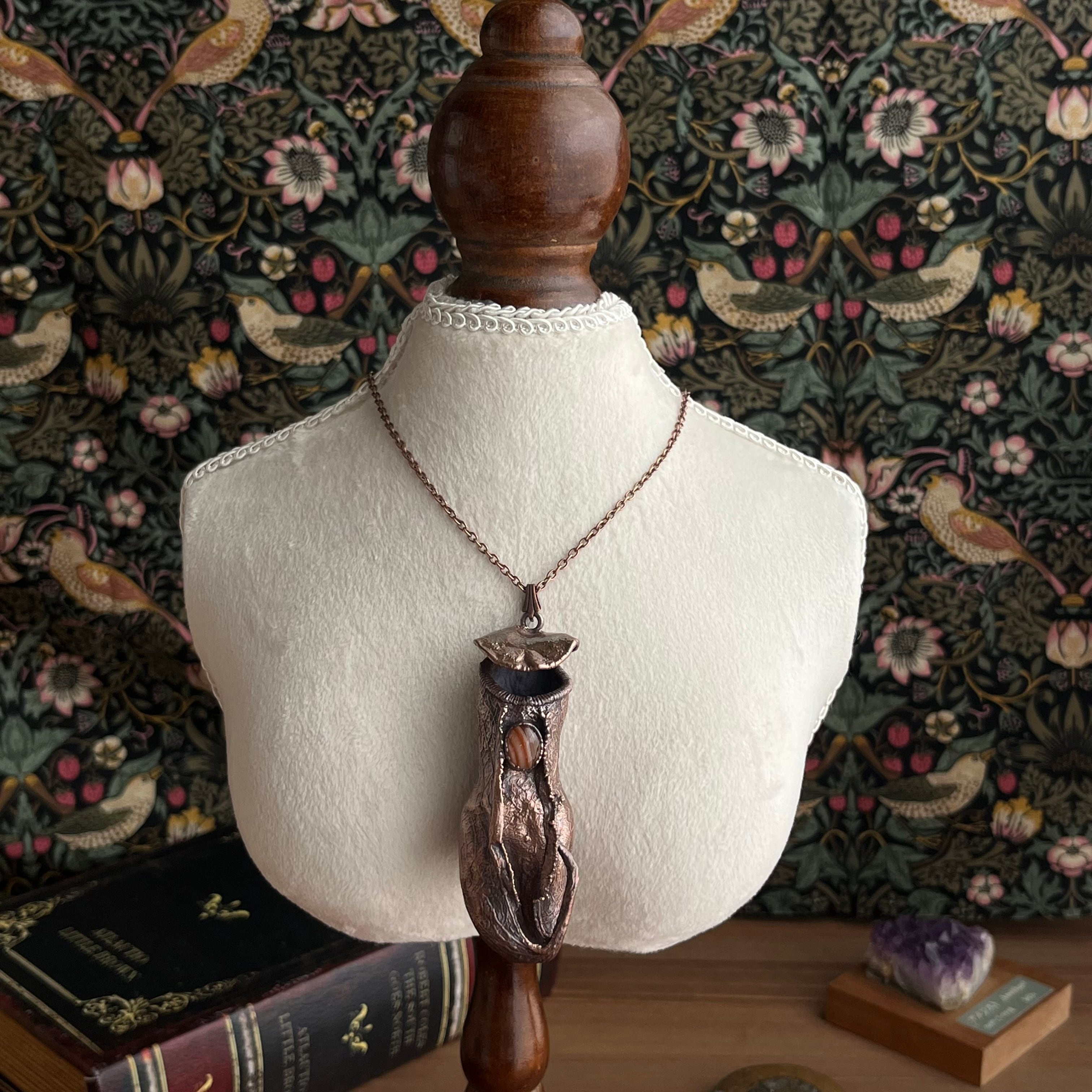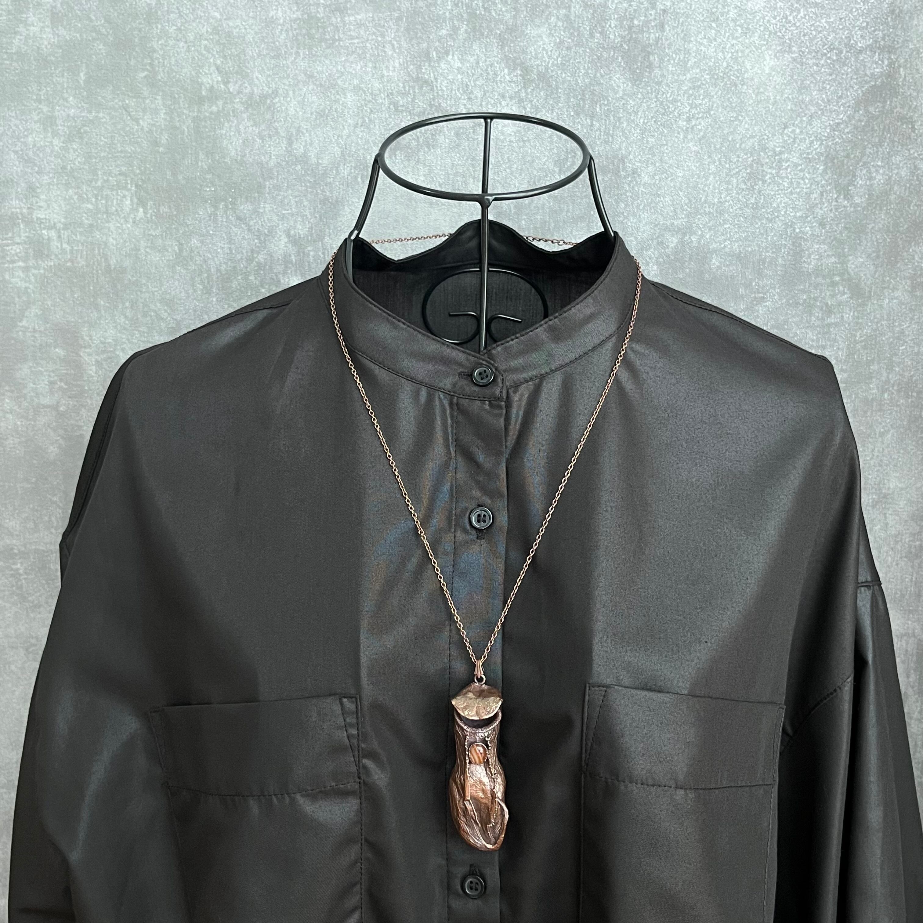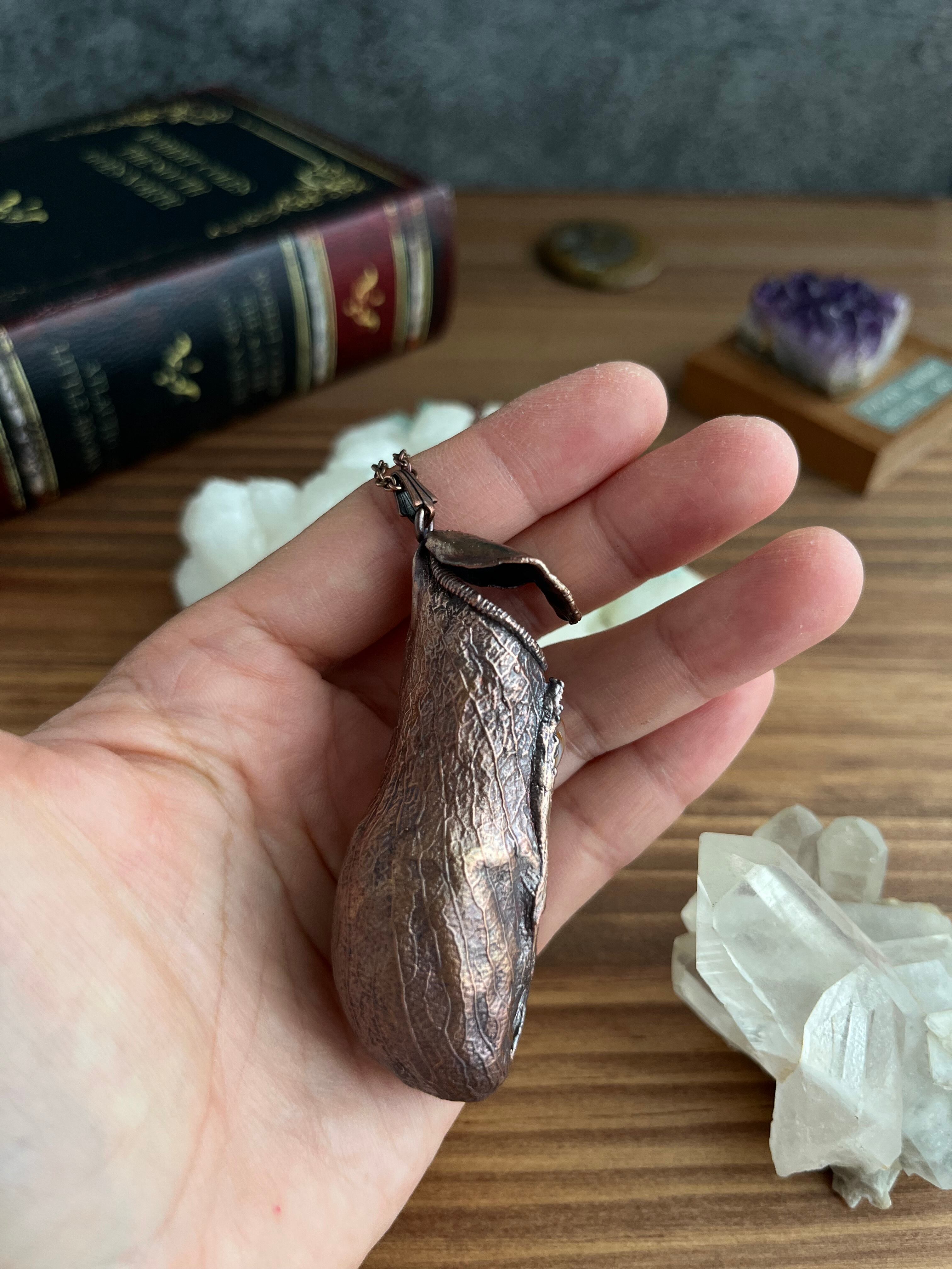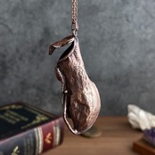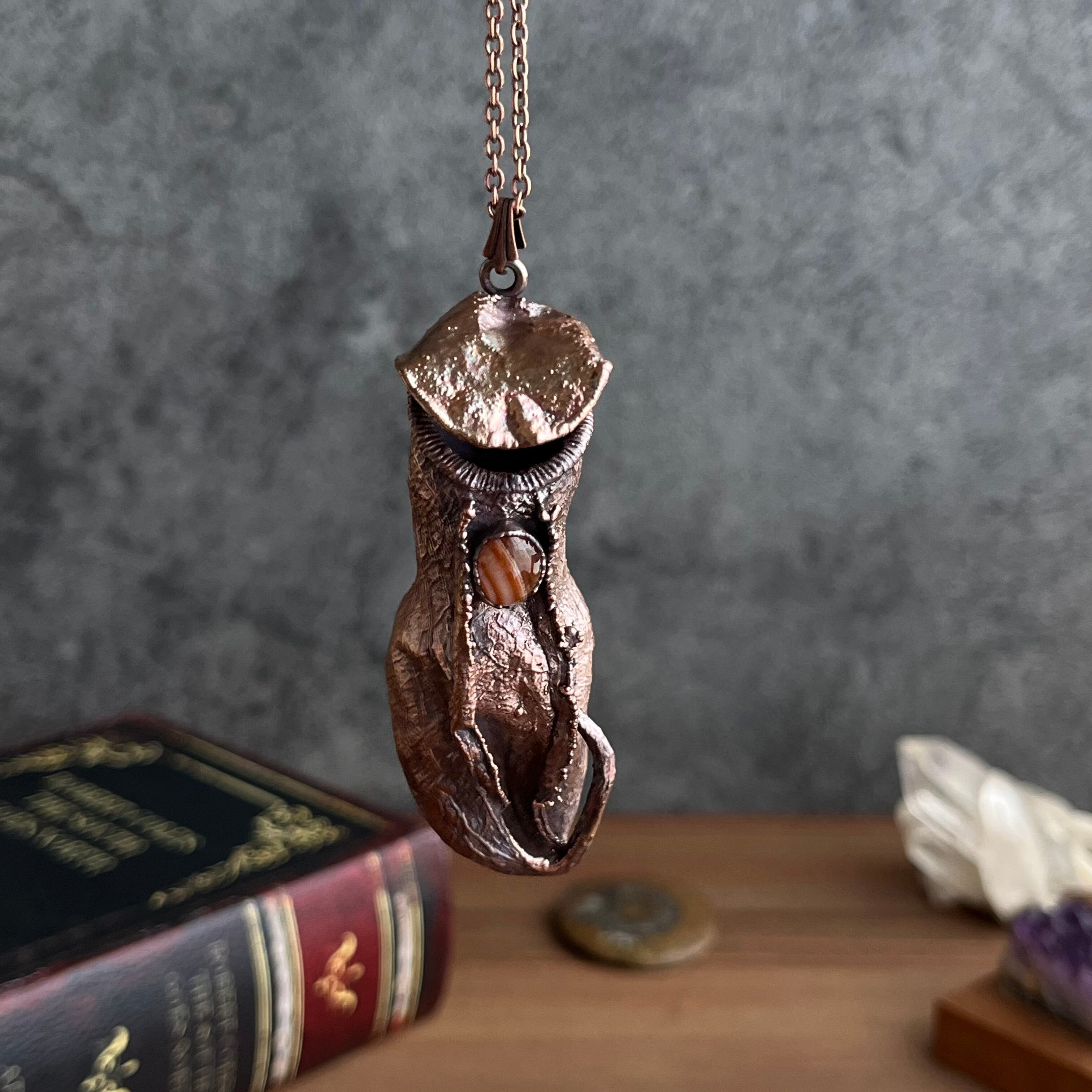 ウツボカズラ(ネペンテス)の捕虫袋(ピッチャー)を収穫し、洗浄後、エレクトロフォーミングという技法で銅めっきをほどこし、ネックレスを作製しました。