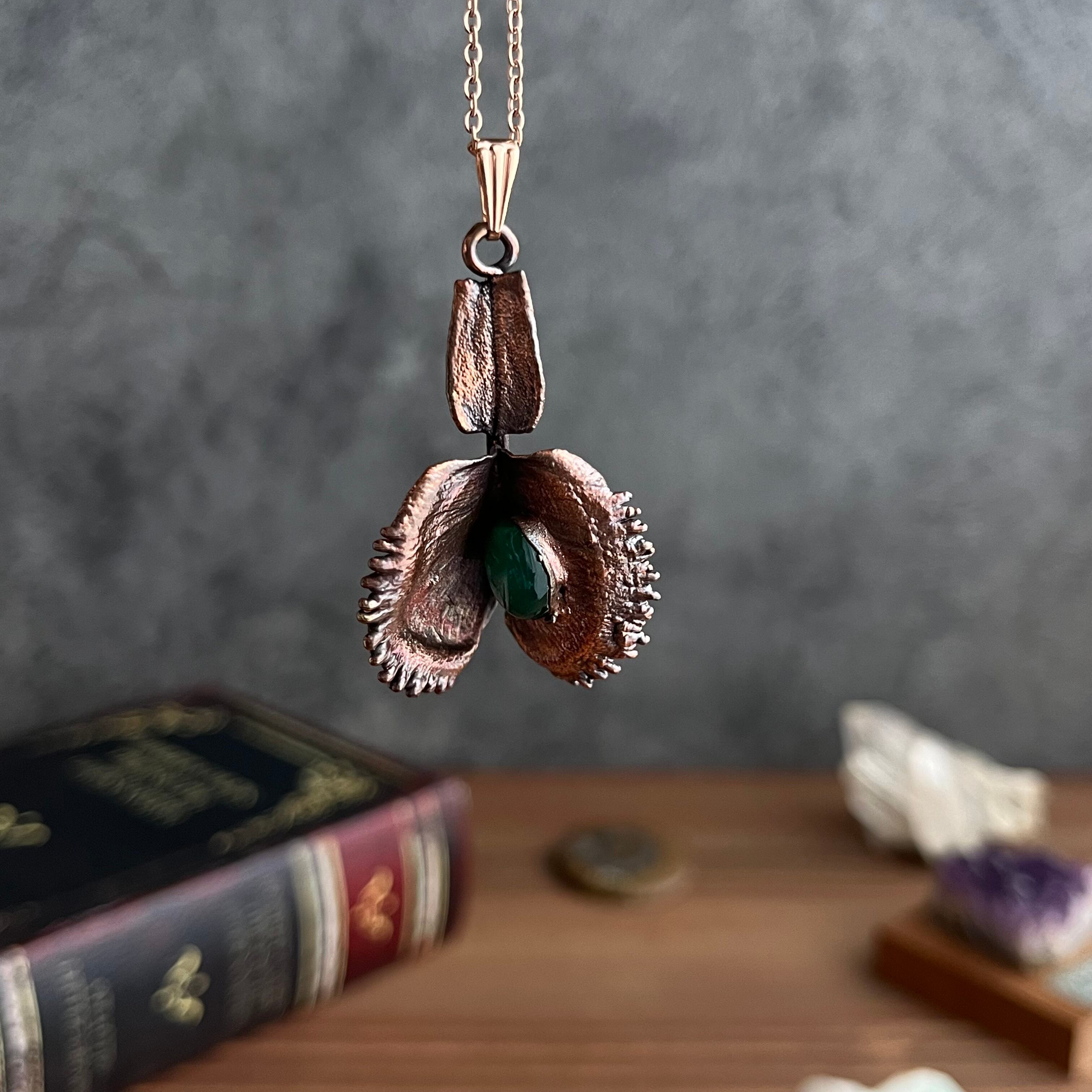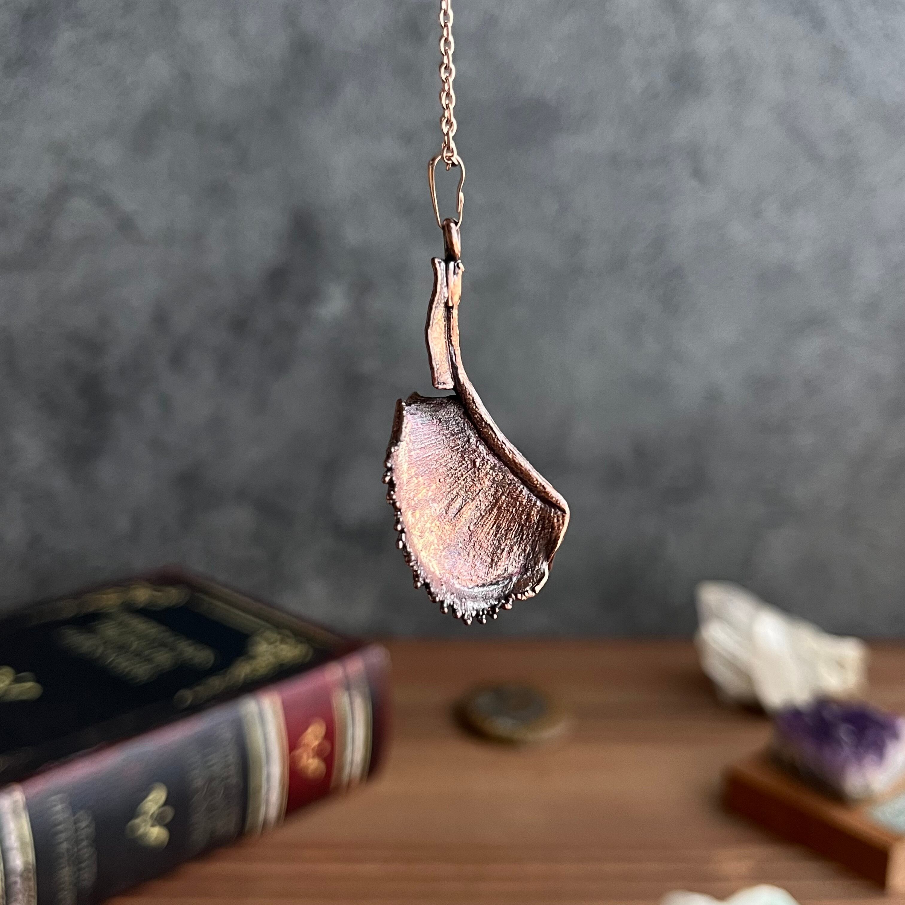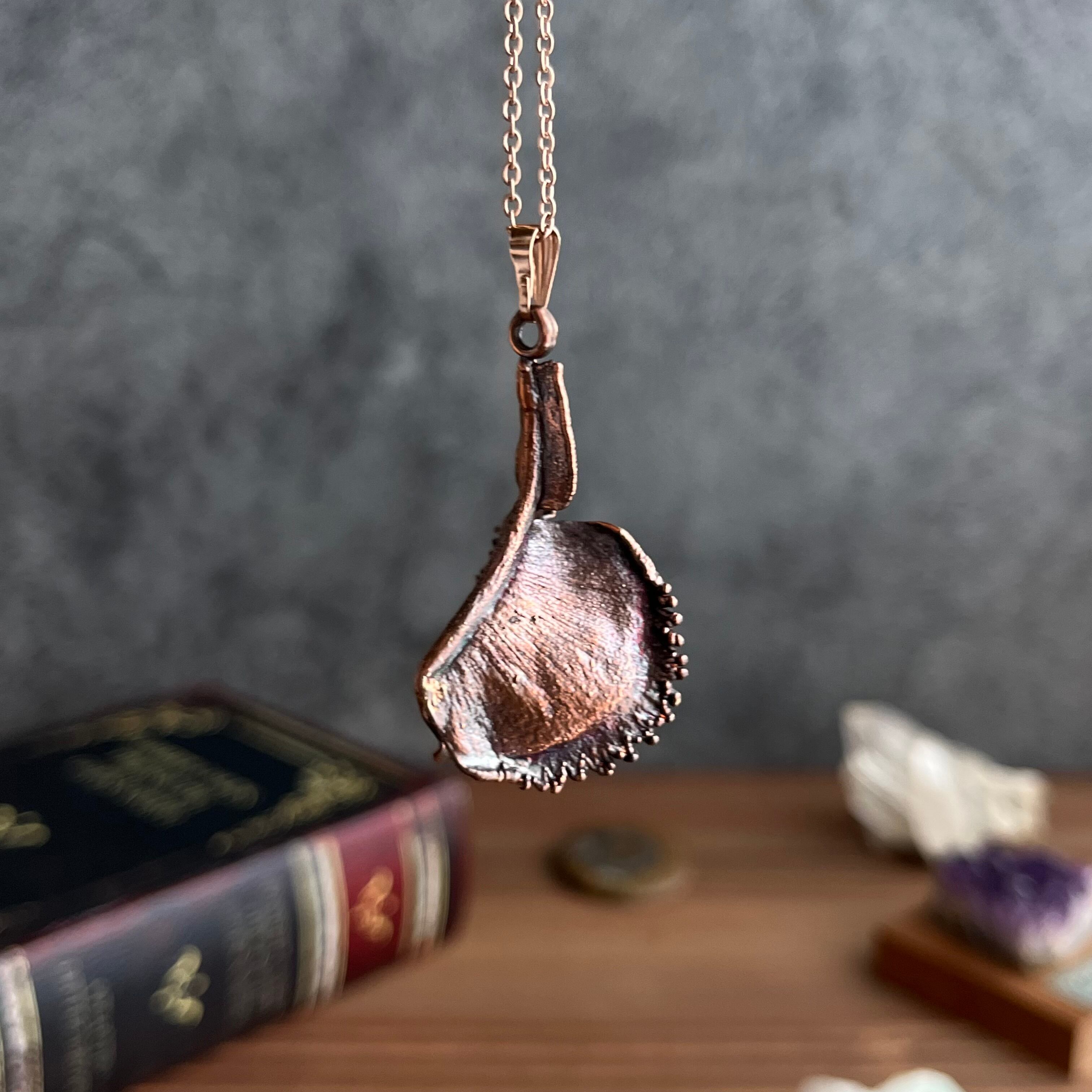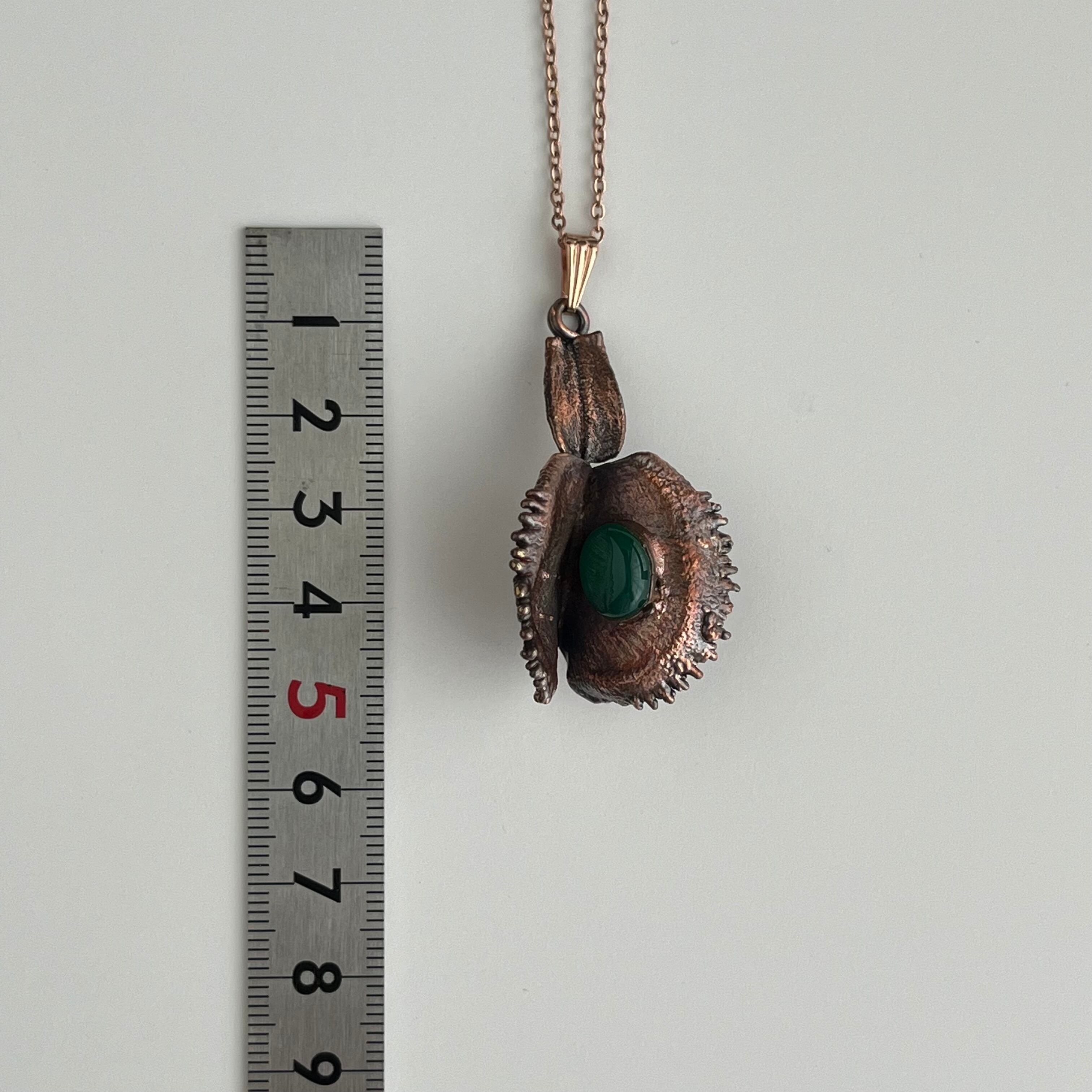 収穫した捕虫葉をエレクトロフォーミングという技法で銅めっきし、アクセサリーに仕立てているため、銅の中には本物のハエトリグサが入っています。