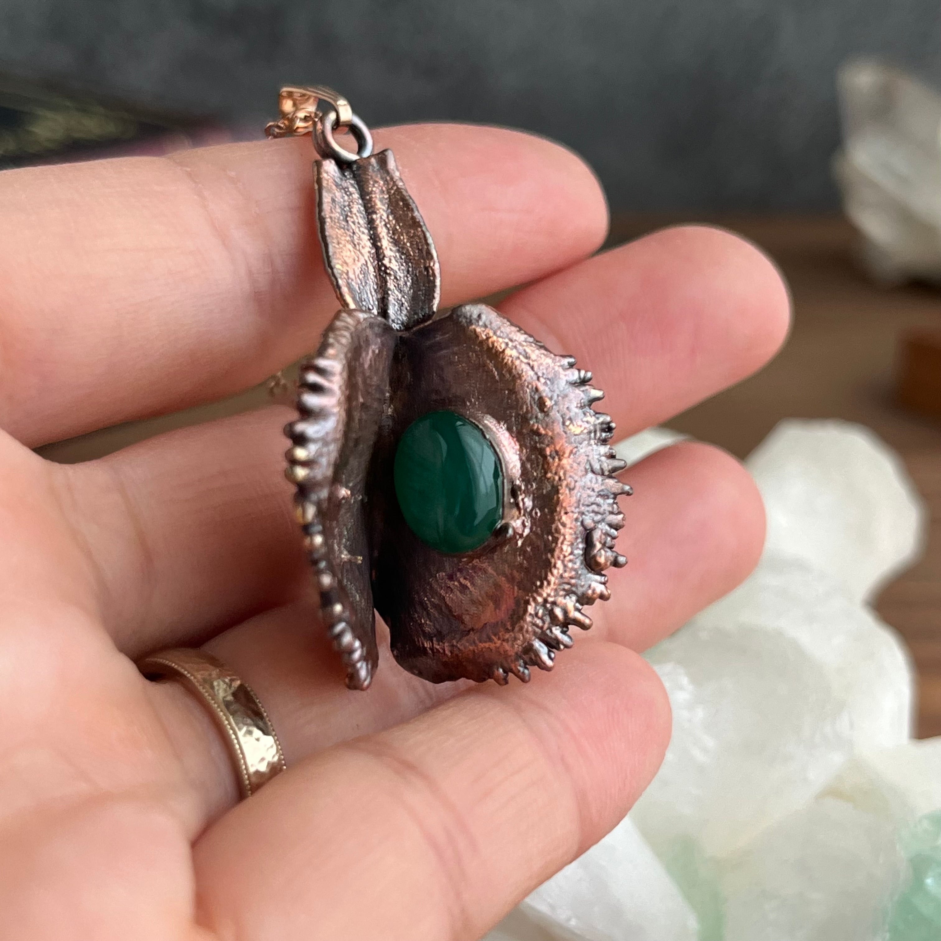 補虫葉の内側には大きなグリーンオニキスのカボションをあしらいました。