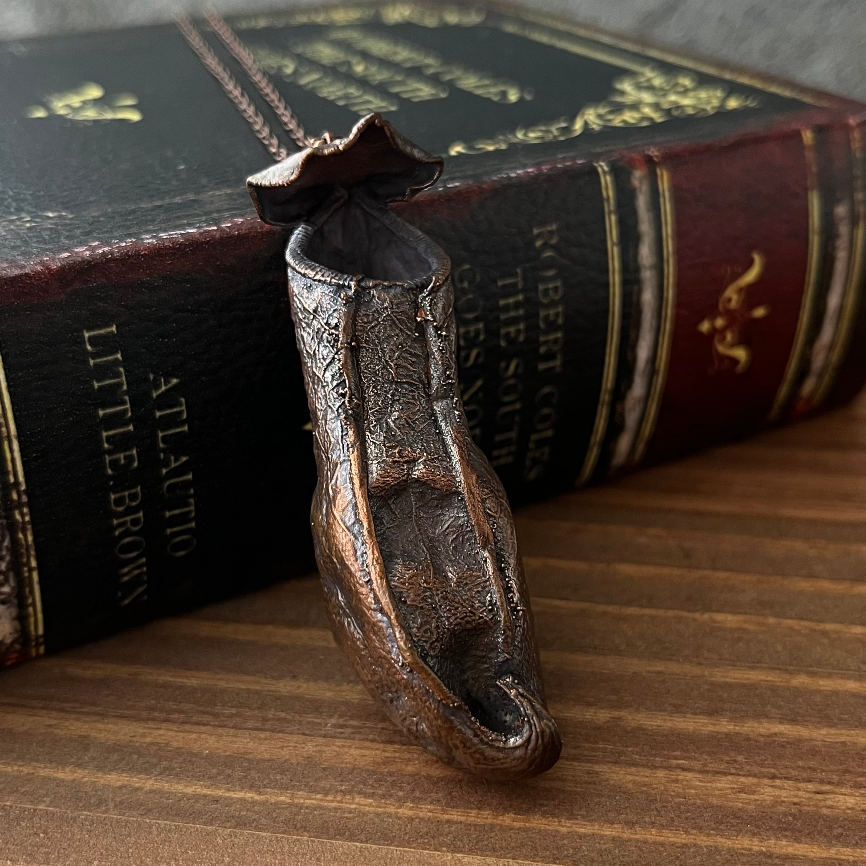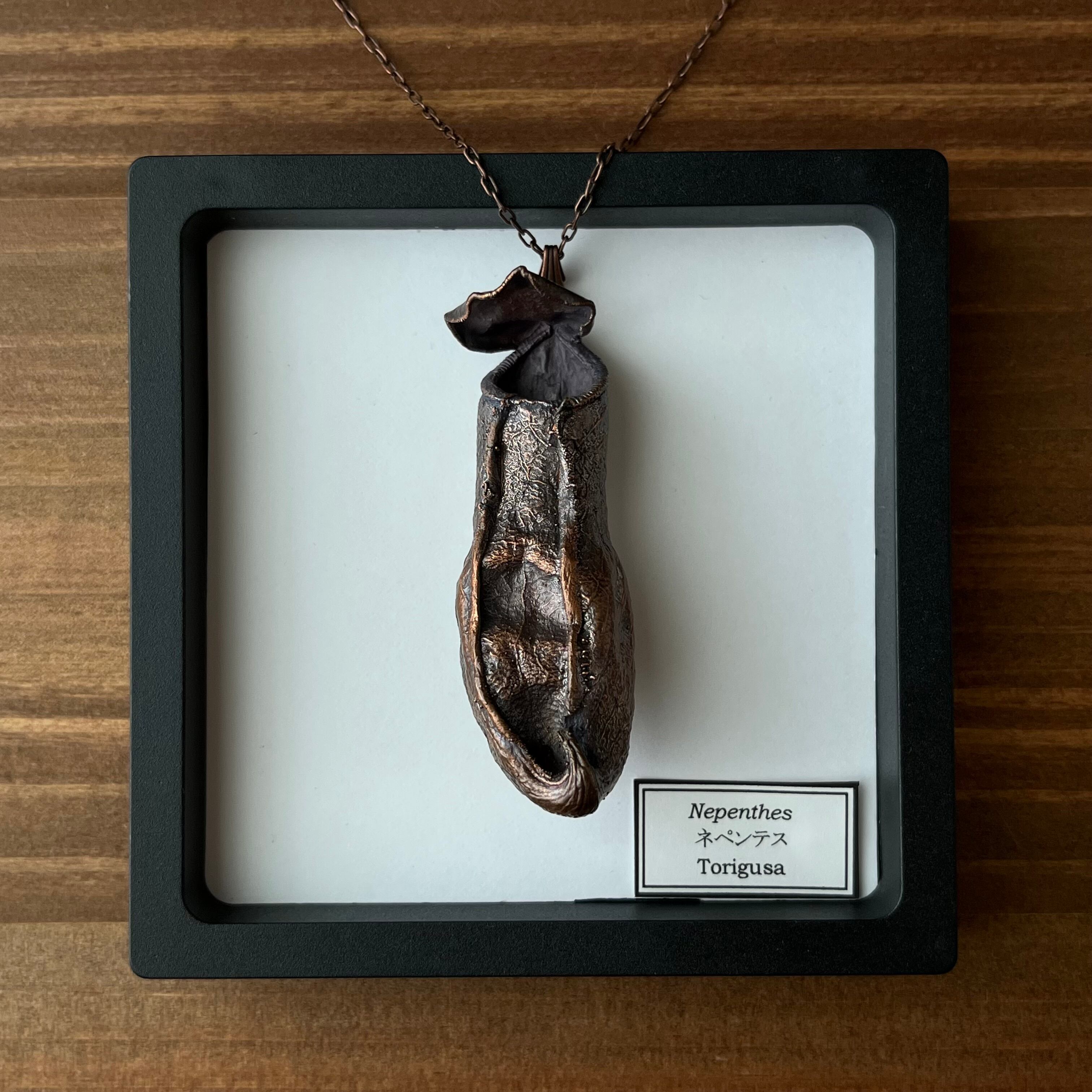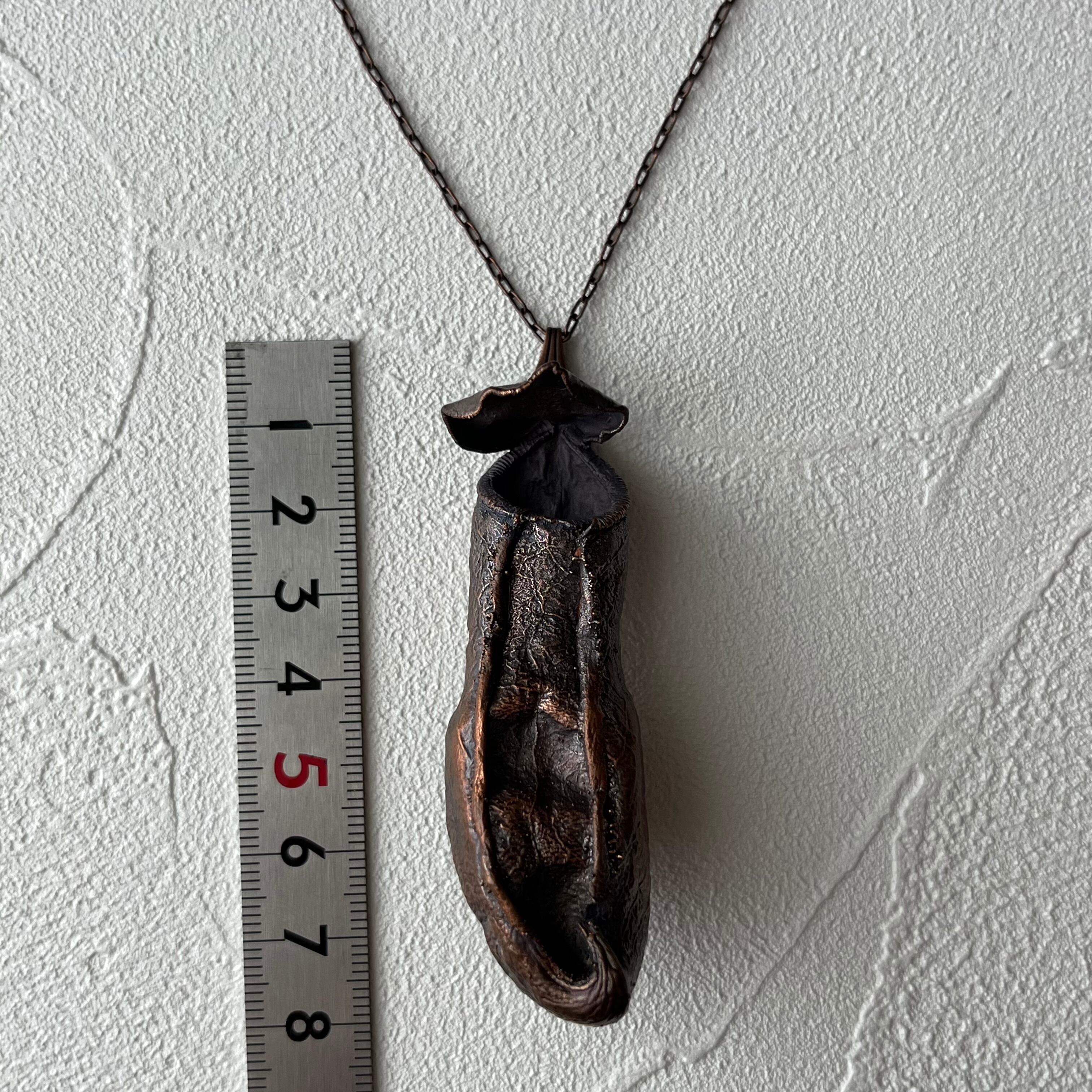 ウツボカズラ(ネペンテス)の捕虫袋(ピッチャー)を収穫し、洗浄後、エレクトロフォーミングという技法で銅めっきをほどこし、ネックレスを作製しました。