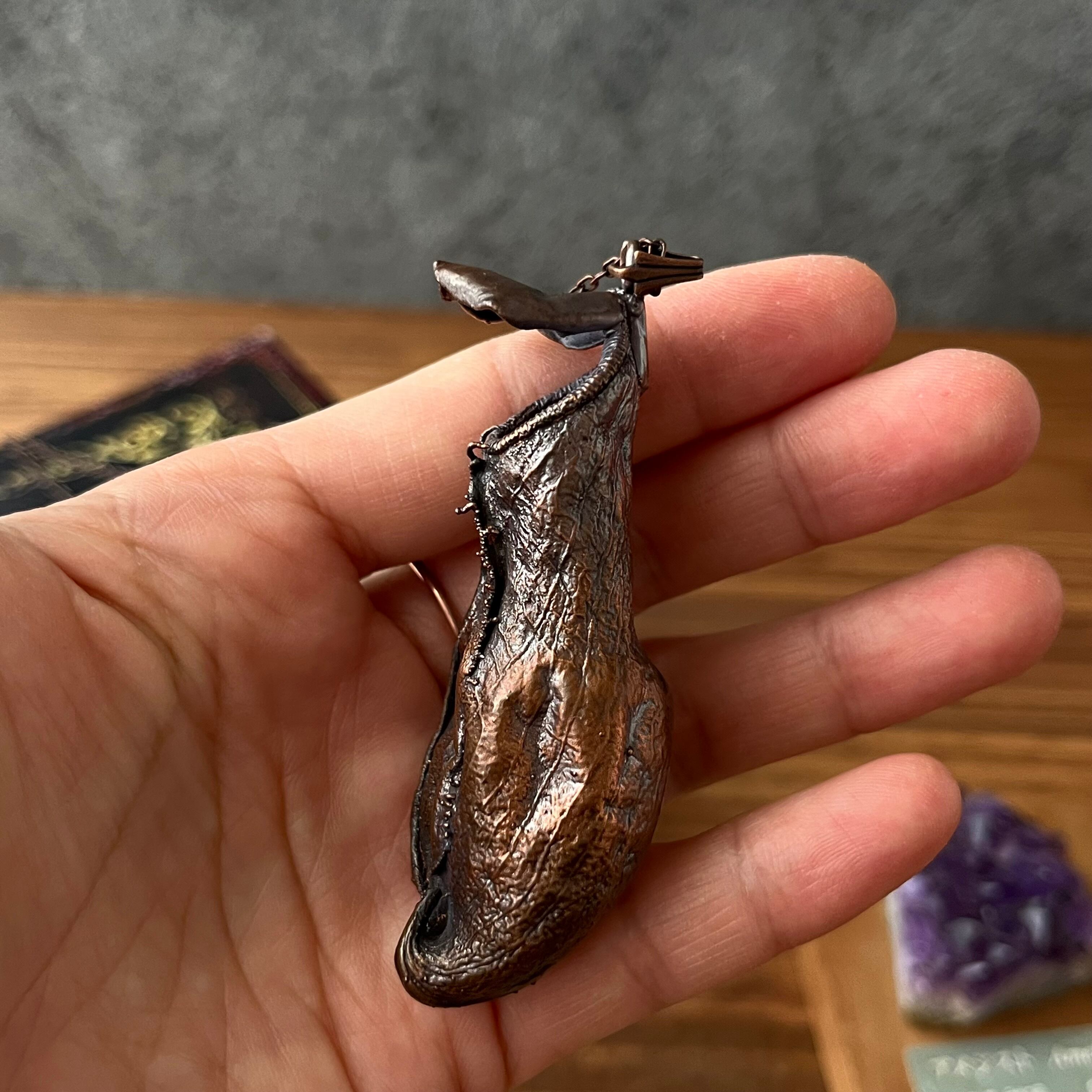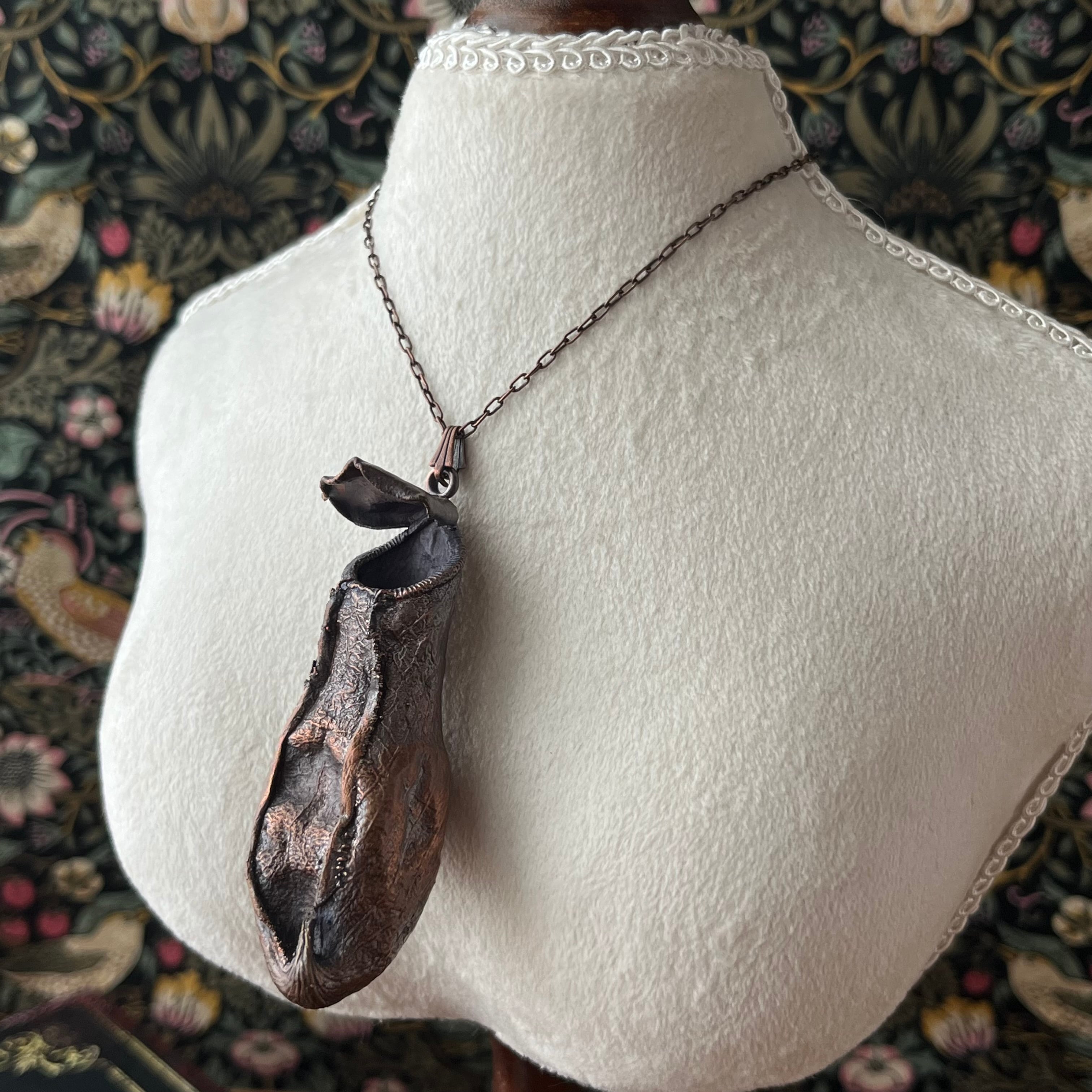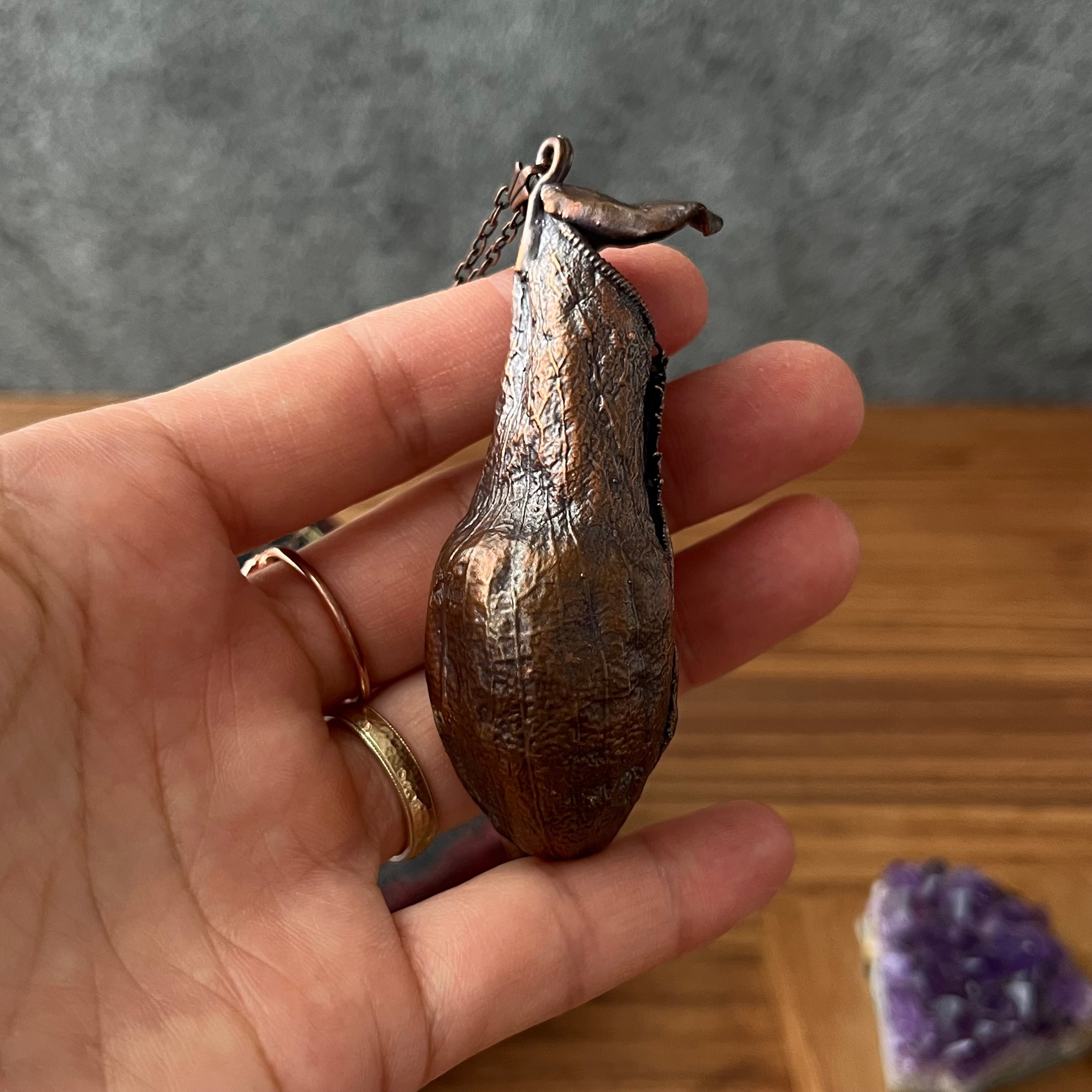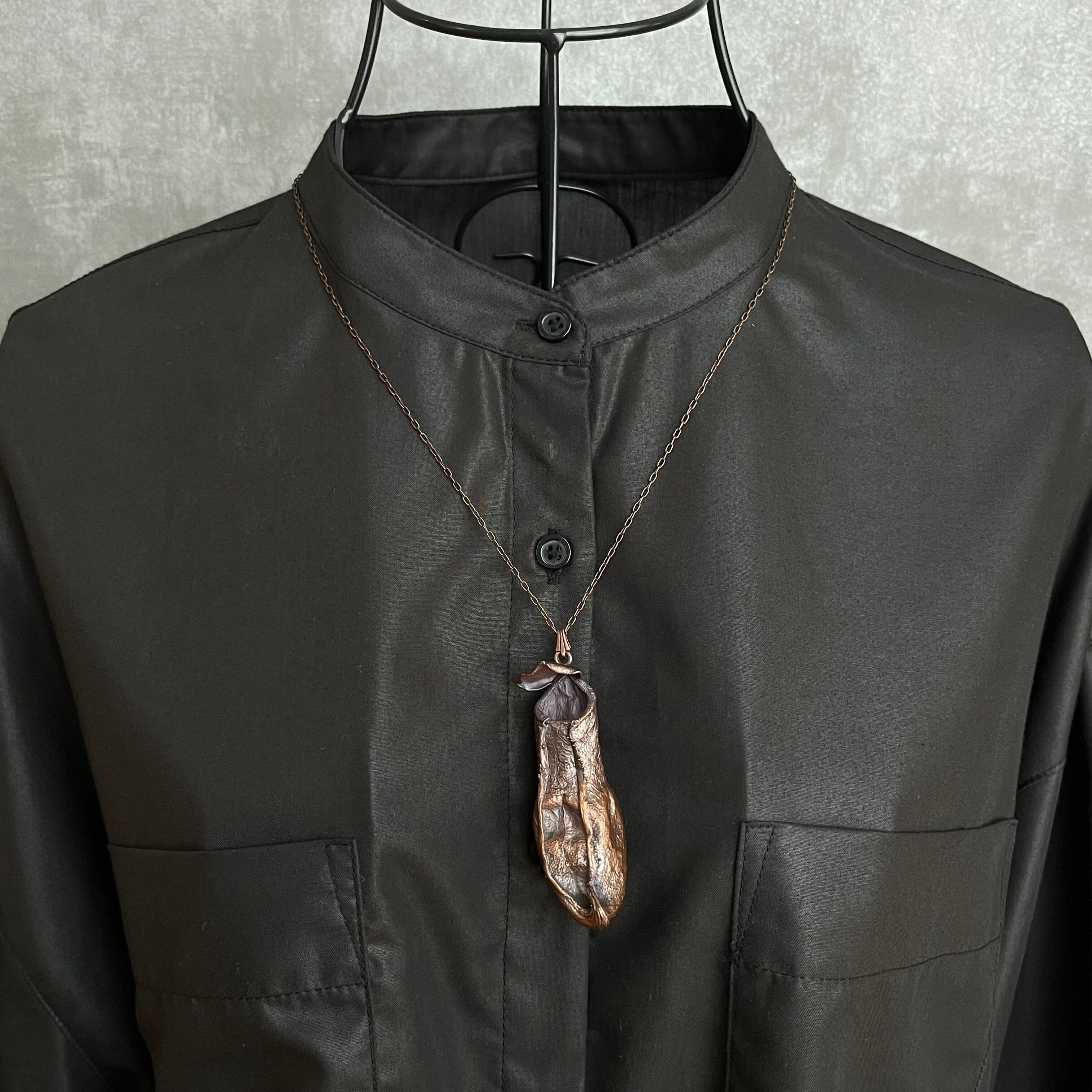 ウツボカズラ(ネペンテス)の捕虫袋(ピッチャー)を収穫し、洗浄後、エレクトロフォーミングという技法で銅めっきをほどこし、ネックレスを作製しました。