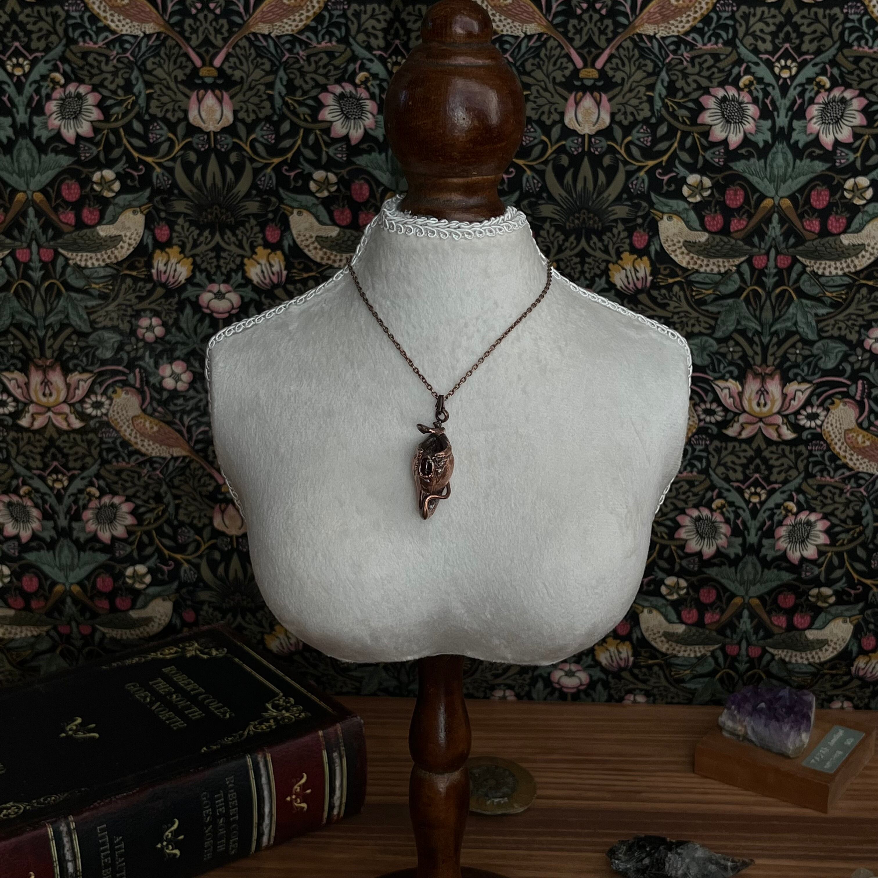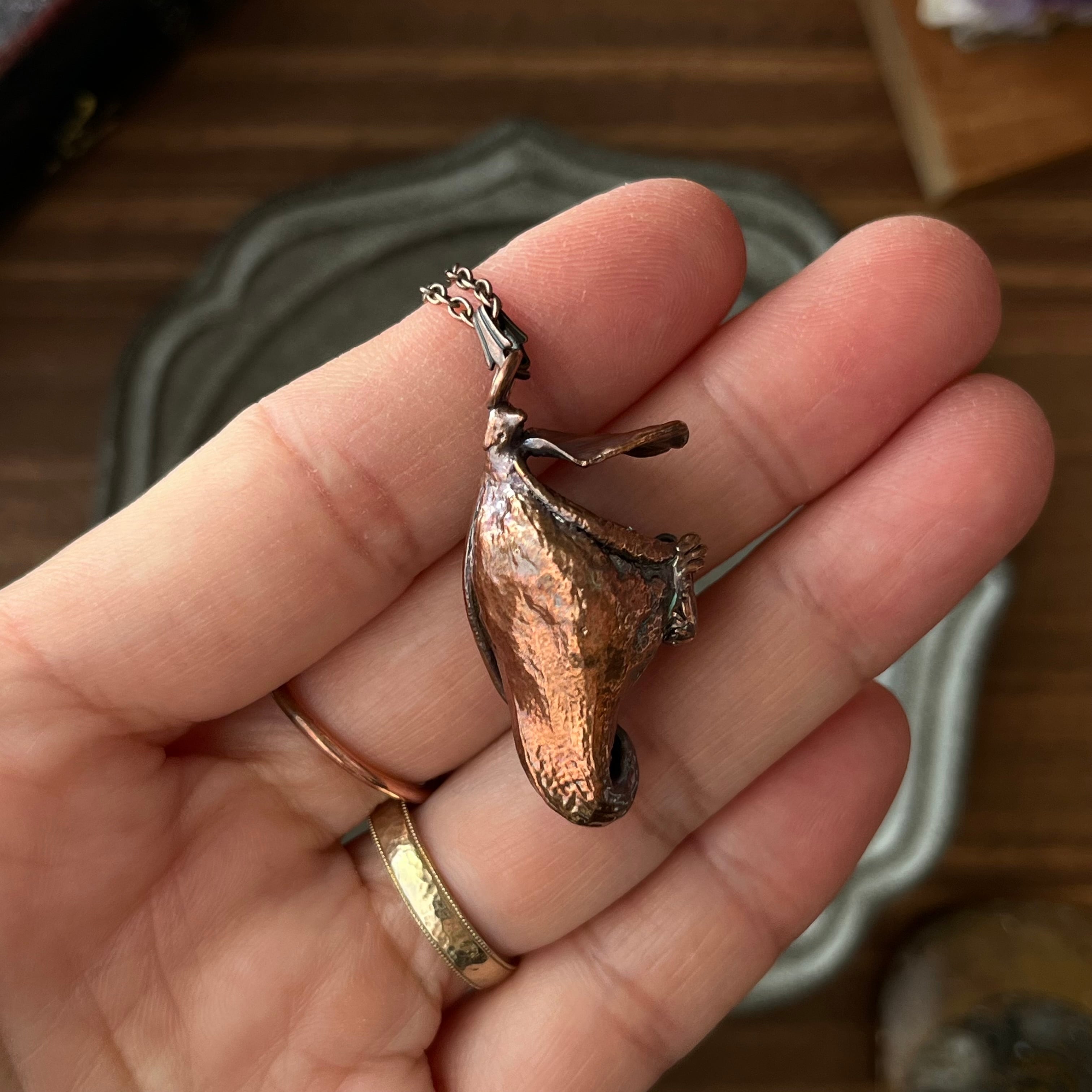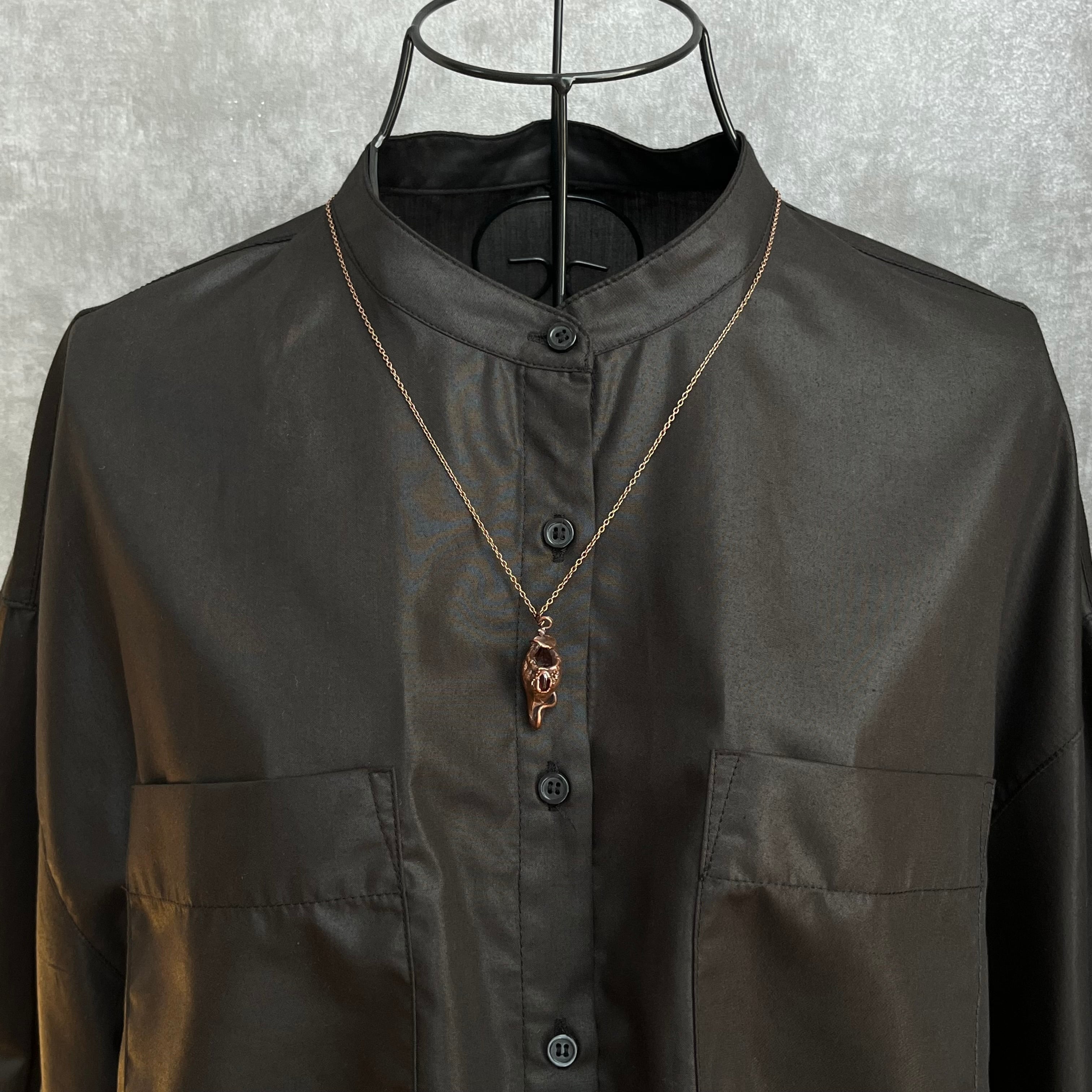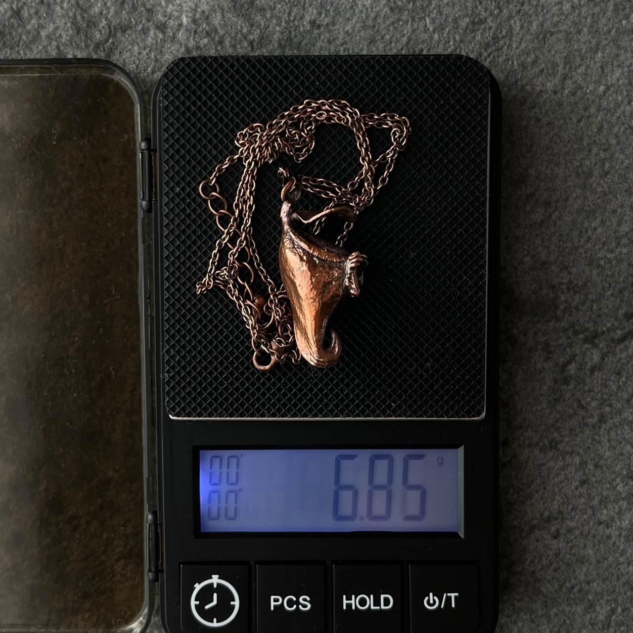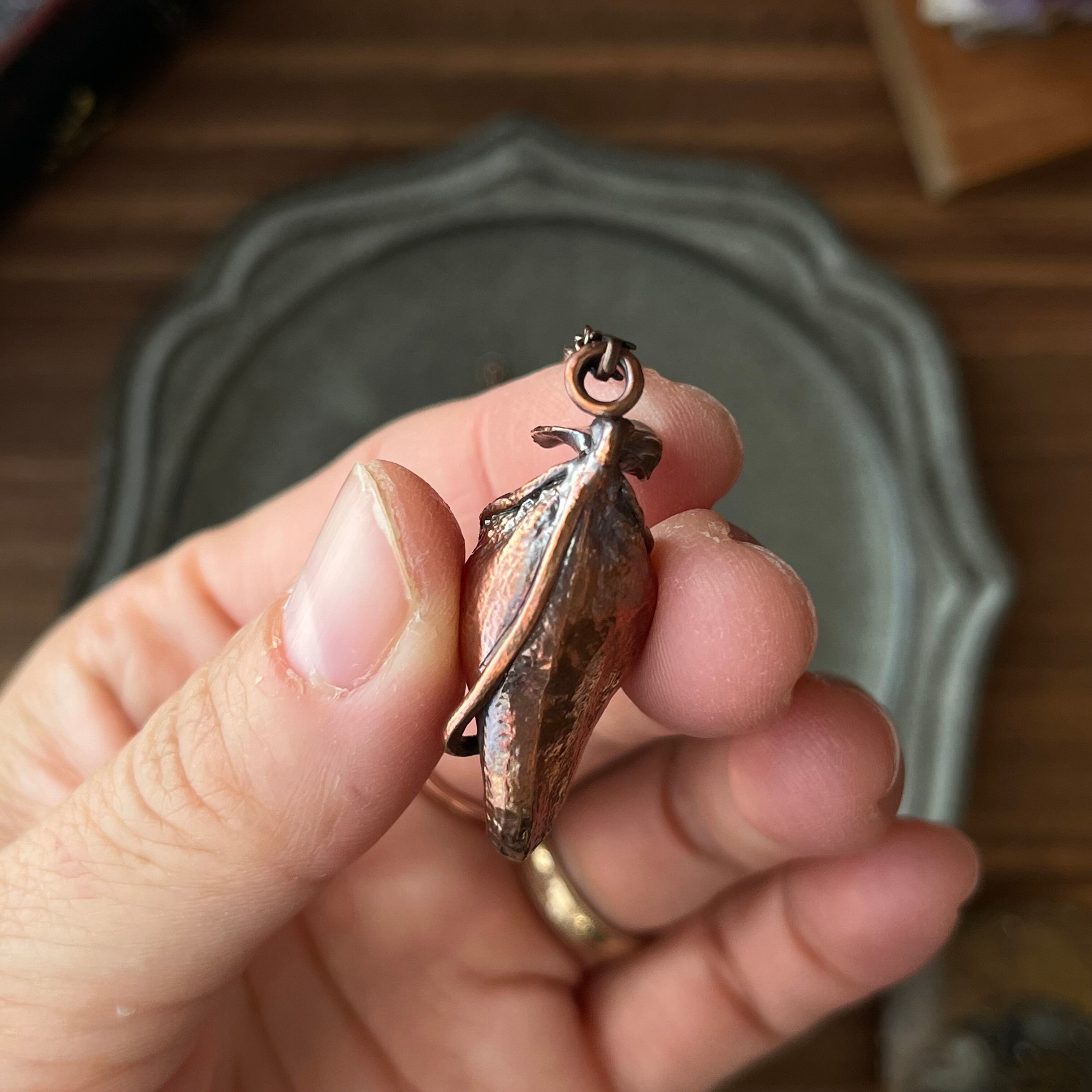 ウツボカズラ(ネペンテス)「ジャンバン」の捕虫袋(ピッチャー)を収穫し、洗浄後、エレクトロフォーミングという技法で銅めっきをほどこし、ネックレスを作製しました。