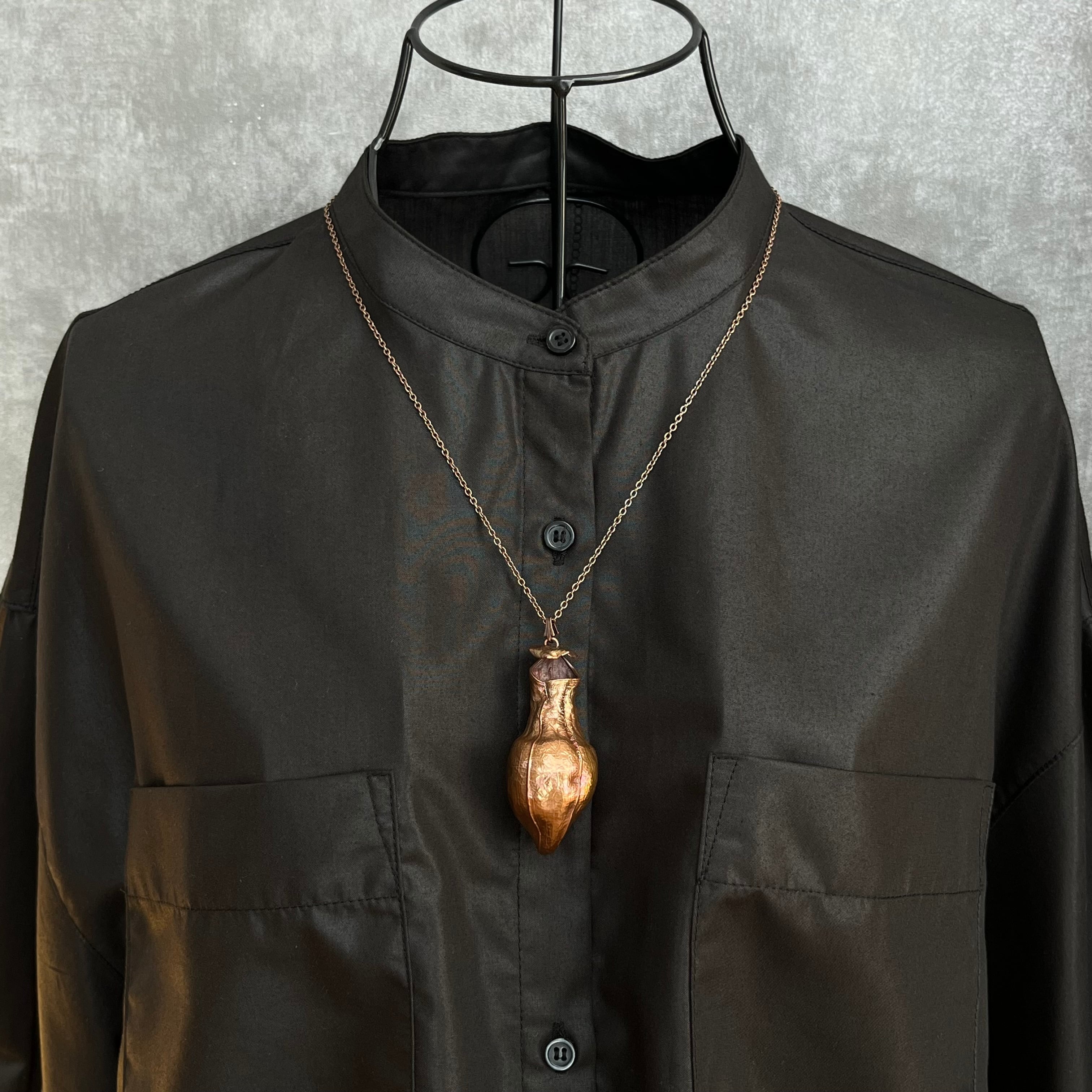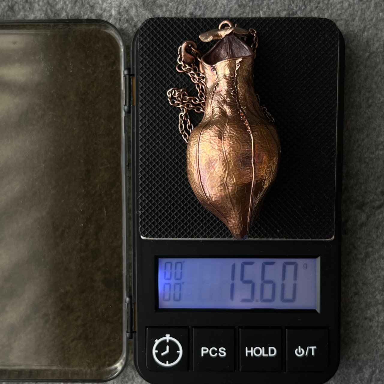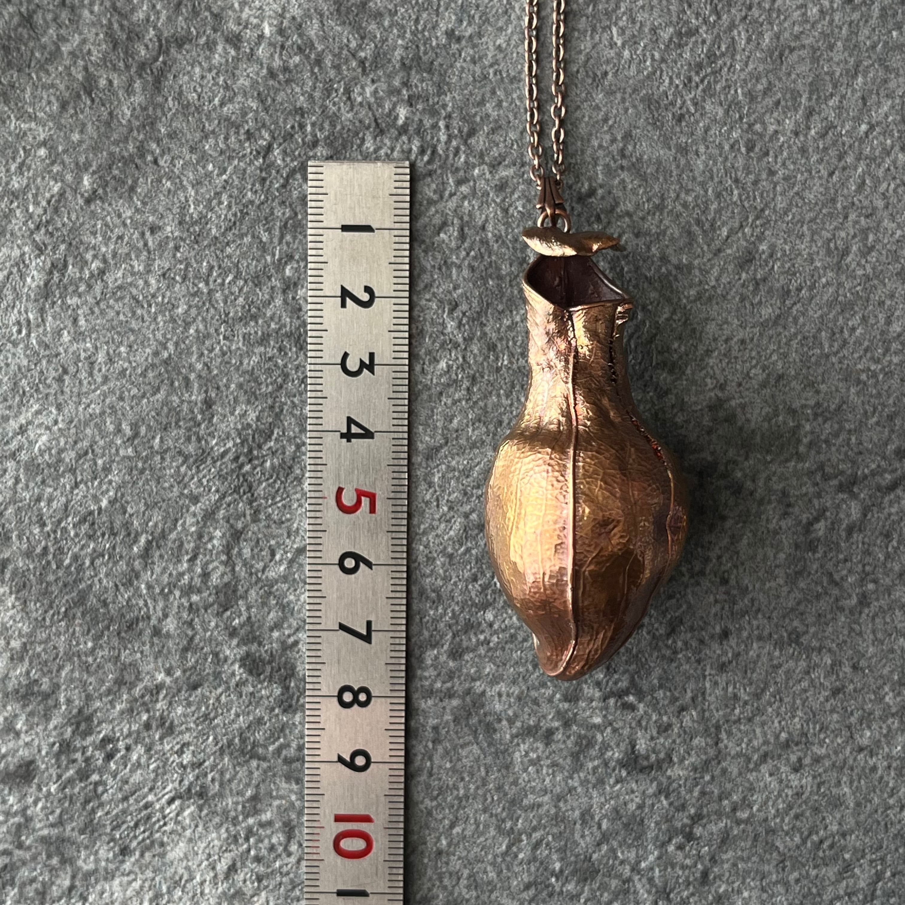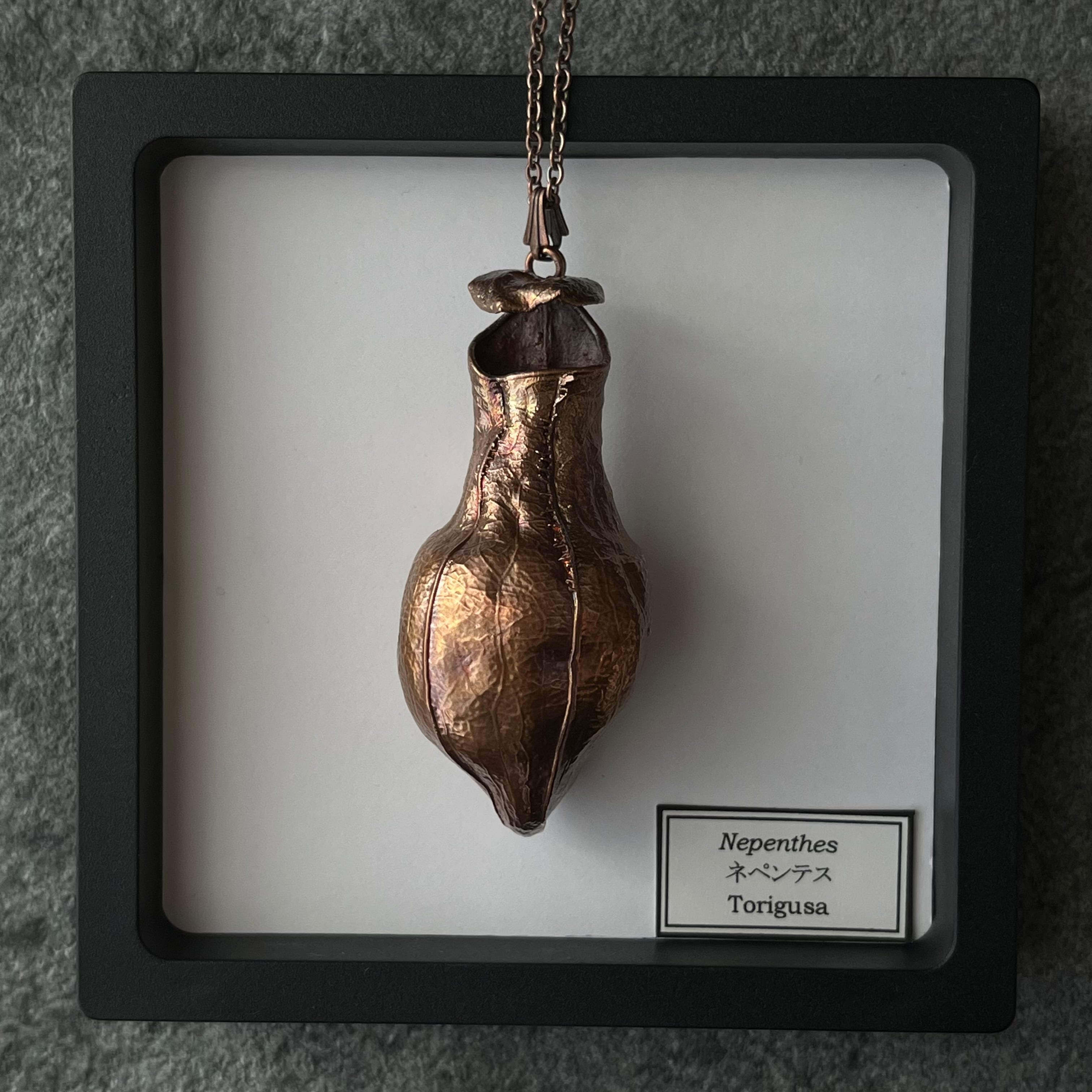 ウツボカズラ(ネペンテス)「グラシリス・スポート」の捕虫袋(ピッチャー)を収穫し、洗浄後、エレクトロフォーミングという技法で銅めっきをほどこし、ネックレスを作製しました。