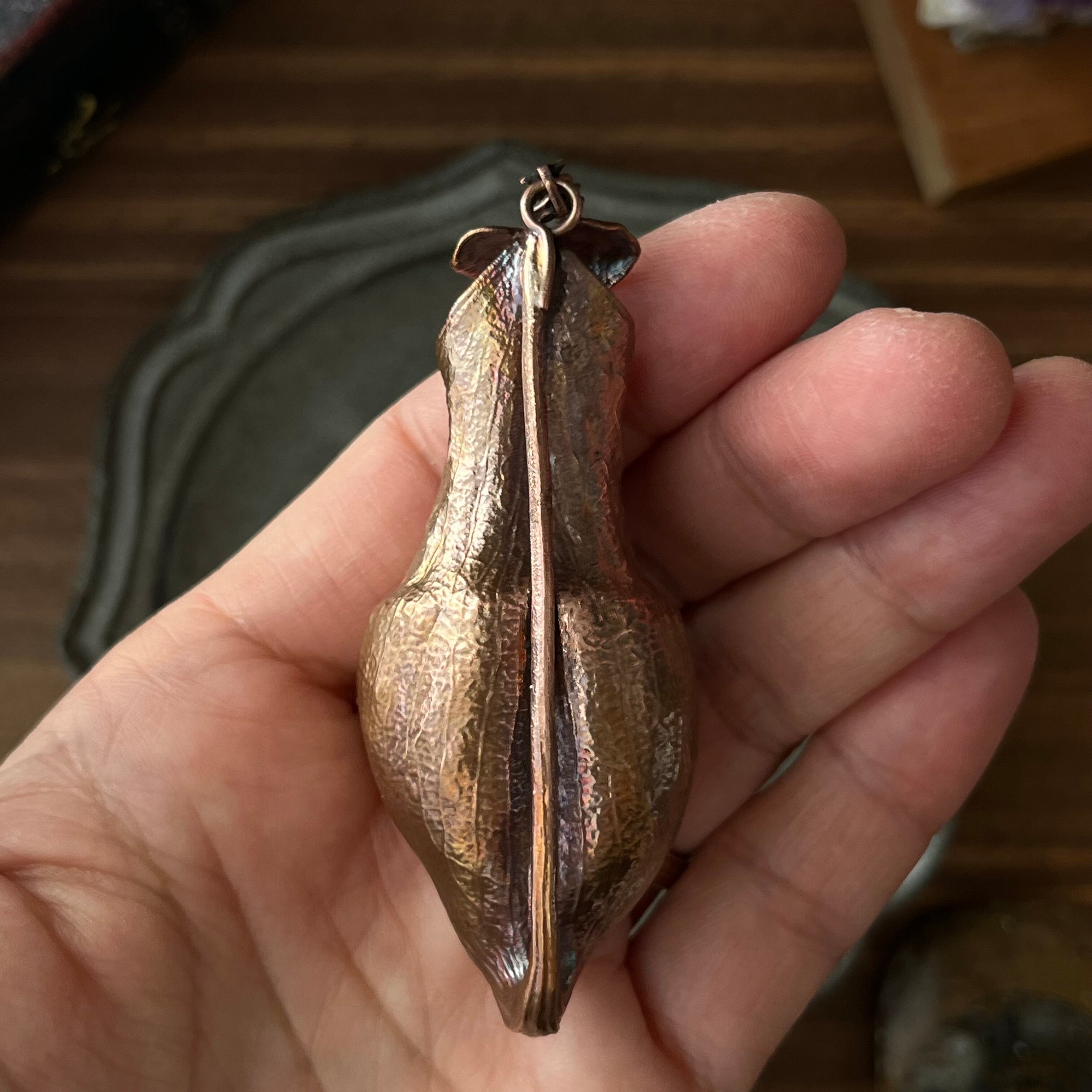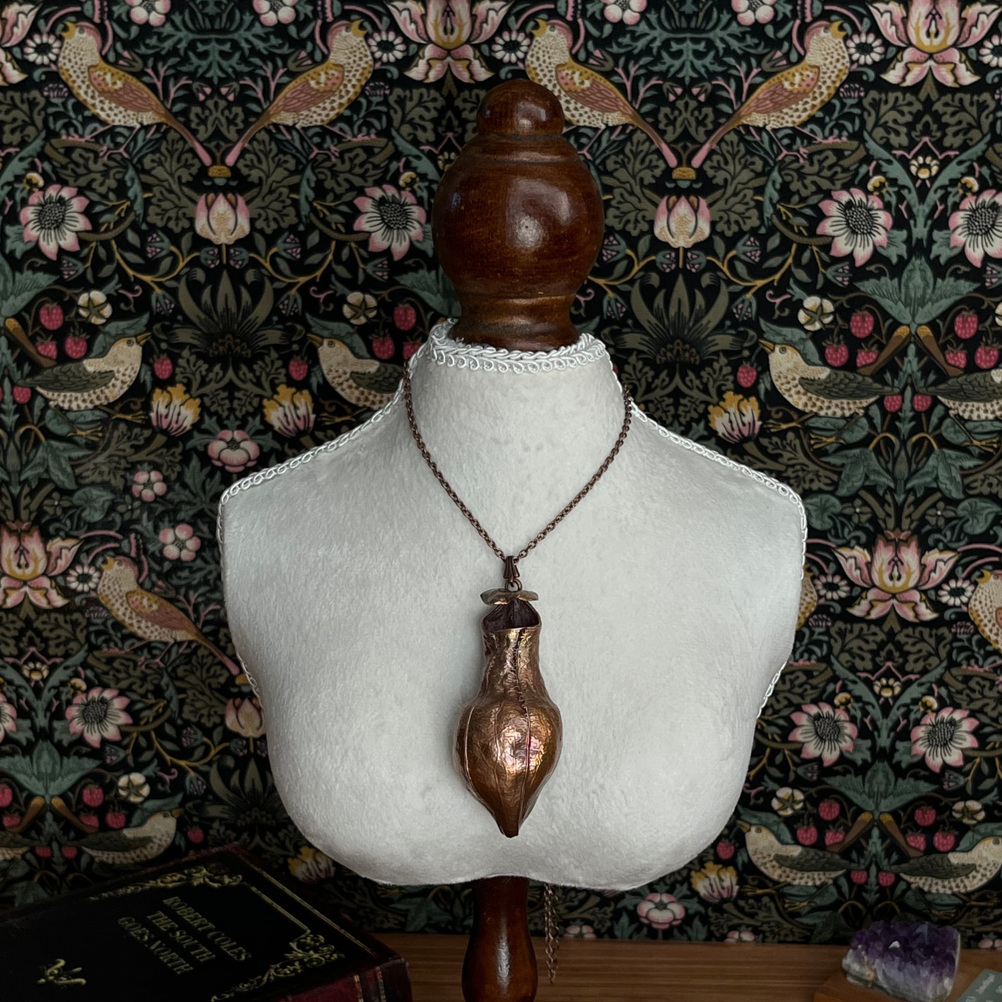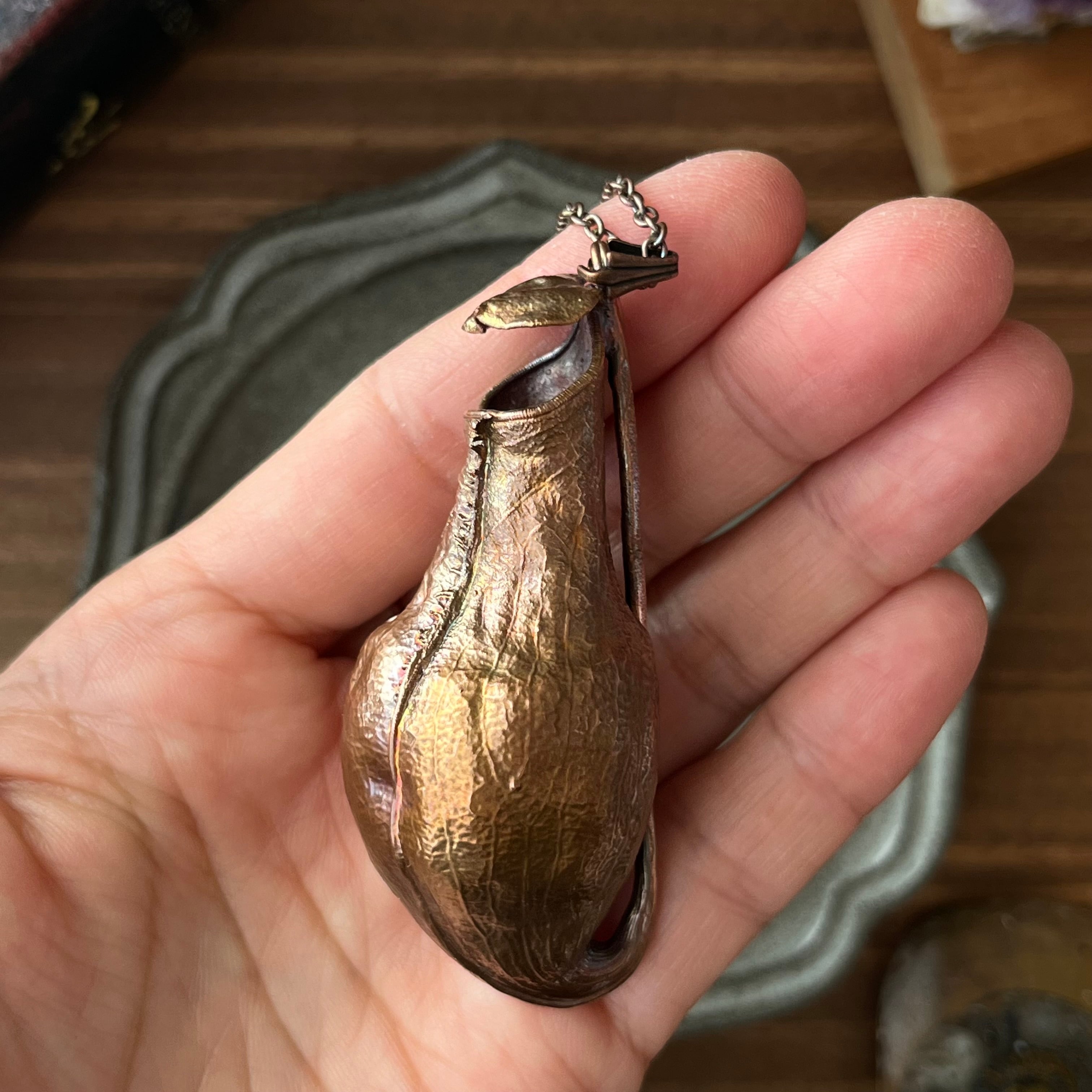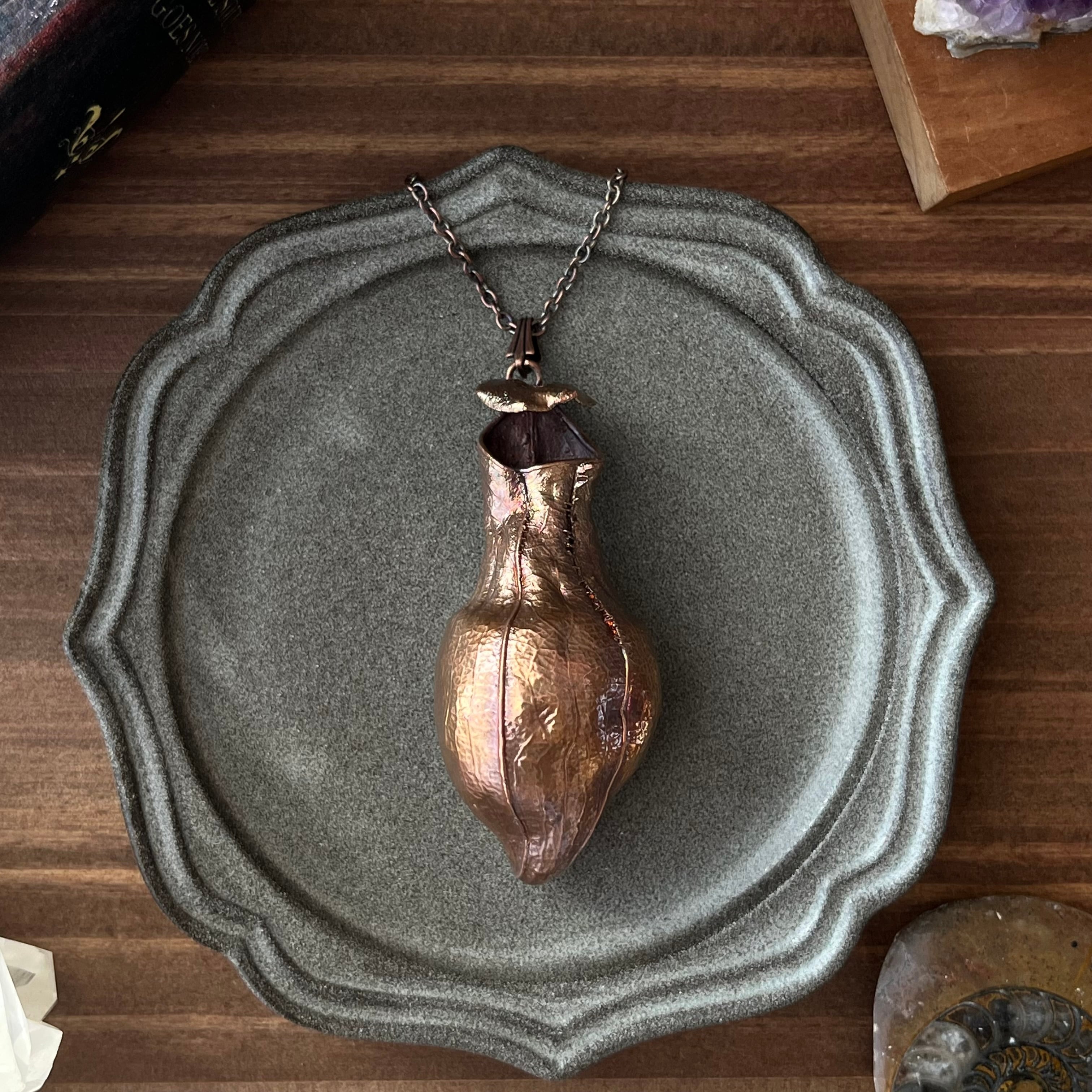 ウツボカズラ(ネペンテス)「グラシリス・スポート」の捕虫袋(ピッチャー)を収穫し、洗浄後、エレクトロフォーミングという技法で銅めっきをほどこし、ネックレスを作製しました。