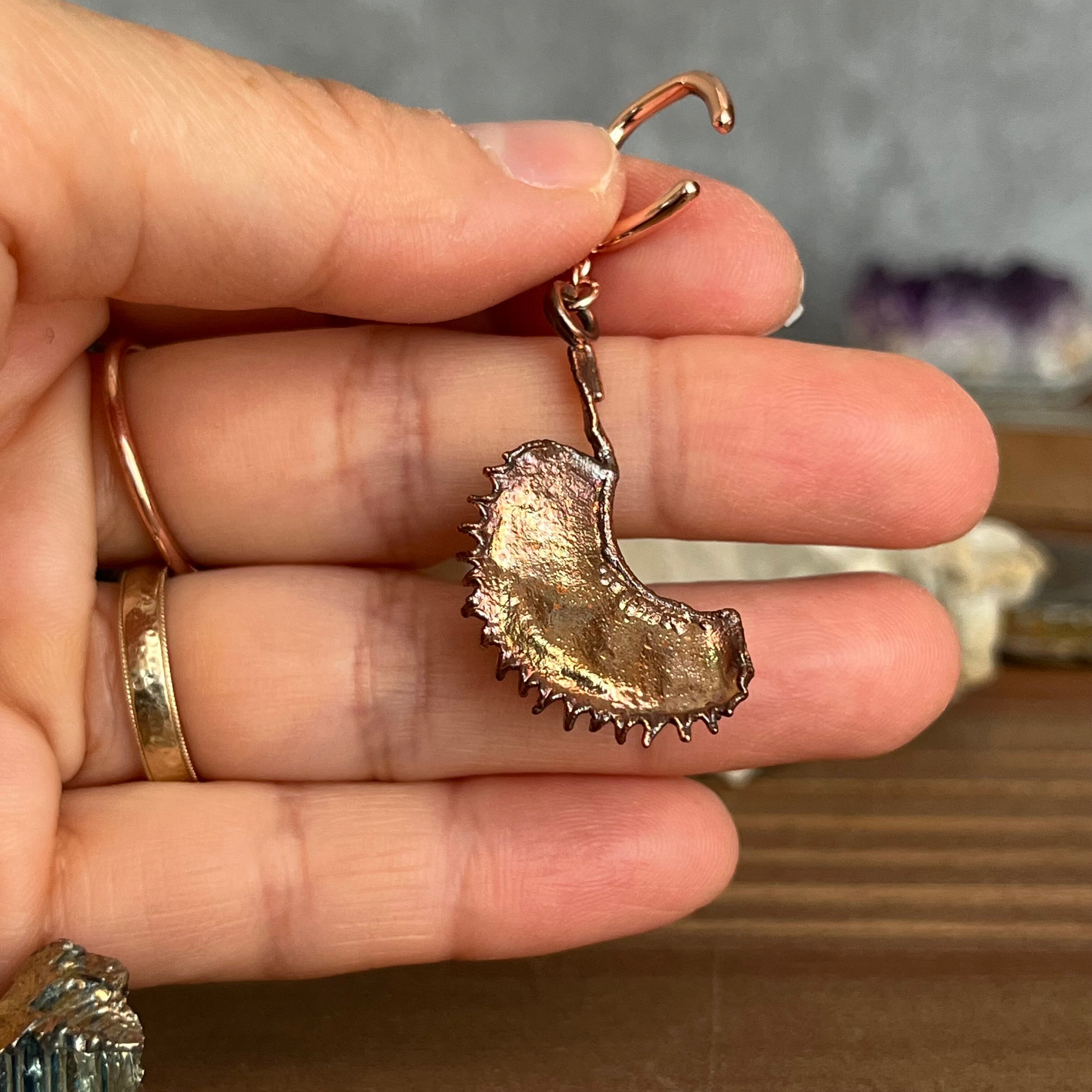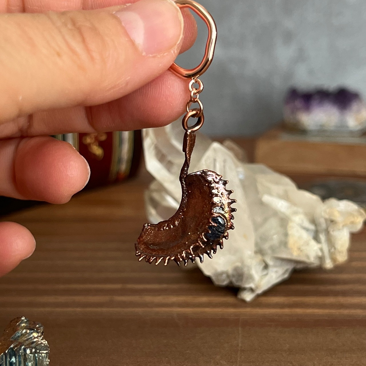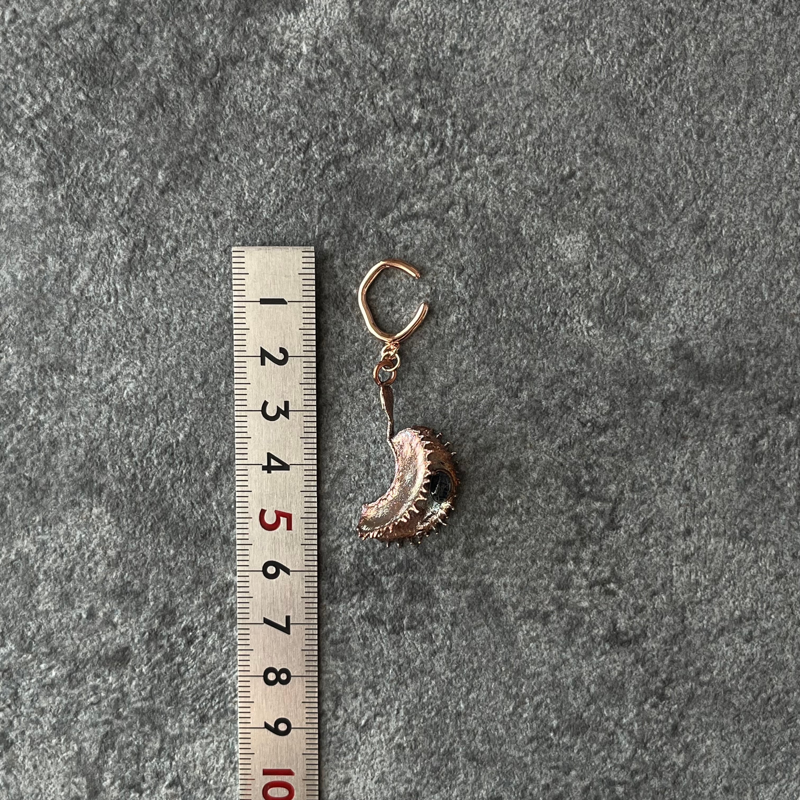 収穫した捕虫葉をエレクトロフォーミングという技法で銅めっきし、アクセサリーに仕立てているため、銅の中には本物のハエトリグサが入っています。