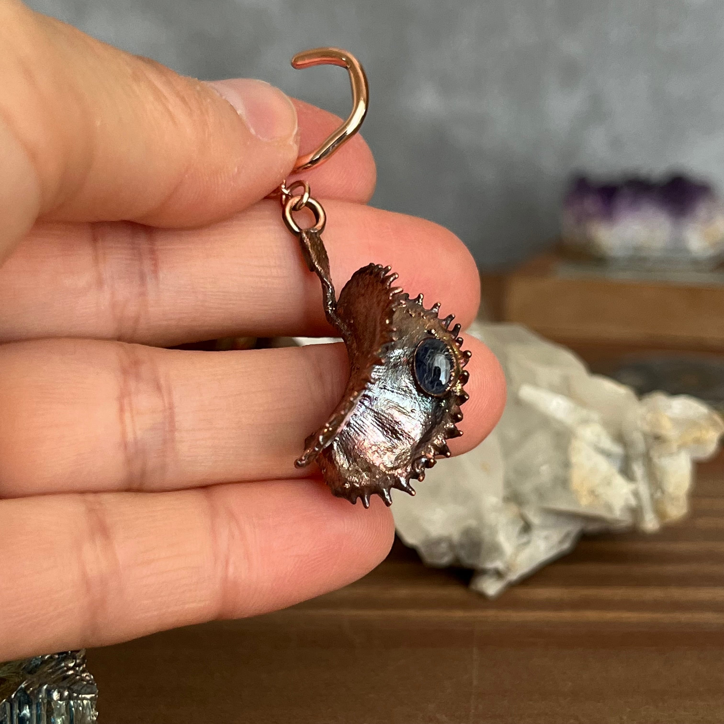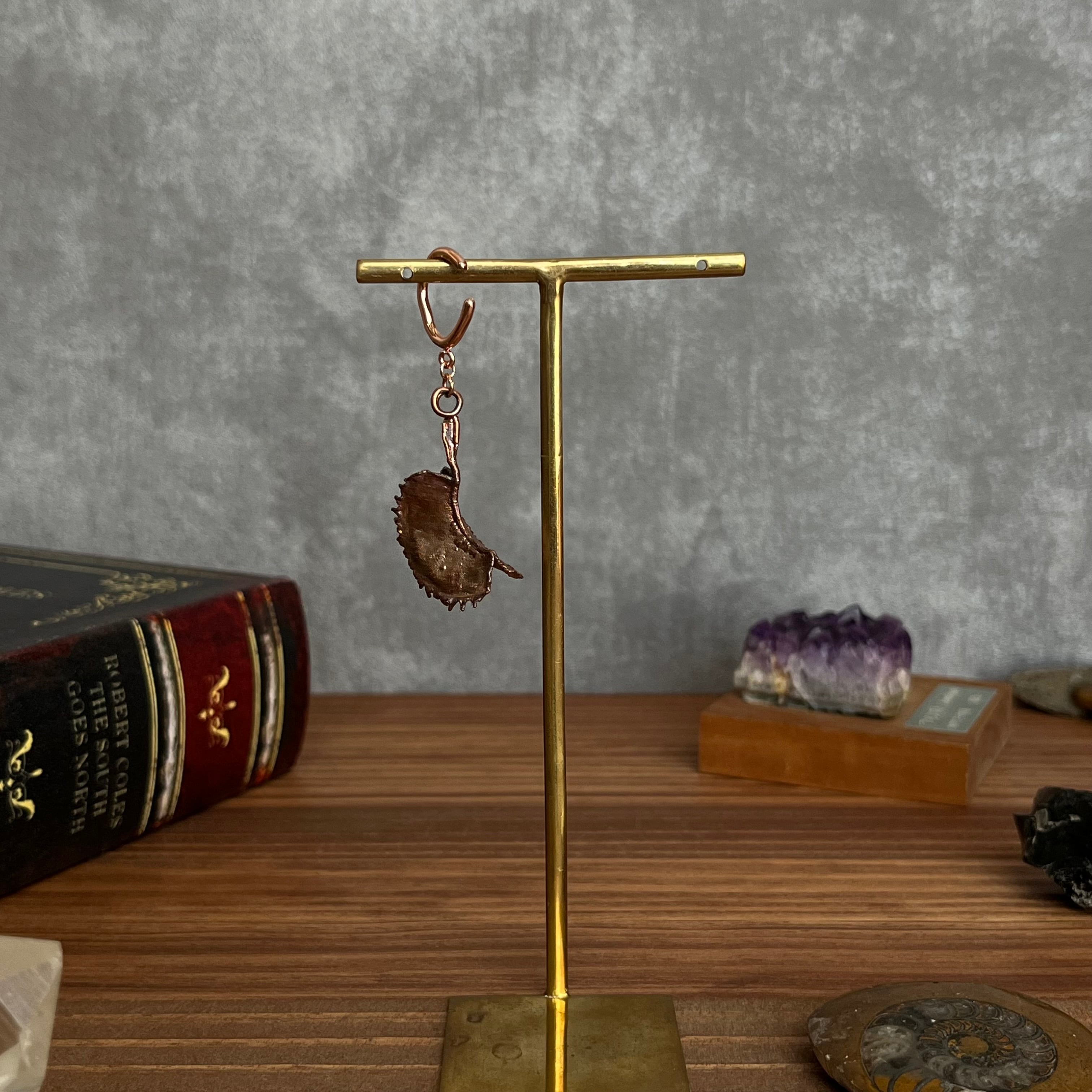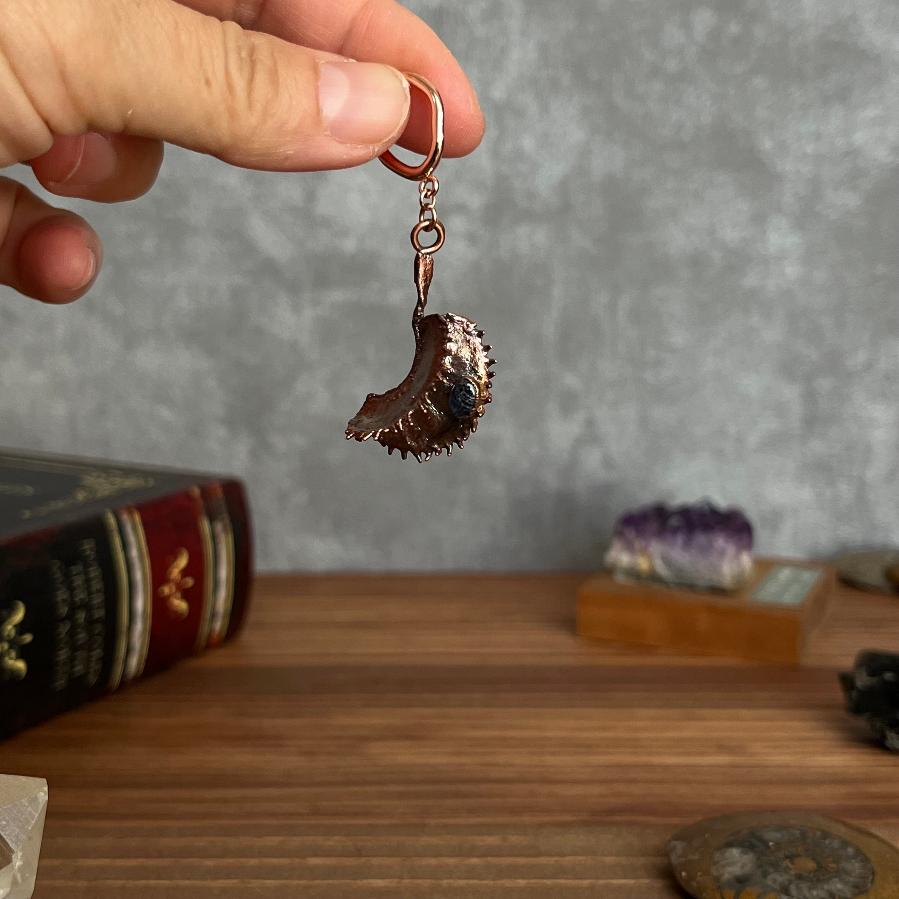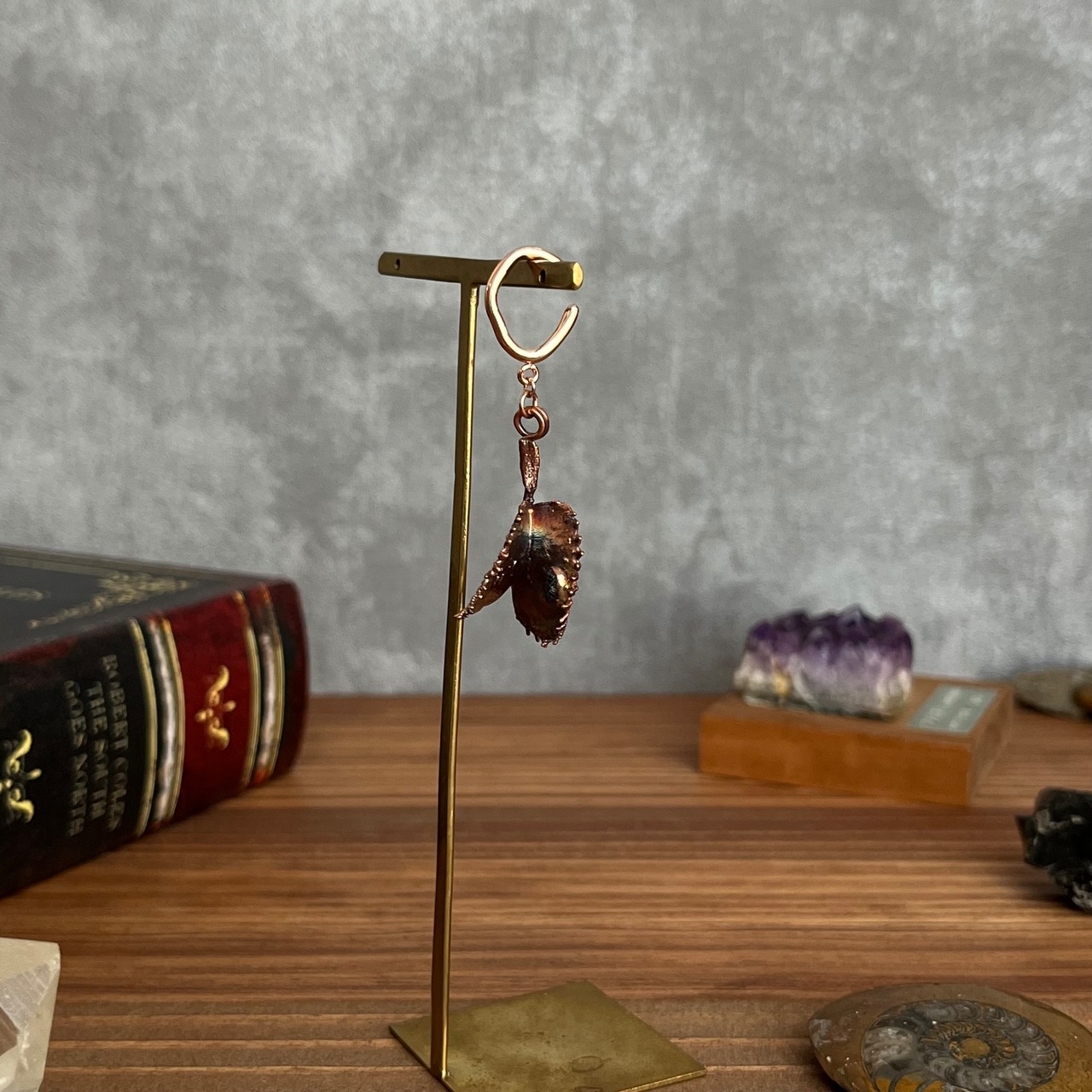 収穫した捕虫葉をエレクトロフォーミングという技法で銅めっきし、アクセサリーに仕立てているため、銅の中には本物のハエトリグサが入っています。