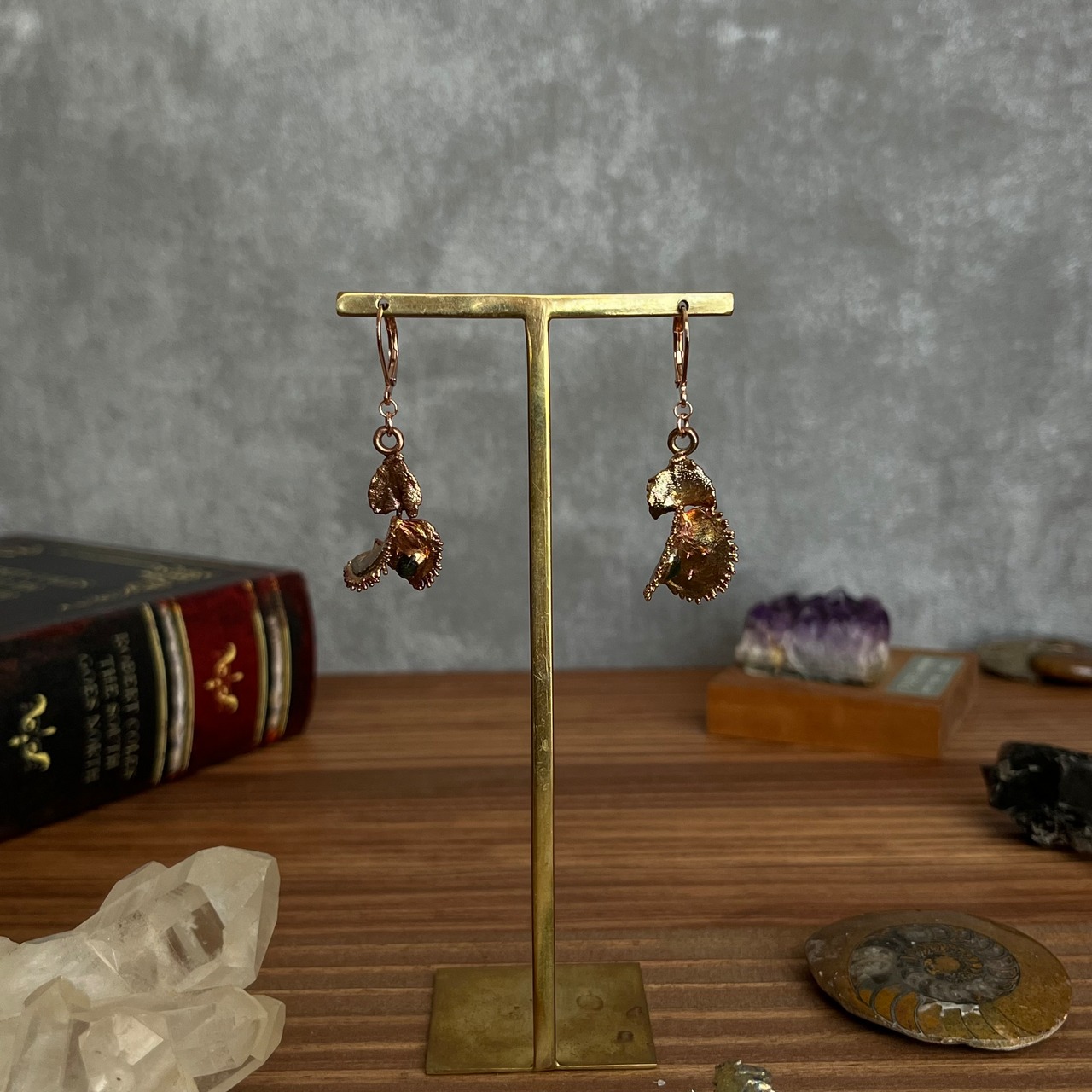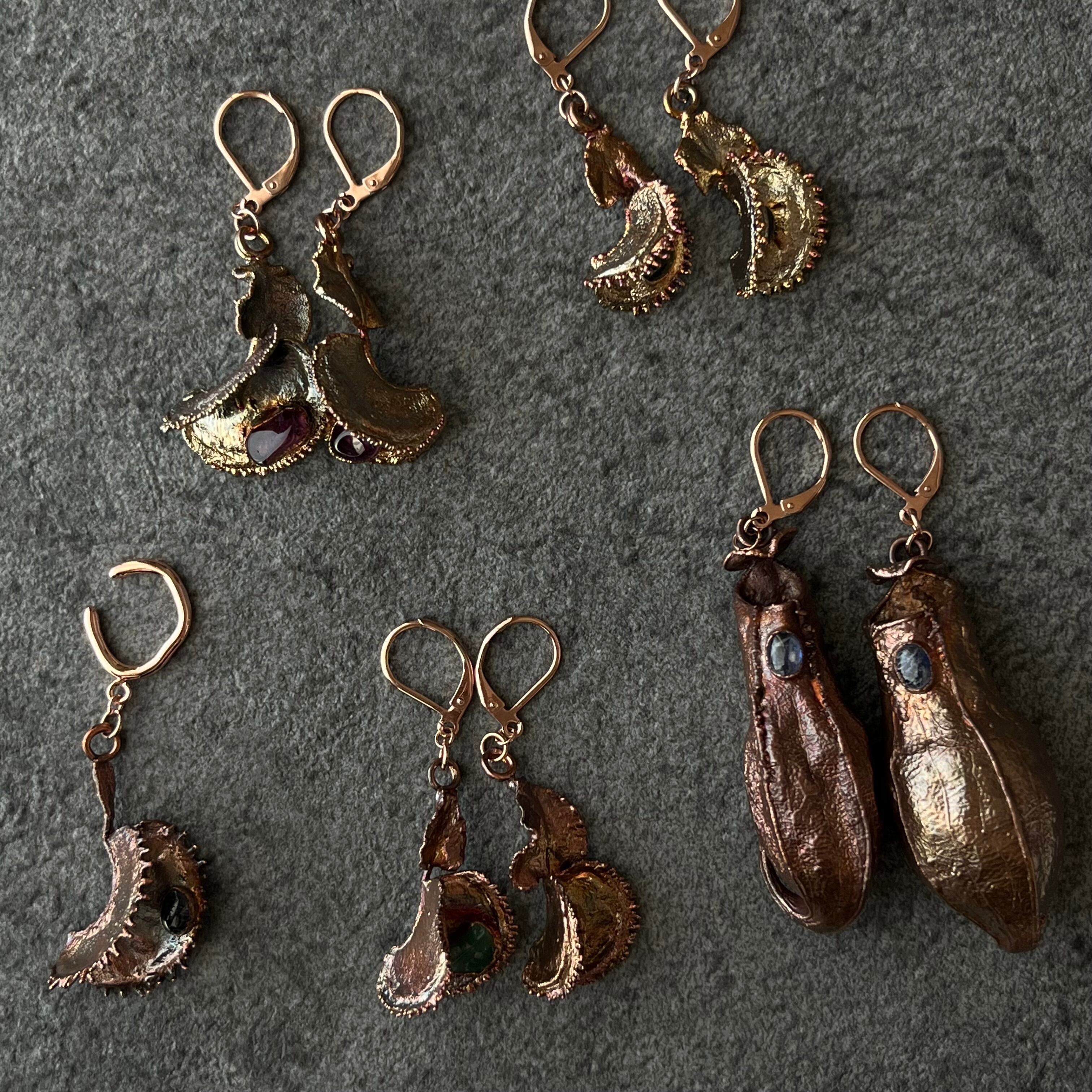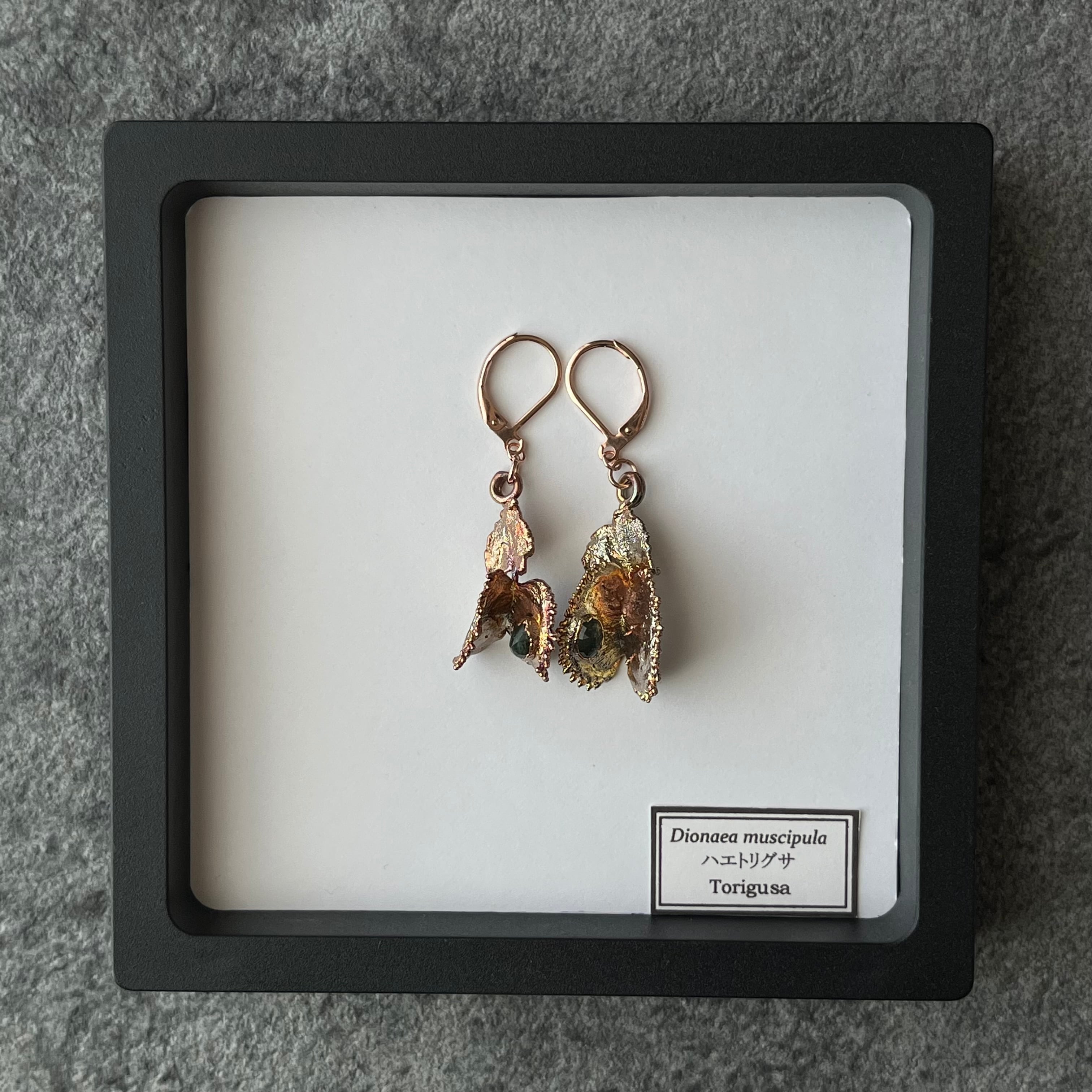 収穫した捕虫葉をエレクトロフォーミングという技法で銅めっきし、アクセサリーに仕立てているため、銅の中には本物のハエトリグサが入っています。