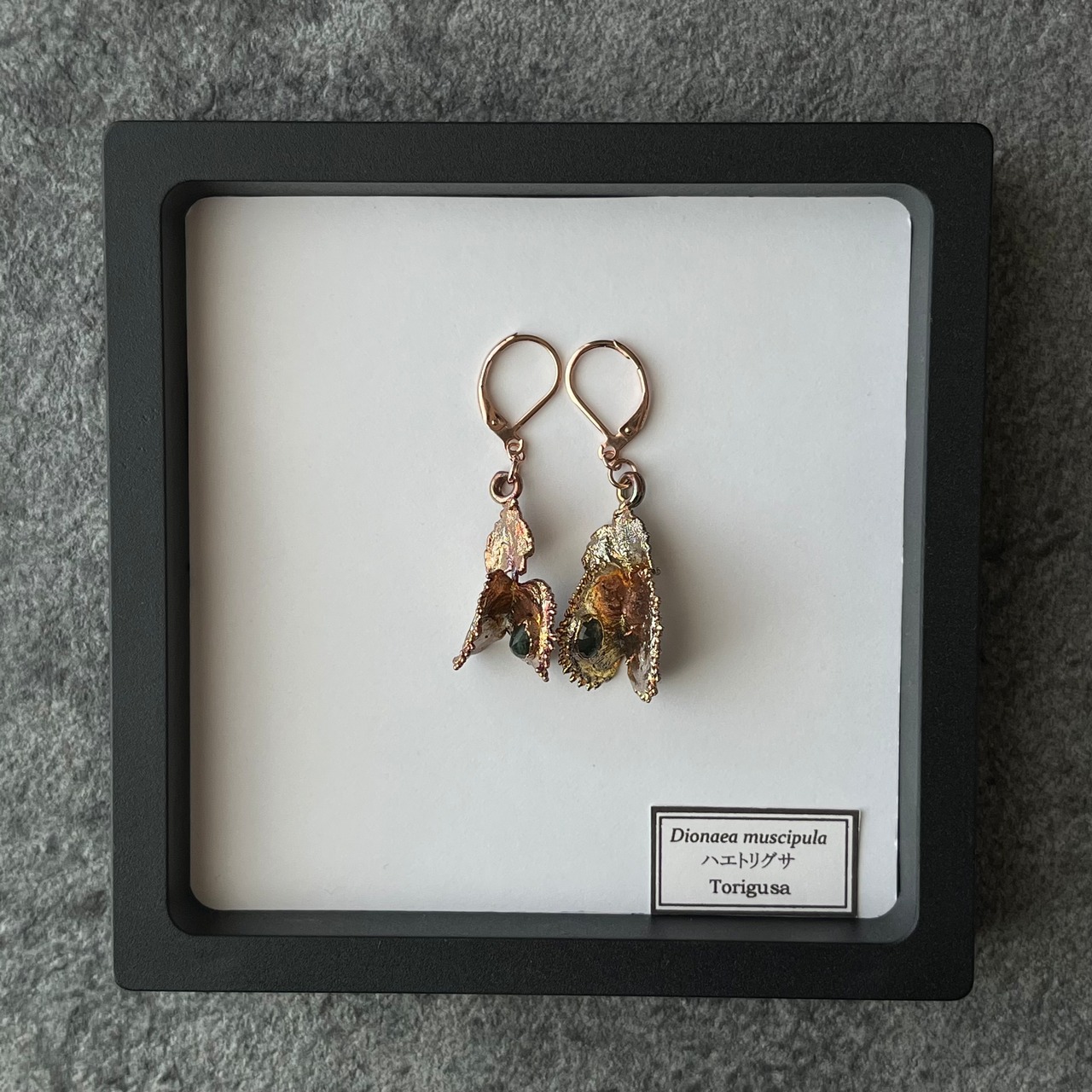 作者が世界で一番大好きな食虫植物・ハエトリグサの捕虫葉で制作したピアス(イヤリング)です。