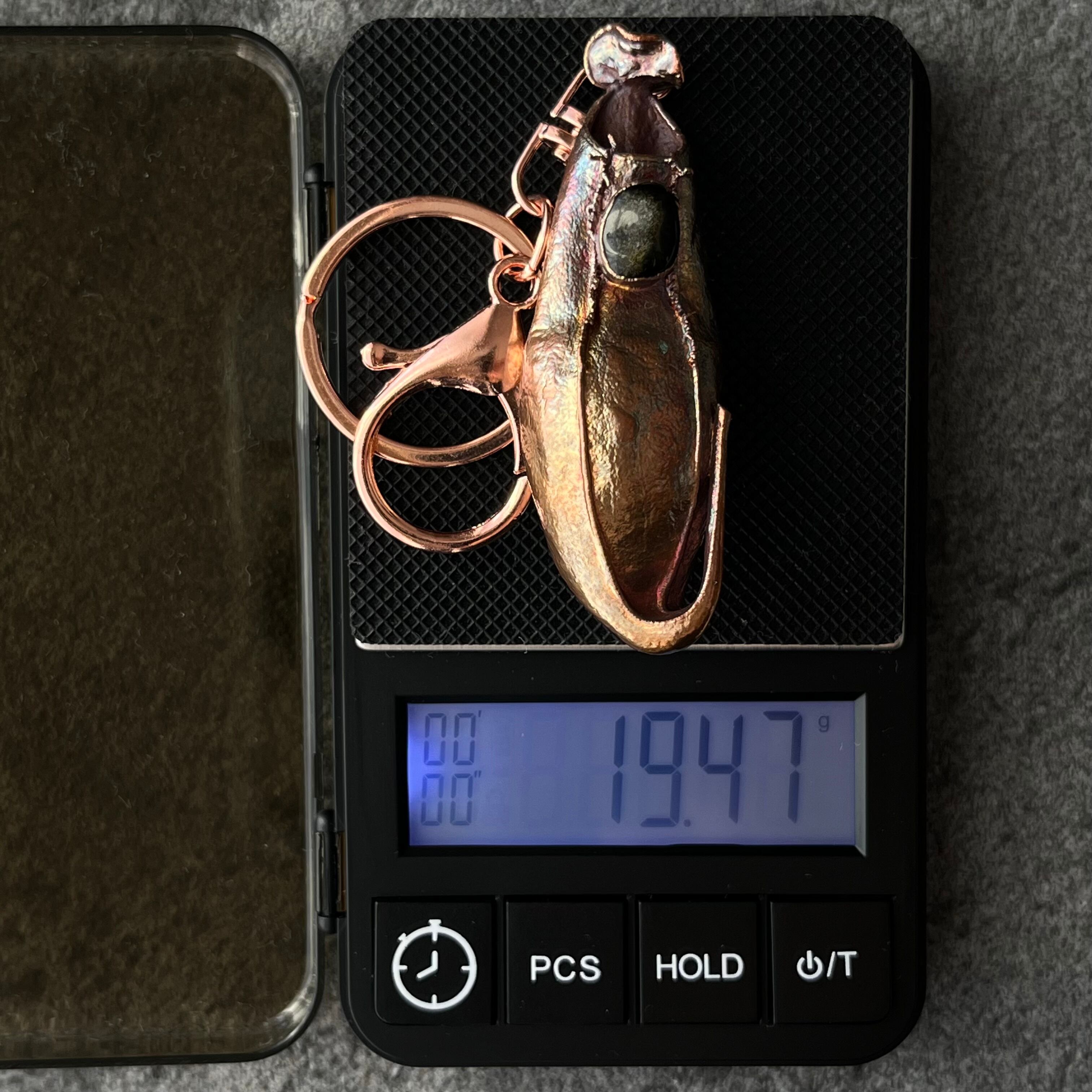薄く銅を纏わせた状態でめっき液から出し、洗浄後、黒曜石を合わせ、上手く銅が乗らない部分に再塗装するなどの修正をして、再び様子を見ながらめっきすること丸一日。