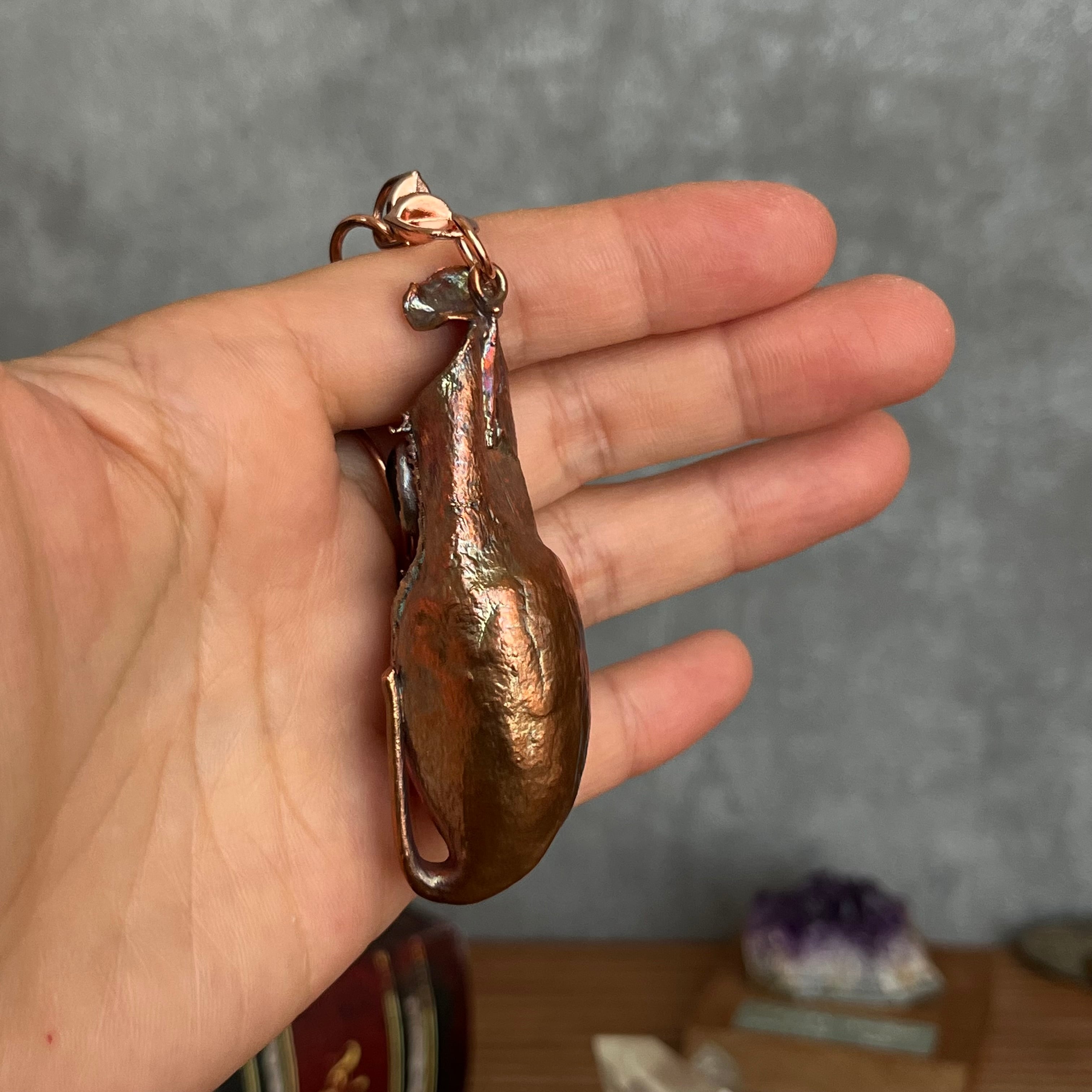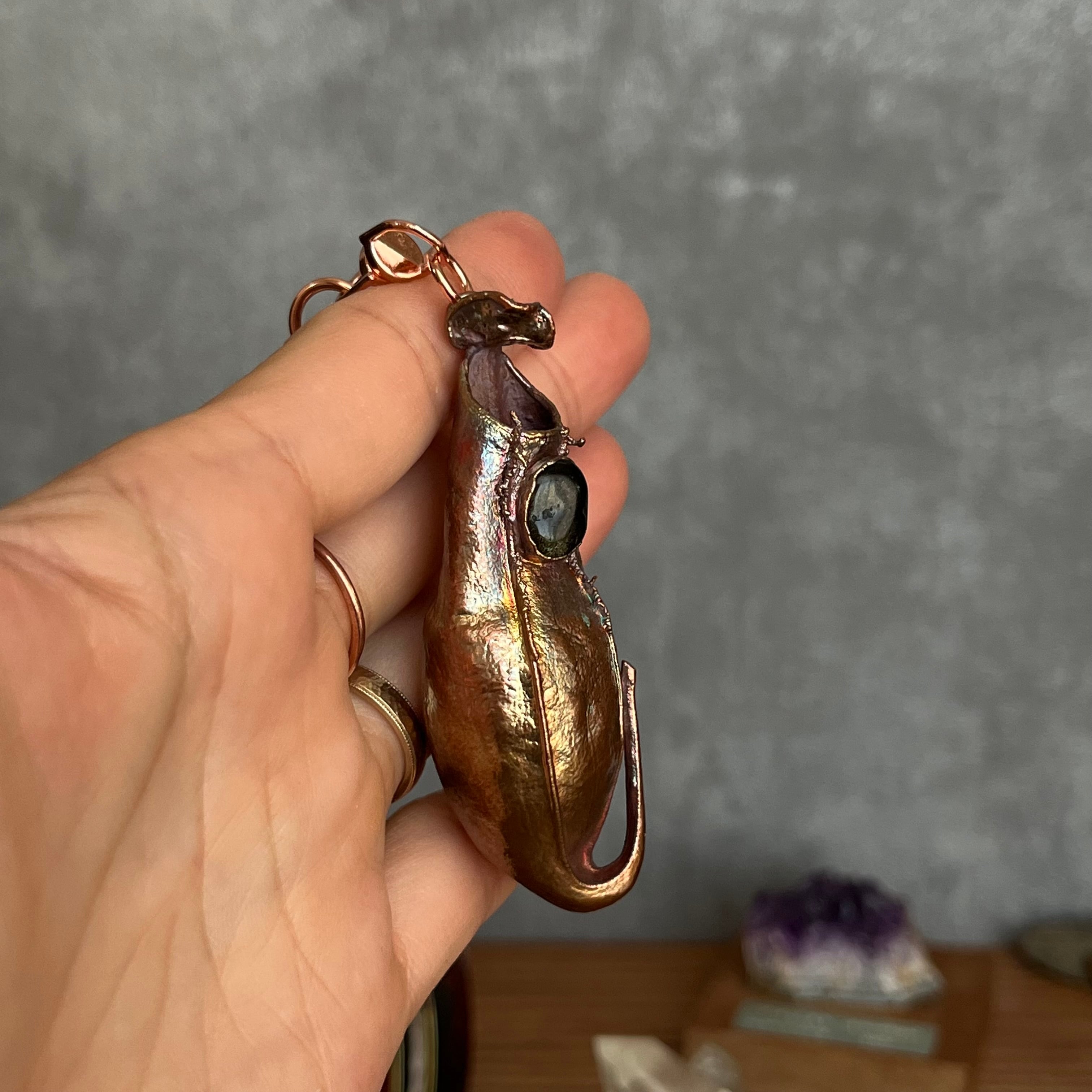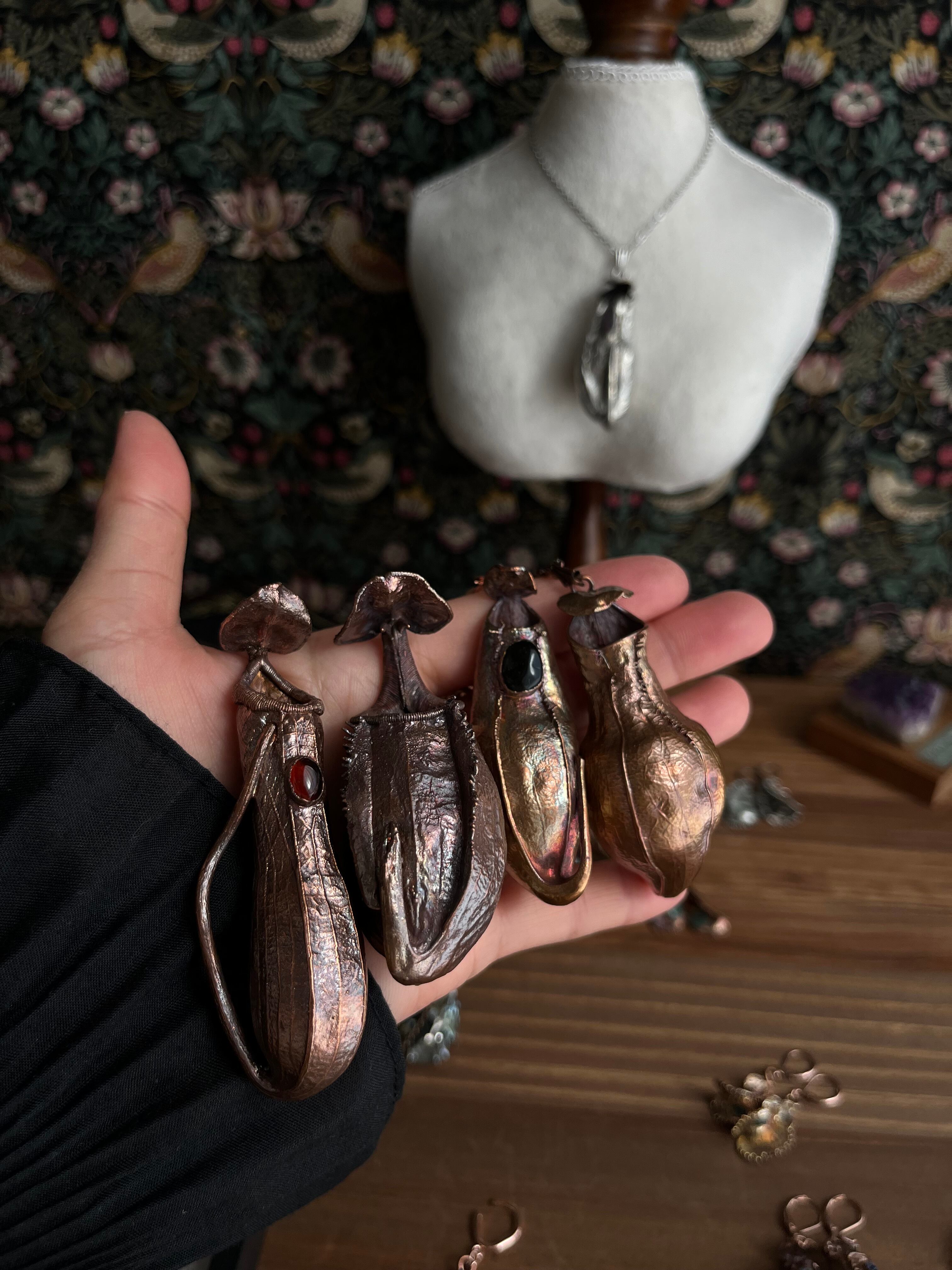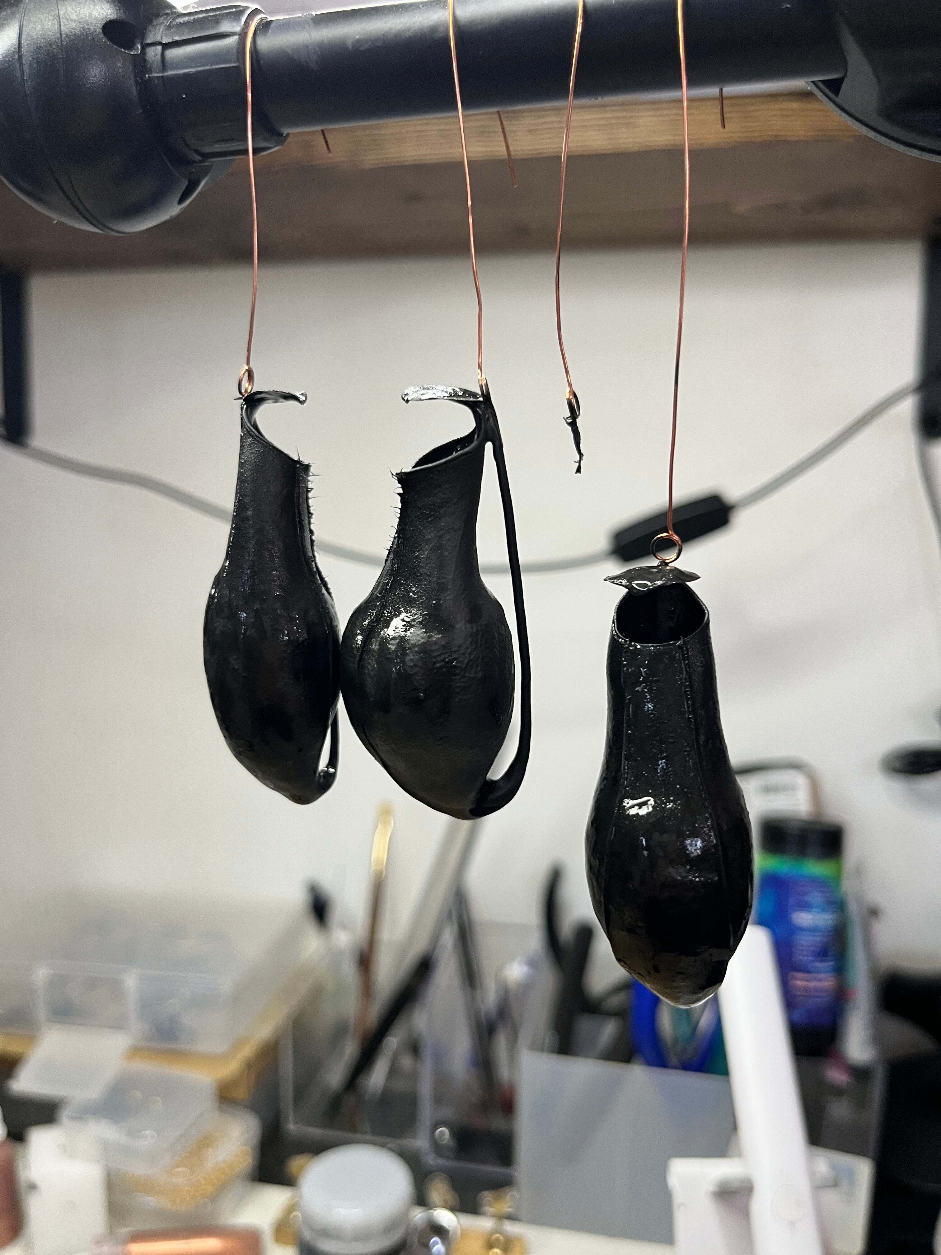 ウツボカズラ「N. gracilis」の捕虫袋(ピッチャー)を収穫し、洗浄後、エレクトロフォーミングという技法で銅めっきをほどこし、ネックレスを作製しました。
