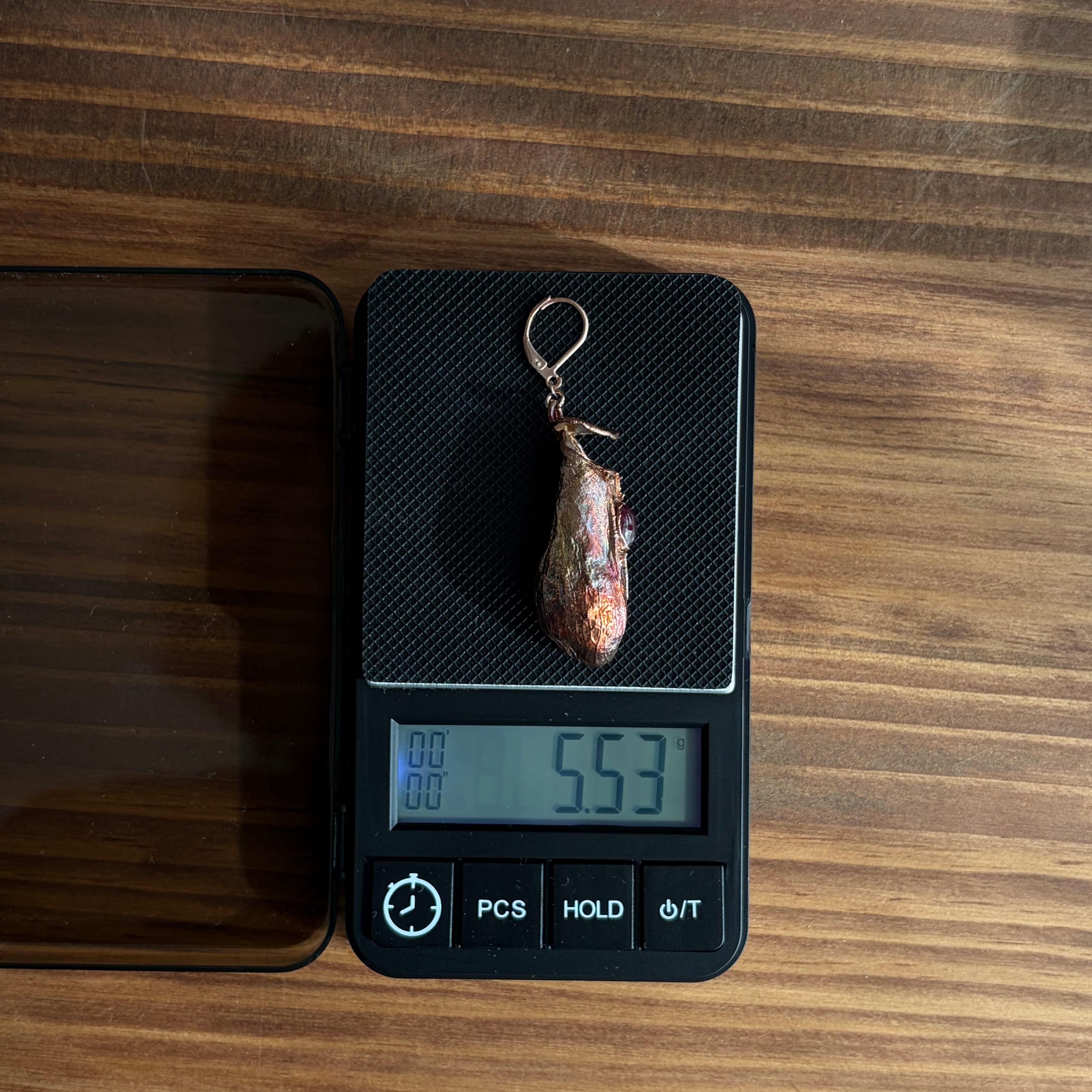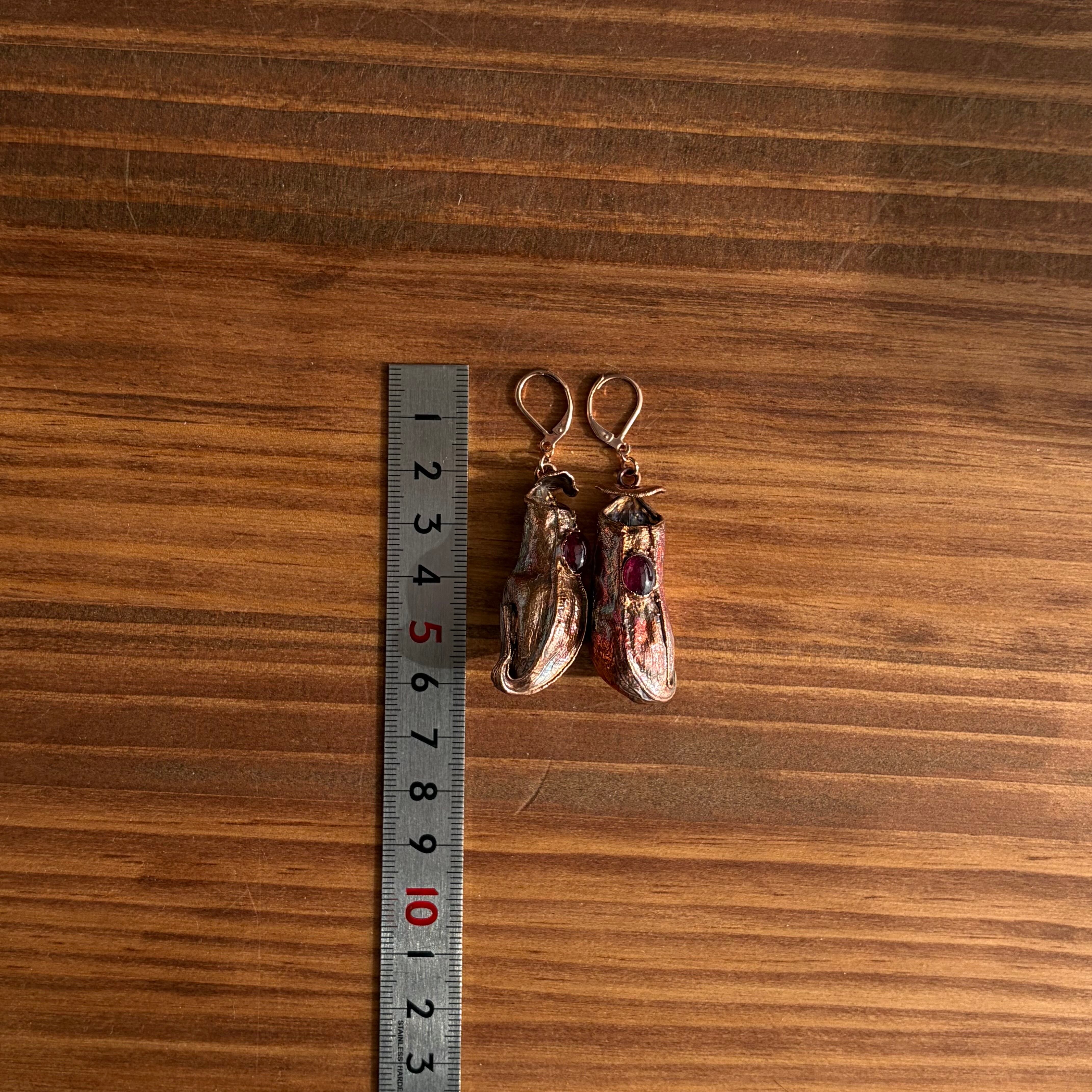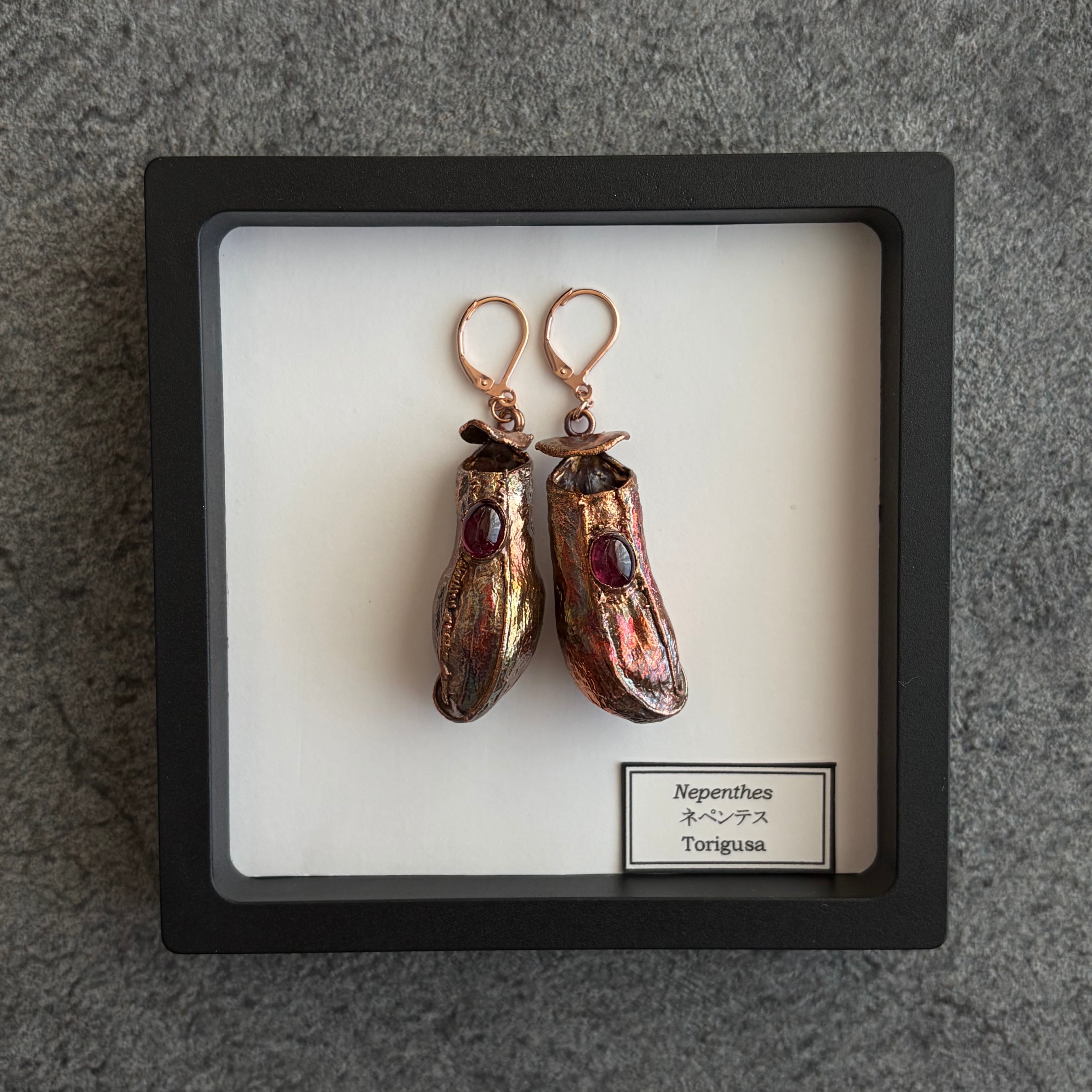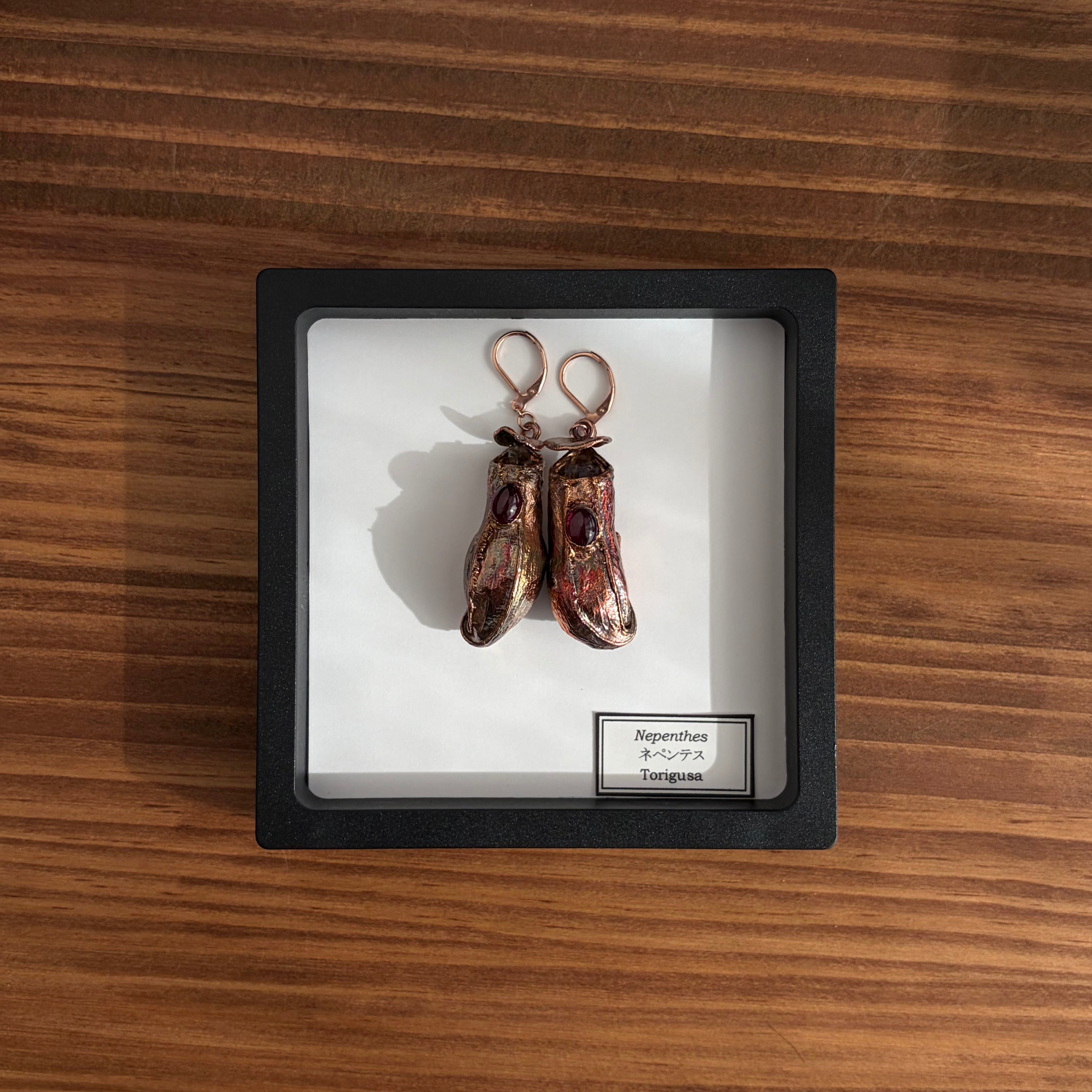 ウツボカズラ「N. gracilis」の捕虫袋(ピッチャー)を収穫し、洗浄後、エレクトロフォーミングという技法で銅めっきをほどこし、ピアス(イヤリング)を作製しました。