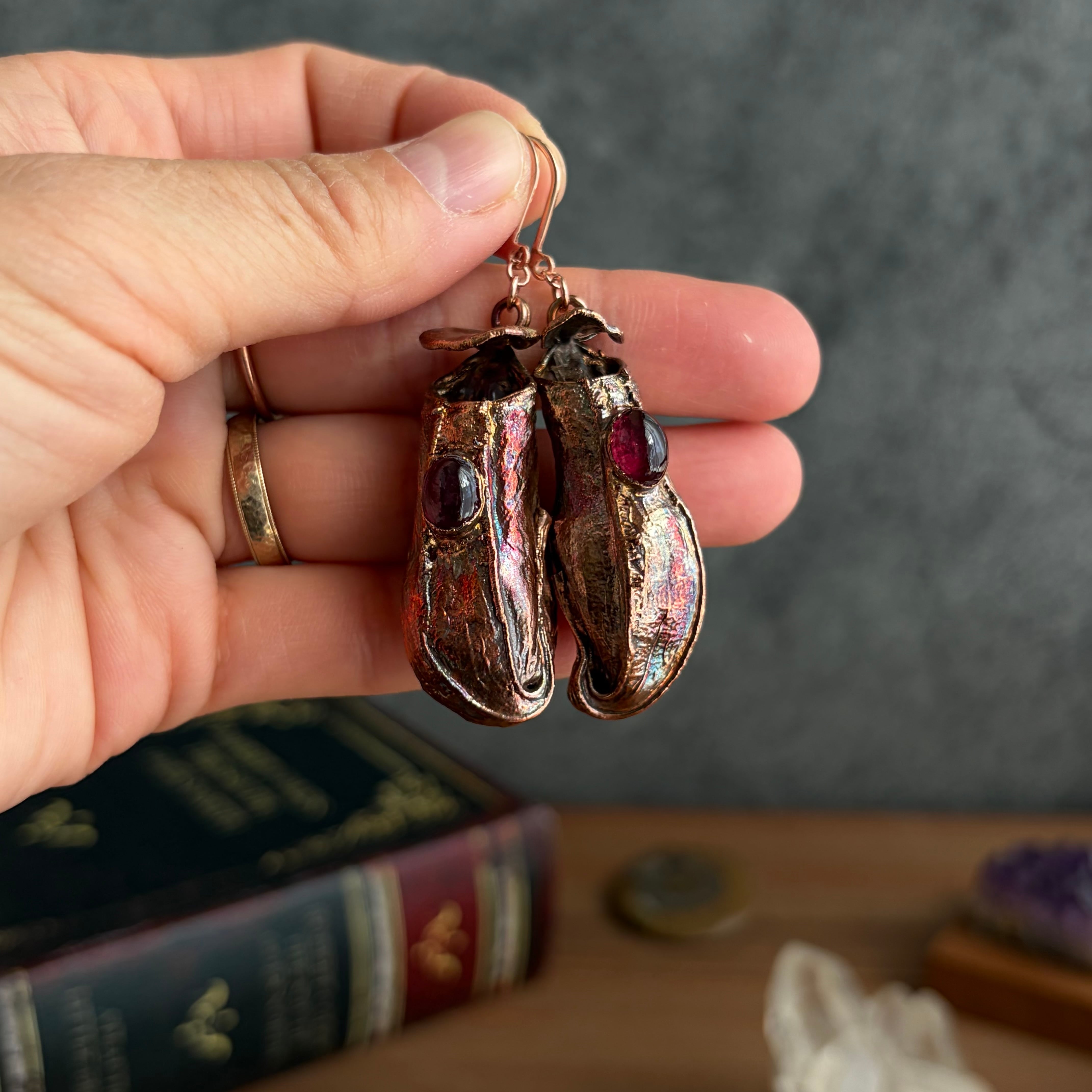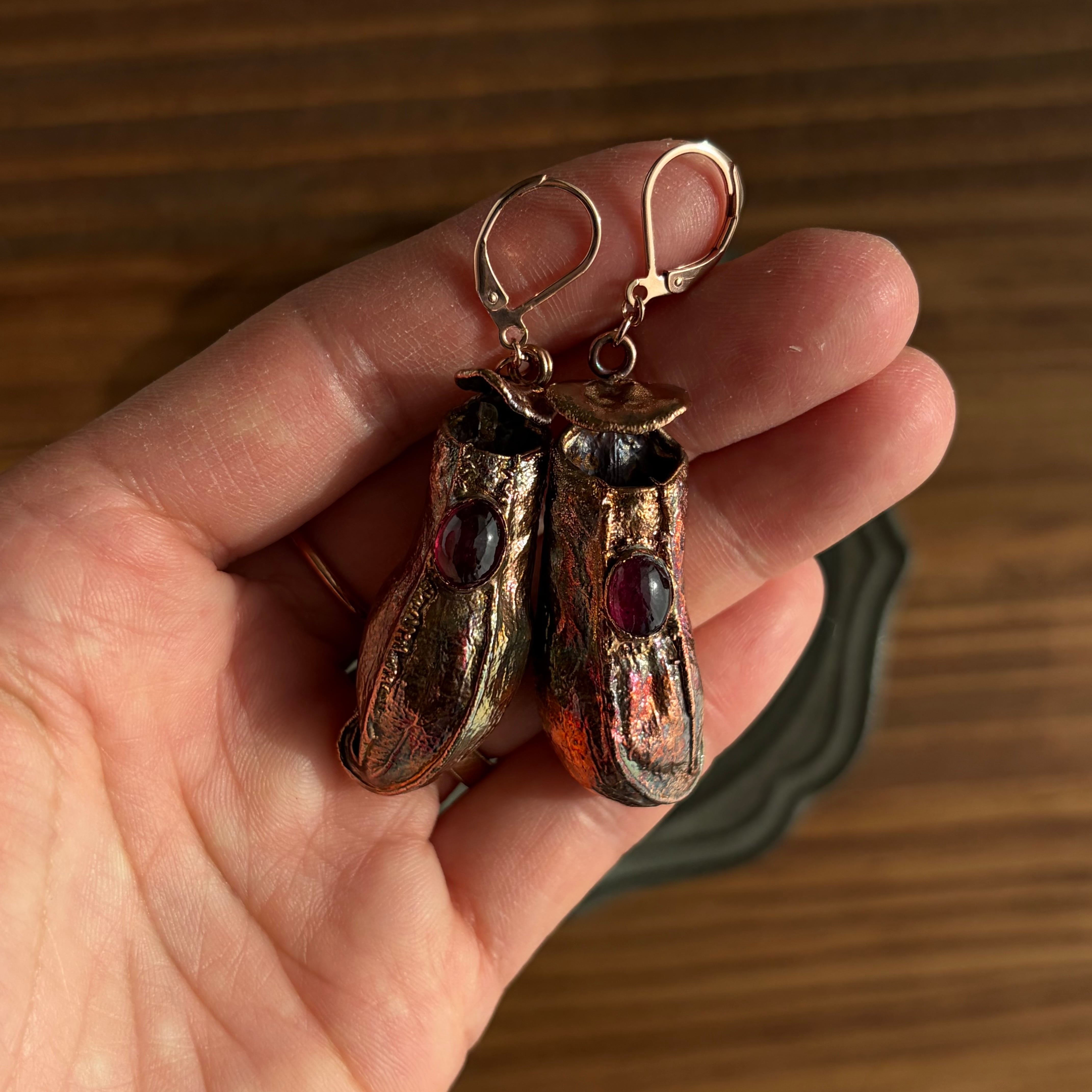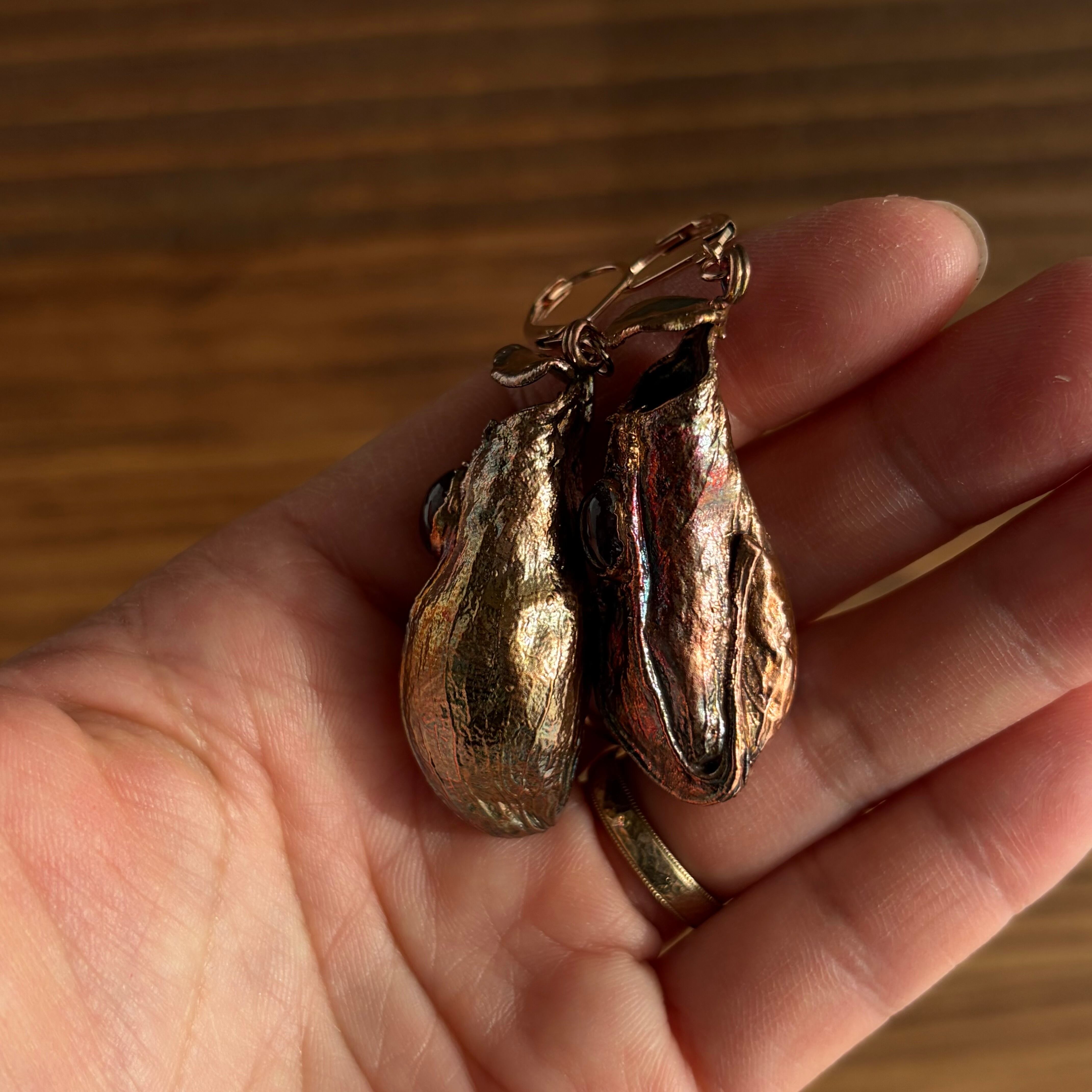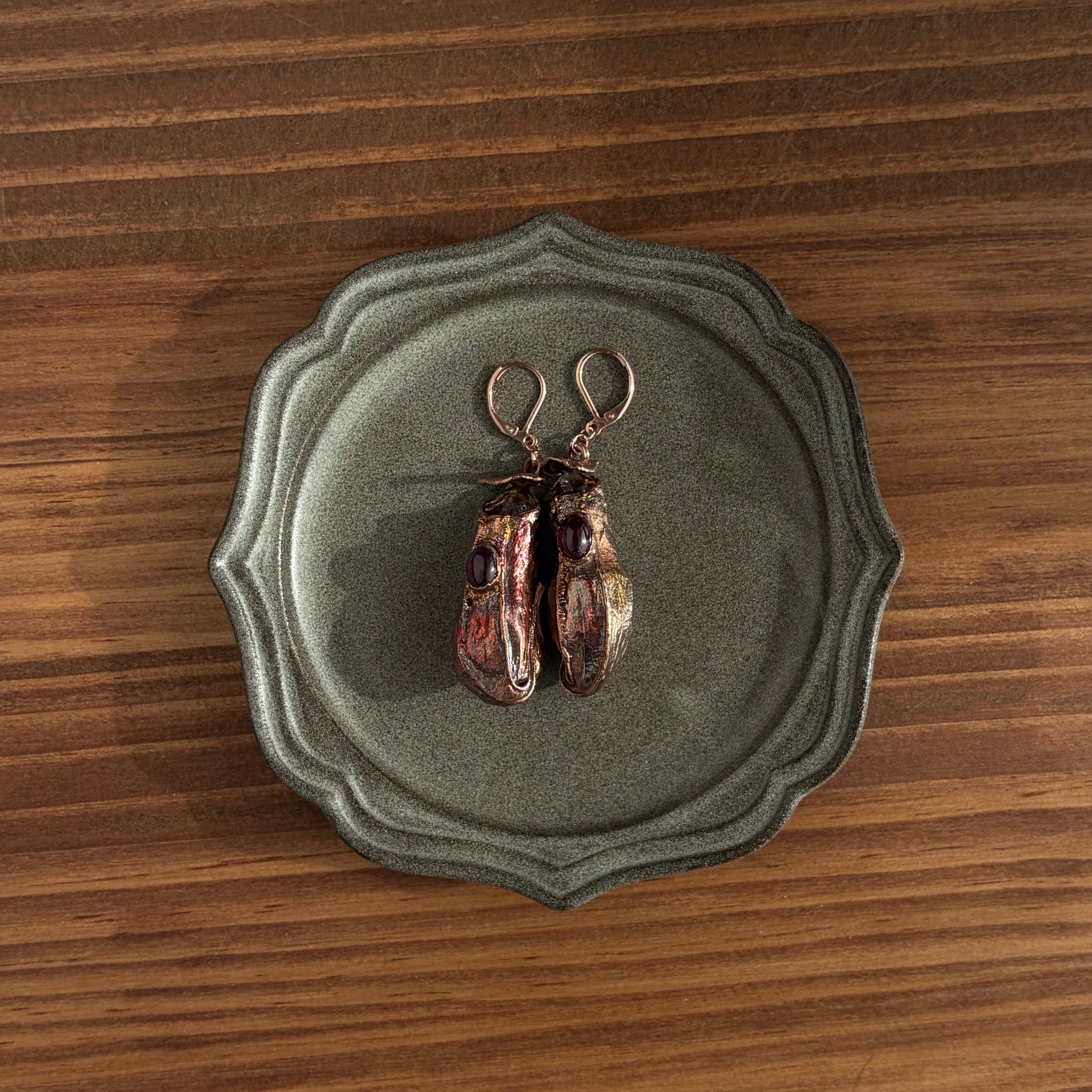 ウツボカズラ「N. gracilis」の捕虫袋(ピッチャー)を収穫し、洗浄後、エレクトロフォーミングという技法で銅めっきをほどこし、ピアス(イヤリング)を作製しました。