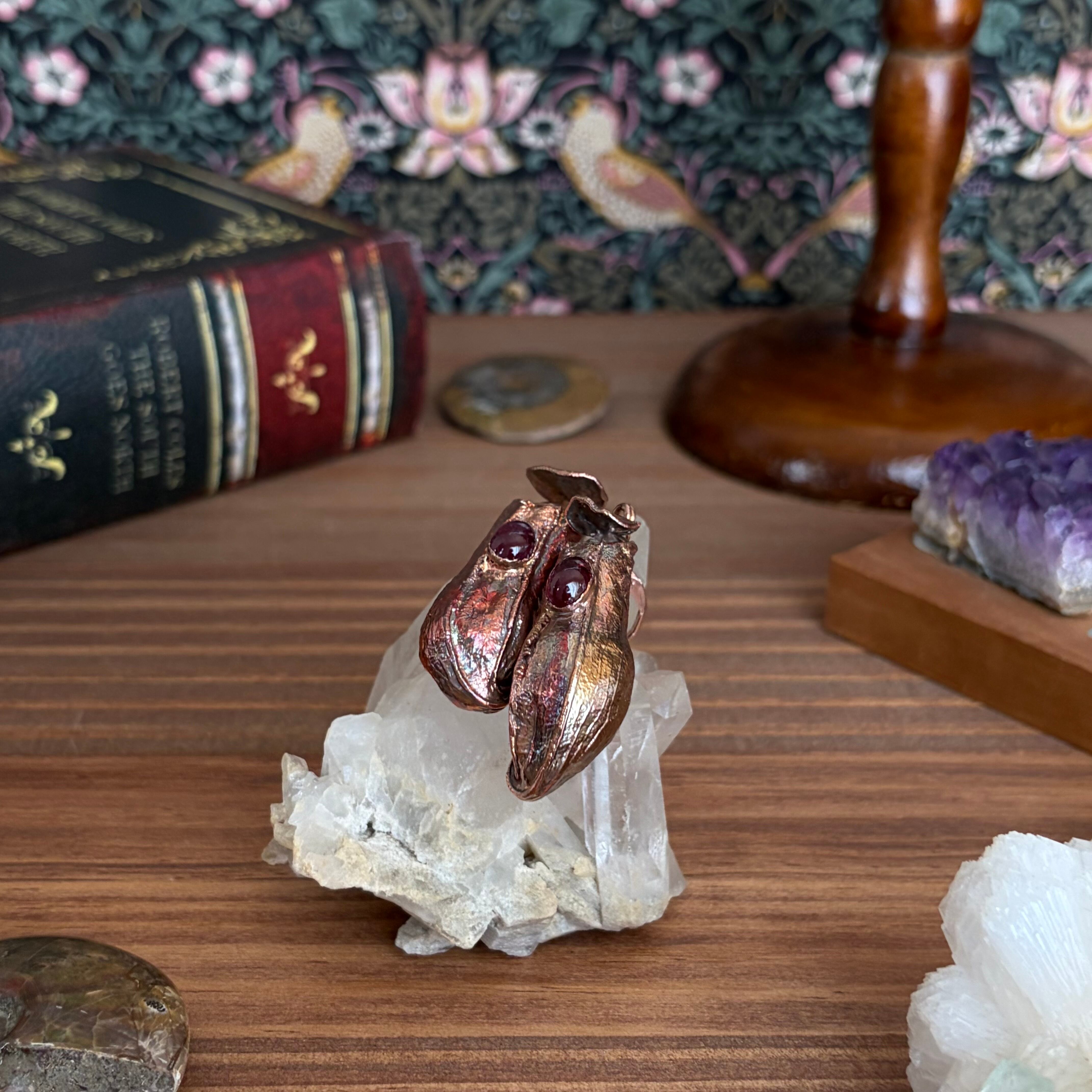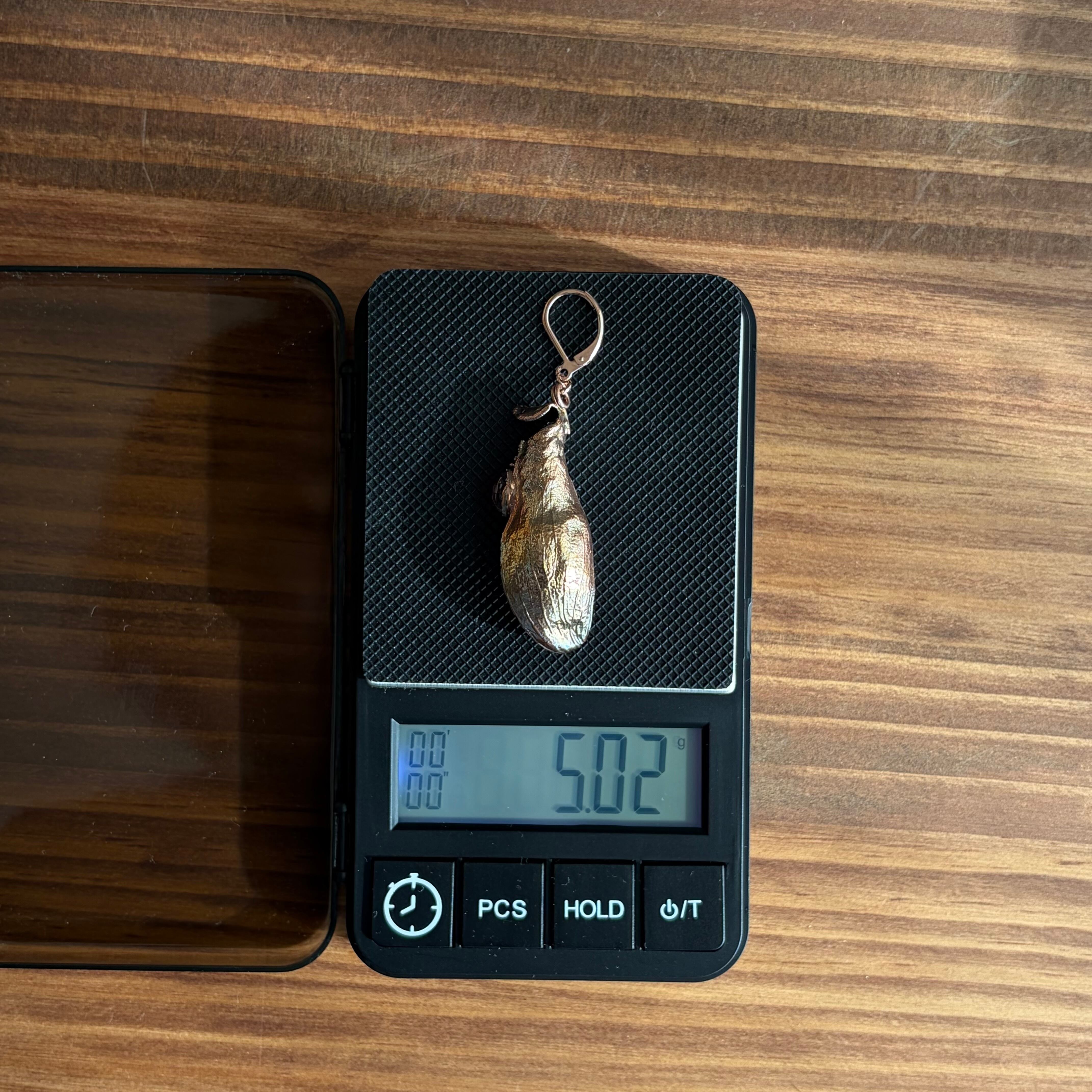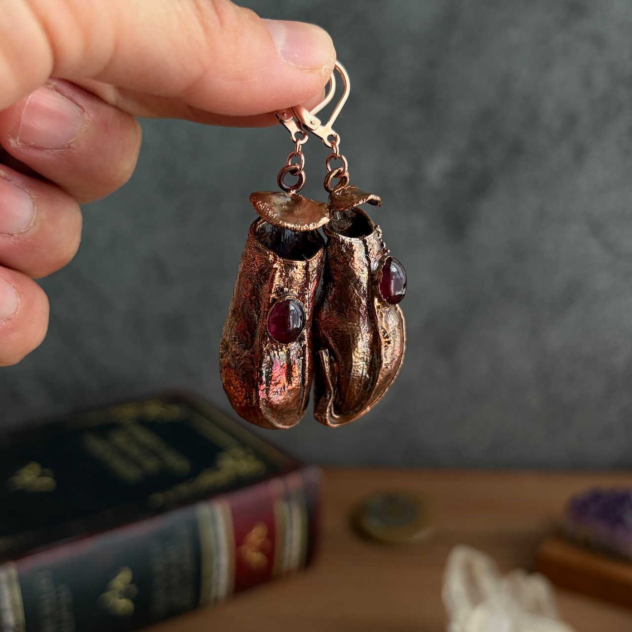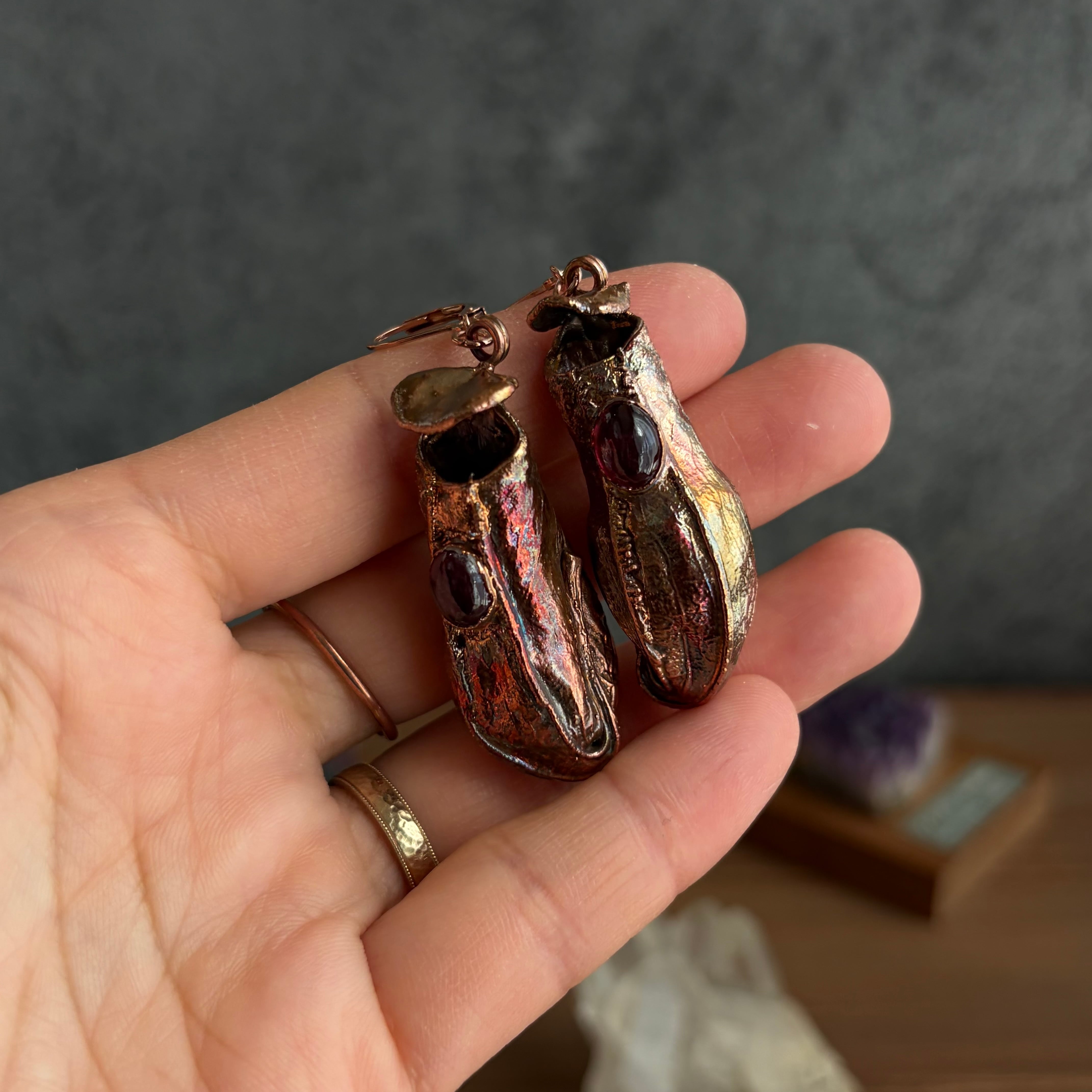 ウツボカズラ「N. gracilis」の捕虫袋(ピッチャー)を収穫し、洗浄後、エレクトロフォーミングという技法で銅めっきをほどこし、ピアス(イヤリング)を作製しました。