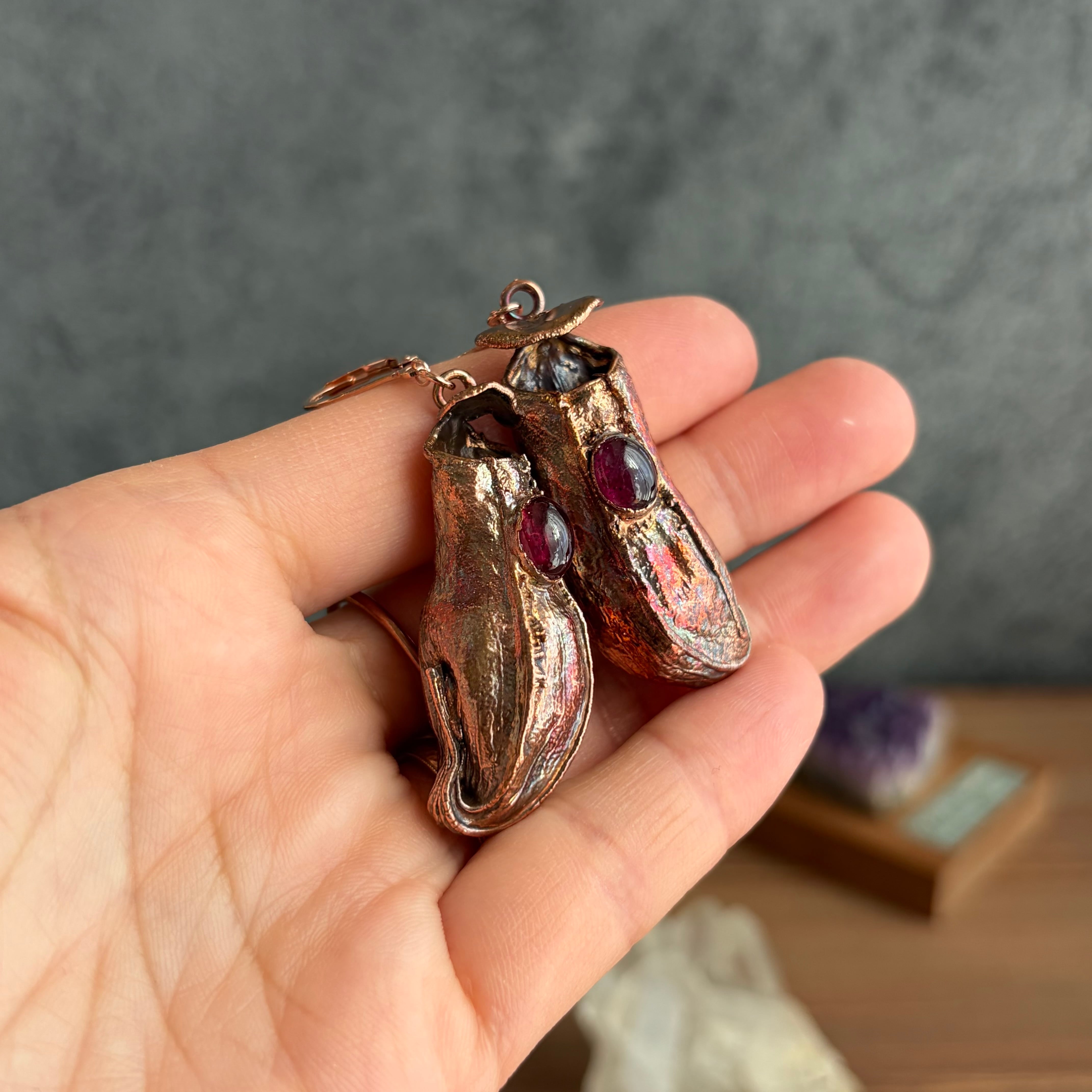 宝石の蜜をこぼすウツボカズラのピアス87(N. gracilis×ルビー×アンティーク)
