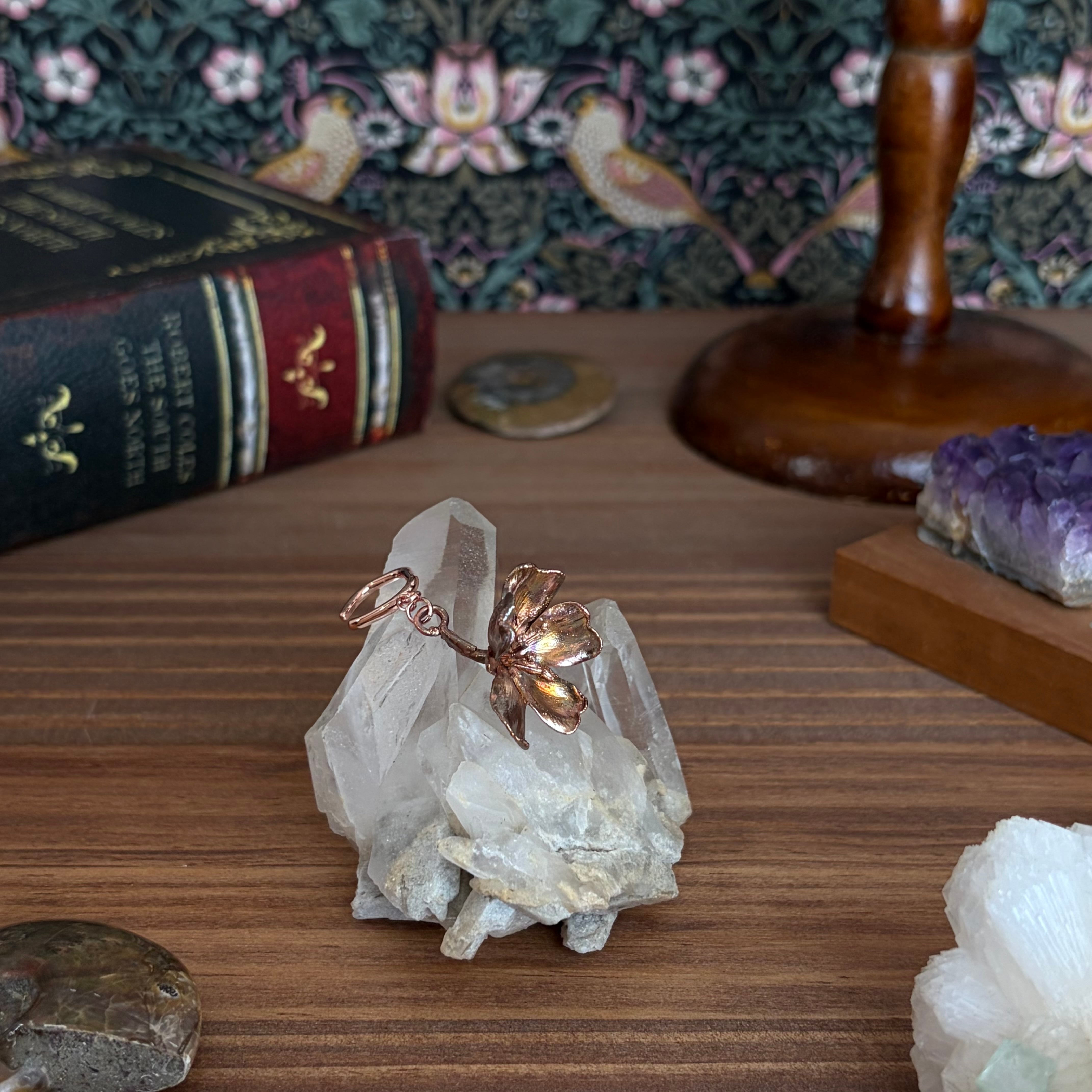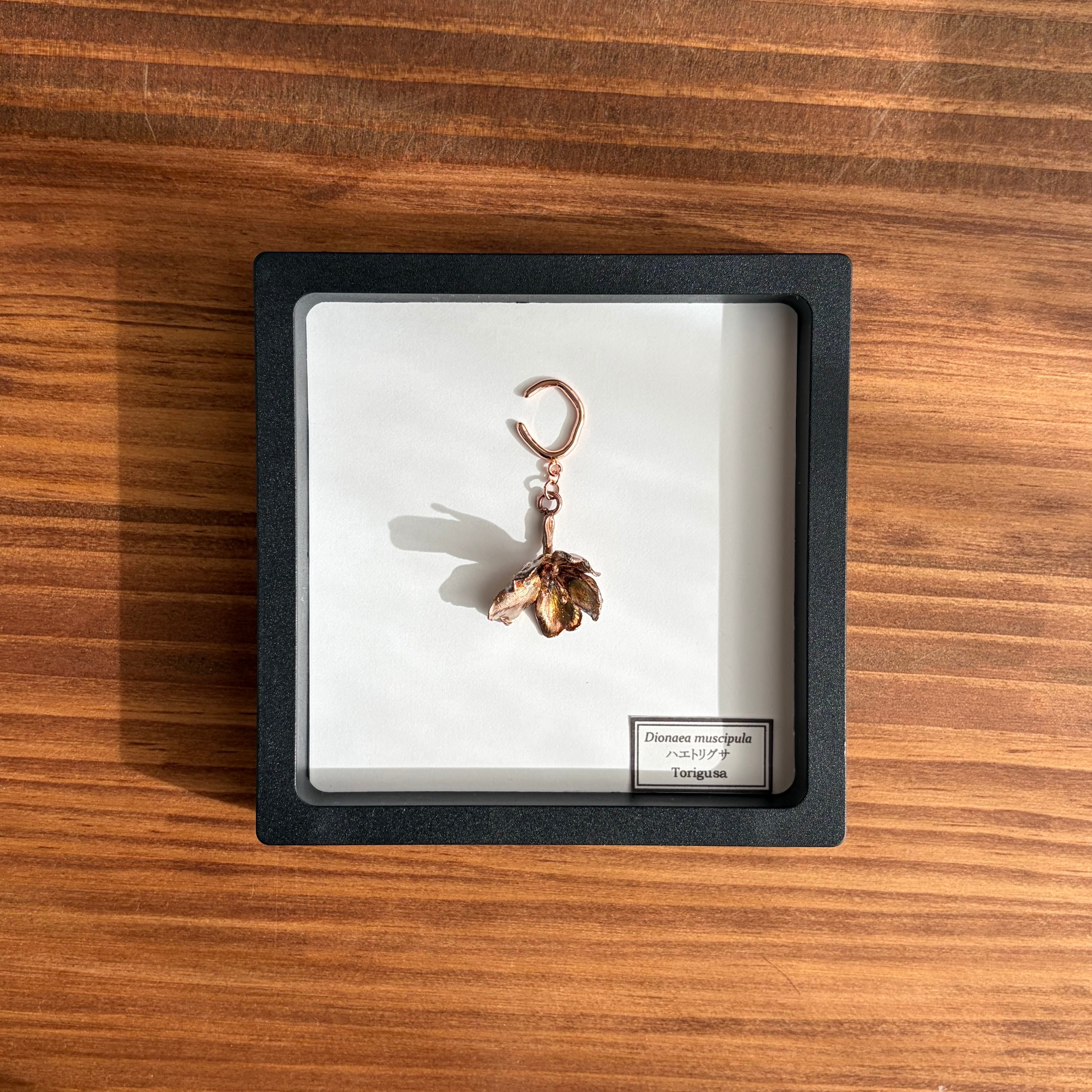 収穫した花をエレクトロフォーミングという技法で銅めっきし、アクセサリーに仕立てているため、銅の中には本物のハエトリグサの花が入っています。