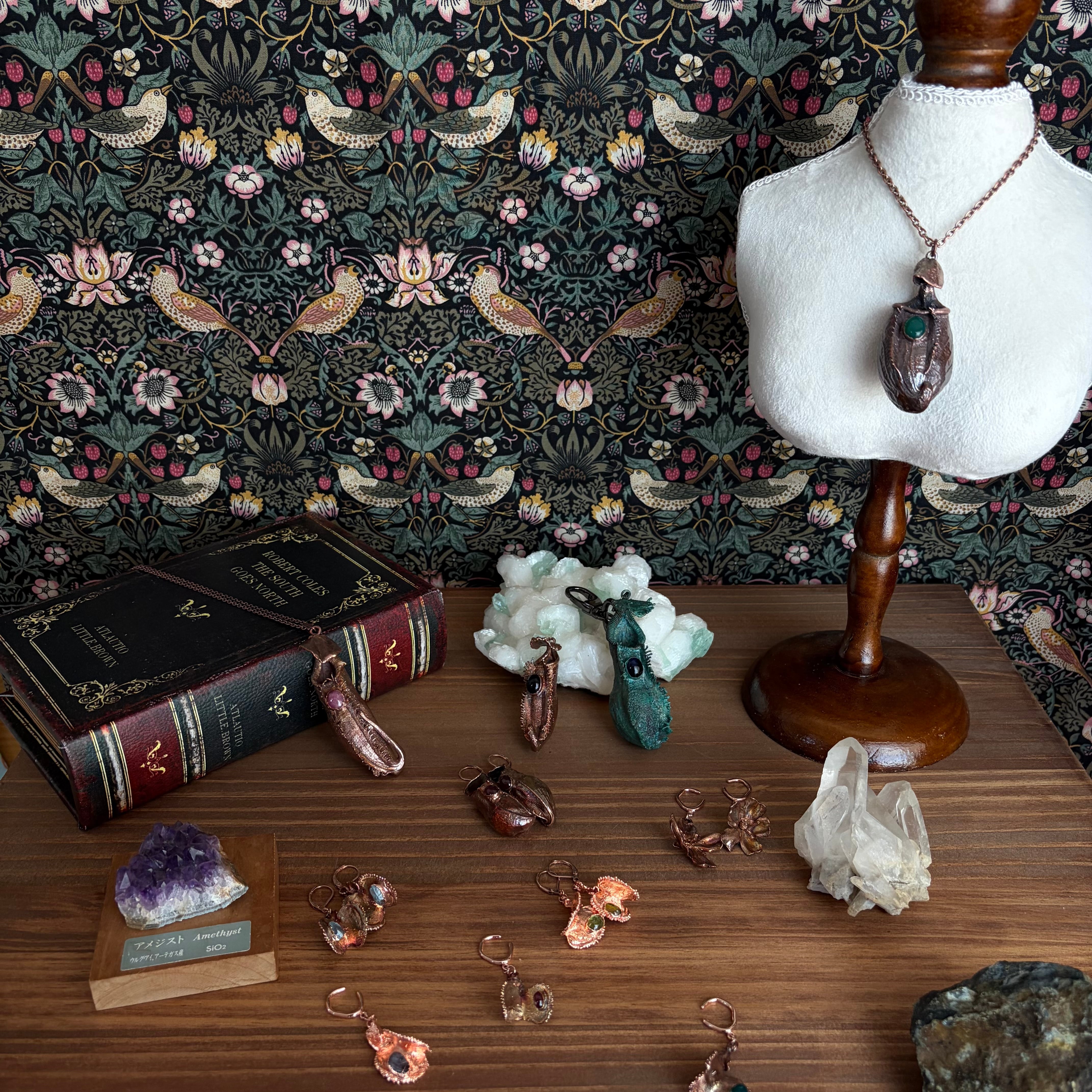 収穫した捕虫葉をエレクトロフォーミングという技法で銅めっきし、アクセサリーに仕立てているため、銅の中には本物のハエトリグサが入っています。