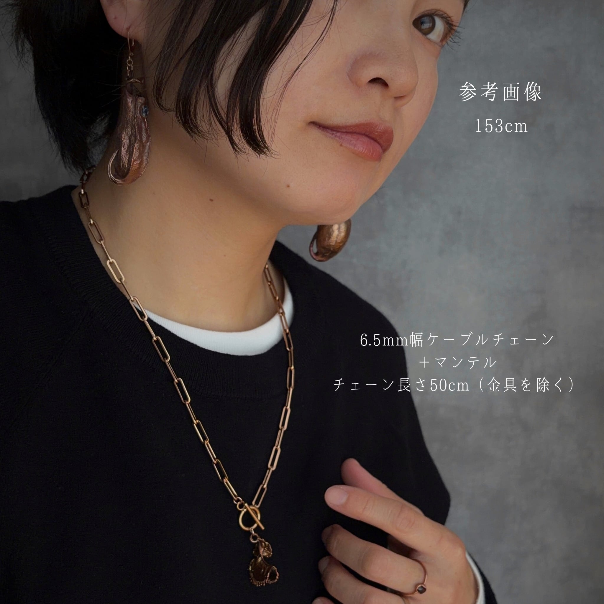 チェーンには太めのケーブルチェーンを使用し、マンテルと呼ばれる金具で体の前側で留める形状のネックレスを採用しました。